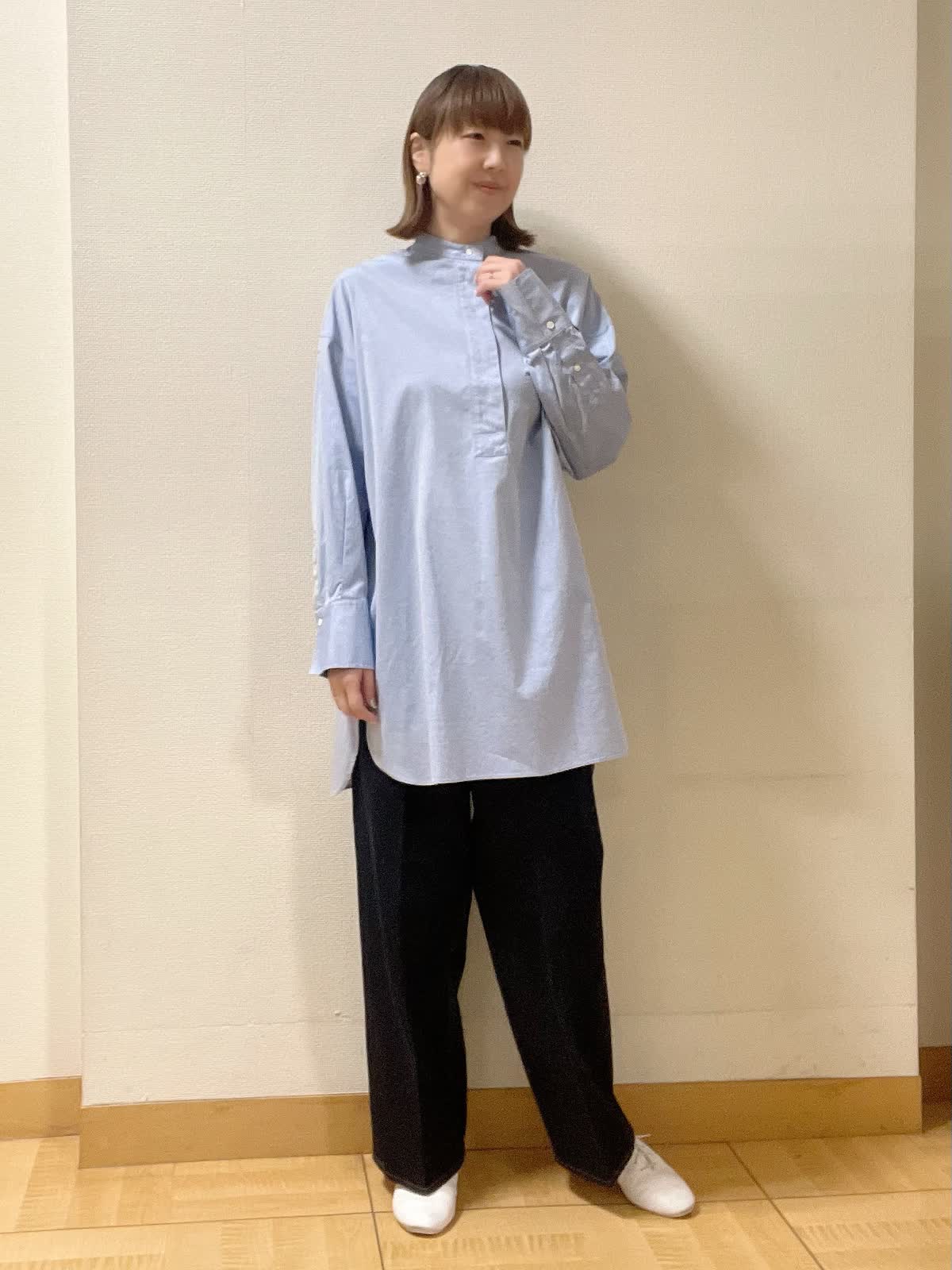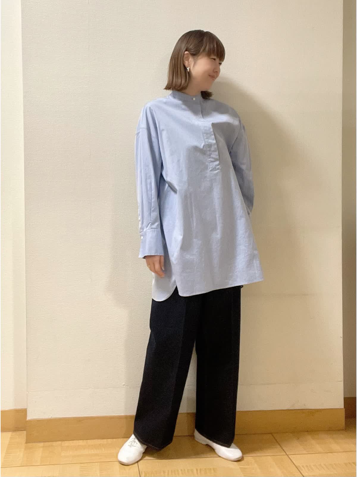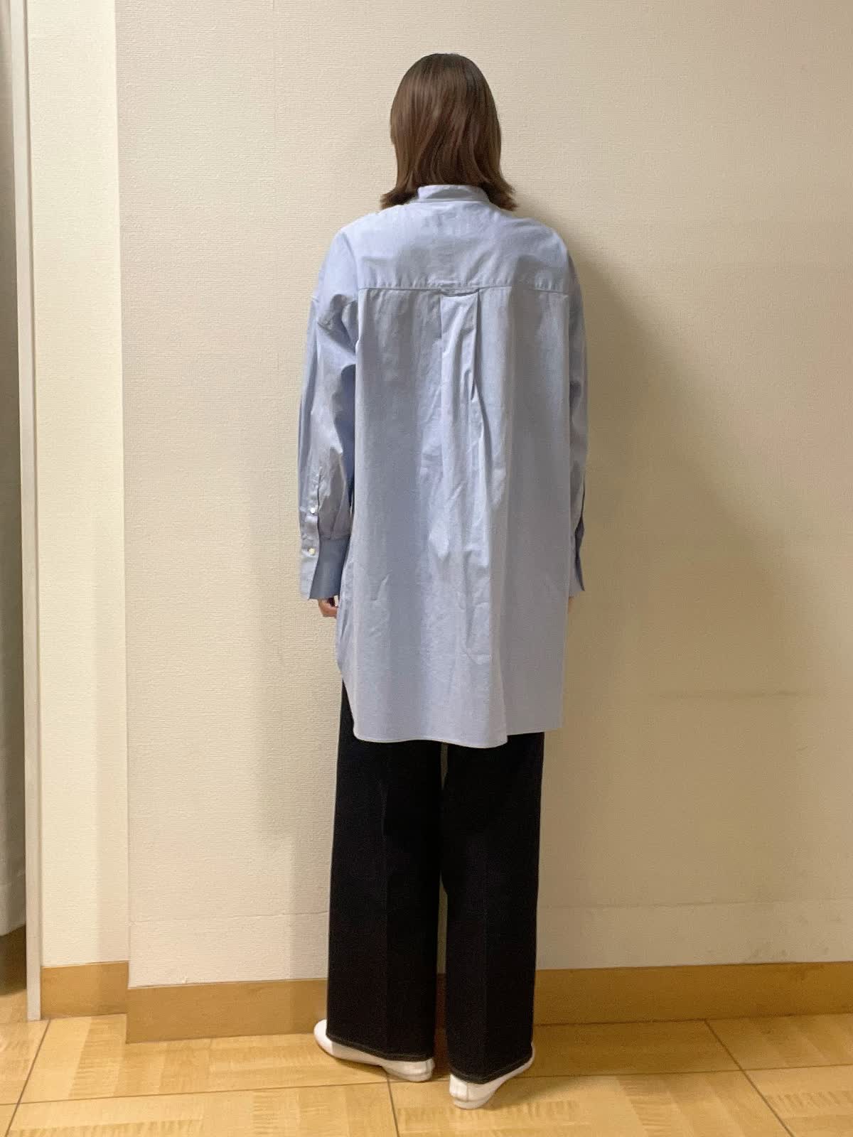 【着用サイズ】シャツ:フリー パンツ:9号 【着用カラー】シャツ:ブルー パンツ:インディコ オーバーサイズのロングシャツ。ワイドデニムでリラックス休日スタイルに。