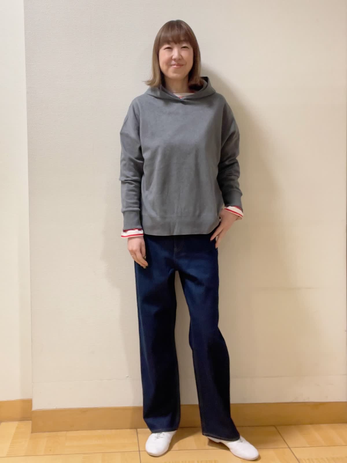 【着用サイズ】パーカー、カットソー共にフリー パンツ:9号【着用カラー】パーカー:チャコールグレー カットソー:レッドパンツ:インディゴ ゆったりシルエットのニットパーカー。オーガニックコットンの柔らかさが上品さを演出。大人のカジュアルスタイルになるのでおすすめです!