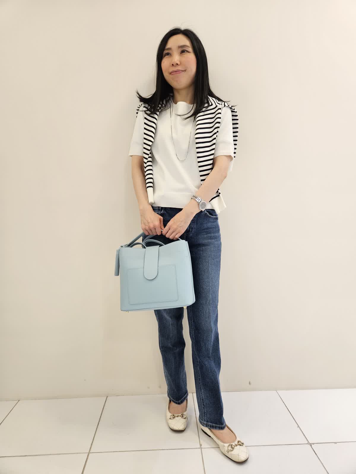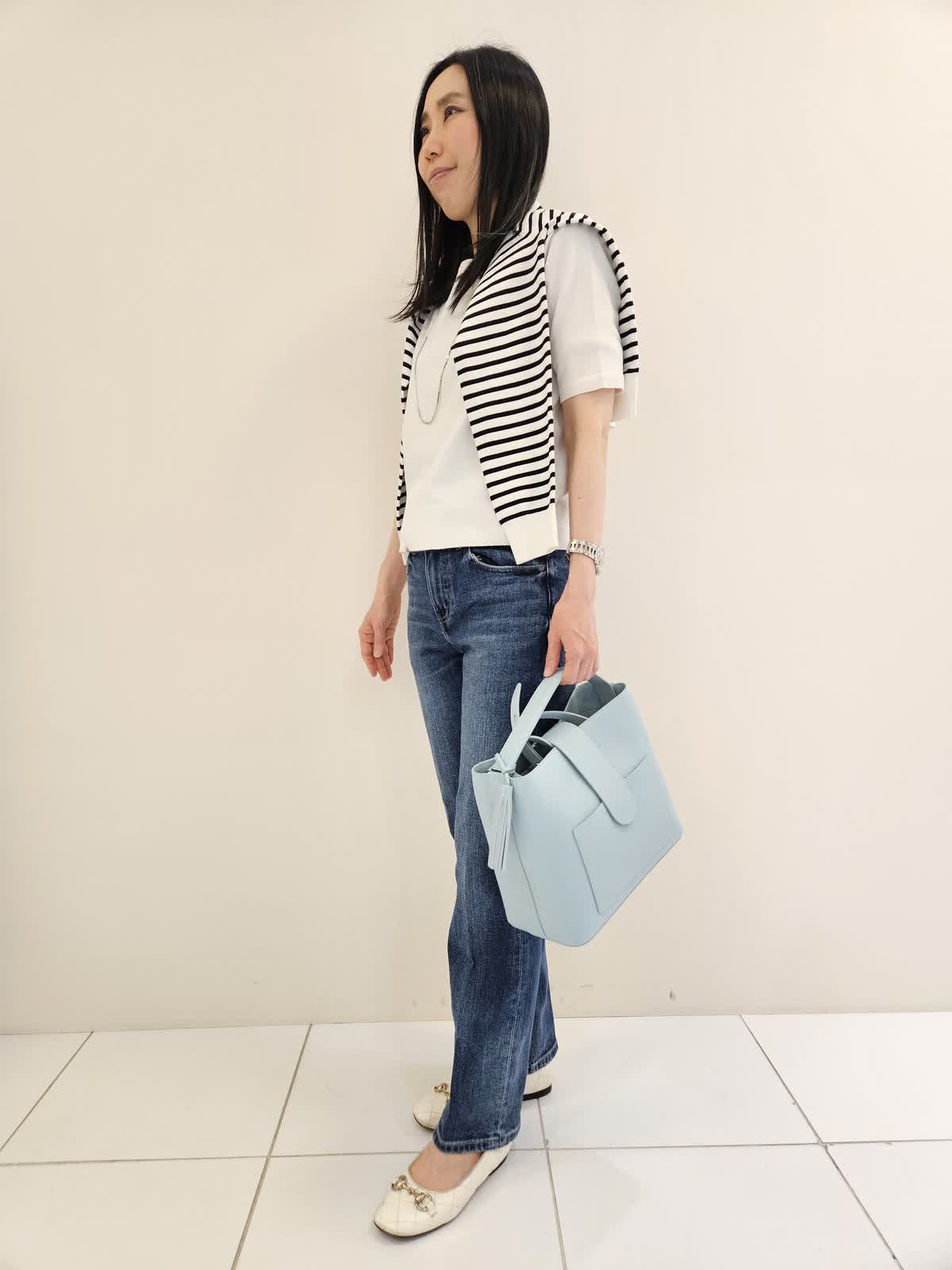 【着用サイズ・カラー】アンサンブル:オフホワイト9号・ネックレス:シルバー フリー ・バッグ:サックス フリー アンサンブルは腕がしっかり隠れるインナーとカーディガンは配色がポイントでさらっとしていて着やすいです。ネックレスは何でも合わせやすく軽いです。春色の鞄は収納力がありおでかけにお勧めです。