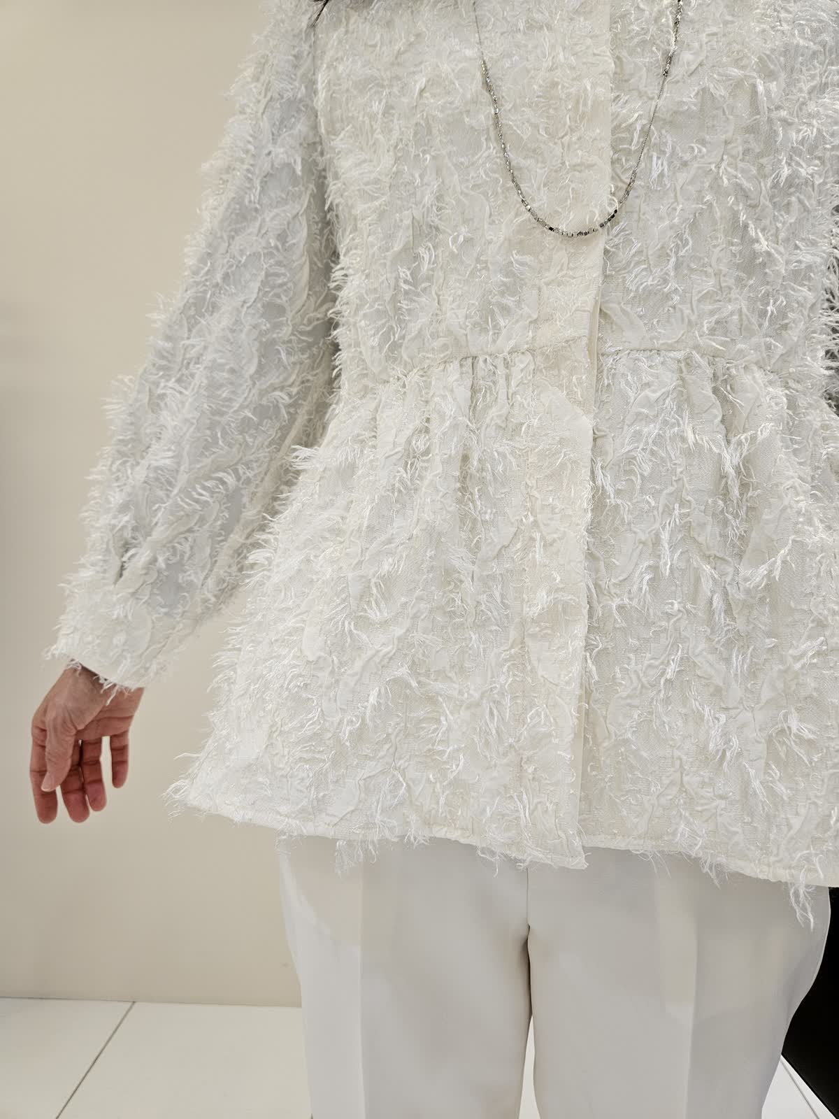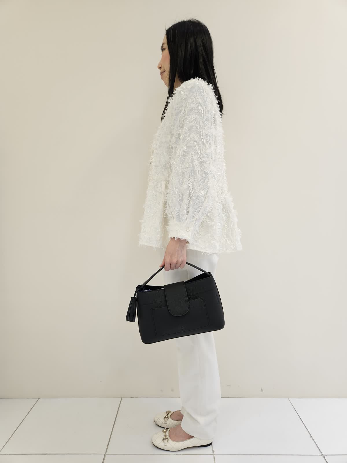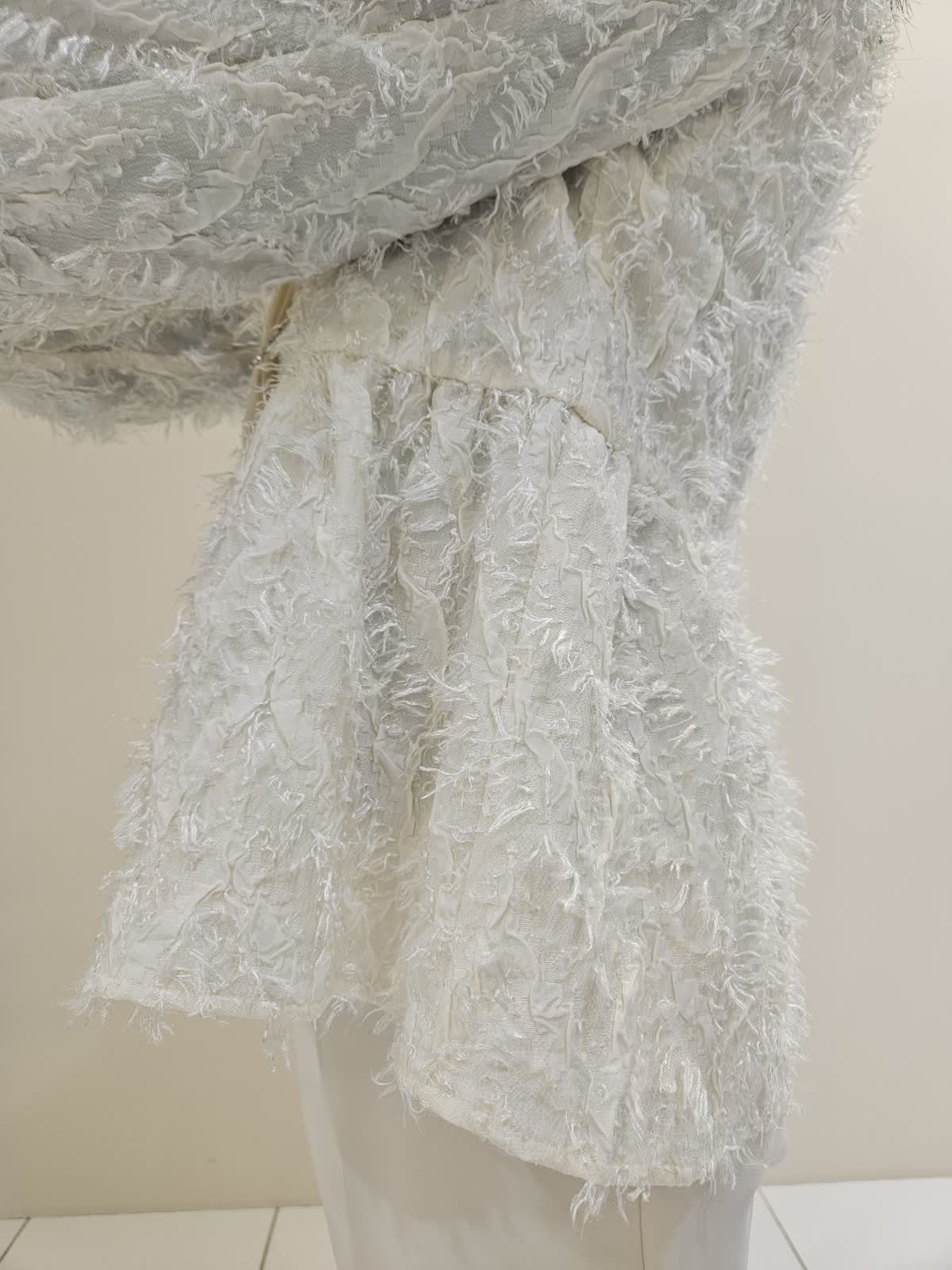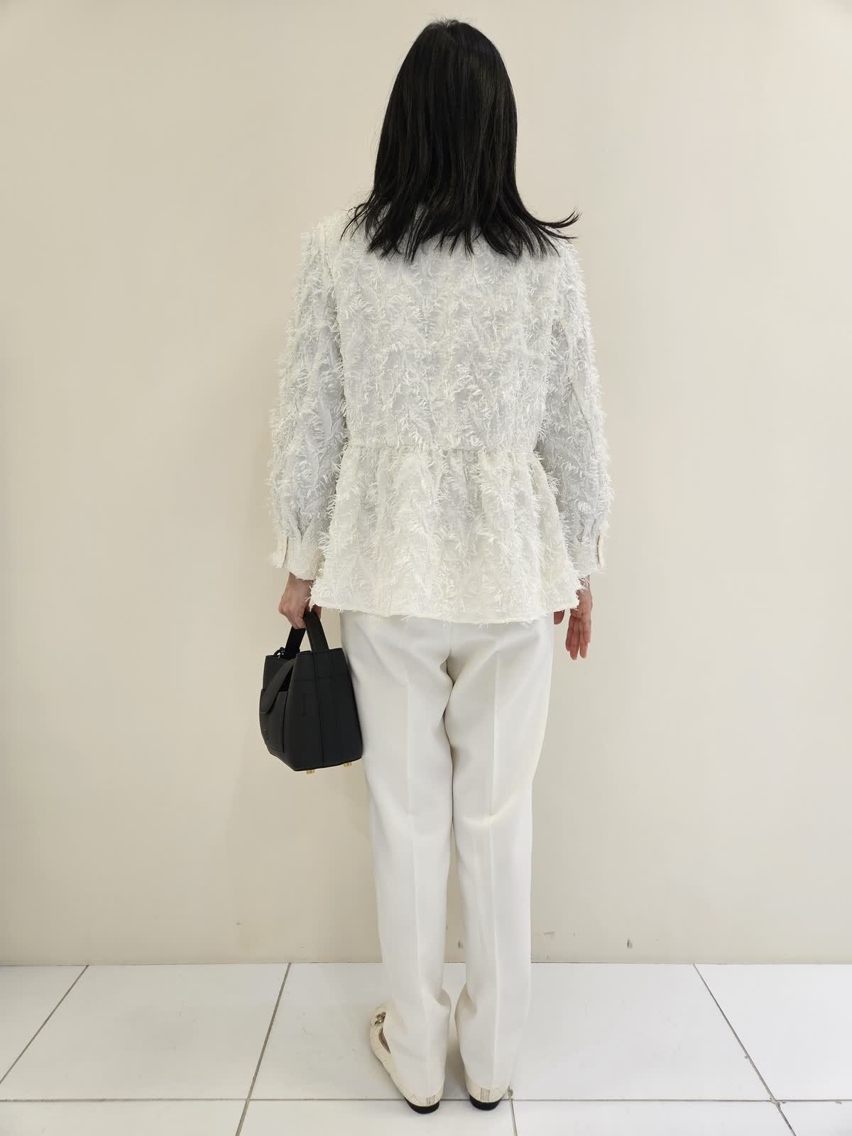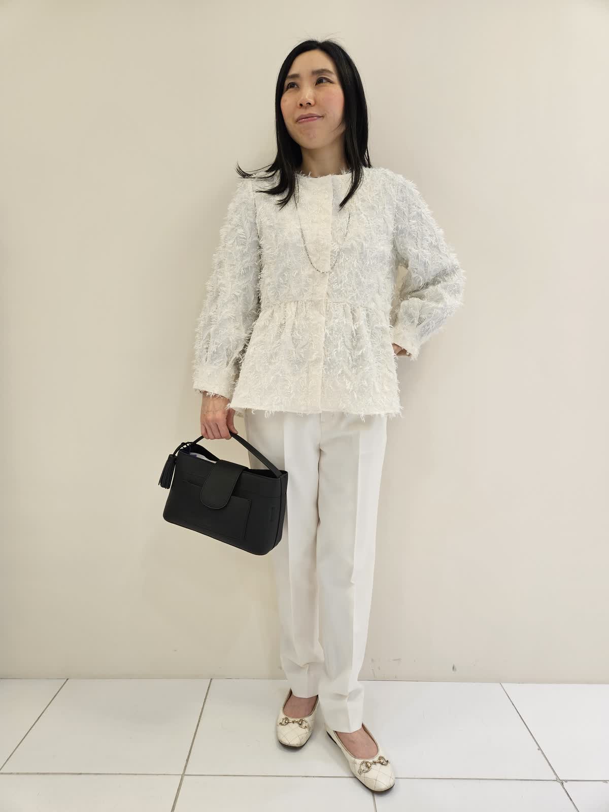 【着用サイズ・カラー】ブラウス:オフホワイト フリー・スパンツ:オフホワイト 7号 ・バッグ:ブラック フリー・ネックレス:シルバー フリー ブラウスはお洒落でお呼ばれにお勧めです。パンツは動きやすく普段にアンサンブル合わせも◎ネックレスはオン オフ両方に使えて便利でバッグはおでかけに便利です。