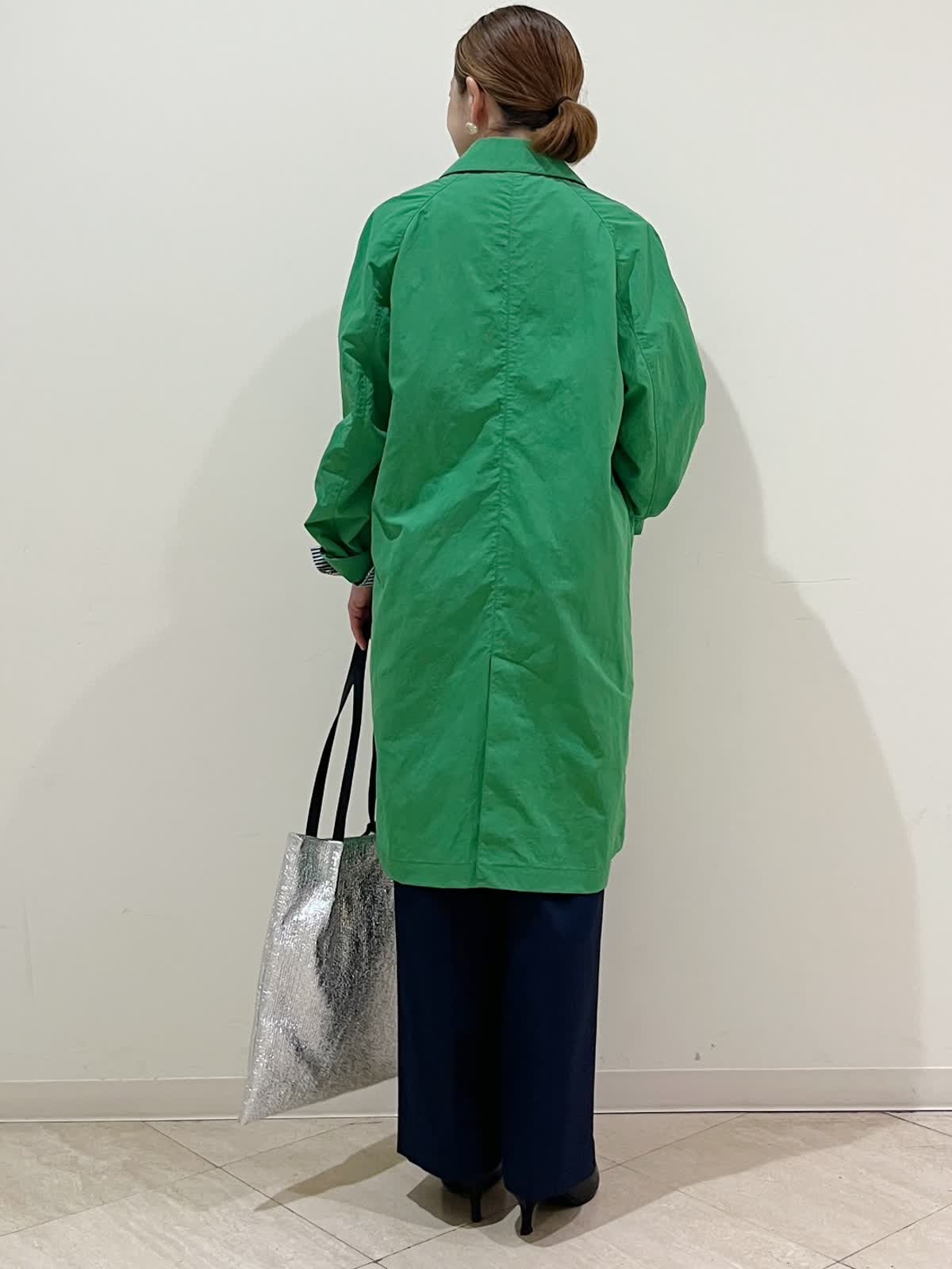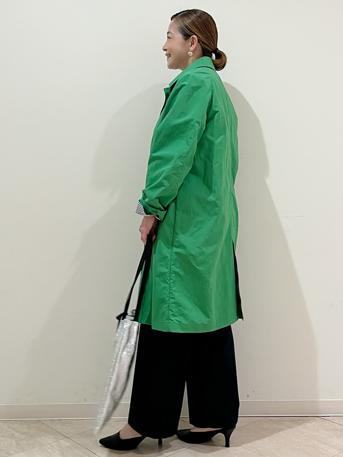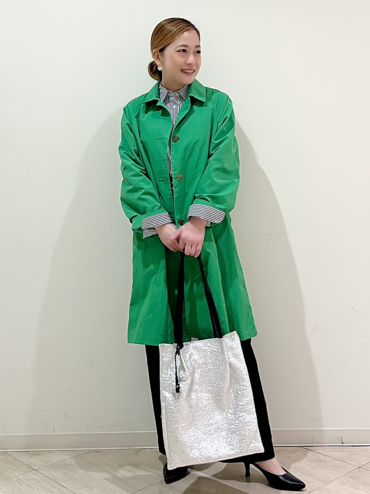 春を先取り大人のきれい色コートスタイリングです。パッと目を引くお気に入りのグリーンです。さらっと羽織るだけでスタイリングが素敵にまとまります。ゆったりサイズで抜け感を出して着ることが出来ます。きちんと感のあるストライプのシャツを合せてすっきりとした印象のスタイリングにしてみました。