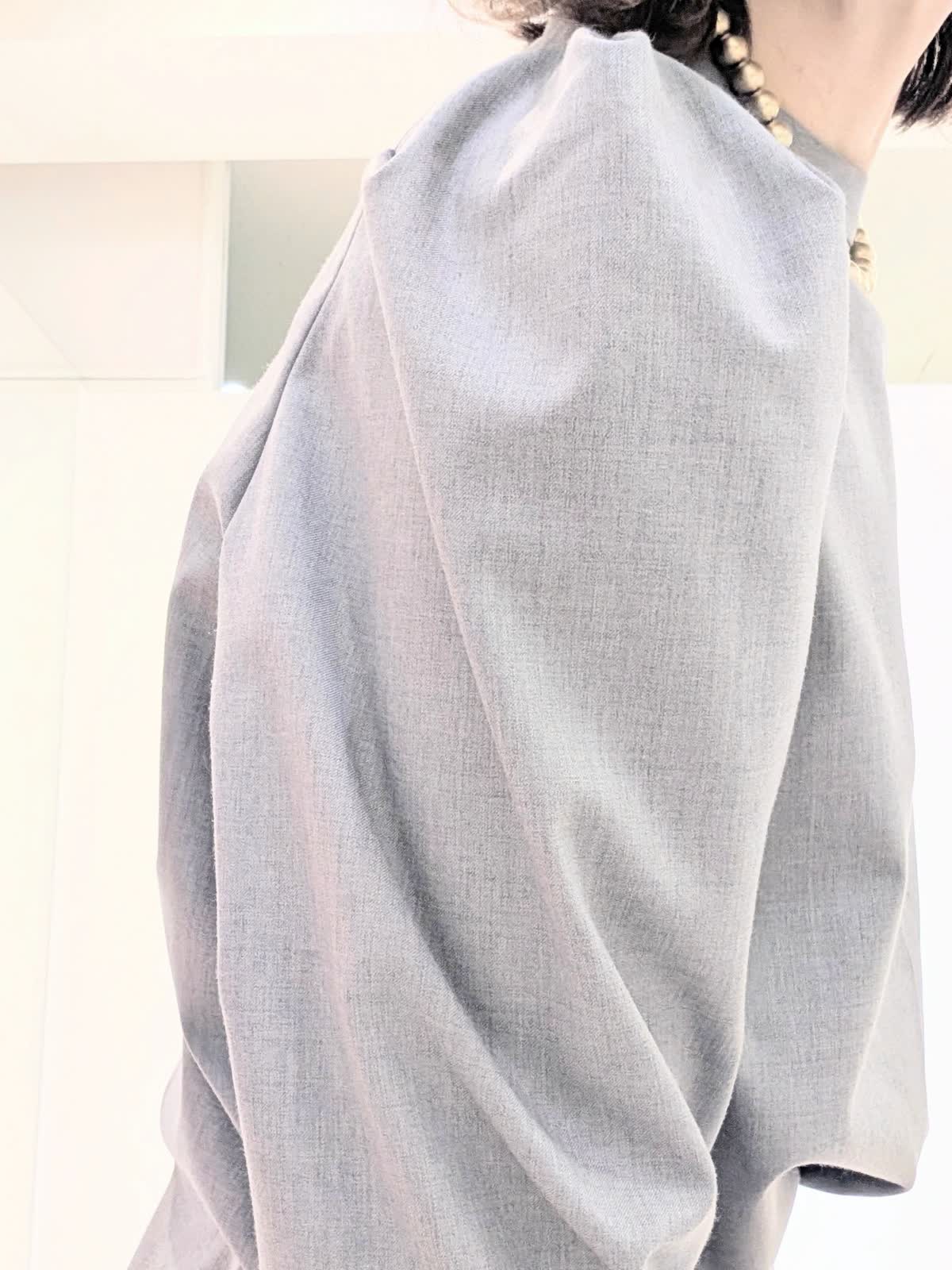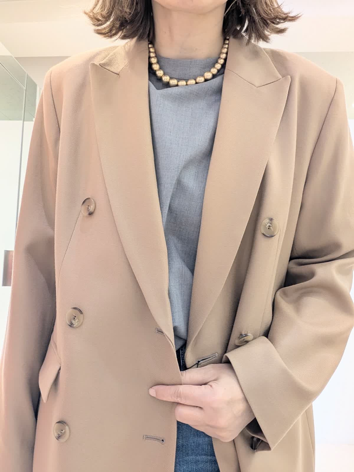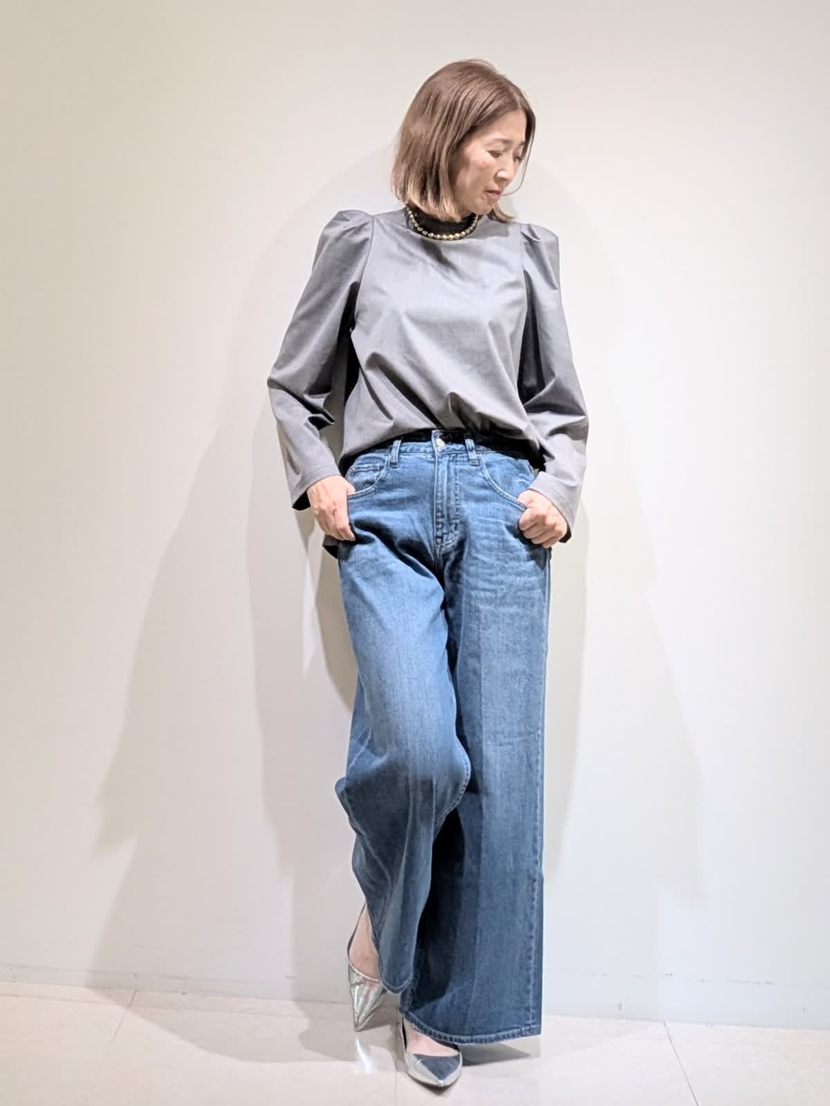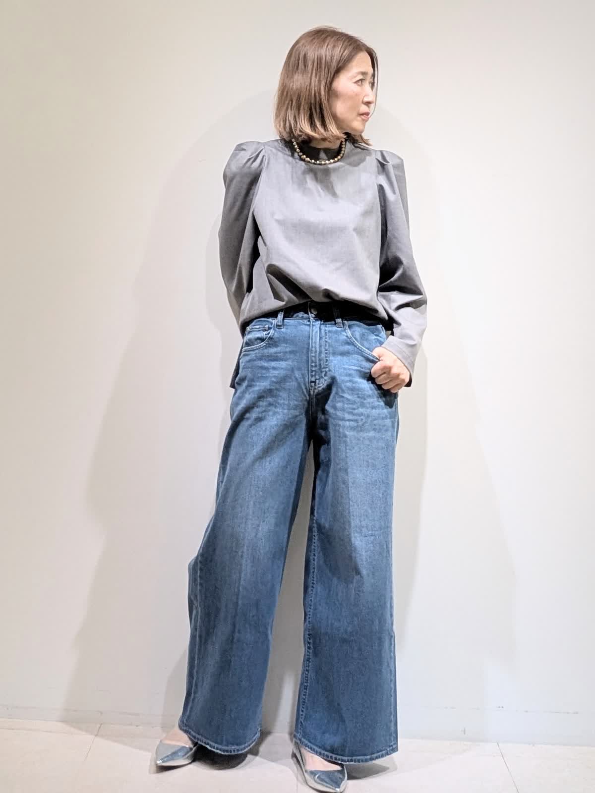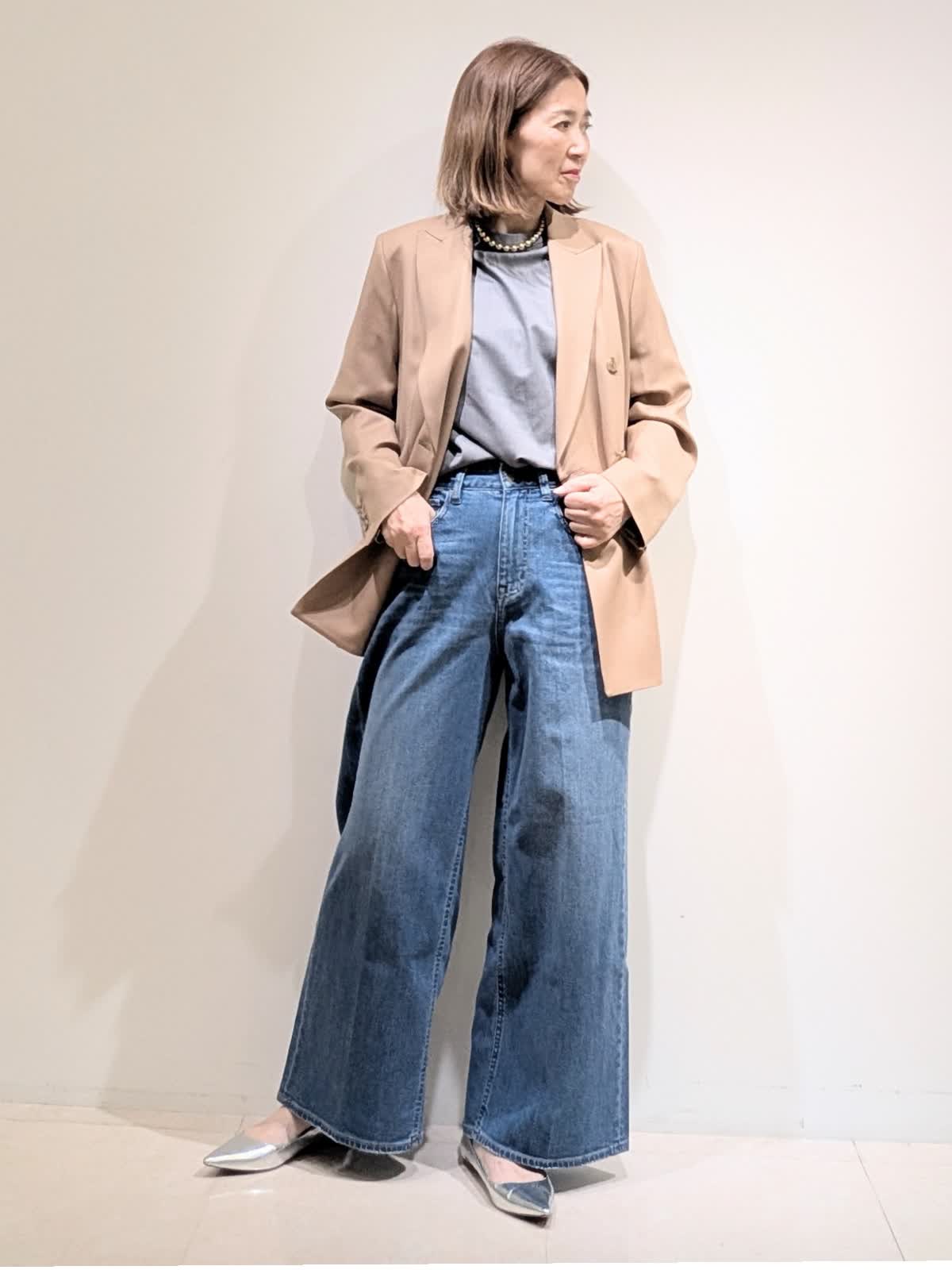 【着用サイズ9号】 三尋木奈保コラボ おすすめのジャケットとデザインブラウス。 ジャケットはクラス感のあるメイドインジャパン素材が着用シーンを選ばず、印象よくまとまります。仕立てはメンズライクなボックスシルエット。裏地キュプラ。 ブラウスは、生地が薄く程よい張り感があり、袖のタックデザインが立体的で美しいブラウス。 パンツは、《HealthyDENIM》からハイライズ・バギーデニムモデルを採用しイネド別注に。
