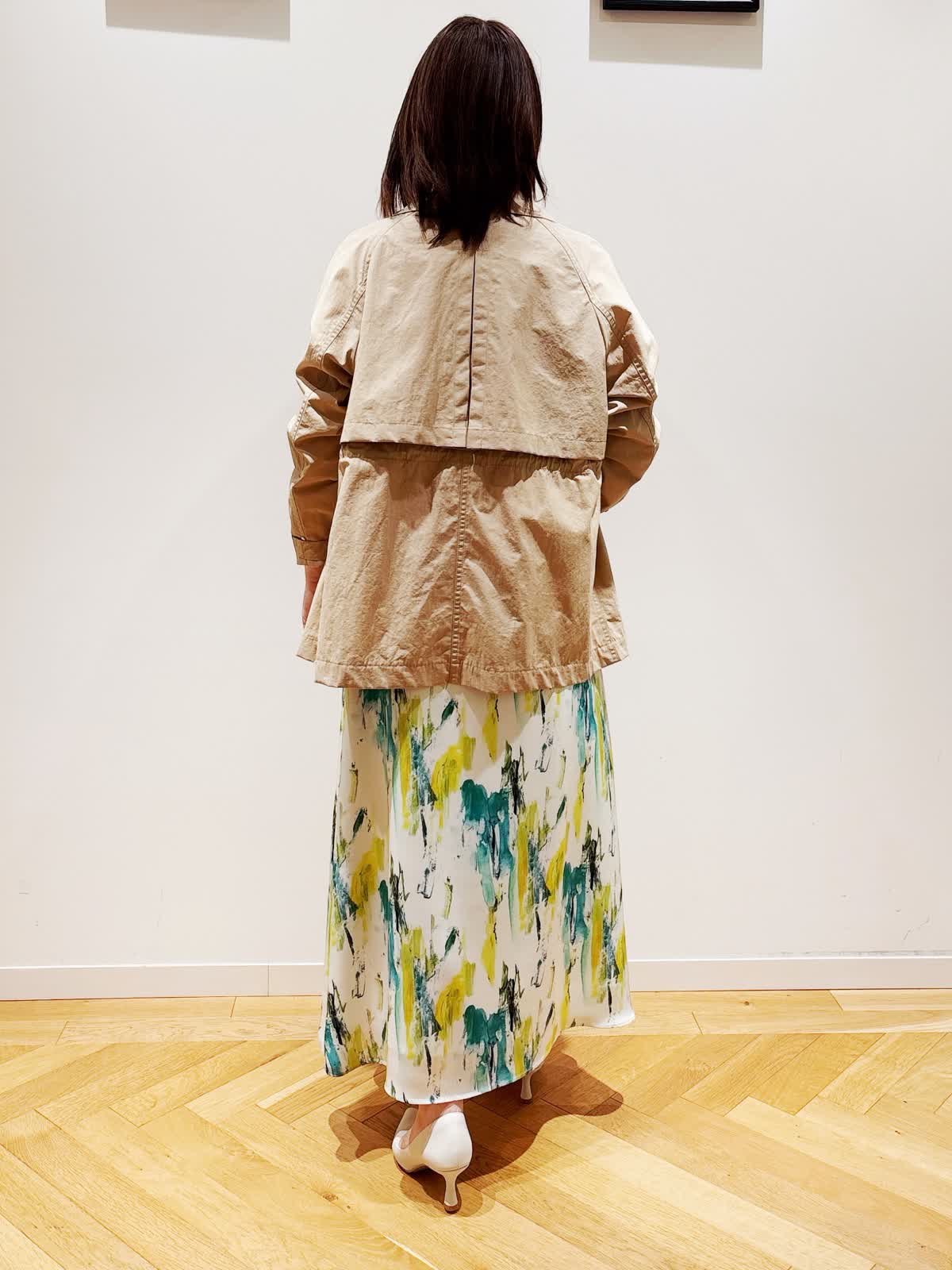 【着用サイズ】全て9号 【着用カラー】コート:キャメル ニット オフホワイト スカート:ペパーミント ショートトレンチは張りのある生地でとっても軽いコートです。ウエストが絞れてお好みのシルエットを楽しめます。裏地がないので、長く愛用していただけます。ニットはオーバーサイズでゆっくりした着心地です。スカートの時はインしてバランスよく着こなせます。プリントスカートと合わせて爽やかにコーディネートしました。