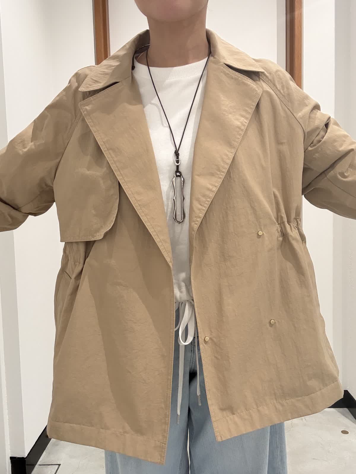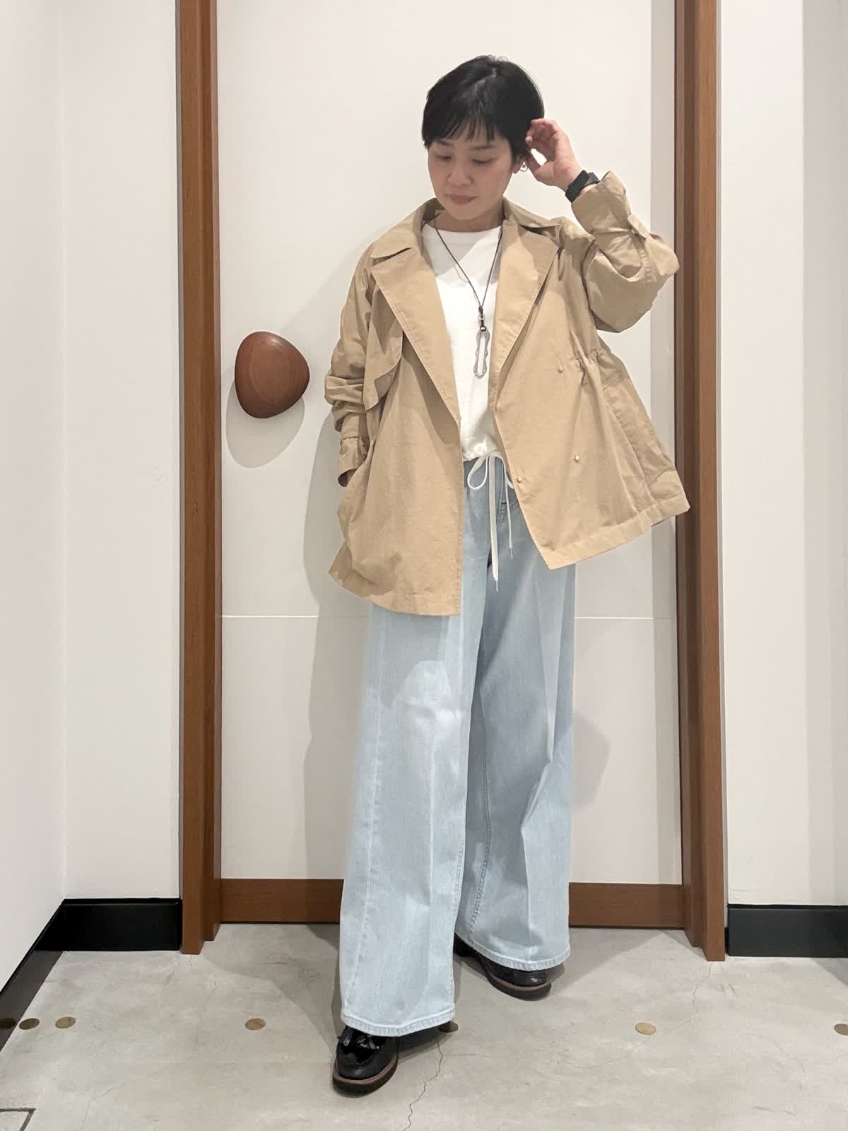 【着用サイズ】 コート: 7号 パンツ:5号 【着用カラー】 コート:キャメル パンツ :サックス 春の休日お出かけスタイル。コートはAラインでウエストが絞れるデザインなので好みのシルエットを楽しめるうえに、インナーには厚手のニットからシャツ,カットソーといった薄手のアイテムまで長いスパンで着ていただける素材です。着たまま座っても邪魔にならない着丈なのもポイント。毎年好評のヘルシーデニムは明るめカラーのサックスで春らしく。センタープレスのバギーシルエットなので腰長効果も抜群です。