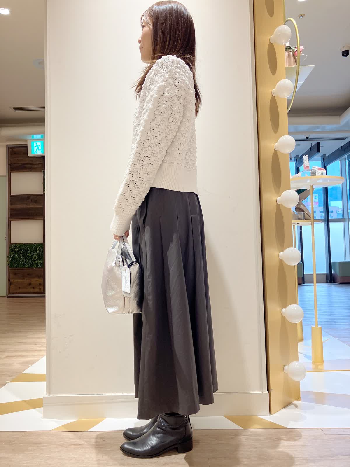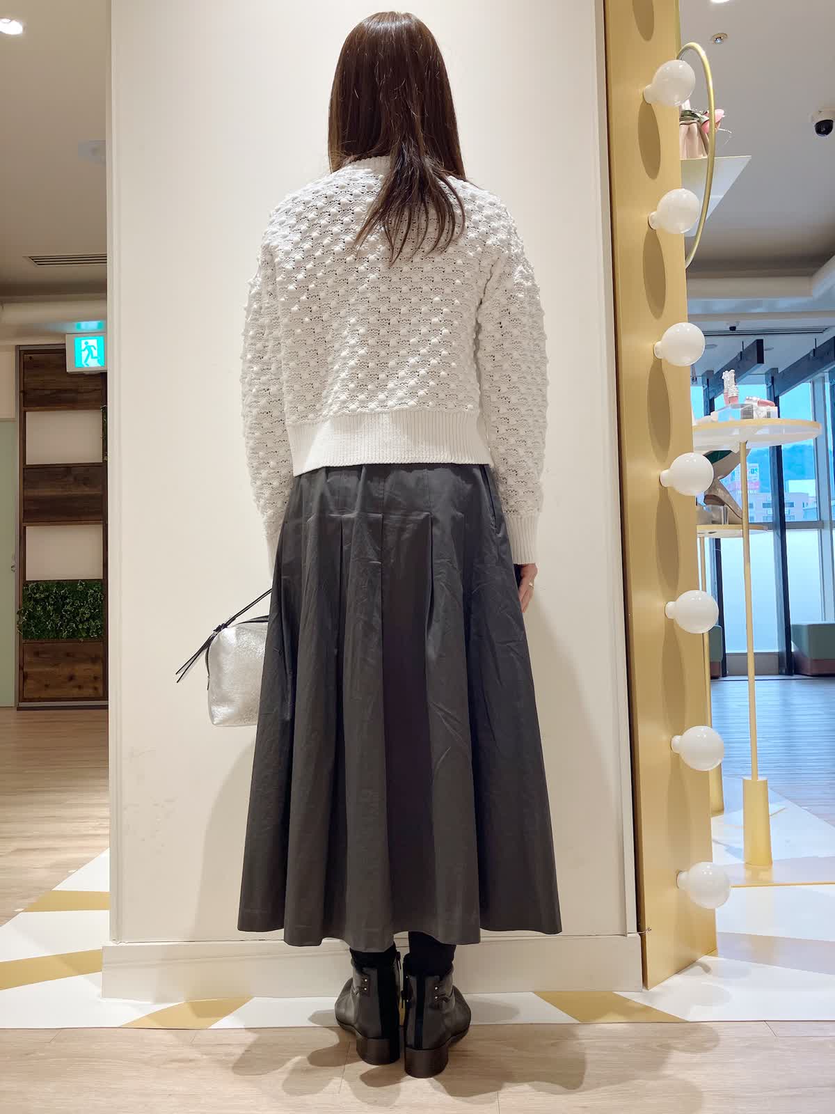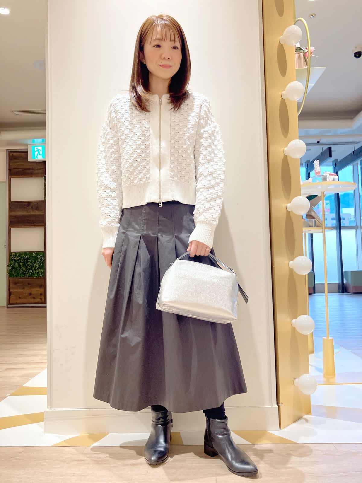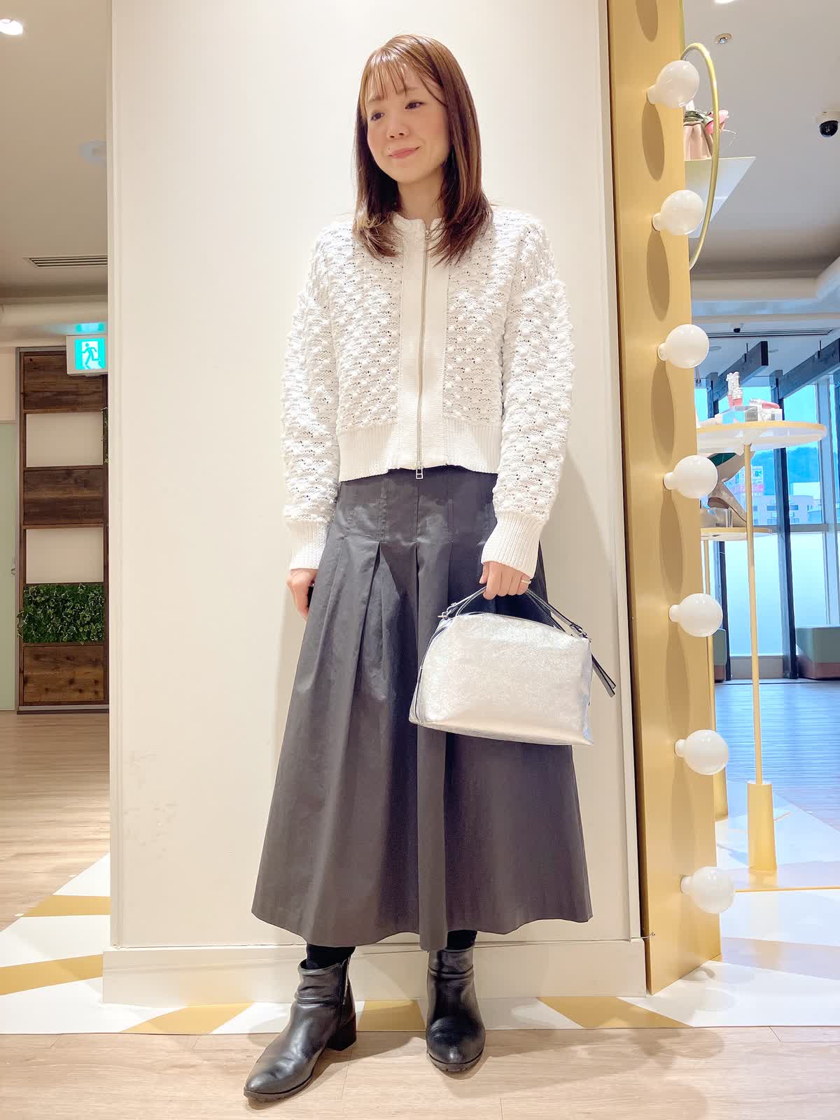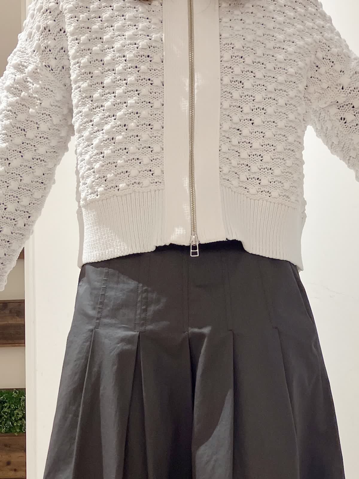 【着用サイズ】カーディガン:9号 スカート:7号 【着用カラー】カーディガン:オフホワイト スカート:チャコールグレー コーディネートのテーマは初春のお出かけスタイリングです。 ポコポコした素材感のカーディガンは、ダブルジップでコンパクトなので、着膨れせず、今からの時期薄手のコートのインナーにも着やすいです。着丈短めでフレアスカートとの相性もバッチリ。初春のお出かけコーデにおすすめです。