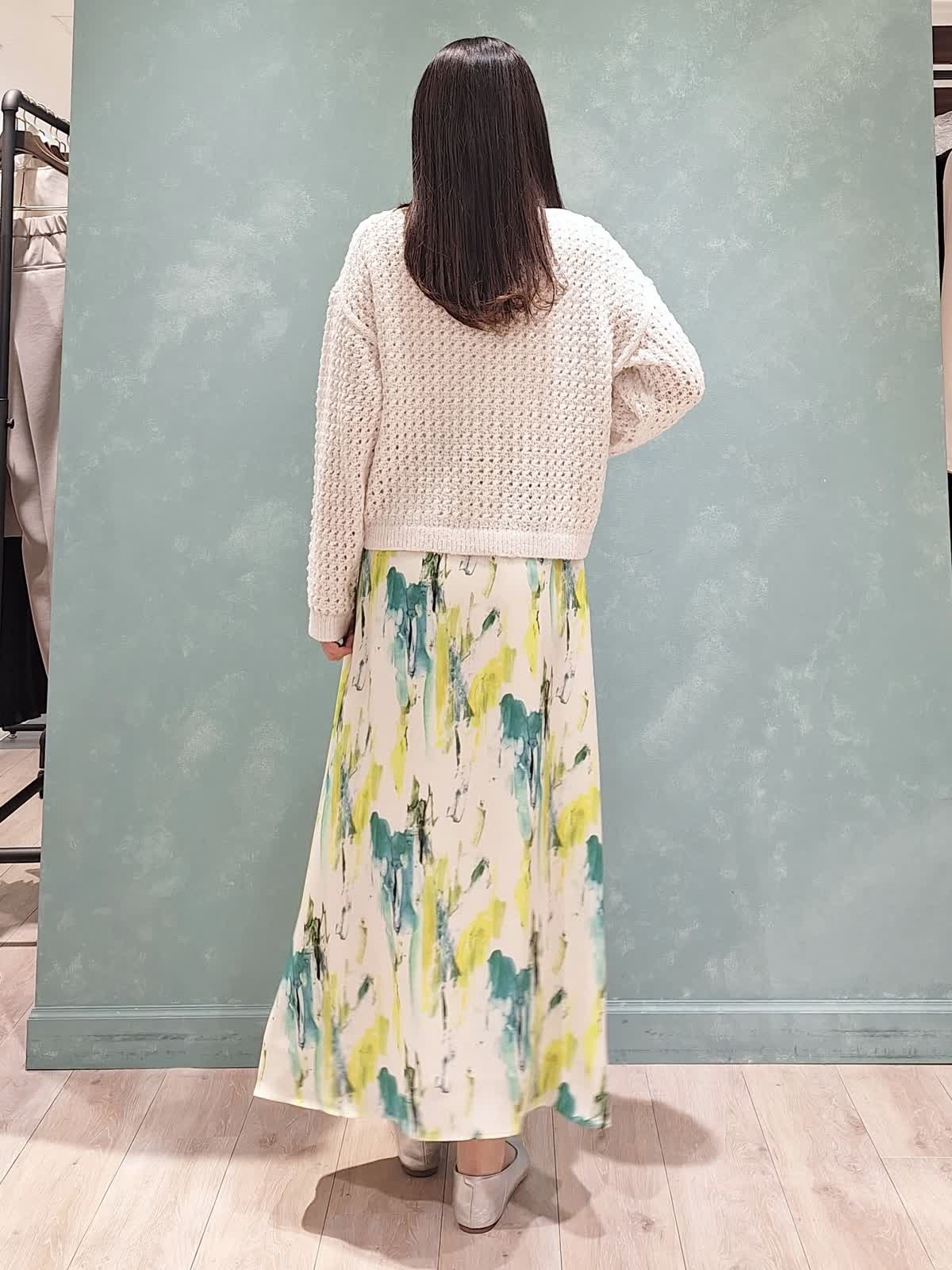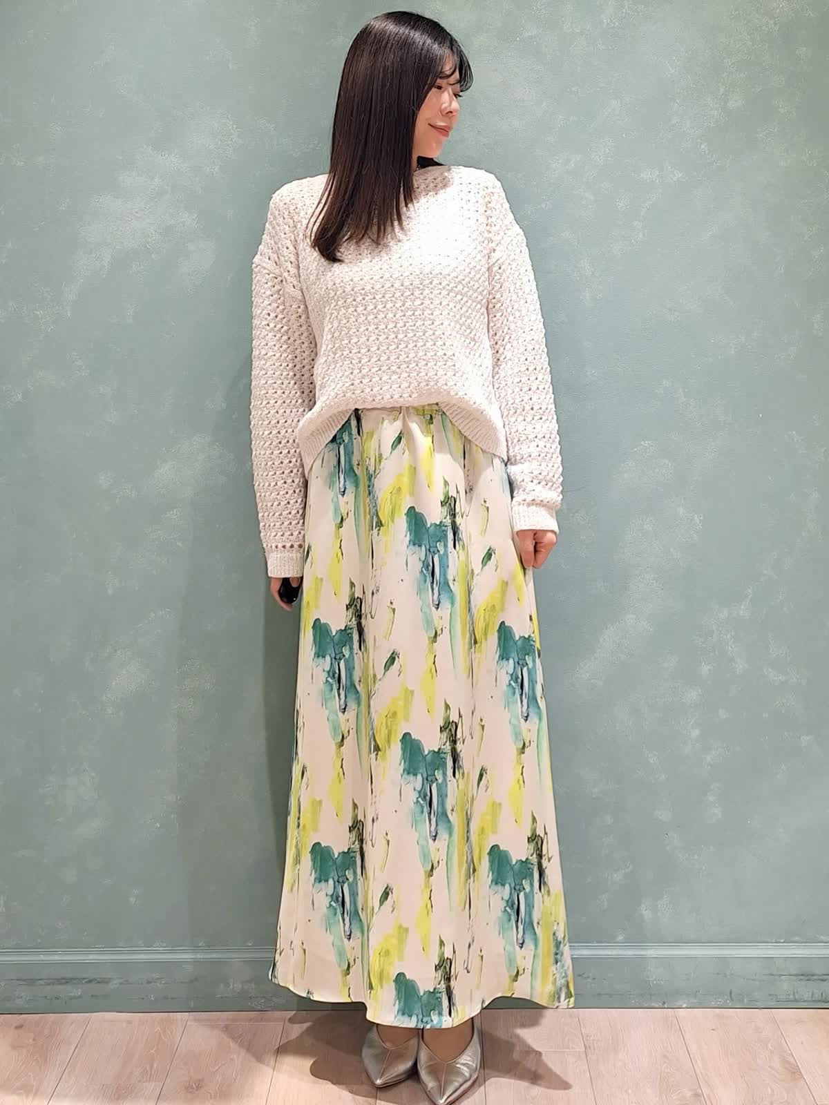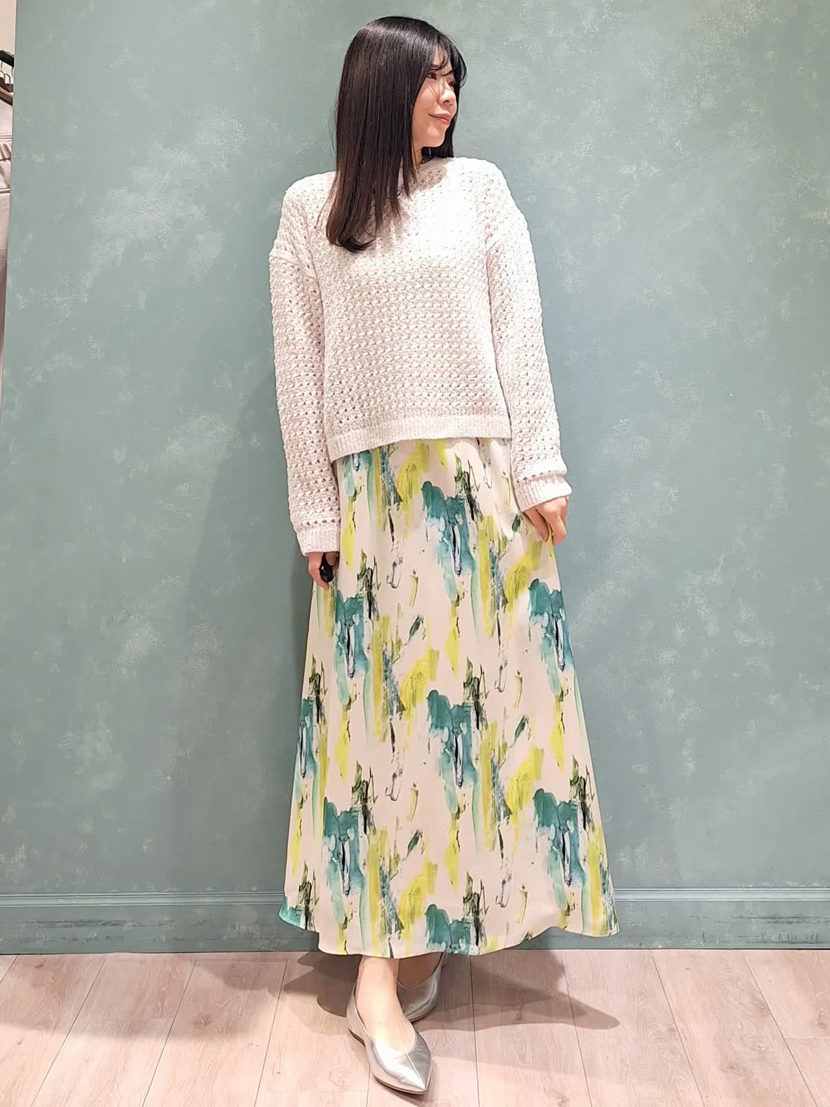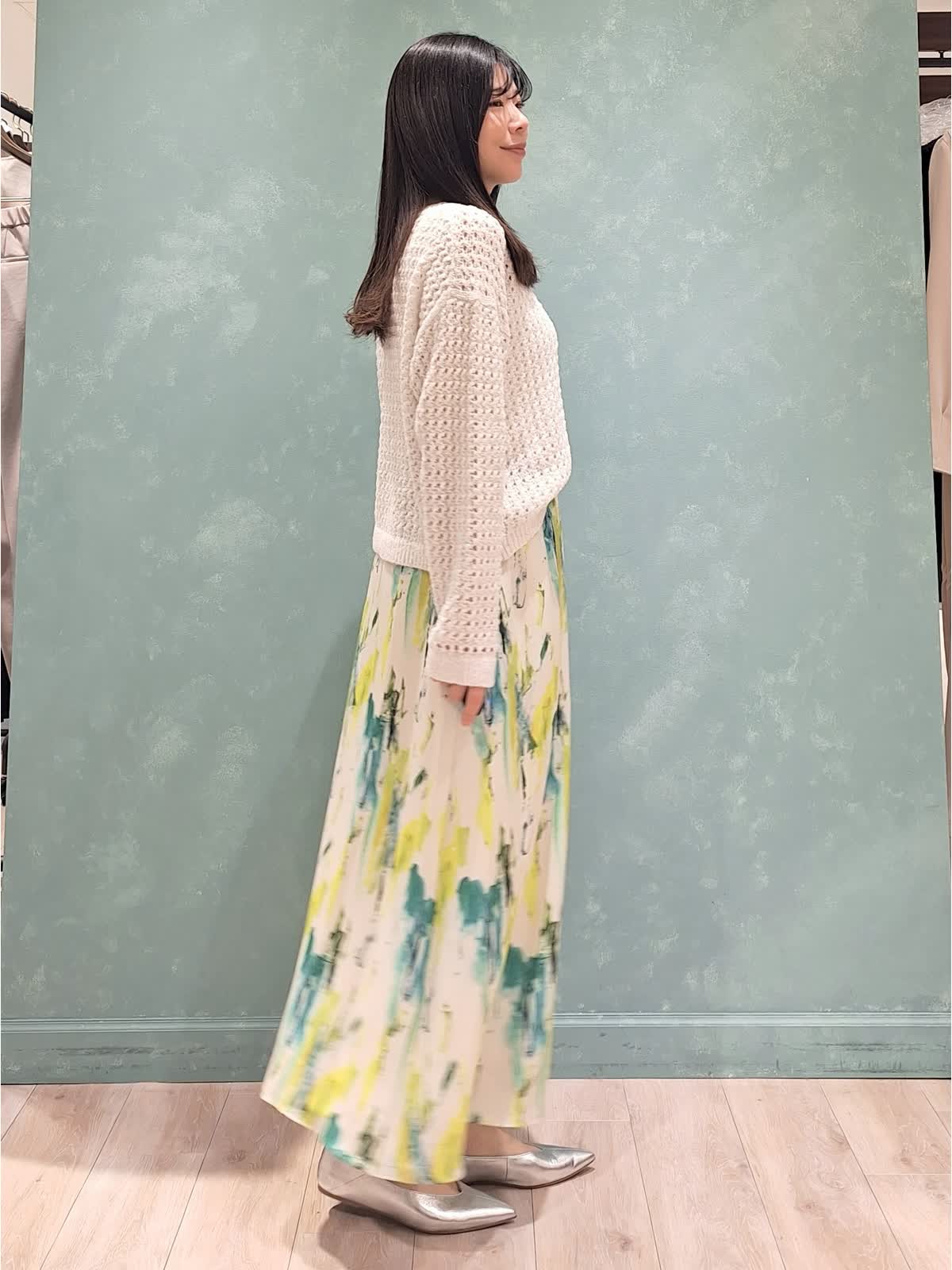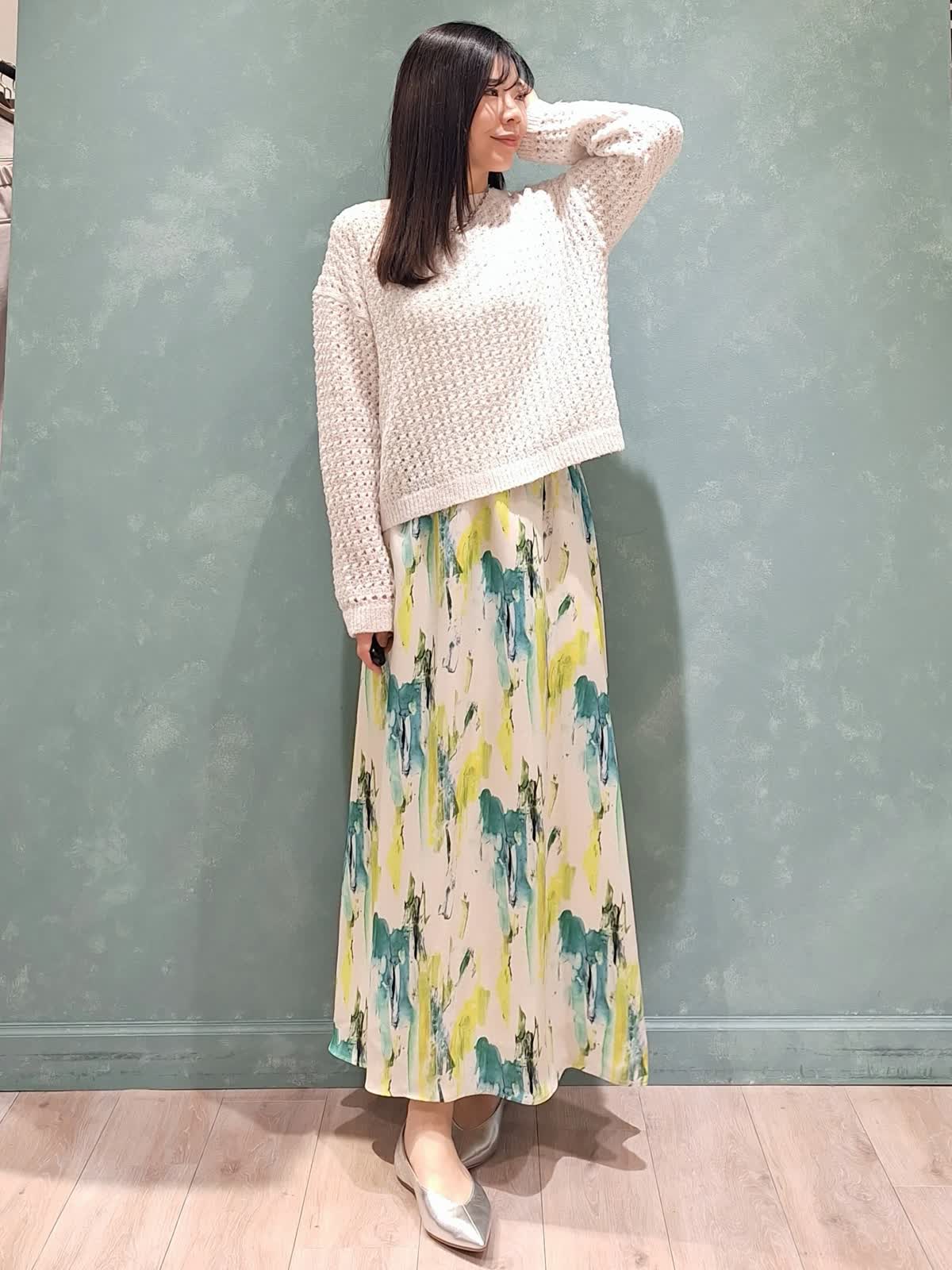 【着用サイズ、カラー】ニット:9号、オフホワイト スカート:7号、ペパーミント 春の休日スタイル。派手すぎないキラキラのスパンコールニットにINEDオリジナルプリントスカートを合わせて爽やかにコーディネートしました。スカートはウエストがゴム仕様、絞れるドロスト紐付きで、食後も楽に着ていただけます♪足元はシルバーのフラットシューズをチョイス。お花見にもお勧めです!ぜひチェックしてみて下さいね。