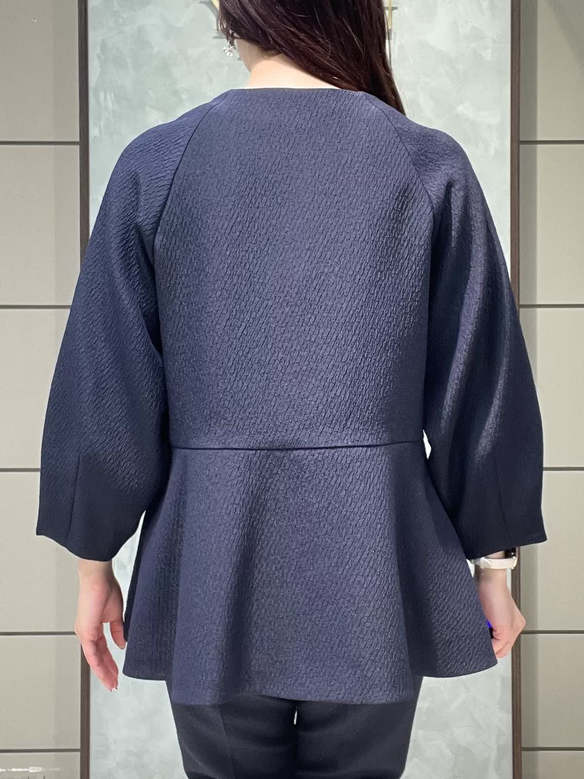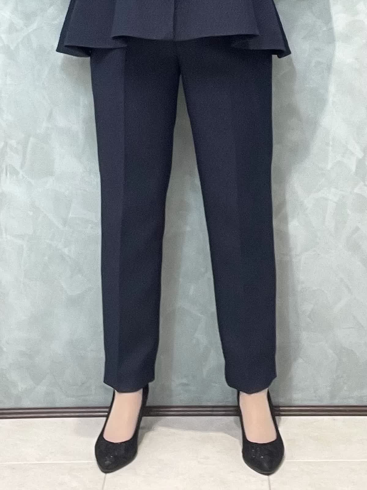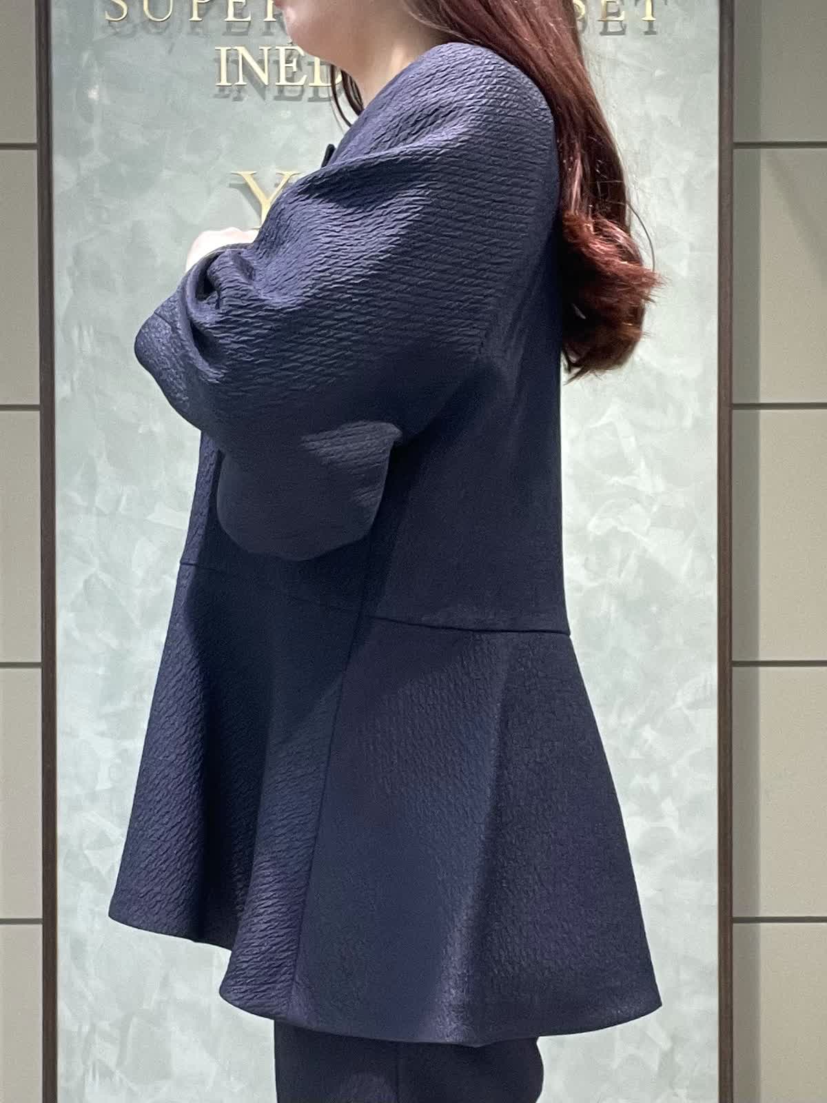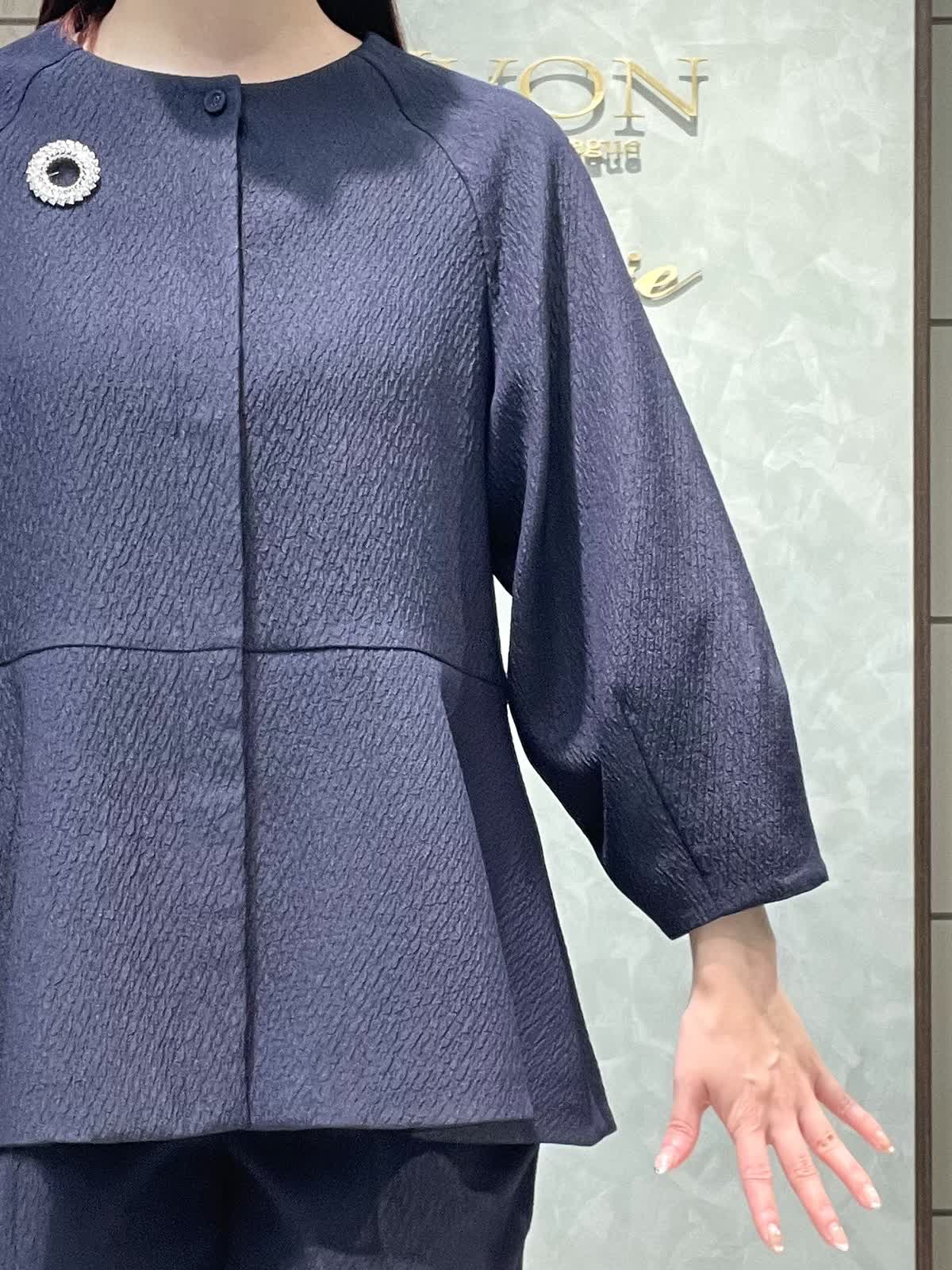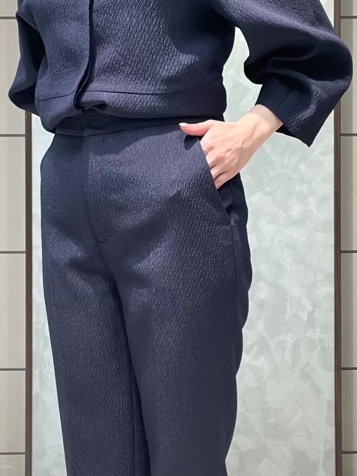 【着用サイズ】ブラウス:7パンツ:7号 セレモニー、お仕事にオススメのセットアップスタイリングです。さらっとしていて肌に張り付かないジャガードのお素材です。ブラウスはカラーレスでスッキリ、ペプラムシルエットでメリハリが出てスタイルアップします。ラグランスリーブでかちっとしすぎず、前を開けて羽織としても◎お袖丈は手首が出るくらいです。パンツはテーパードシルエットです。肌に張り付く感じが無く、後ろゴムなので快適な履き心地です。着丈は157センチでくるぶしくらいです。