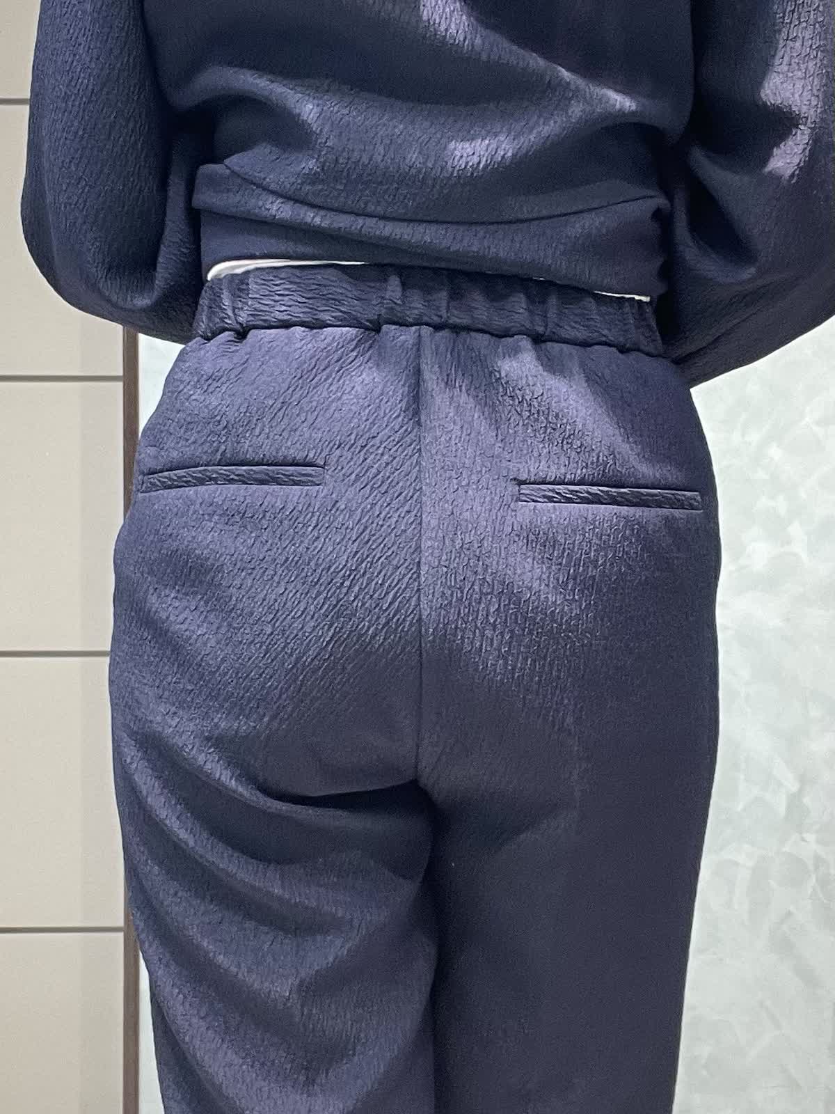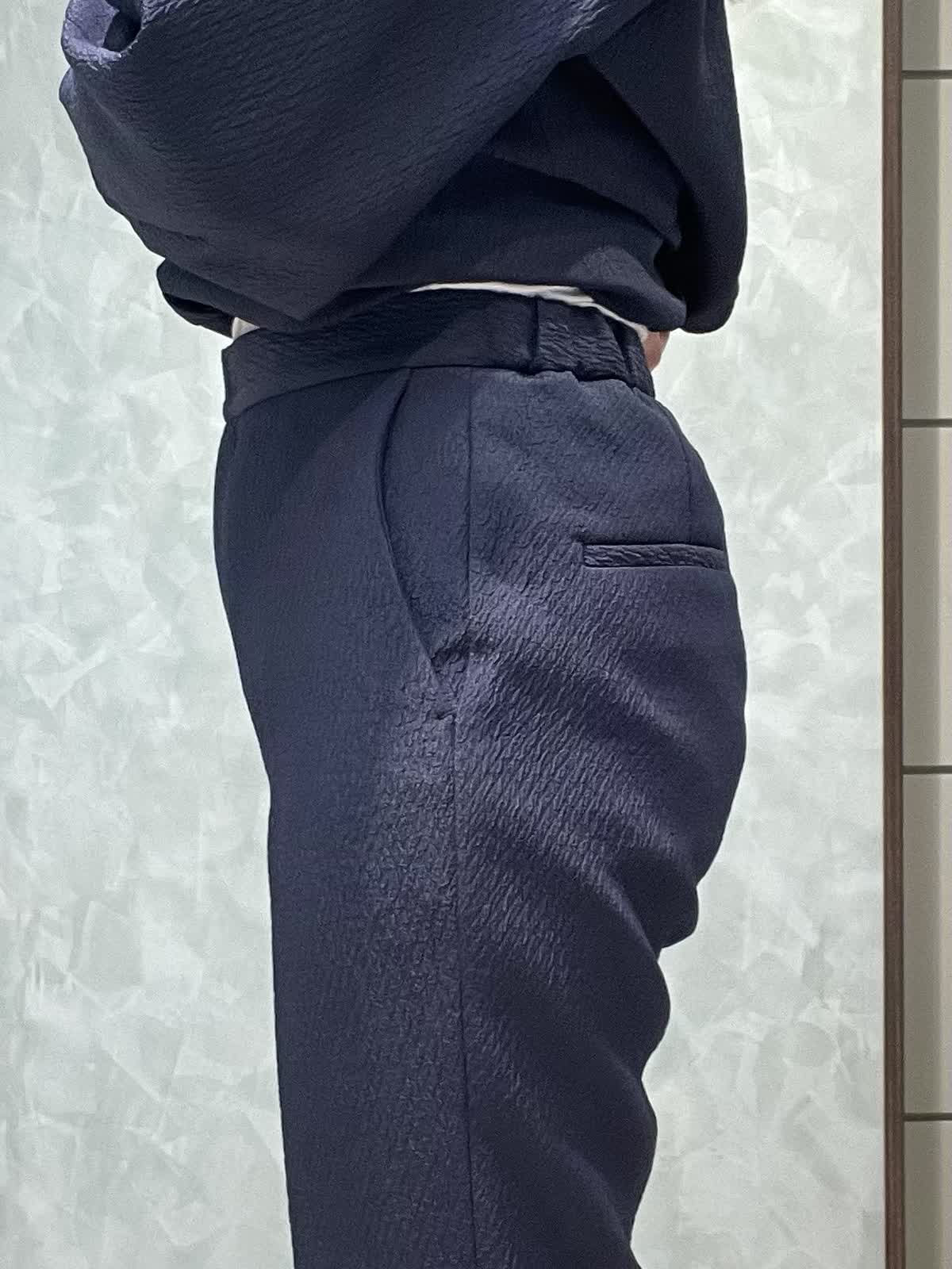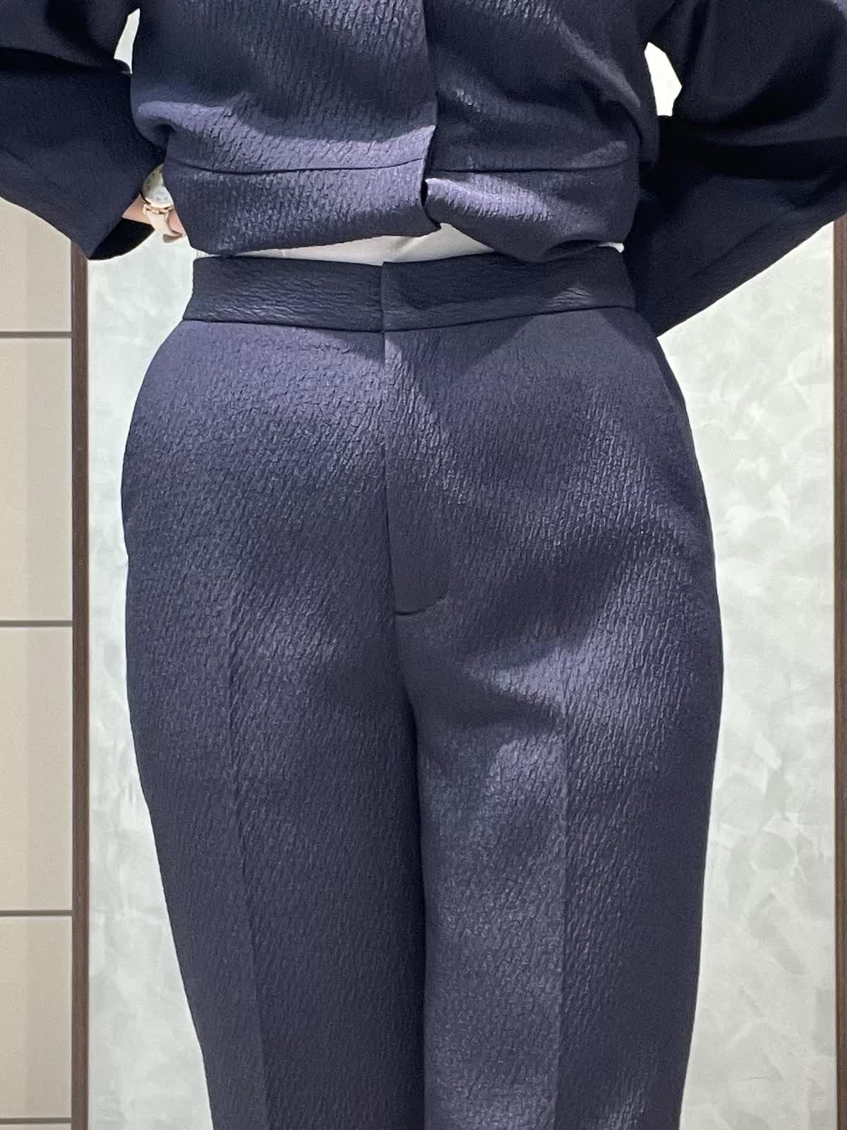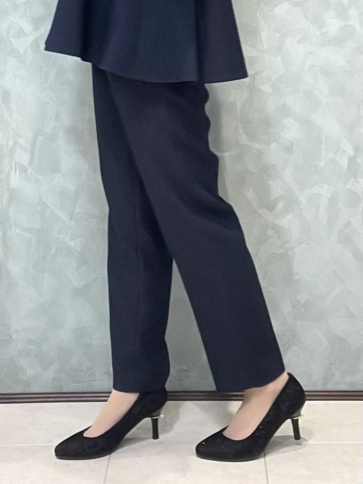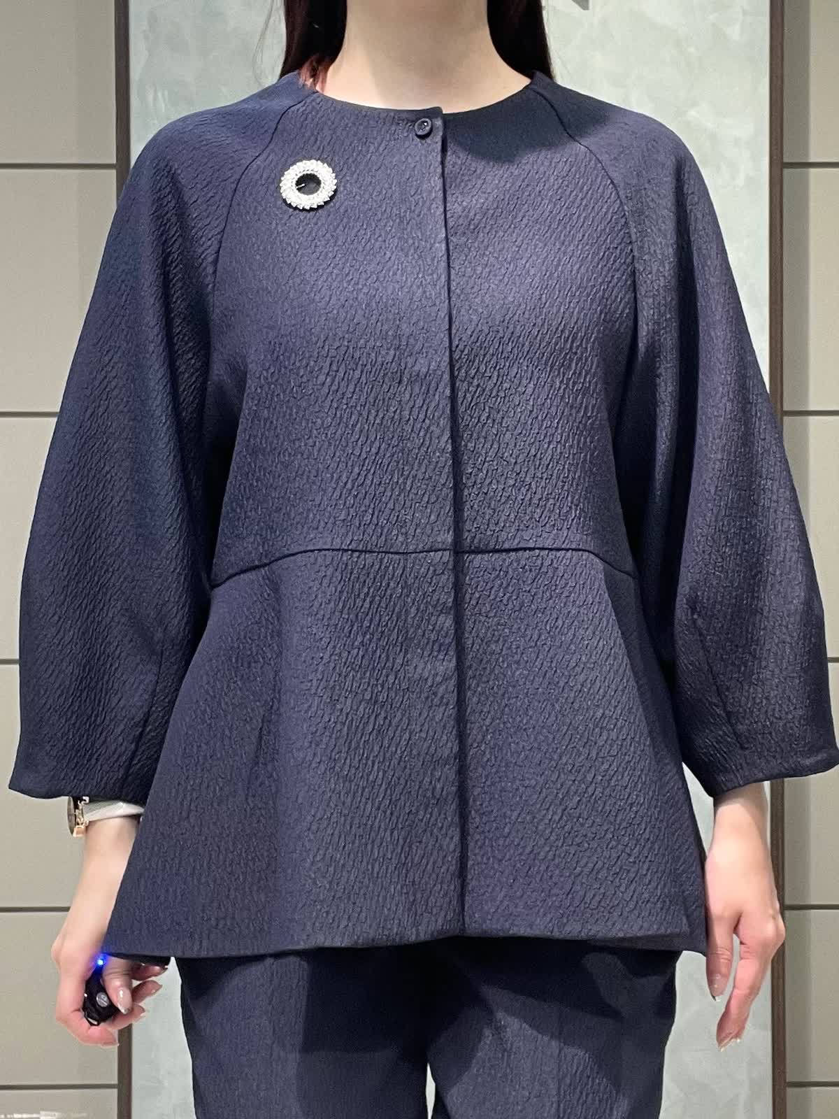 【着用サイズ】ブラウス:7パンツ:7号 セレモニー、お仕事にオススメのセットアップスタイリングです。さらっとしていて肌に張り付かないジャガードのお素材です。ブラウスはカラーレスでスッキリ、ペプラムシルエットでメリハリが出てスタイルアップします。ラグランスリーブでかちっとしすぎず、前を開けて羽織としても◎お袖丈は手首が出るくらいです。パンツはテーパードシルエットです。肌に張り付く感じが無く、後ろゴムなので快適な履き心地です。着丈は157センチでくるぶしくらいです。