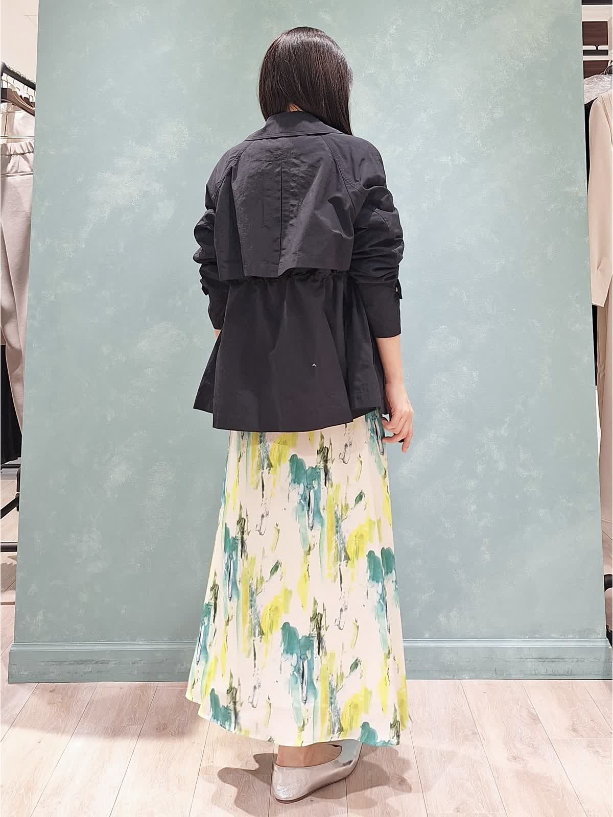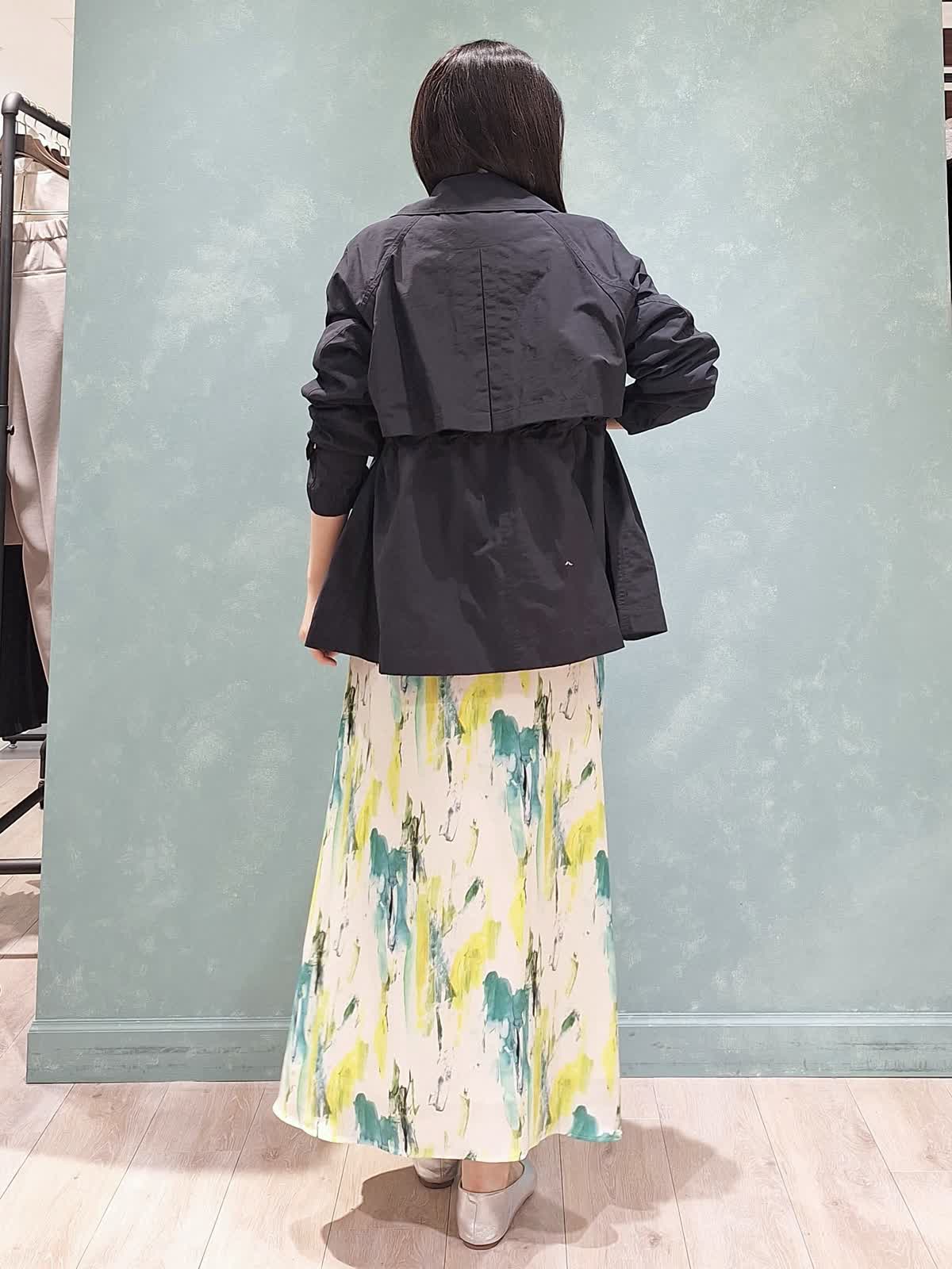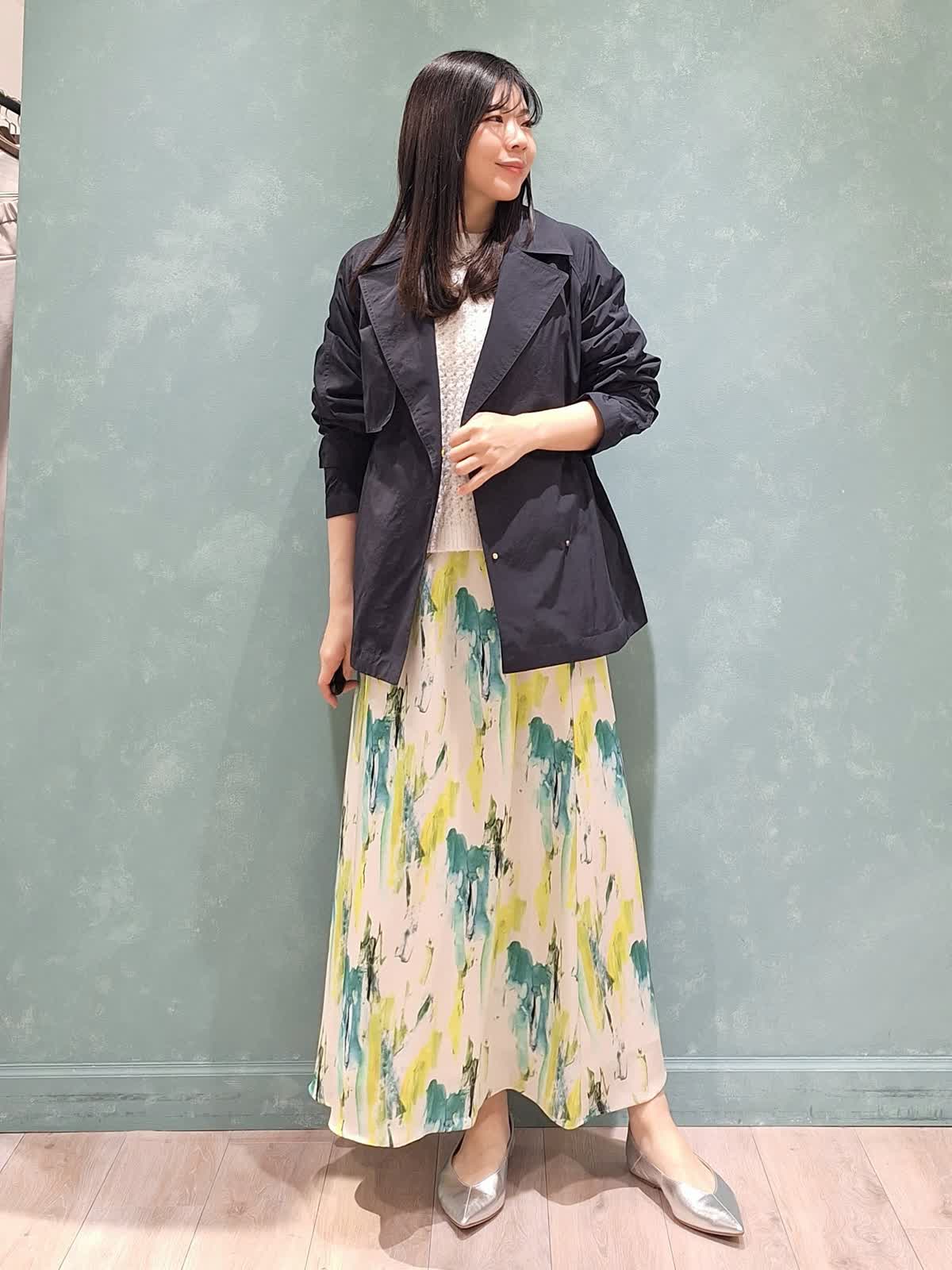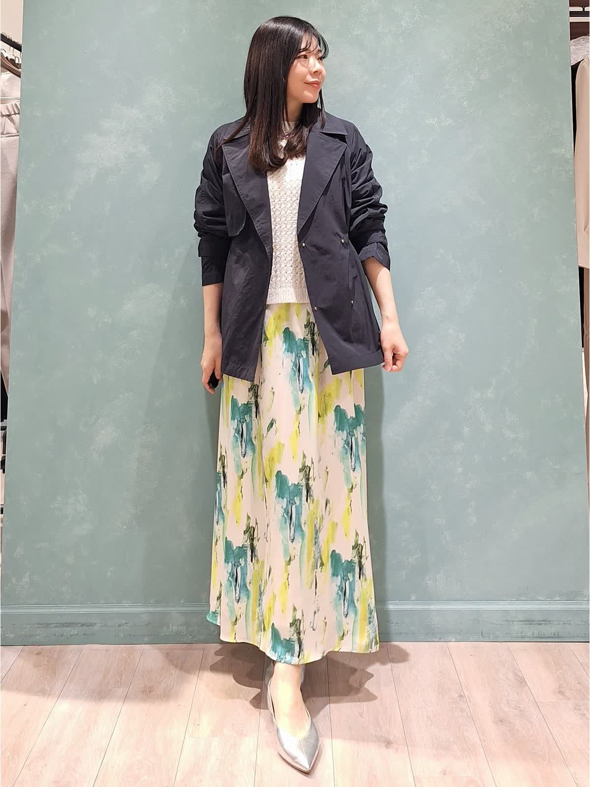 【着用サイズ、カラー】コート:7号、ネイビー ニット:9号、オフホワイト スカート:7号、ペパーミント 春の休日お出掛けスタイル。アウターは、ウエストが絞れてスタイルアップが叶うINEDのショートトレンチコート。お袖口も2段階絞り調節が可能。キュっと上げて抜け感のある着こなしがお勧めです!スパンコールニット、INEDオリジナルプリントのスカートを合わせて爽やかカジュアルにコーディネートしました。桜が咲き始めるこれからの季節にぴったり♪是非チェックしてみて下さいね☆