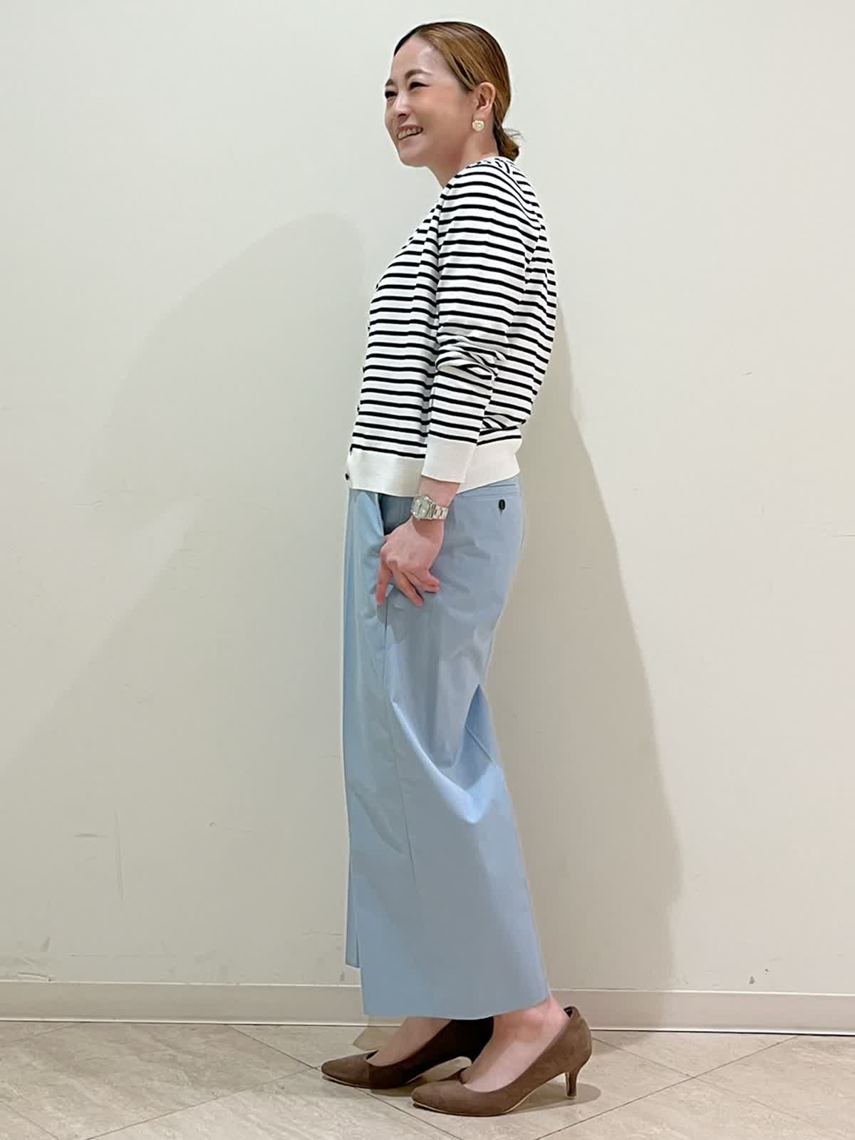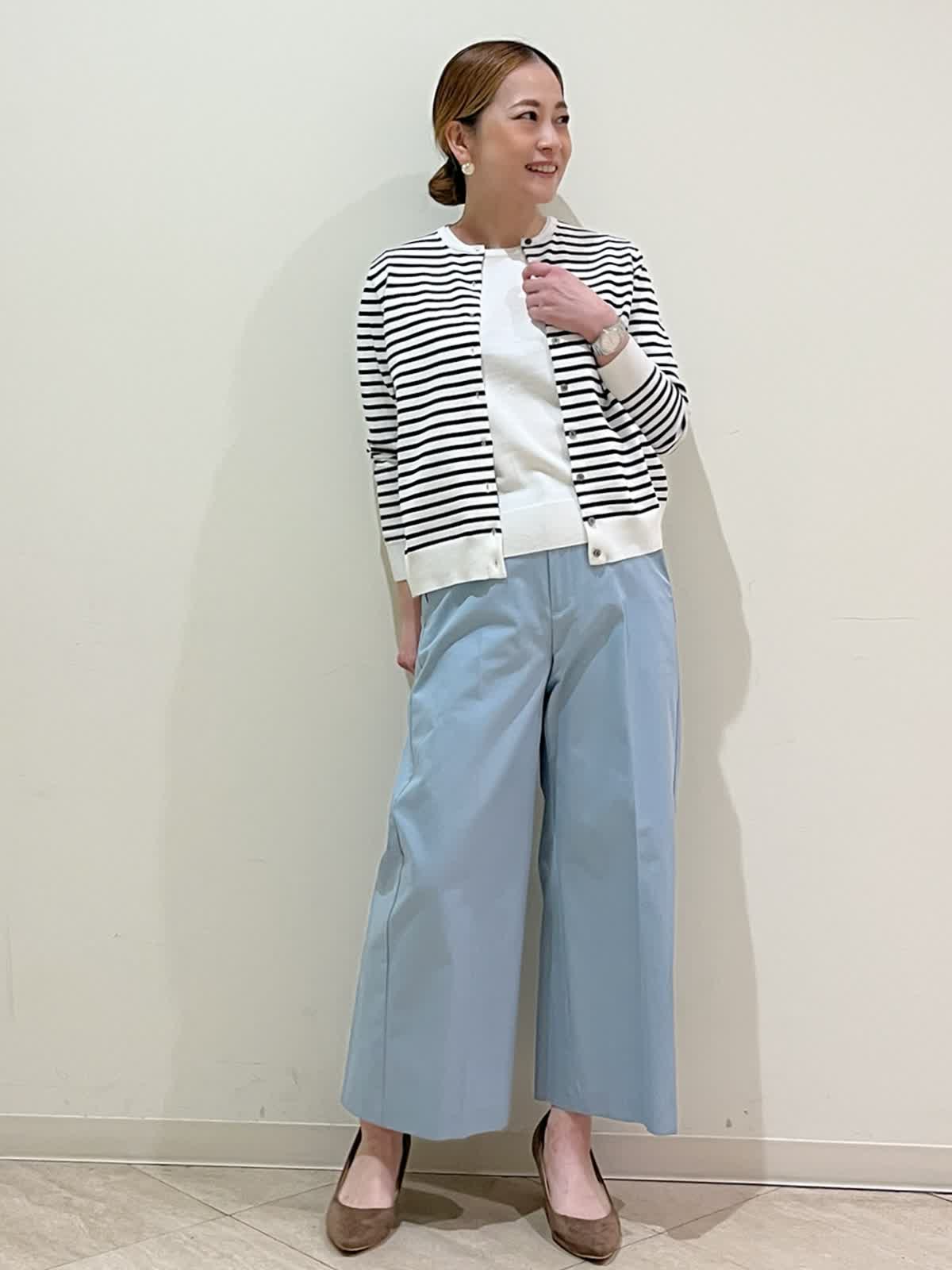【着用サイズ】アンサンブル:9号 パンツ:9号 【着用カラー】アンサンブル:オフホワイト パンツ:ブルー 春のきれいめカジュアルスタイリングです。ボーダーのアンサンブルにブルーのワイドパンツ。トップスはコンパクトにボトムはゆったりシルエットで合わせてみました。アンサンブルは着心地が良くそれぞれ単品でも着回しも効きます。