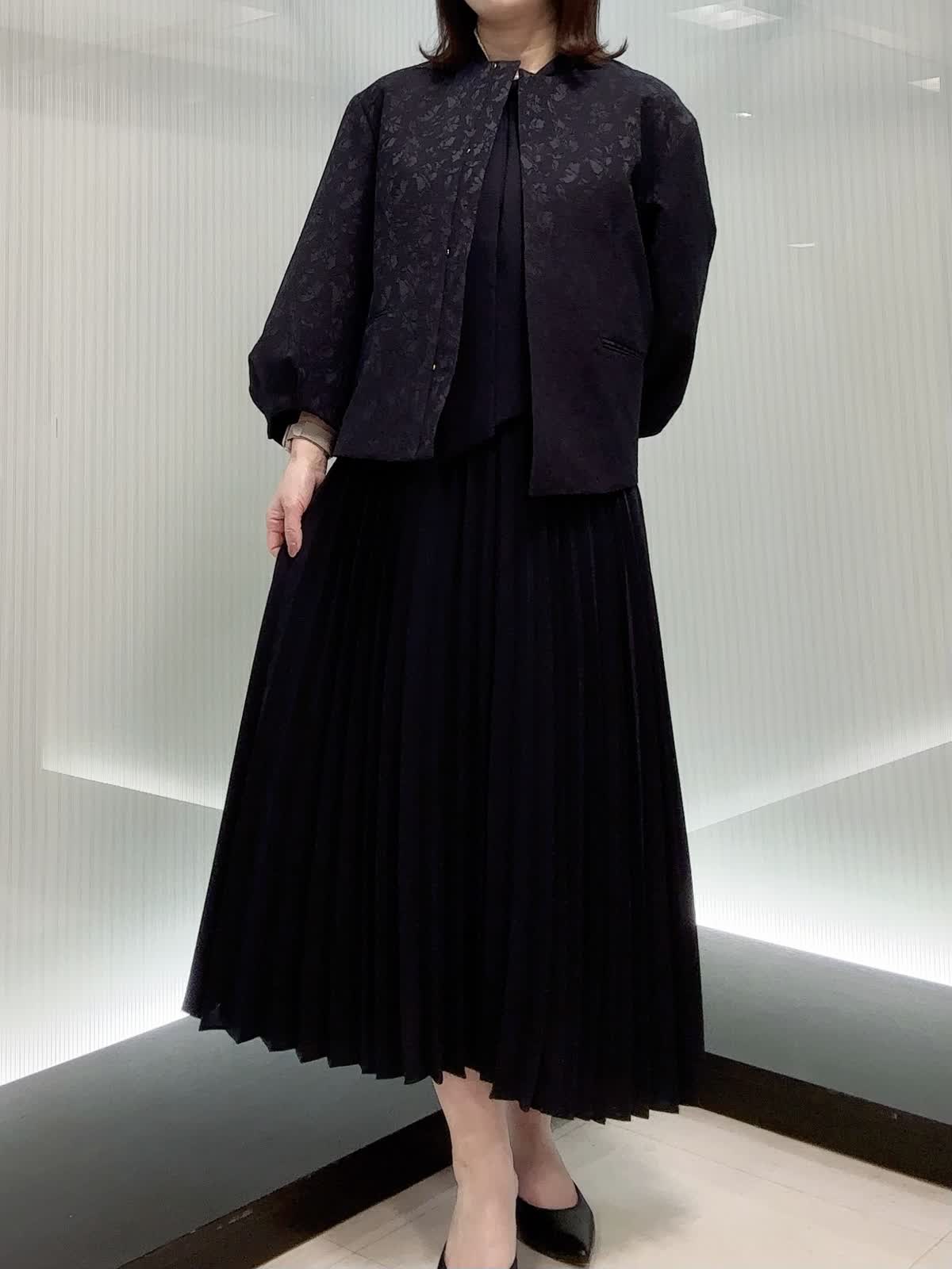 【着用サイズ】全て9号 【ジャケット】 袖口タックがアクセントのミディ丈。 パンツとも好相性で、デイリーからセレモニーまで活躍します。 【ワンピース】 ボウタイ付きの上品プリーツワンピース。 揺れ感が華やかで、ウエストゴムで楽な着心地。体型カバー出来ます シワになりにくく、きちんと見えが叶います。