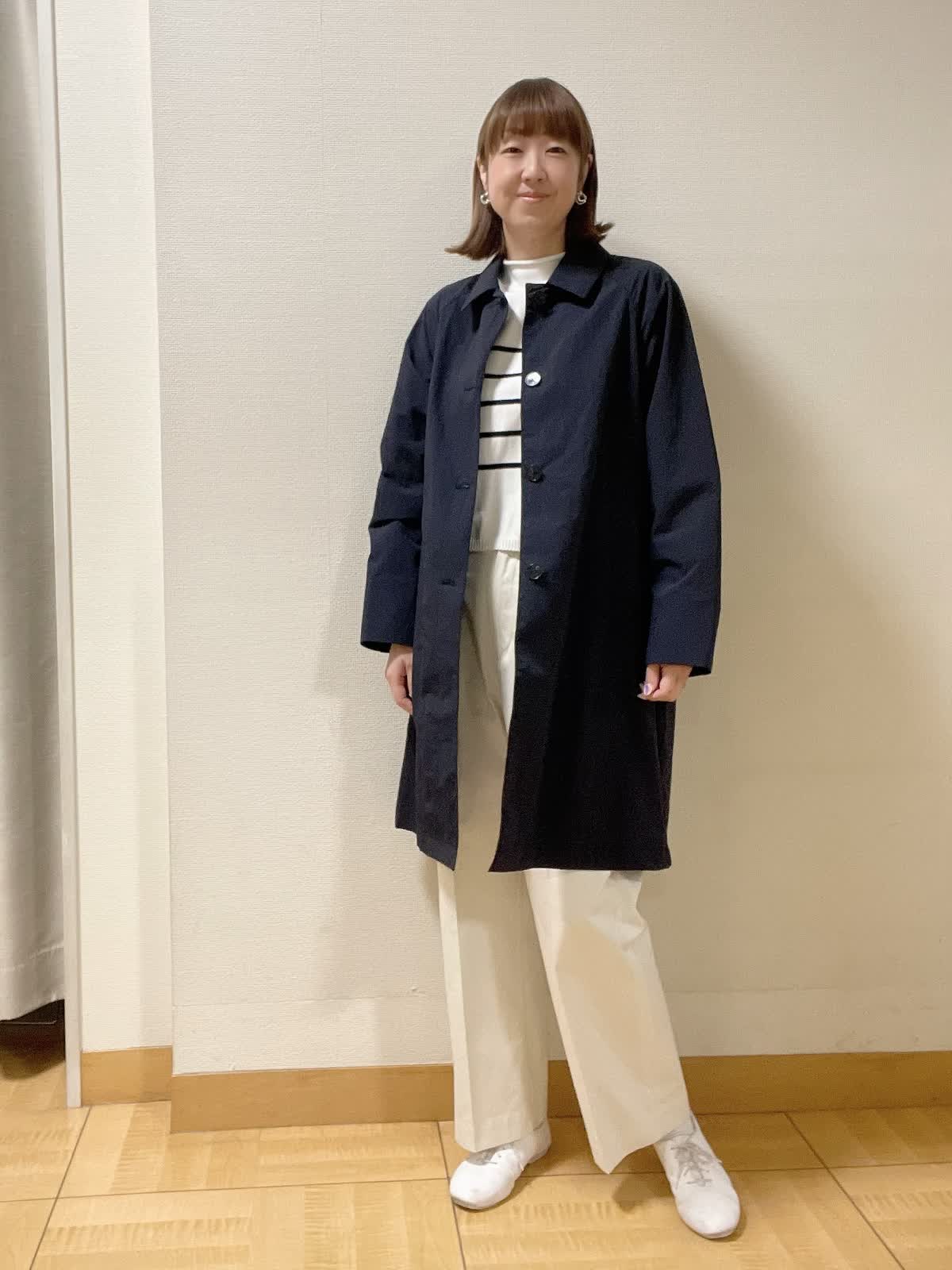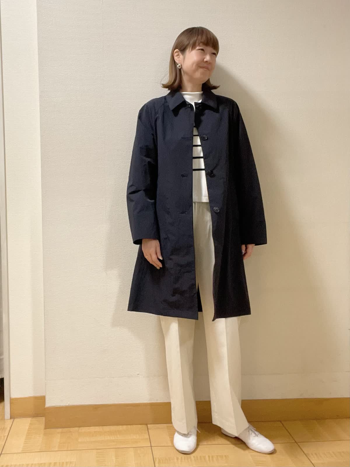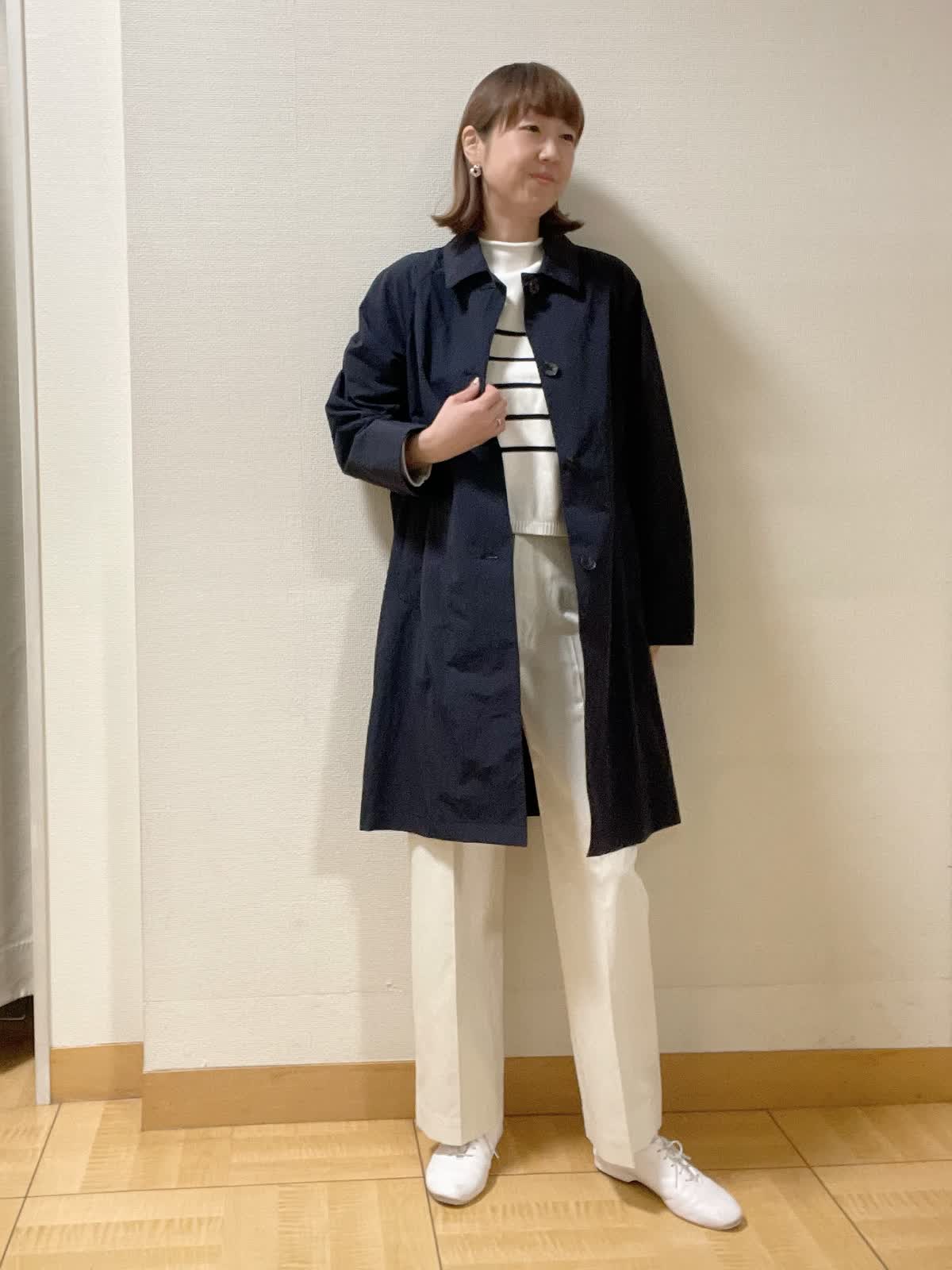 【着用サイズ】コート、パンツ共に9号 ニット:フリー【着用カラー】コート:ネイビー ニット:ボーダー パンツ:オフホワイト 気軽に羽織るステンカラーコート。程よいゆとりがあるのでこなれ感がでます。ホワイトワントーンスタイルにネイビー合わせで爽やかな印象に。