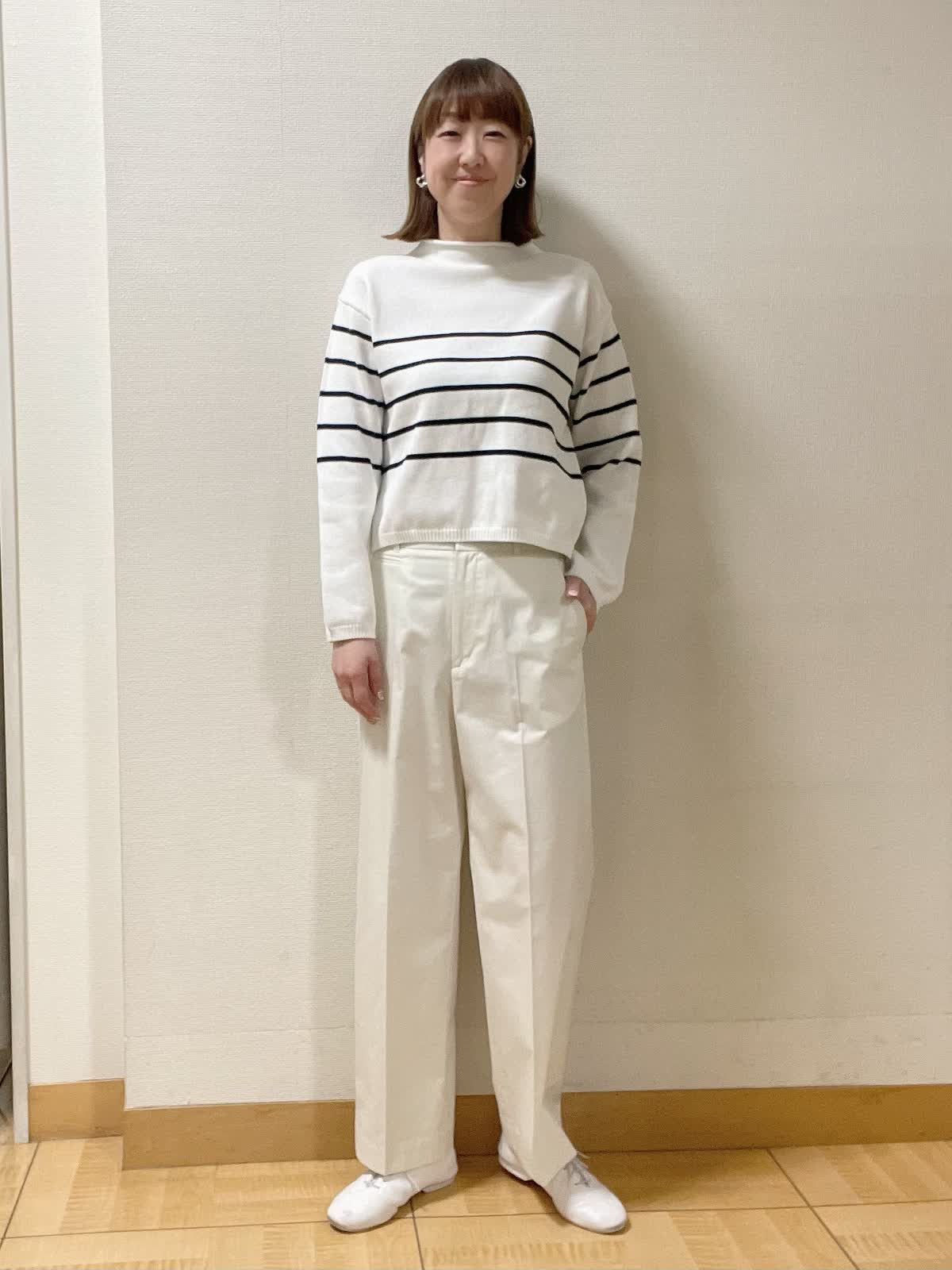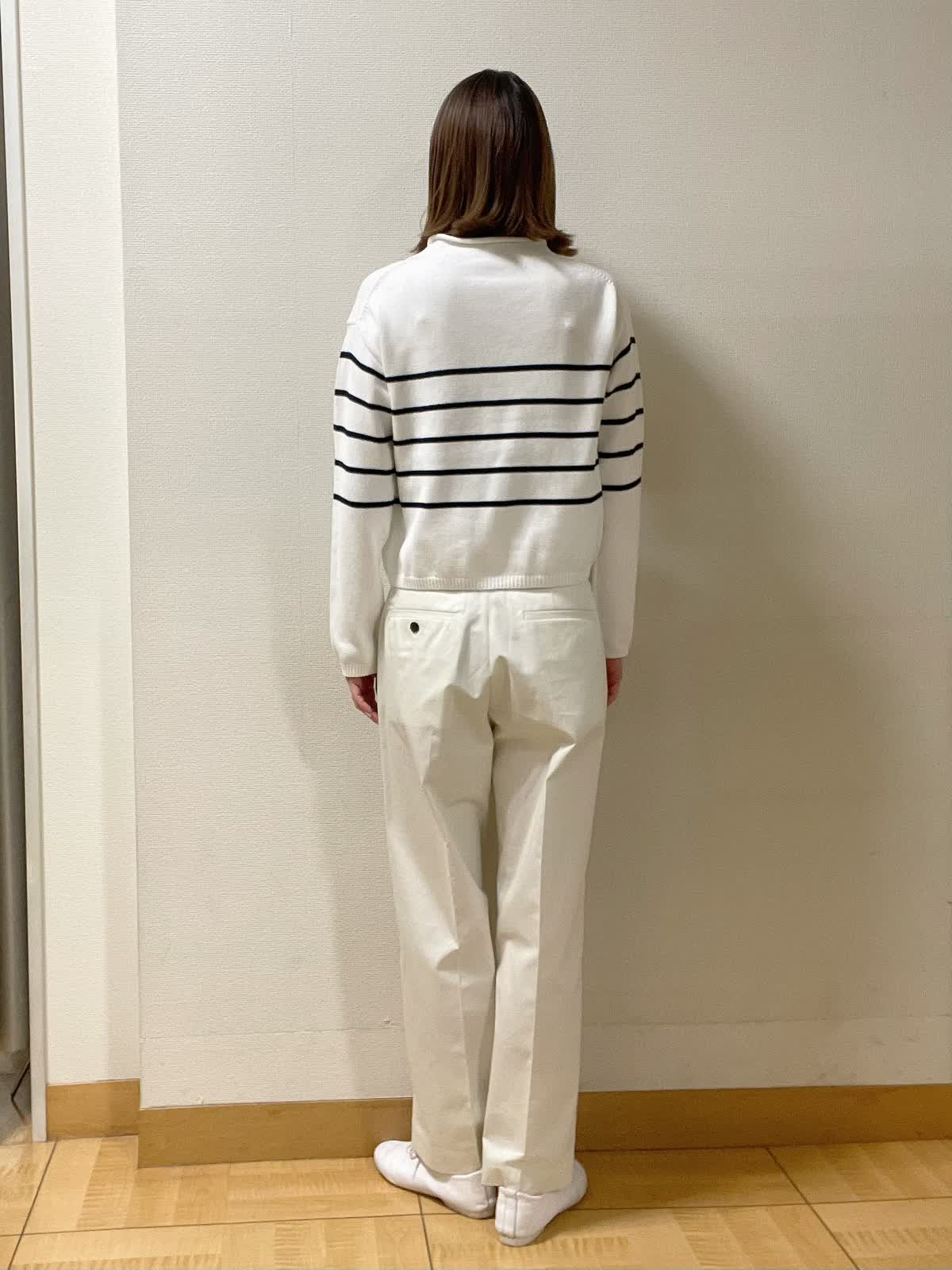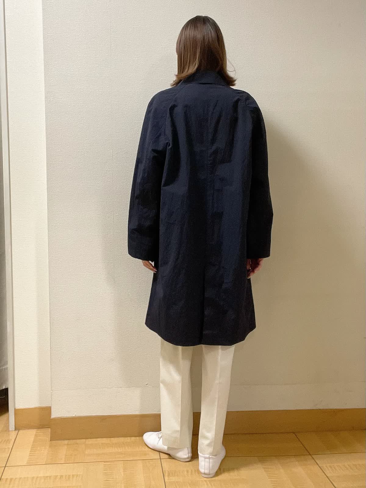 【着用サイズ】コート、パンツ共に9号 ニット:フリー【着用カラー】コート:ネイビー ニット:ボーダー パンツ:オフホワイト 気軽に羽織るステンカラーコート。程よいゆとりがあるのでこなれ感がでます。ホワイトワントーンスタイルにネイビー合わせで爽やかな印象に。