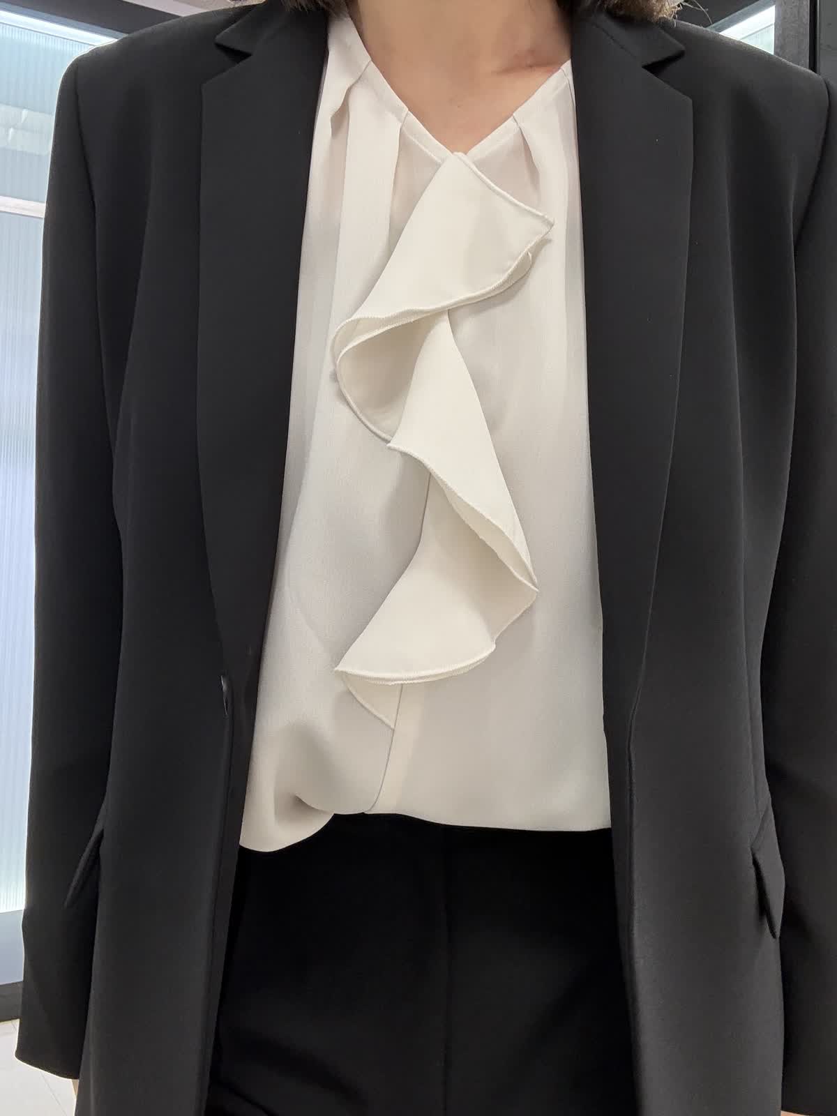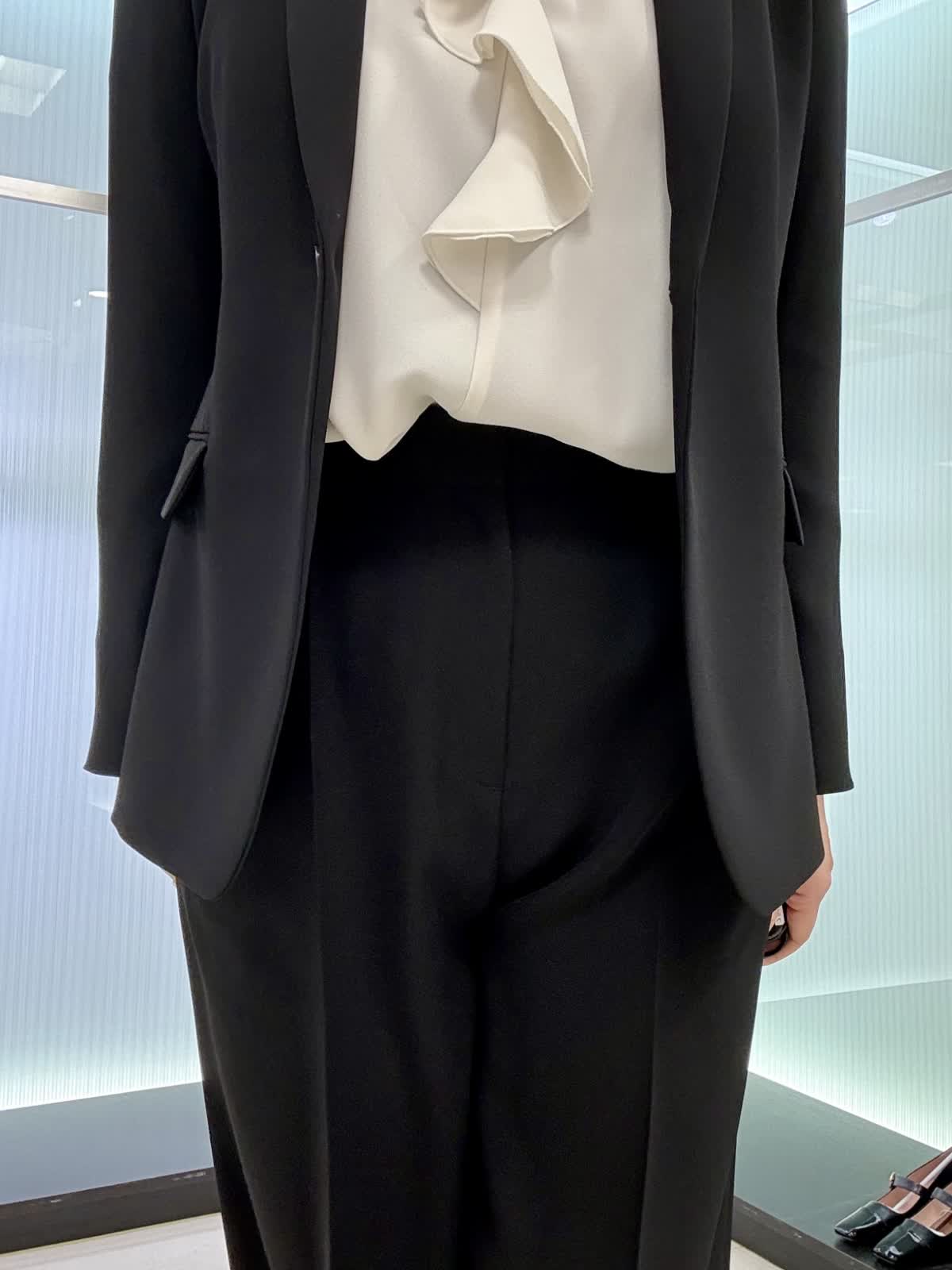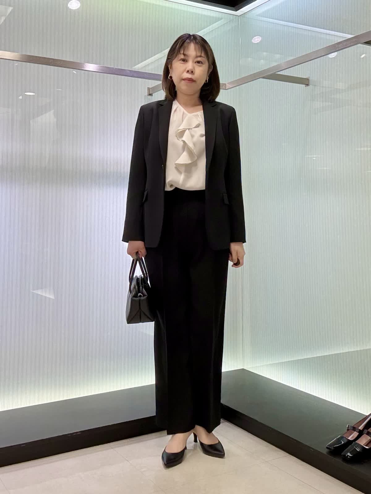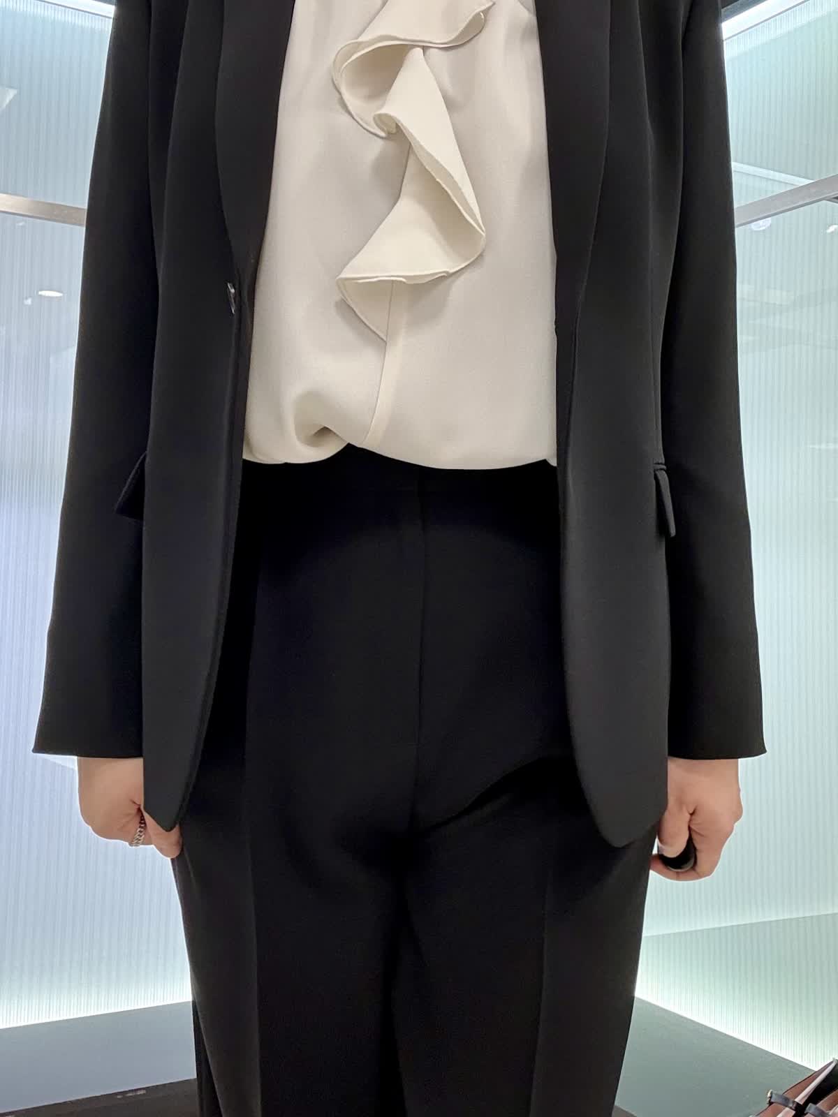 ジャケット着用サイズ 11号 定番のテーラードジャケットです。 ジョーゼット生地ですので、シワになりにくく伸縮性があり軽い着心地です。 パンツ着用サイズ 11号 タックが入ったワイドパンツになります。とても履きやすいです。ブラウス11号 フリルが付いた長袖のブラウスになります。腕周りもふんわりとしているので脱いでも腕が気になりません。ビジネスシーンでも大活躍です!