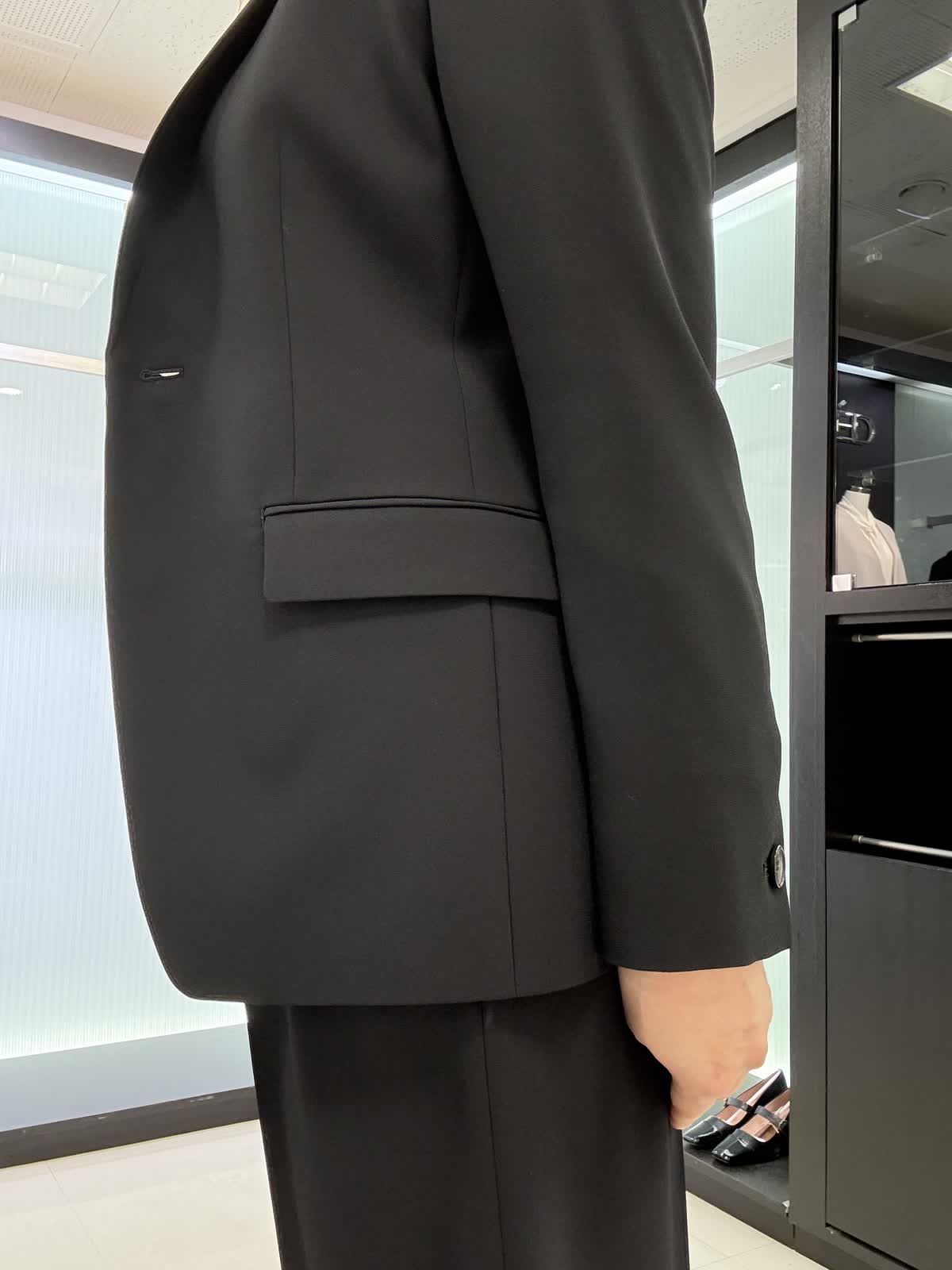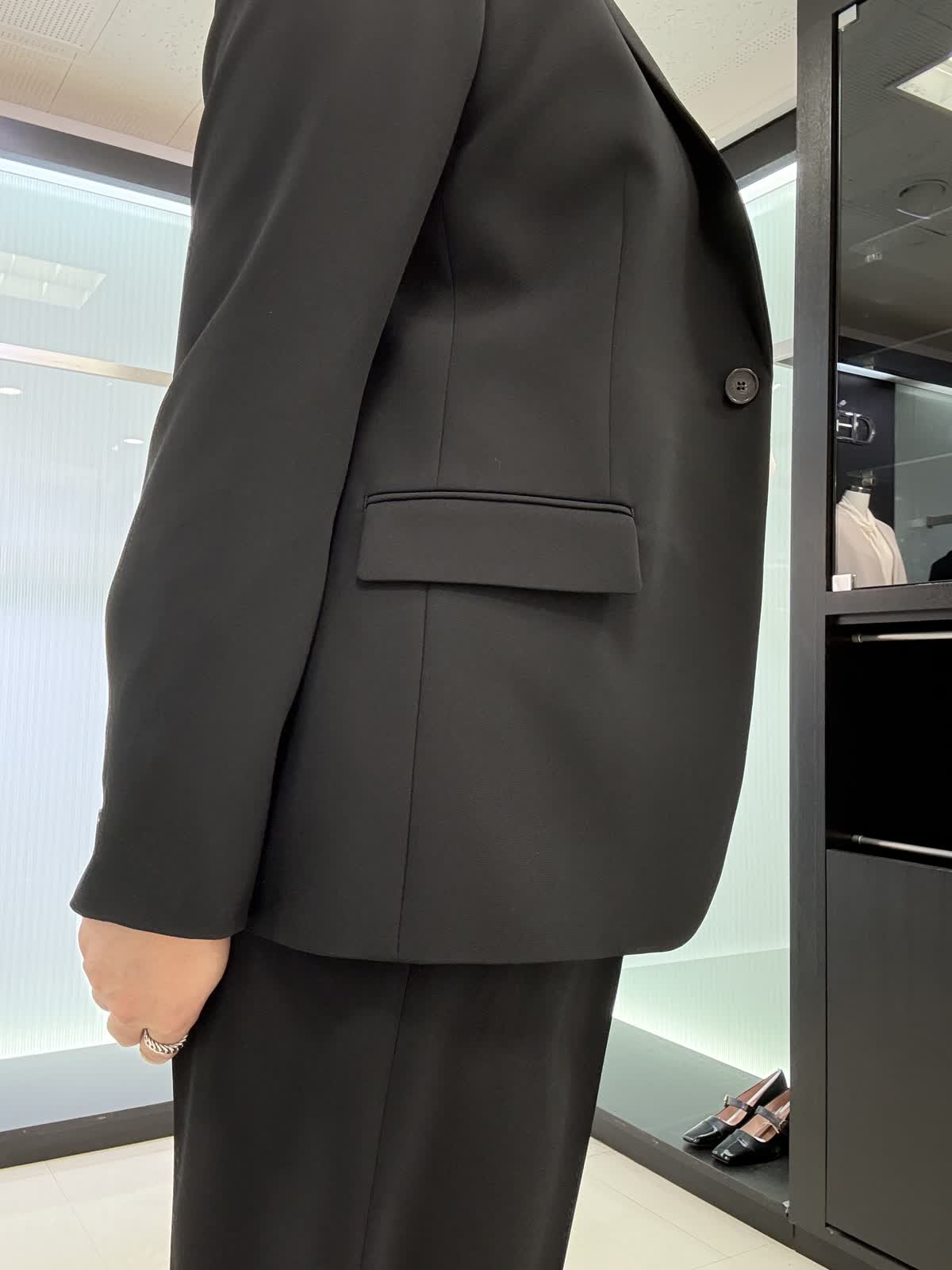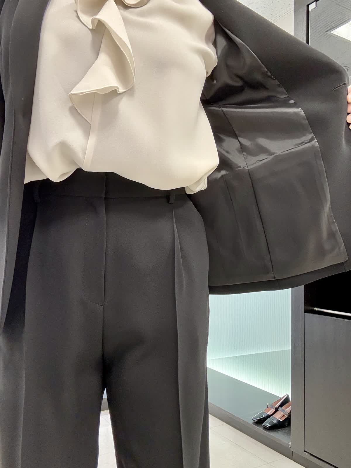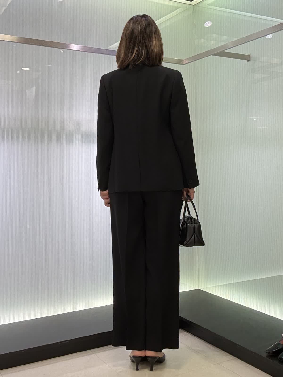 ジャケット着用サイズ 11号 定番のテーラードジャケットです。 ジョーゼット生地ですので、シワになりにくく伸縮性があり軽い着心地です。 パンツ着用サイズ 11号 タックが入ったワイドパンツになります。とても履きやすいです。ブラウス11号 フリルが付いた長袖のブラウスになります。腕周りもふんわりとしているので脱いでも腕が気になりません。ビジネスシーンでも大活躍です!