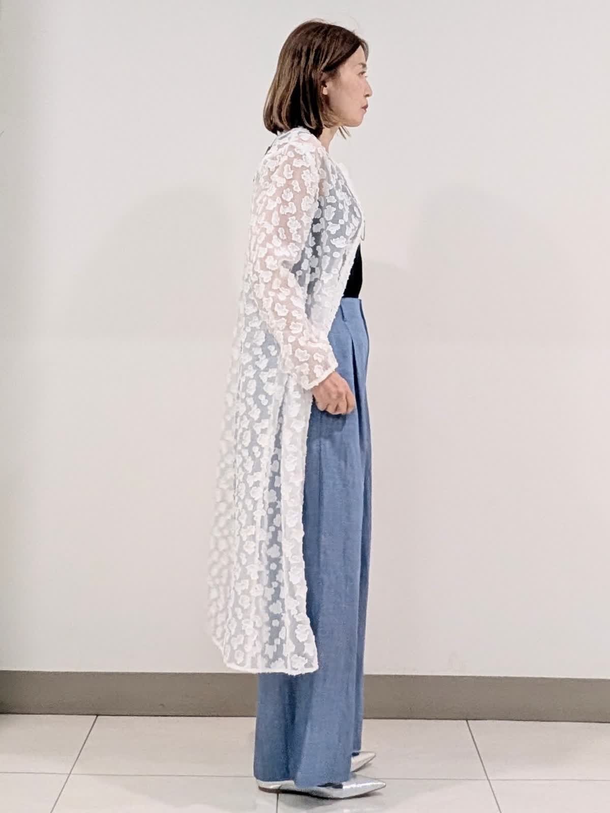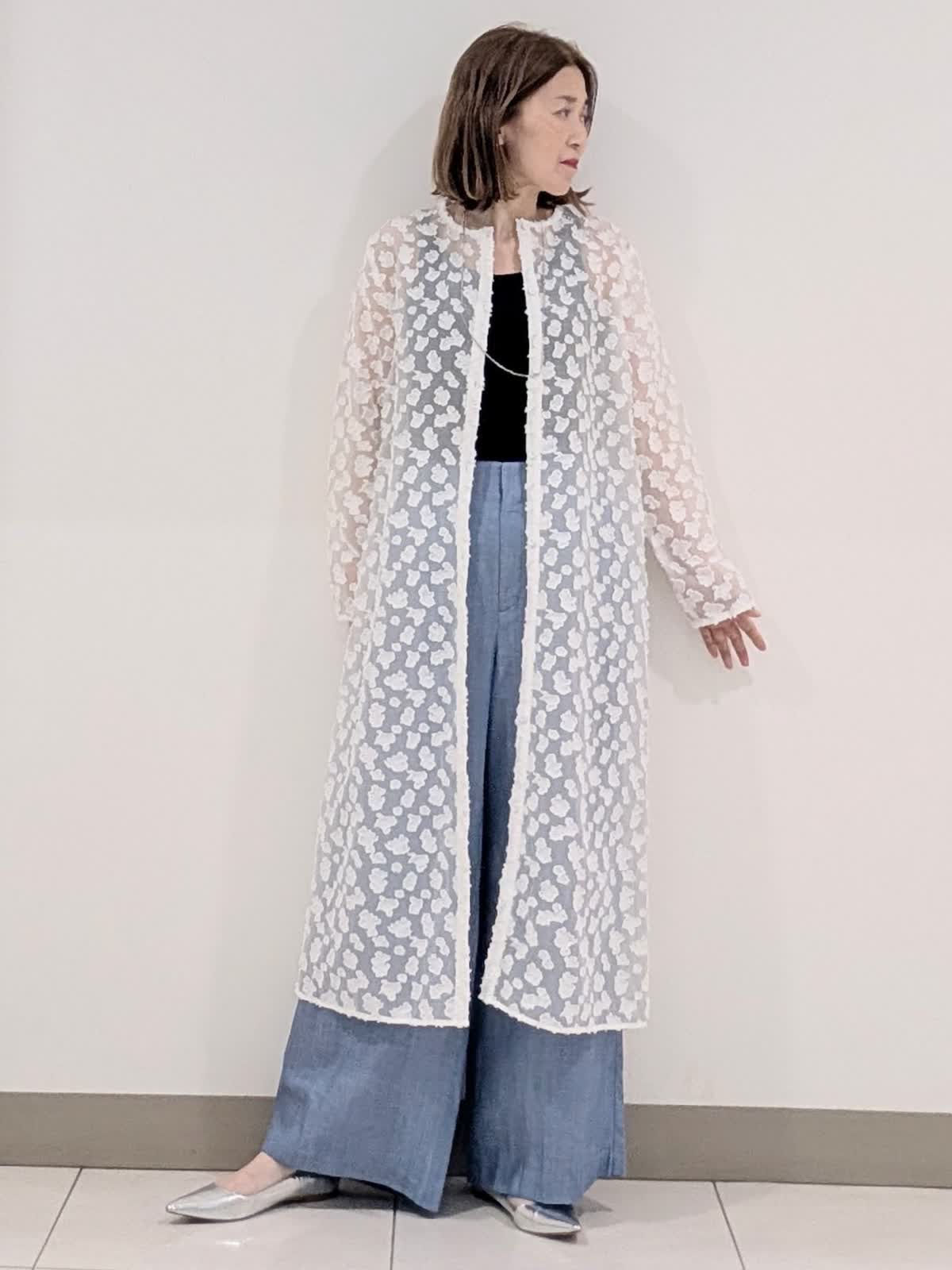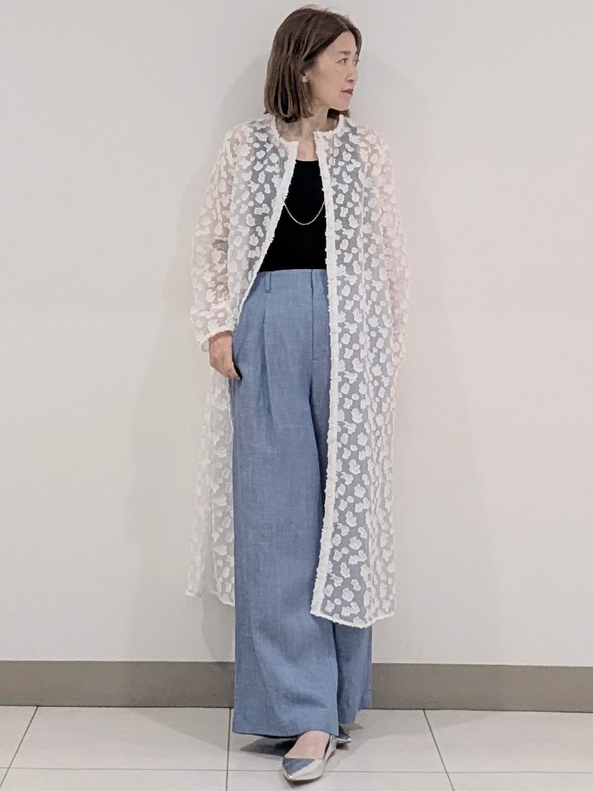 【着用サイズ9号】 シアー感のある標示豊かなカットジャガード素材を使用したワンピース。抜け感のあるボクシーシルエットでストレスフリーな着心地◎今から着れて夏も活躍間違いなし。 ボトムスは、タックワイドデニムパンツを合わせました。ラインを拾わないワイドストレートシルエット。ウエストのバックはゴム仕様。 キレイ見えしながらも穿き心地バツグンです。