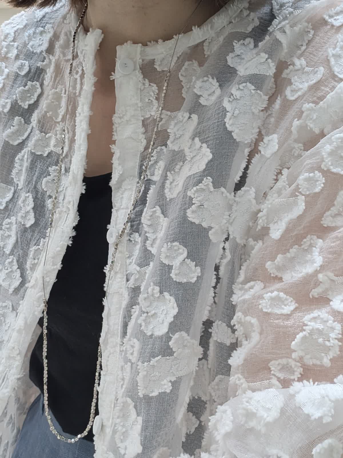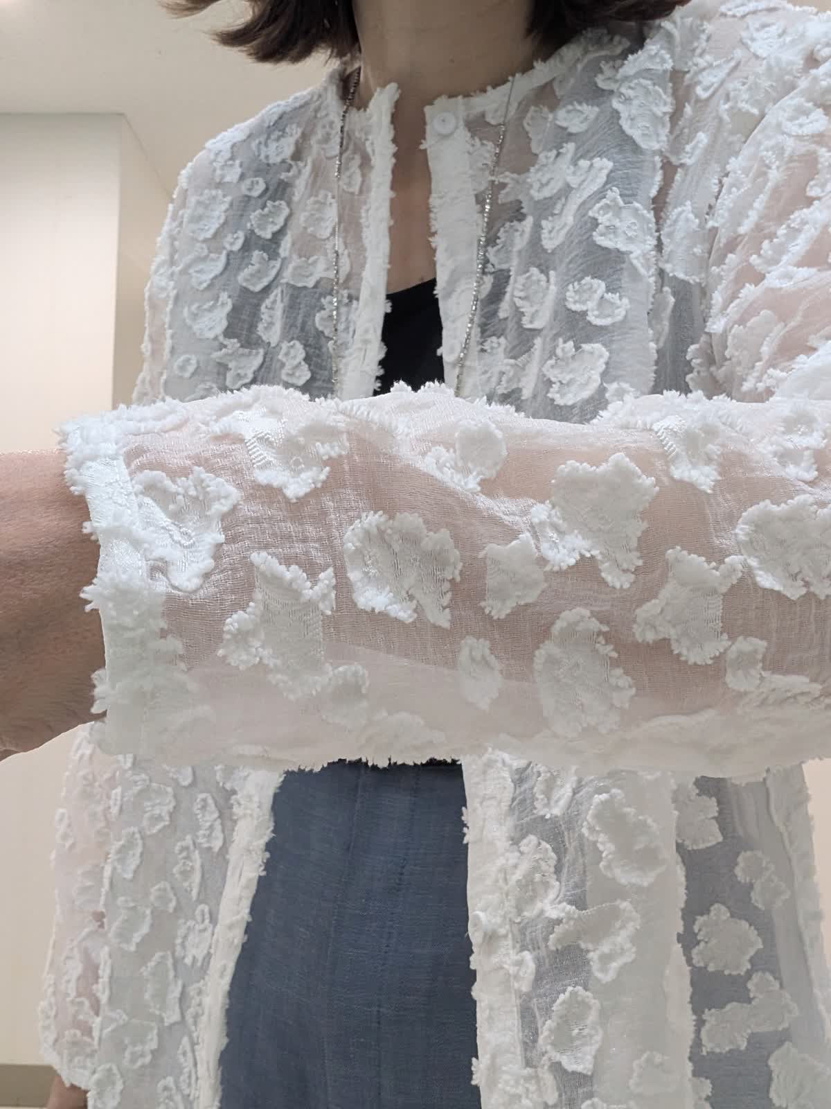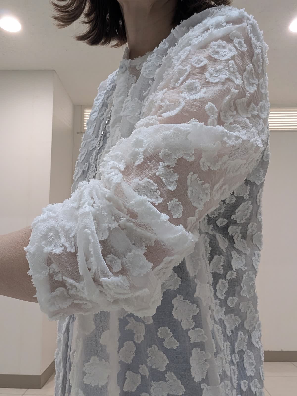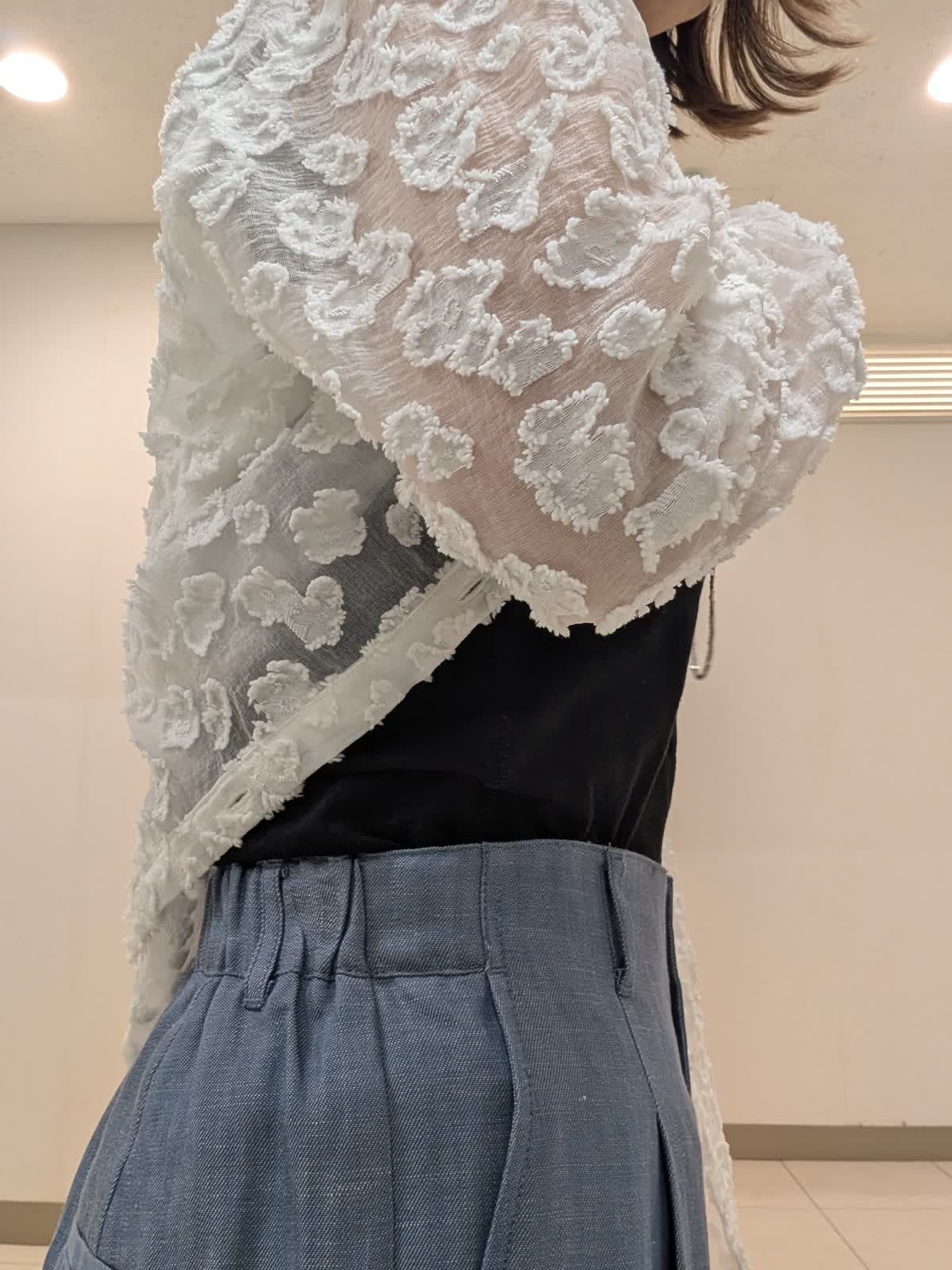 【着用サイズ9号】 シアー感のある標示豊かなカットジャガード素材を使用したワンピース。抜け感のあるボクシーシルエットでストレスフリーな着心地◎今から着れて夏も活躍間違いなし。 ボトムスは、タックワイドデニムパンツを合わせました。ラインを拾わないワイドストレートシルエット。ウエストのバックはゴム仕様。 キレイ見えしながらも穿き心地バツグンです。