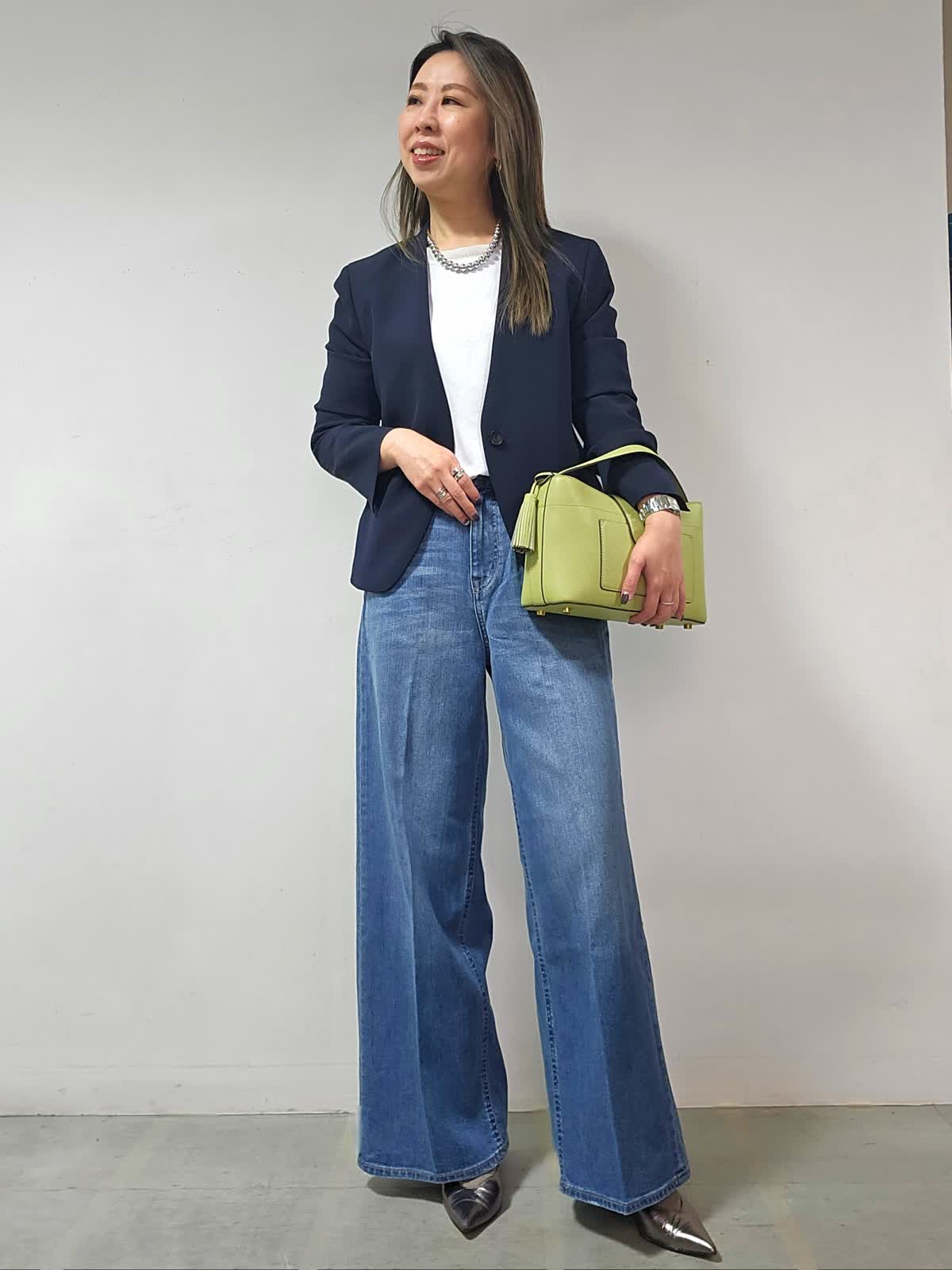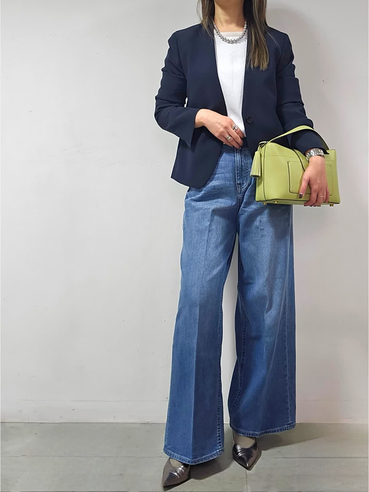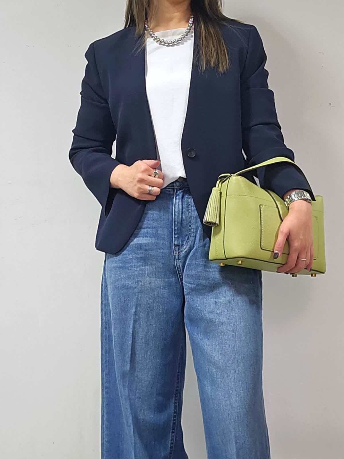 【着用カラー・サイズ】ジャケット:ネイビー・7号 カットソー:オフホワイト・9号 パンツ:インディゴ・5号 バッグ:キミドリ ネックレス:シルバー かしこまったシーンでもやわらかさを忘れないノーカラージャケット。 スッキリ見え首元美人に! 1枚あればオフの日のスタイリングからオフィスコーデまで幅広く活用出来ます!