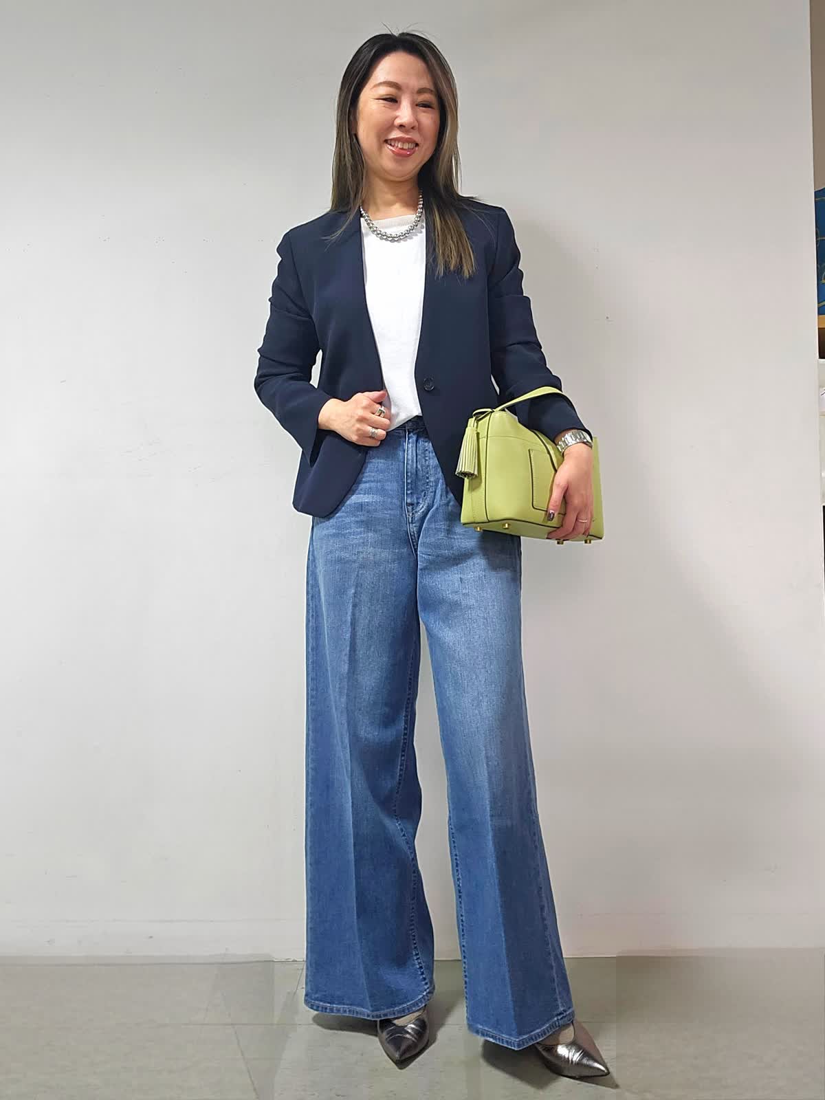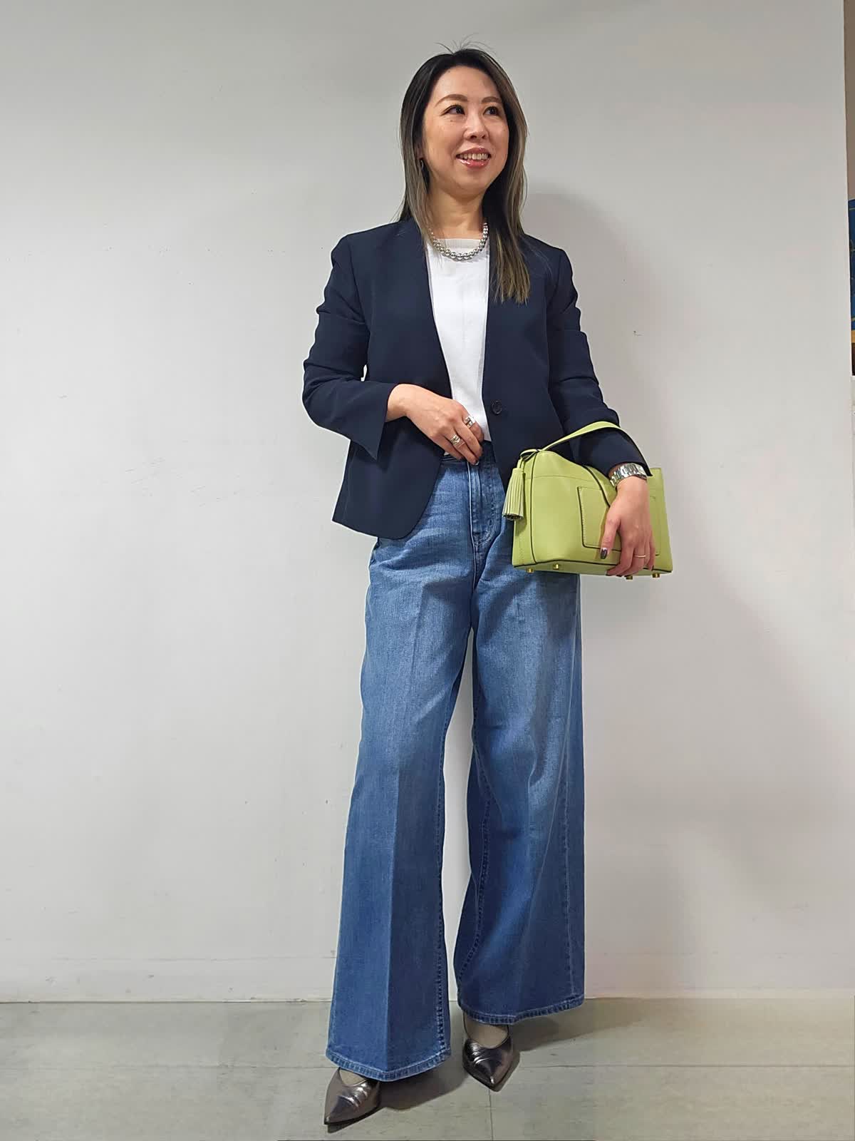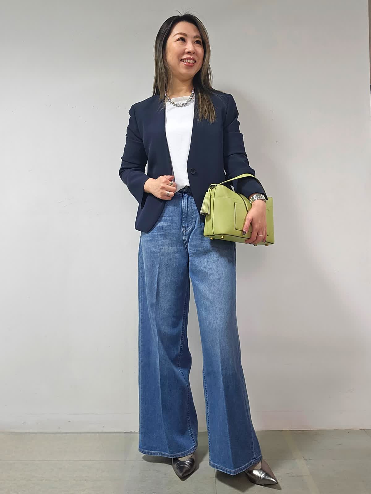 【着用カラー・サイズ】ジャケット:ネイビー・7号 カットソー:オフホワイト・9号 パンツ:インディゴ・5号 バッグ:キミドリ ネックレス:シルバー かしこまったシーンでもやわらかさを忘れないノーカラージャケット。 スッキリ見え首元美人に! 1枚あればオフの日のスタイリングからオフィスコーデまで幅広く活用出来ます!