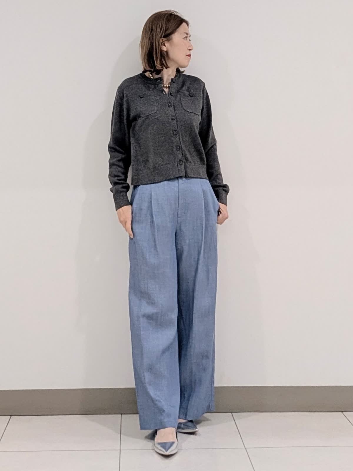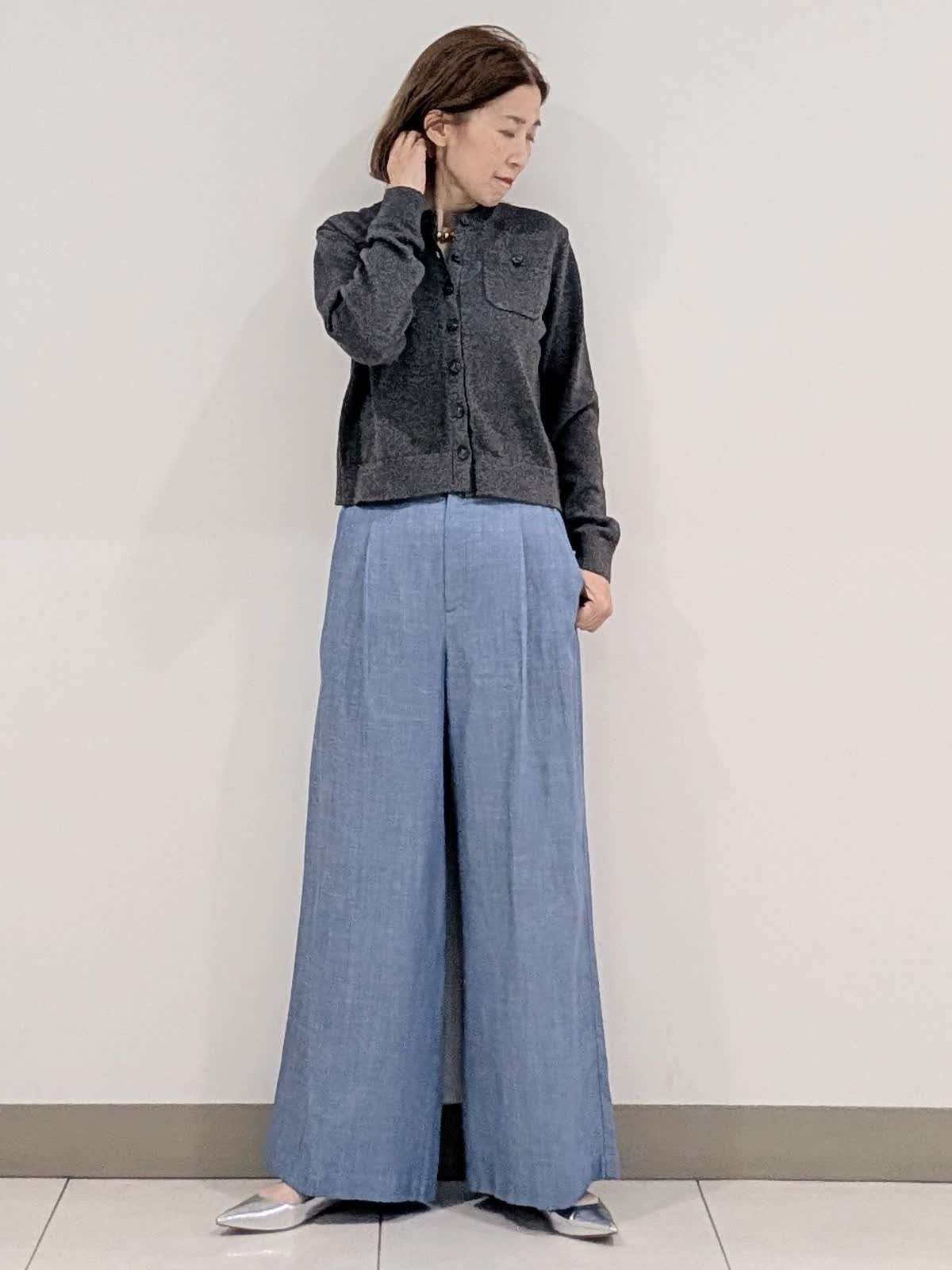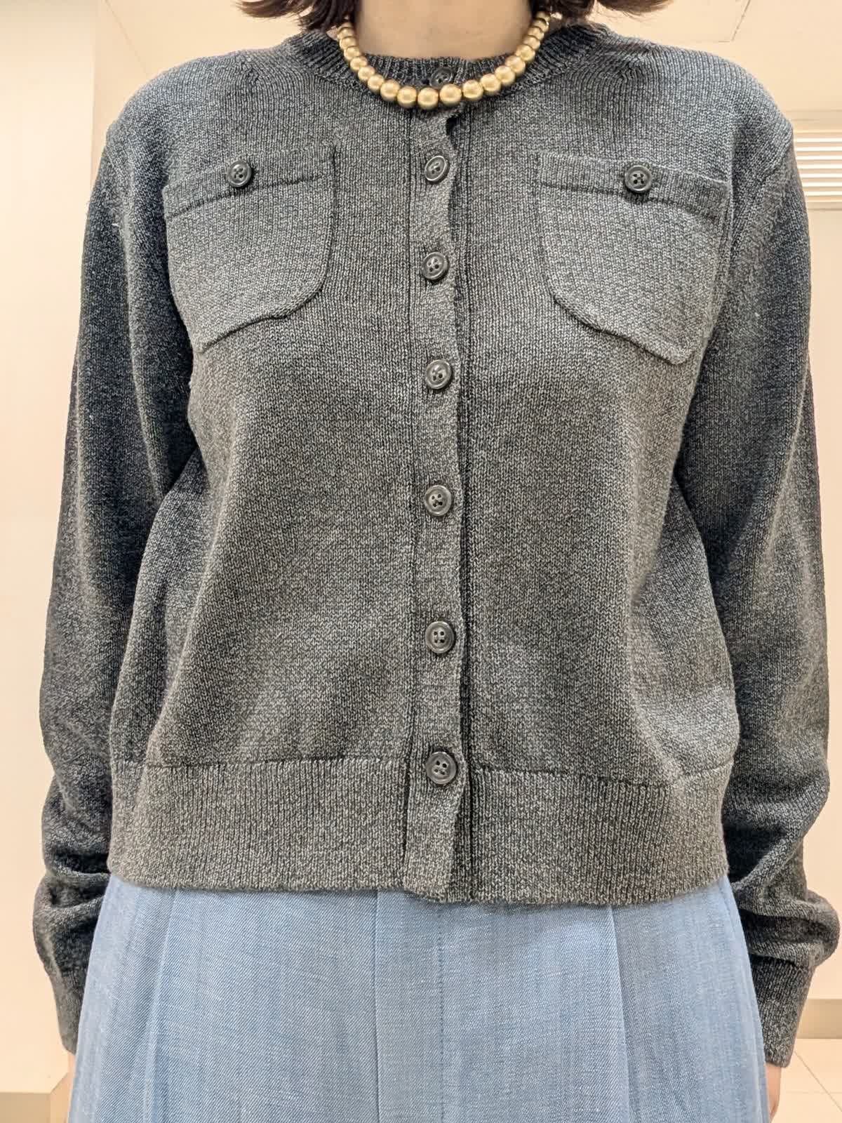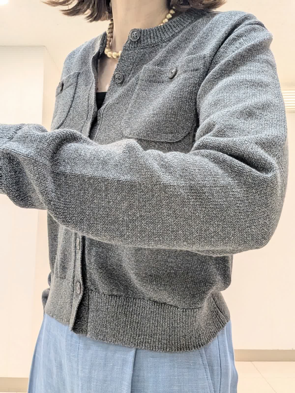 【着用サイズ9号】 コンパクトなシルエットのニットカーディガン。きちんと感のあるデザインに素材のラフさを掛け合わせこなれた印象に。ポケットとボタンがアクセントでプルオーバーとして着用するのもおすすめです◎ 合わせたパンツはタックワイドデニム。バックゴム仕様。 ラインを拾わなくスタイルアップ効果も◎キレイ見え◎