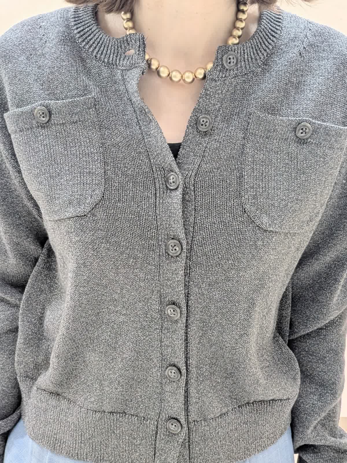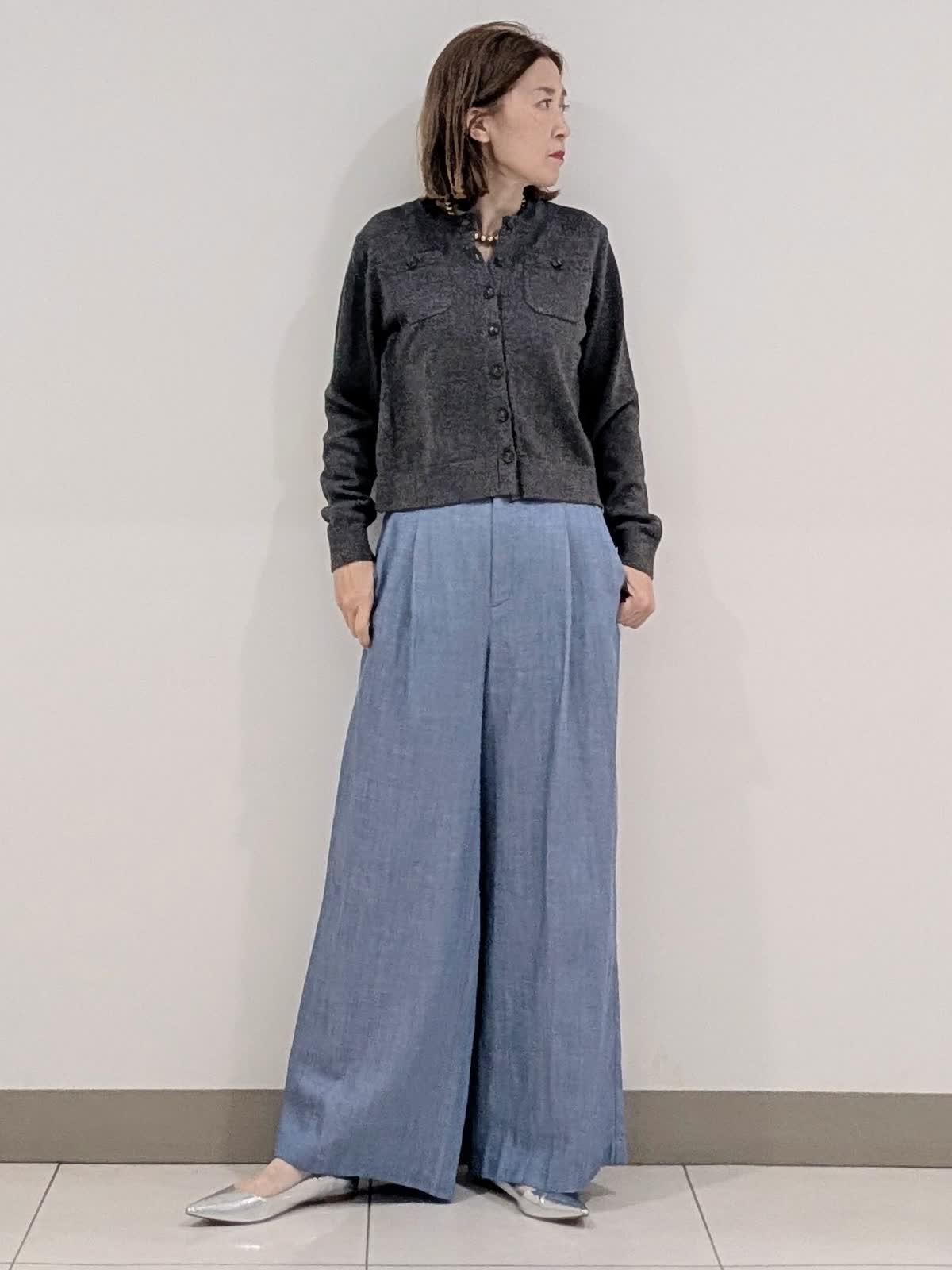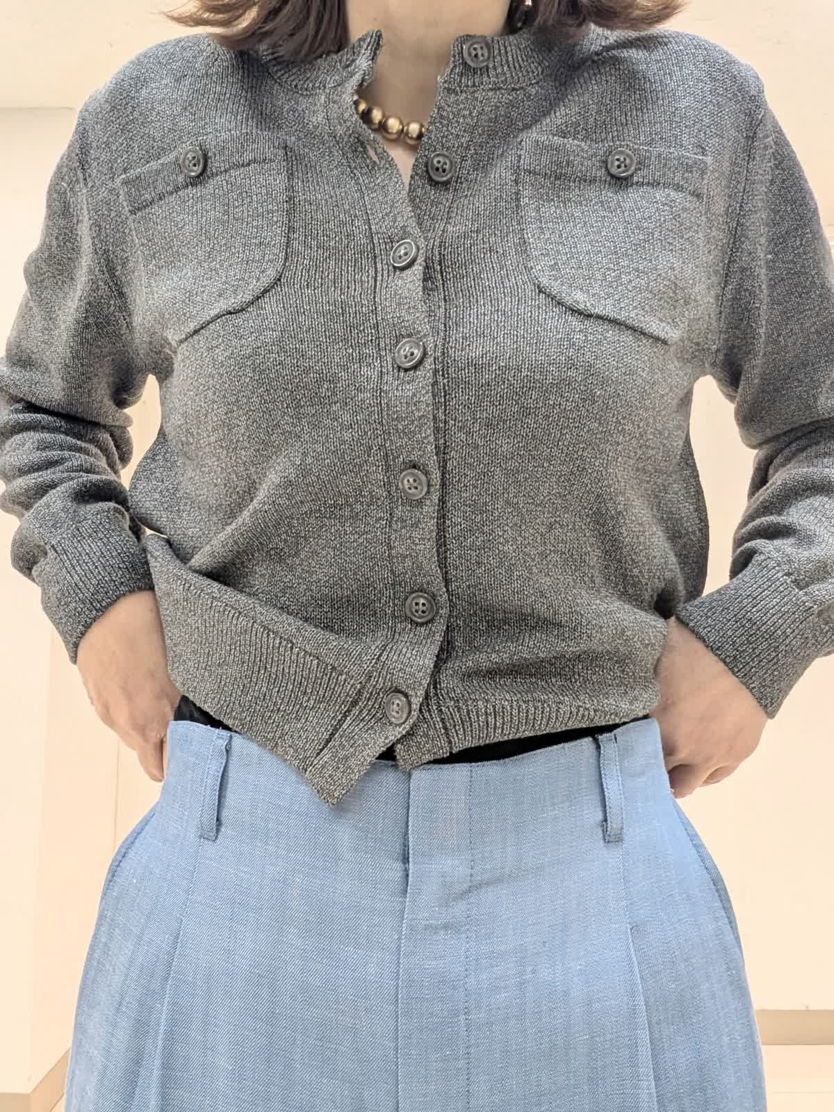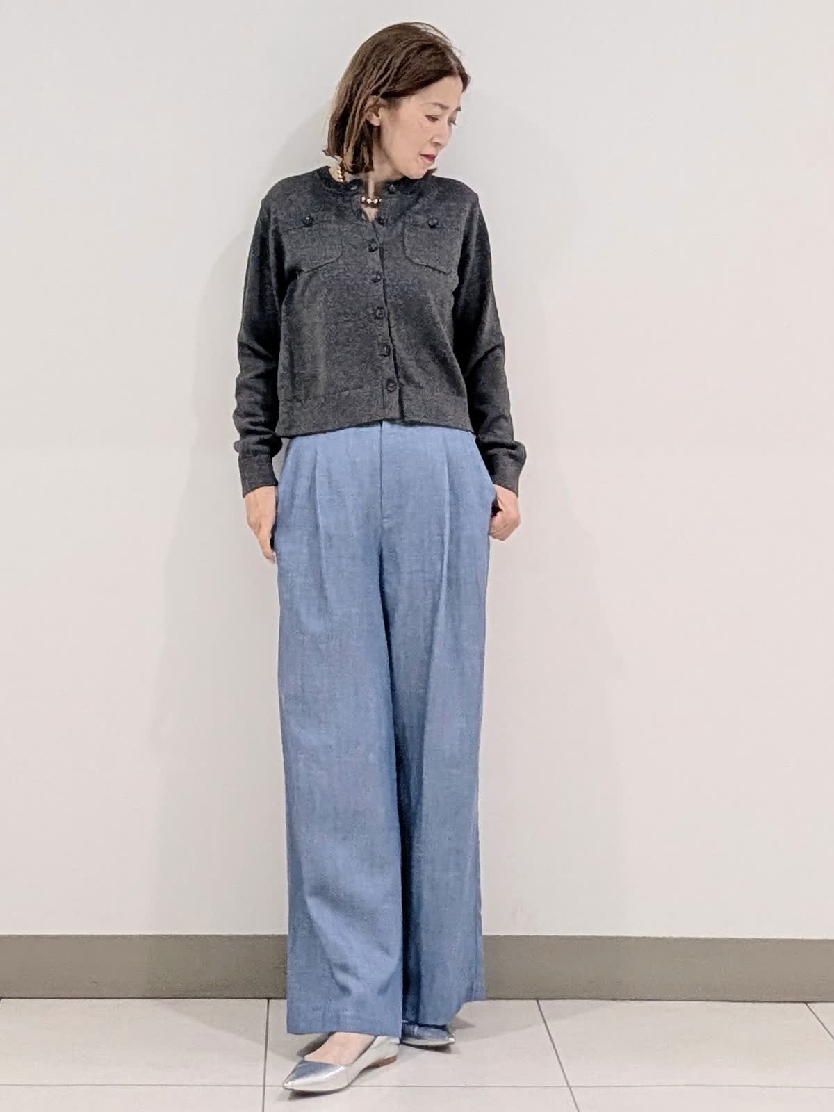 【着用サイズ9号】 コンパクトなシルエットのニットカーディガン。きちんと感のあるデザインに素材のラフさを掛け合わせこなれた印象に。ポケットとボタンがアクセントでプルオーバーとして着用するのもおすすめです◎ 合わせたパンツはタックワイドデニム。バックゴム仕様。 ラインを拾わなくスタイルアップ効果も◎キレイ見え◎