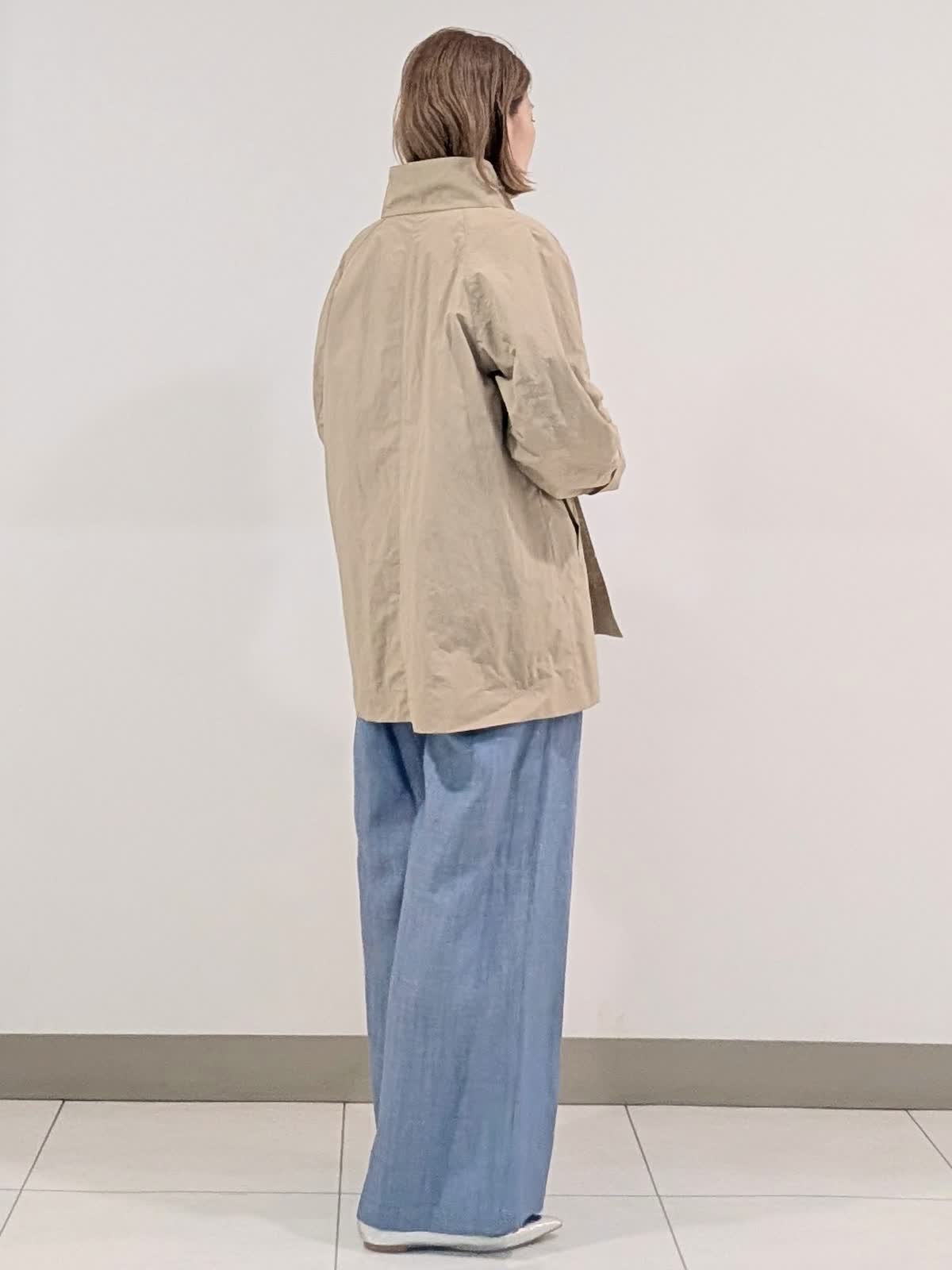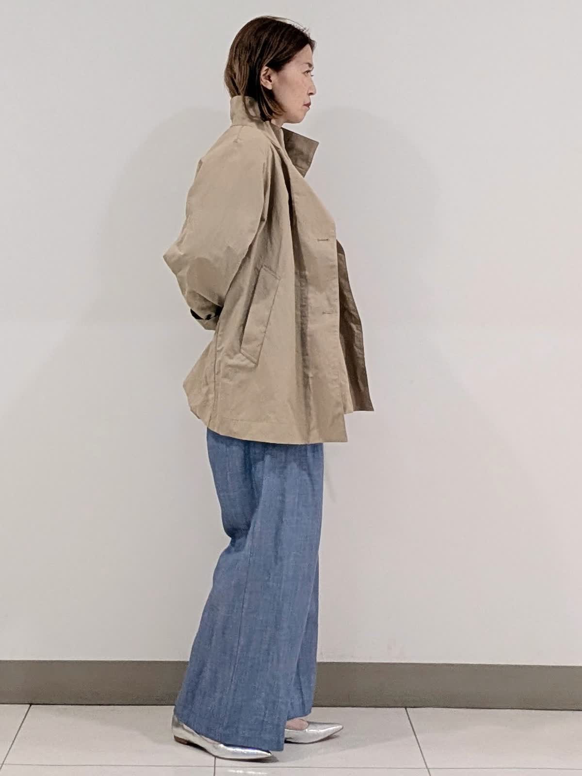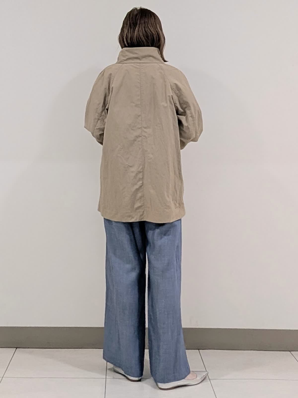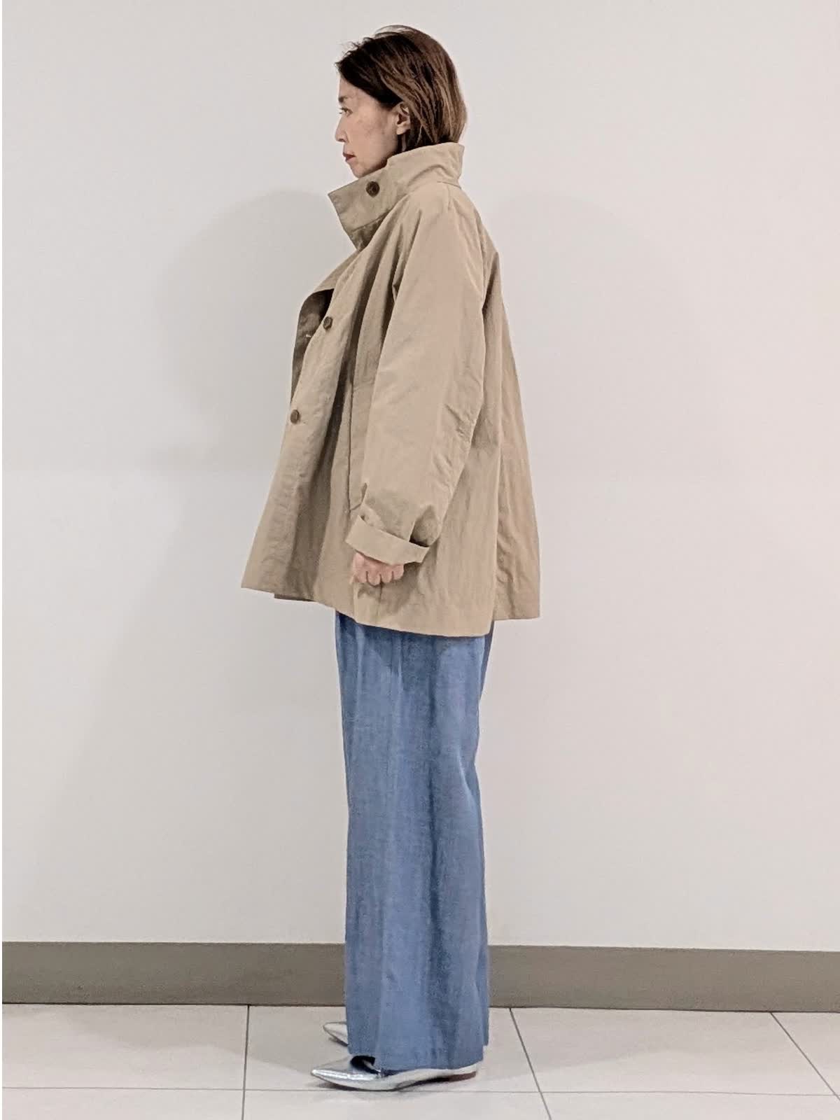 【着用サイズ9号】 ヒップが隠れる丈感のナイロンスタンドコート。程よいテントラインとスタンドカラーが、スタイルアップ効果あり◎カジュアルもキレイ見えも叶えてくれるアイテム。 インナーには今から着れる綿素材のニットを合わせました。 ロールハイネックデザインでスッキリキレイ見え。 パンツは、ワイドシルエットパンツ。ラインを拾わなくスッキリ見える優秀アイテム。