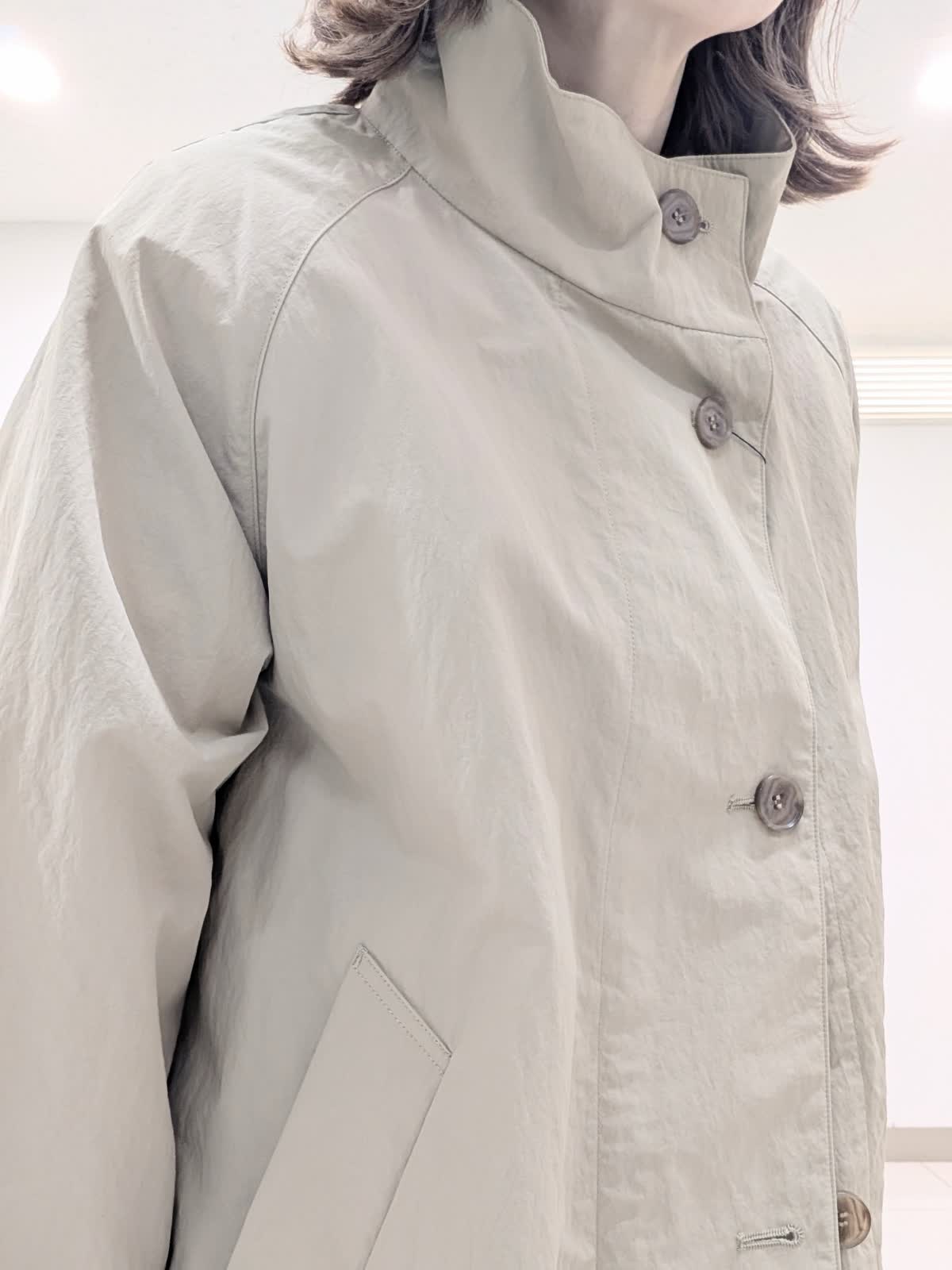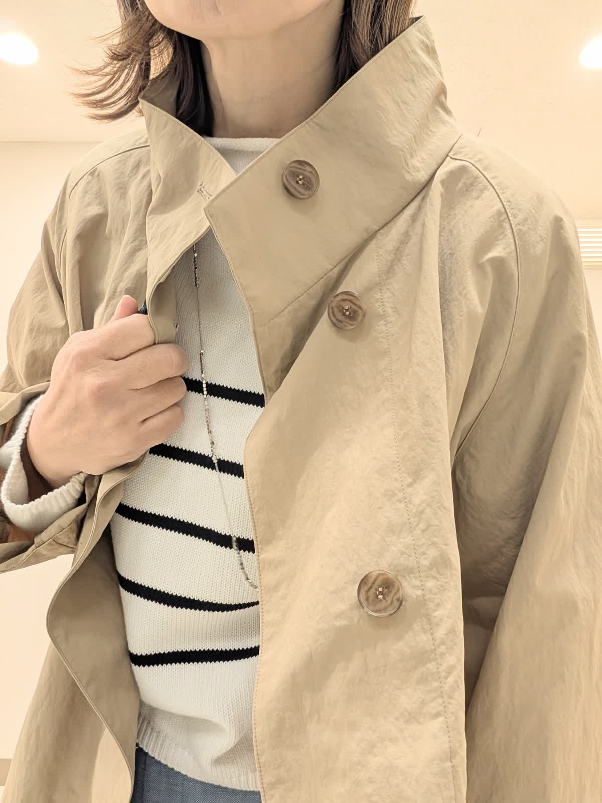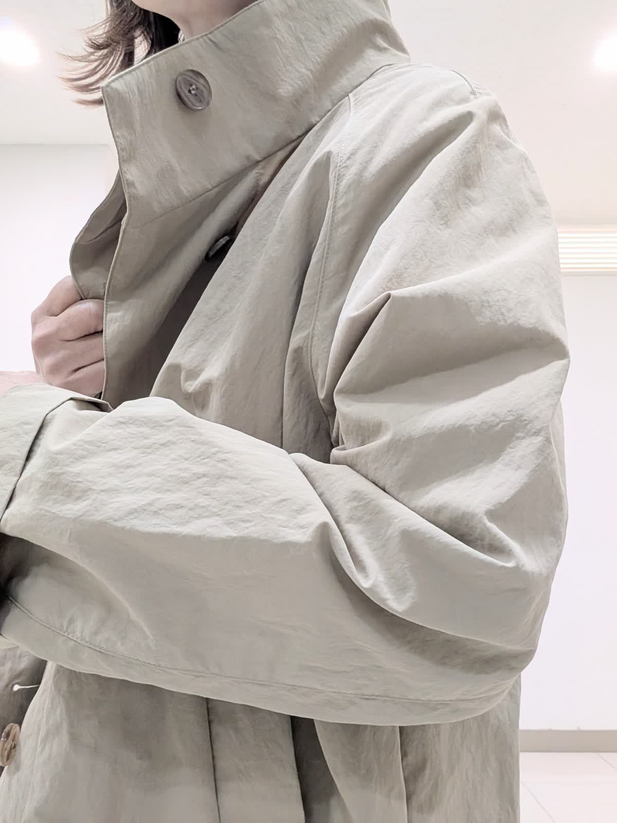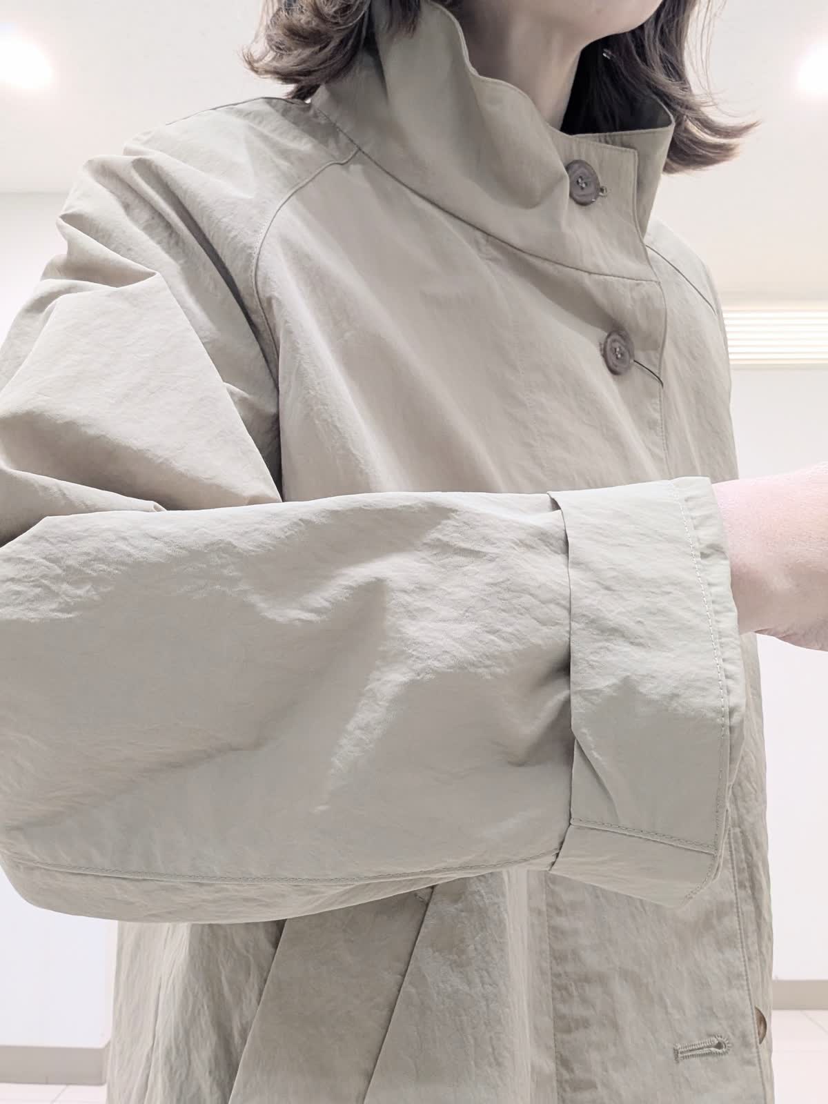 【着用サイズ9号】 ヒップが隠れる丈感のナイロンスタンドコート。程よいテントラインとスタンドカラーが、スタイルアップ効果あり◎カジュアルもキレイ見えも叶えてくれるアイテム。 インナーには今から着れる綿素材のニットを合わせました。 ロールハイネックデザインでスッキリキレイ見え。 パンツは、ワイドシルエットパンツ。ラインを拾わなくスッキリ見える優秀アイテム。
