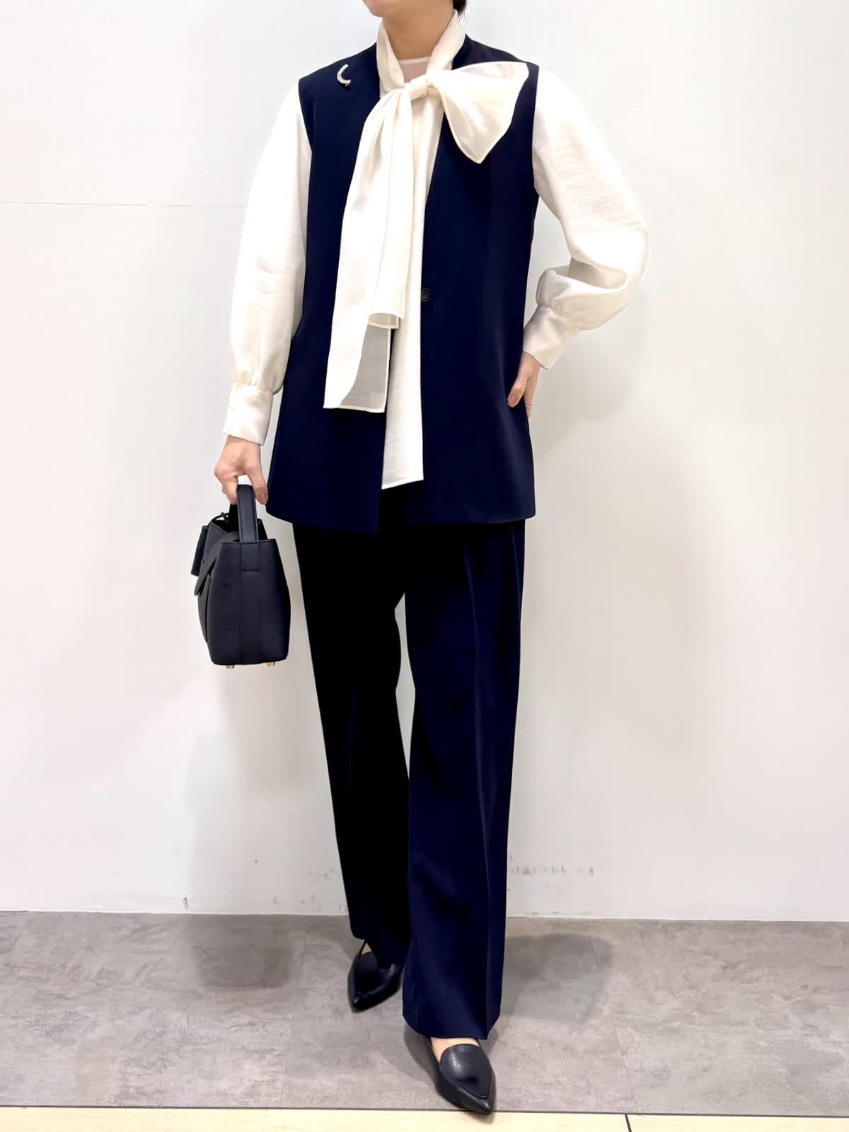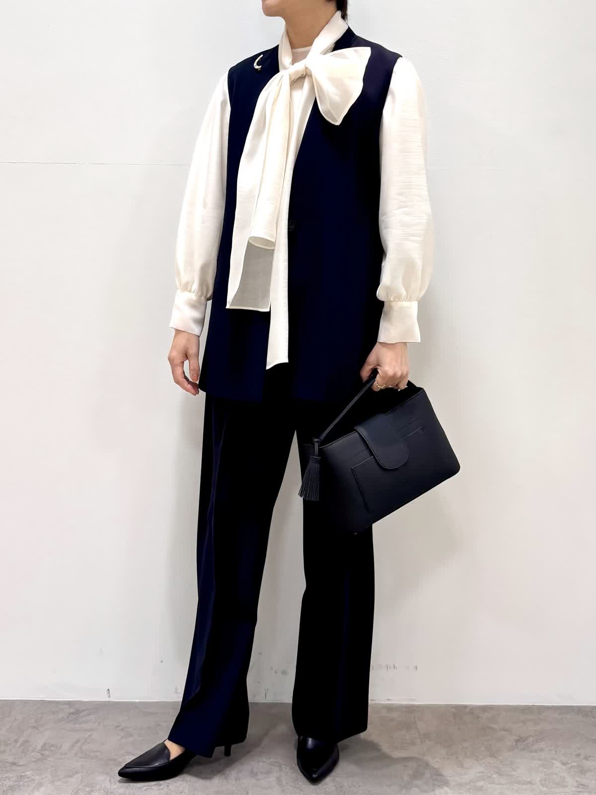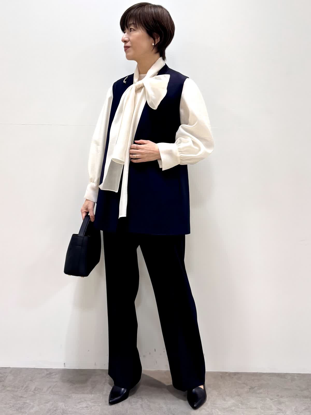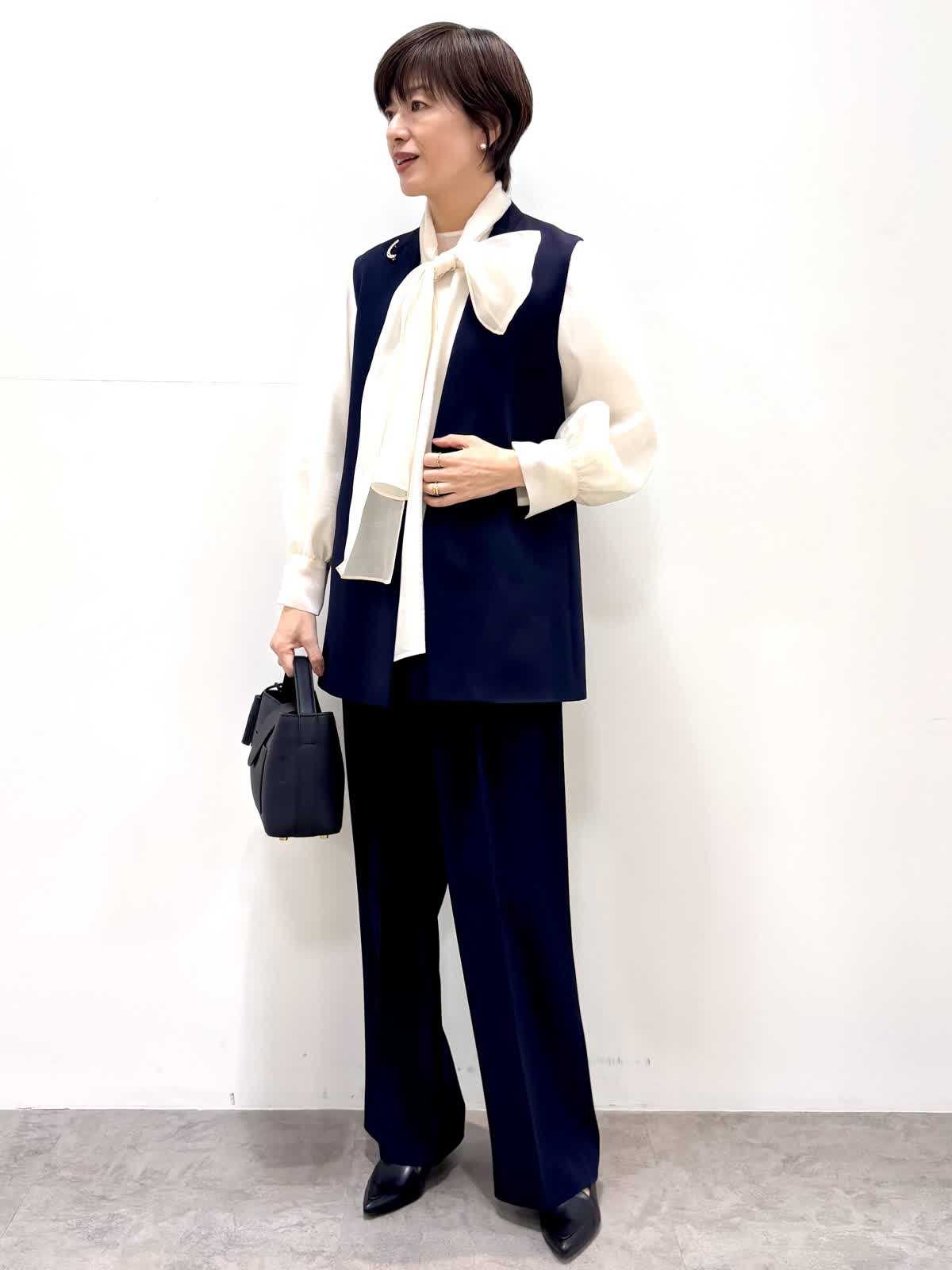 [着用サイズ]ジレ:9号 ブラウス:9号 パンツ:9号 [着用カラー]ジレ:ネイビー ブラウス:アイボリー パンツ:ネイビー セレモニーからビジネスシーンまで大活躍のジレのセットアップです。 インのシアーブラウスは華やかな光沢感があり、着映えする1枚です。 リボンも取り外せます。 セミワイドのパンツは脚のラインを綺麗に見せてくれる優れものです。 お手入れも簡単でお仕事にもピッタリです。