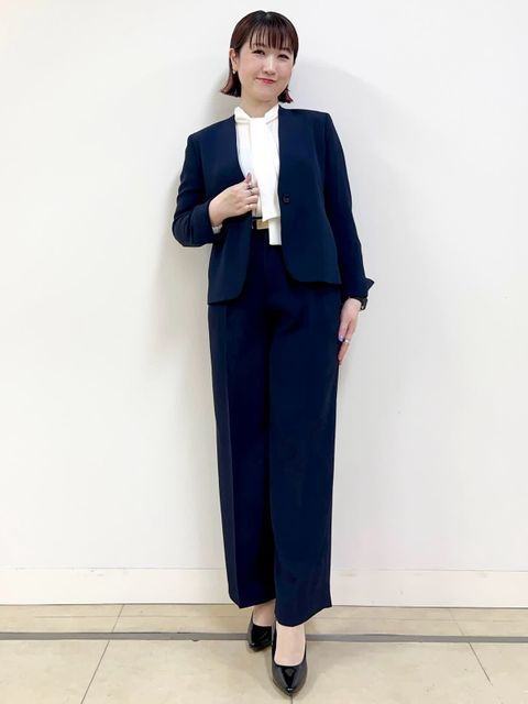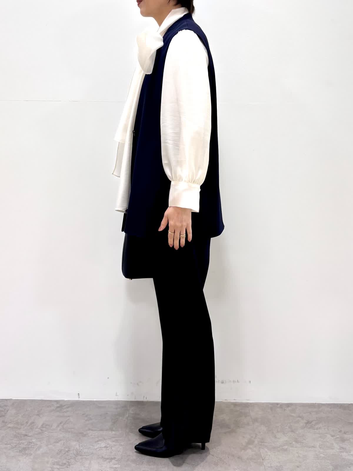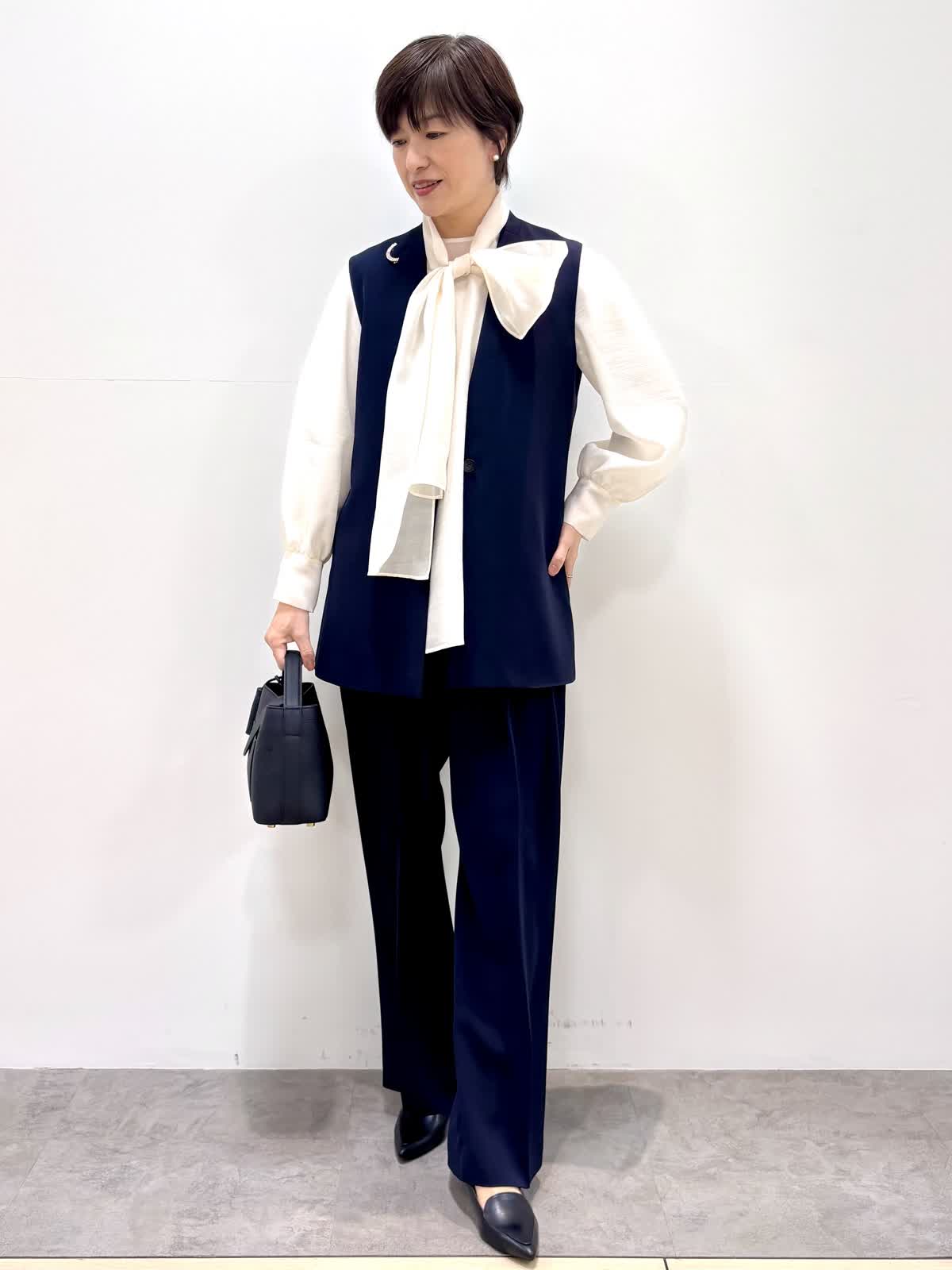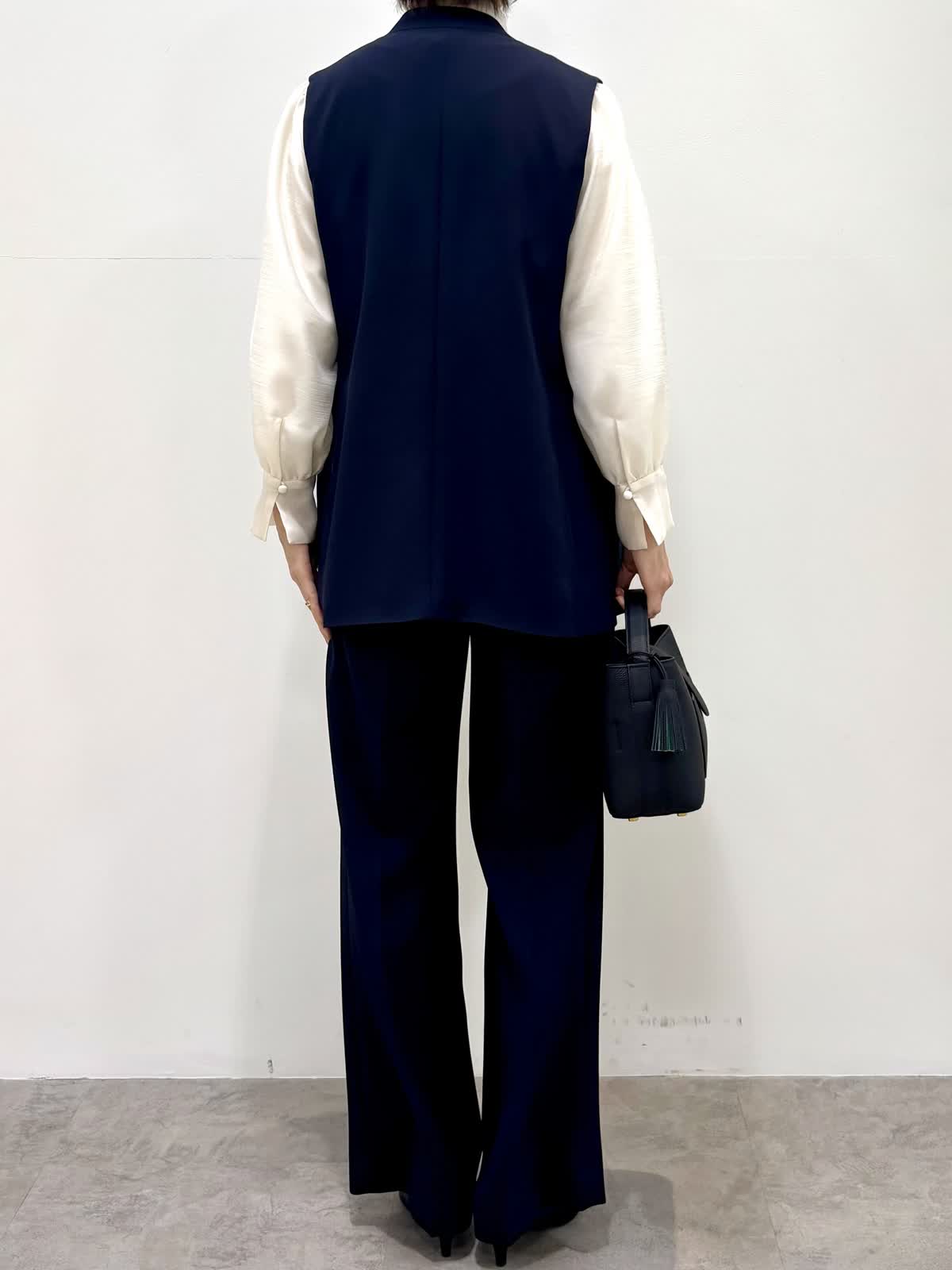 [着用サイズ]ジレ:9号 ブラウス:9号 パンツ:9号 [着用カラー]ジレ:ネイビー ブラウス:アイボリー パンツ:ネイビー セレモニーからビジネスシーンまで大活躍のジレのセットアップです。 インのシアーブラウスは華やかな光沢感があり、着映えする1枚です。 リボンも取り外せます。 セミワイドのパンツは脚のラインを綺麗に見せてくれる優れものです。 お手入れも簡単でお仕事にもピッタリです。