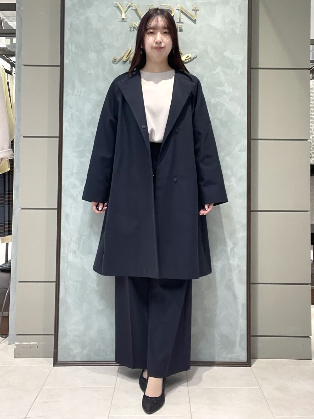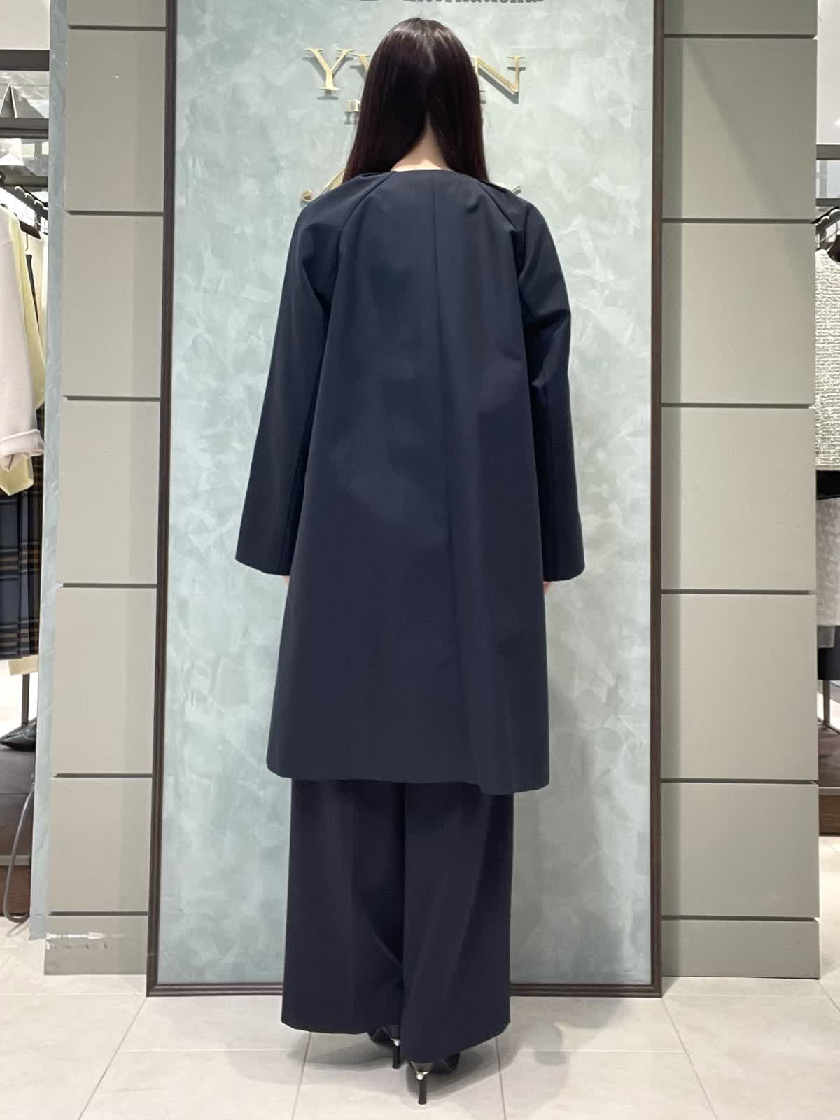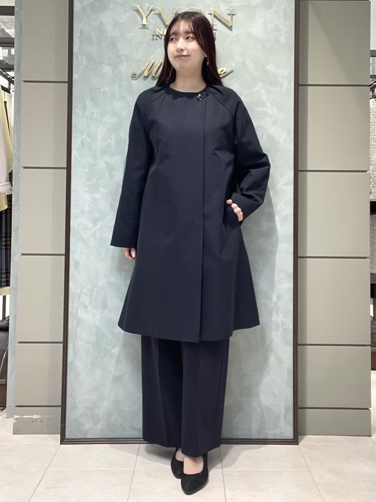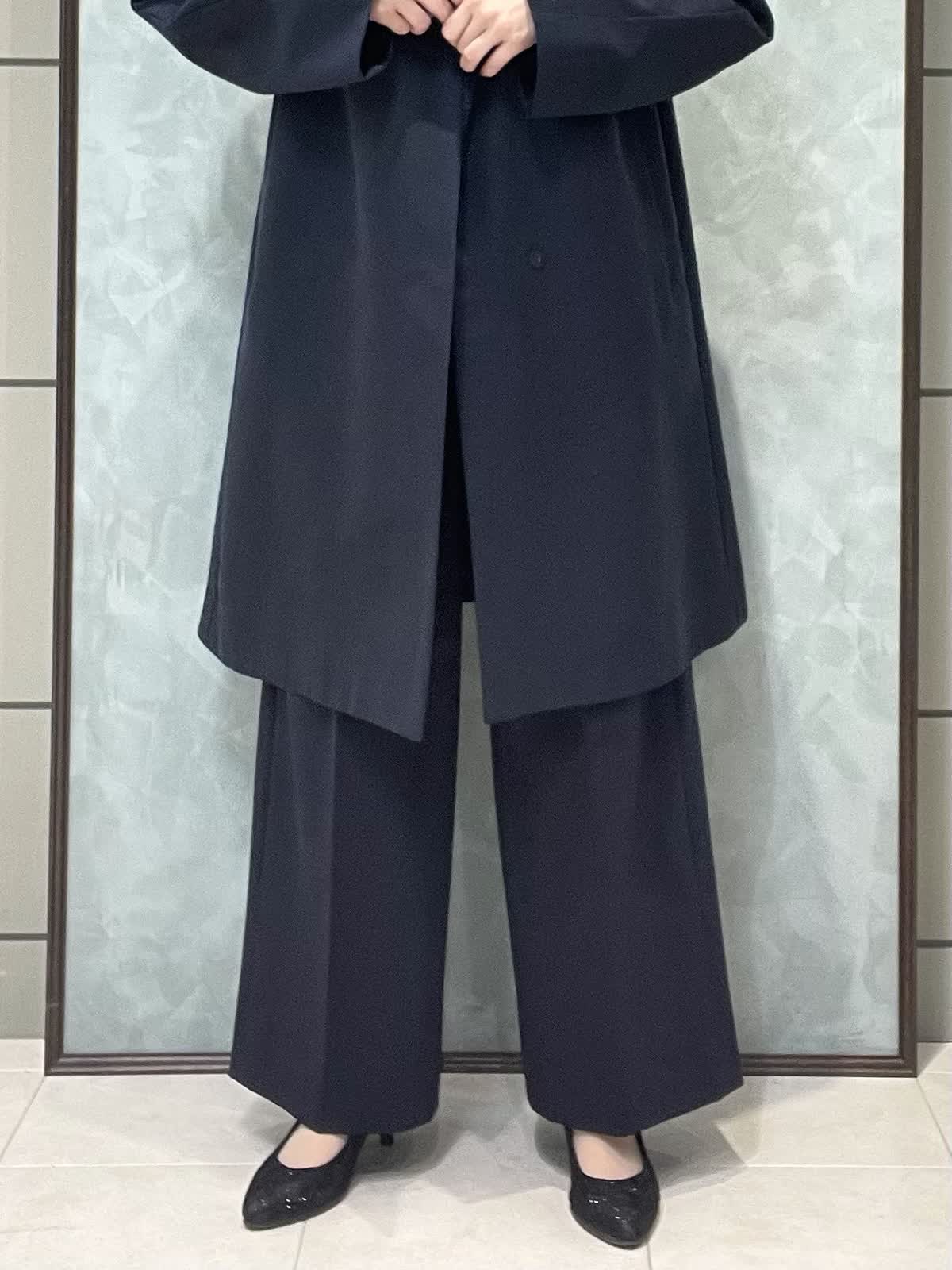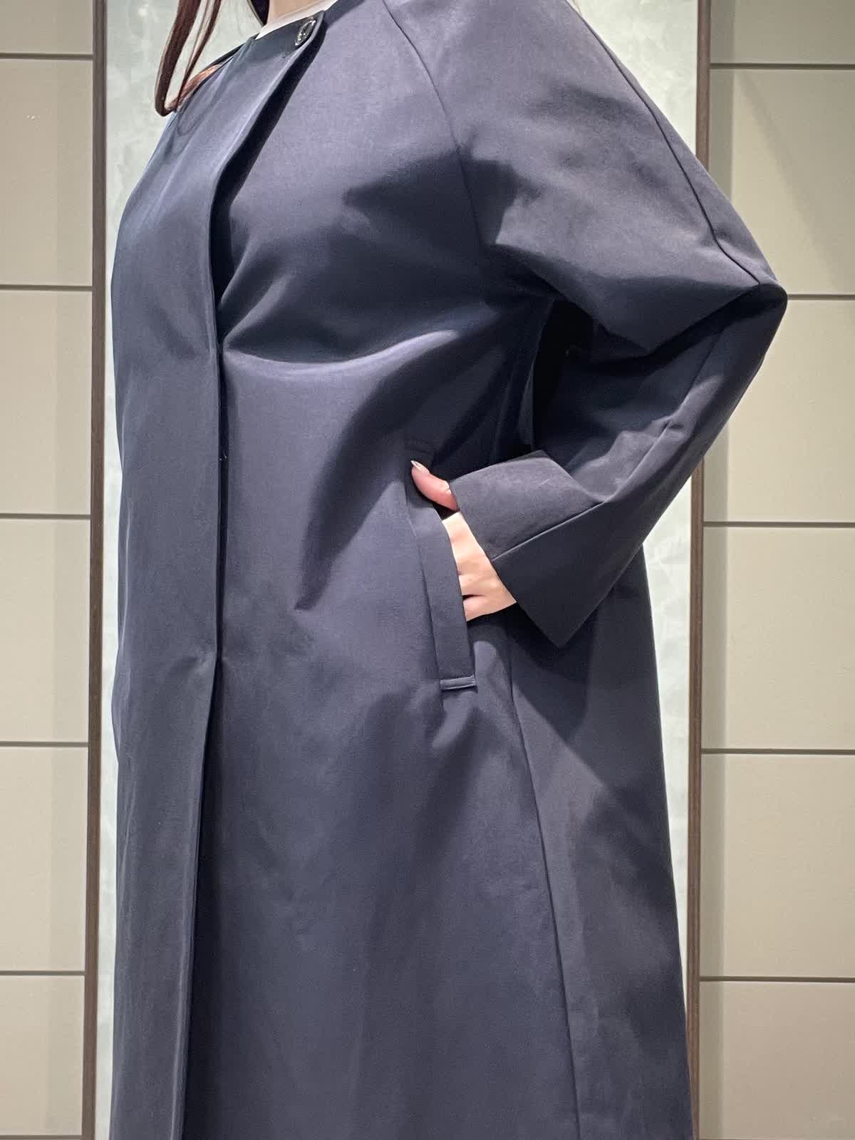 【着用サイズ】コート:7号 ブラウス:9号 パンツ:7号 春の通勤、お仕事スタイリングです。コートは軽くて羽織りやすく、ラグランスリーブでジャケットの上からでもゴワつかずに着用できます。着丈は157センチで膝下です。インナーのブラウスは袖の付け根がふわっと立体感のあるデザインです。他はシンプルなのでジャケットの形を選ばず、ベーシックに着回ししやすいです。後ろファスナー仕様です。パンツは太すぎないセミワイドです。シーズンレスで履けてオン、オフも問わない万能パンツです。着丈は足の甲につくくらいです。ベルトループ付き、後ろゴム、左右ポケットありです。