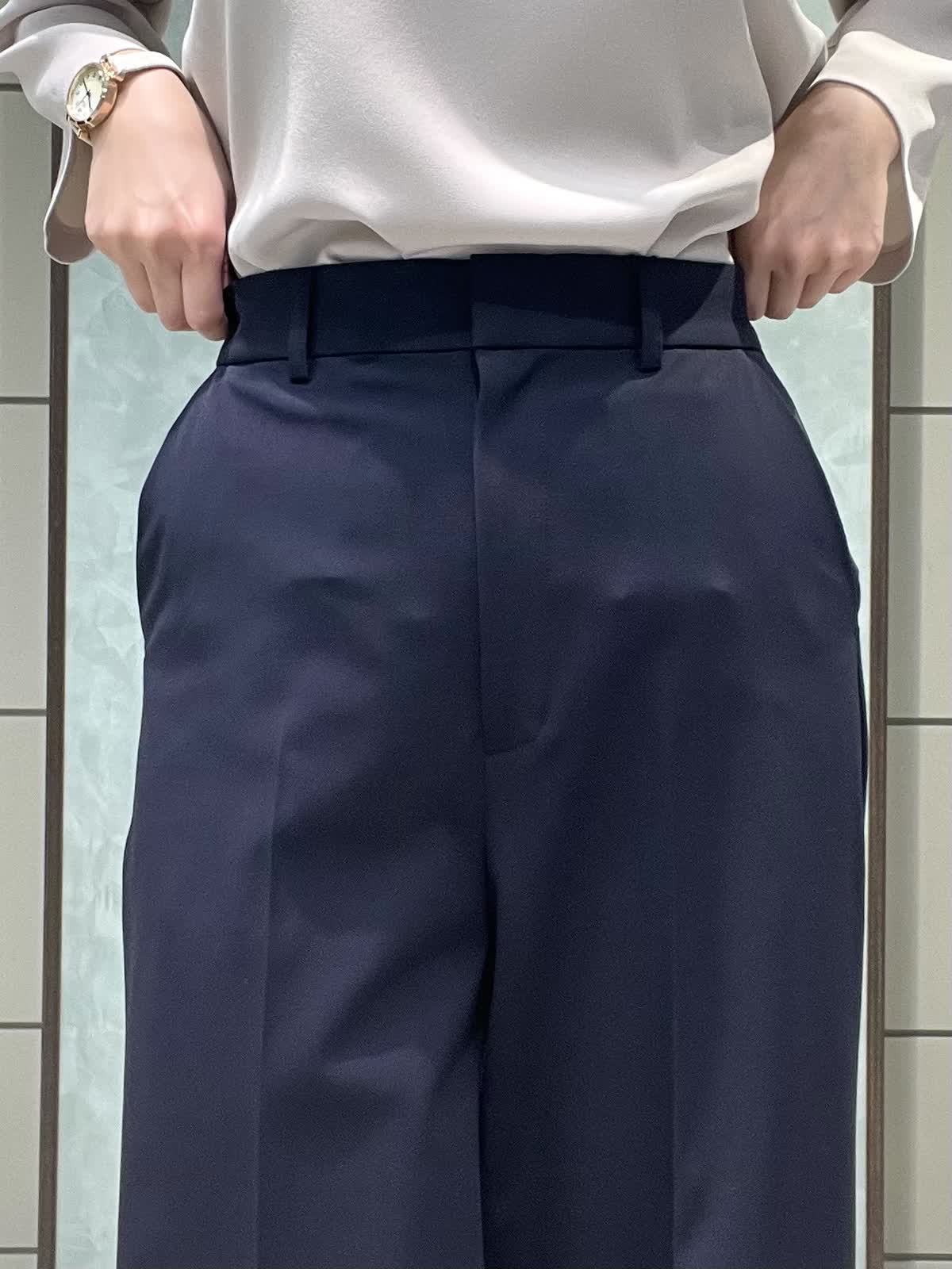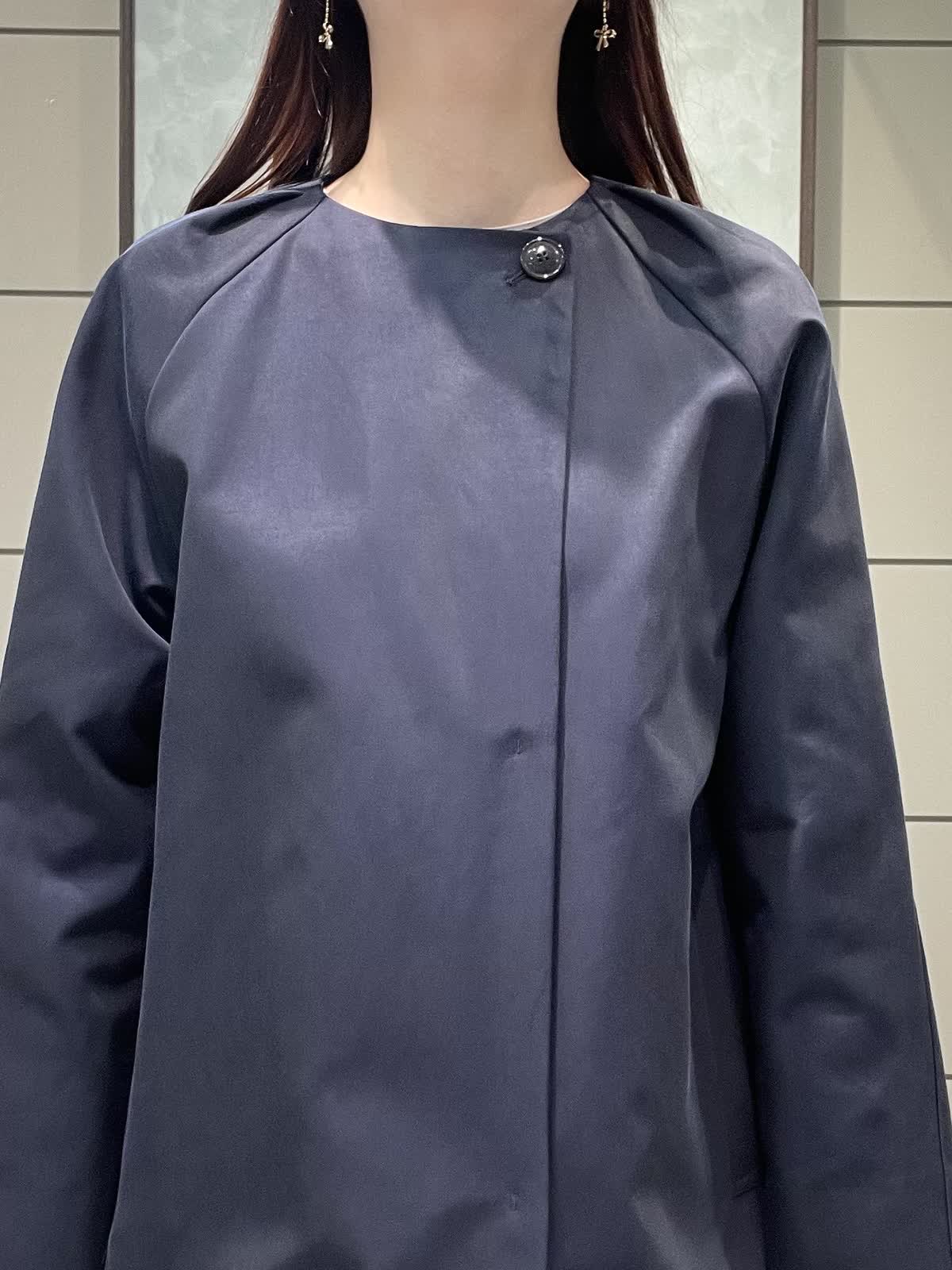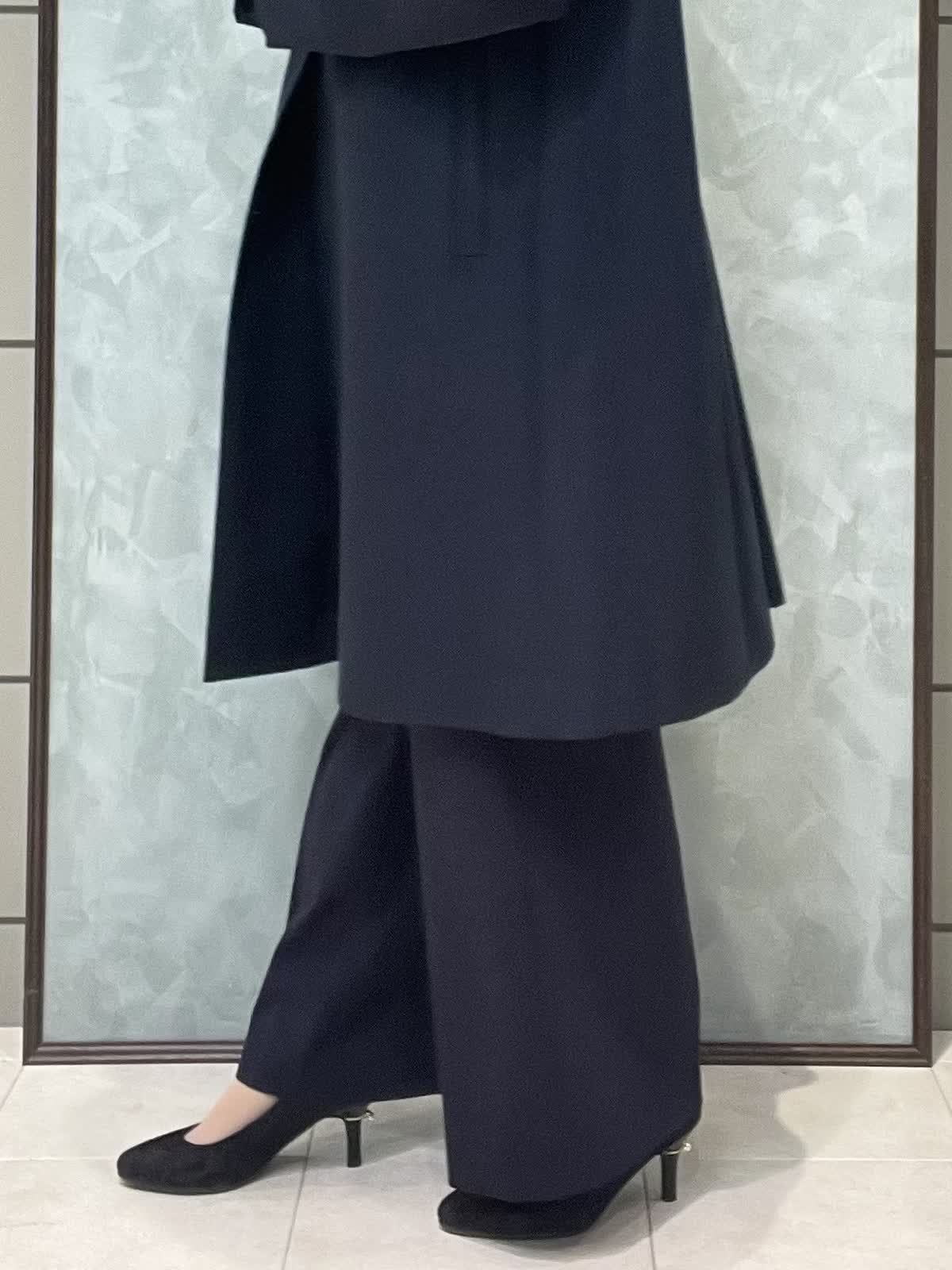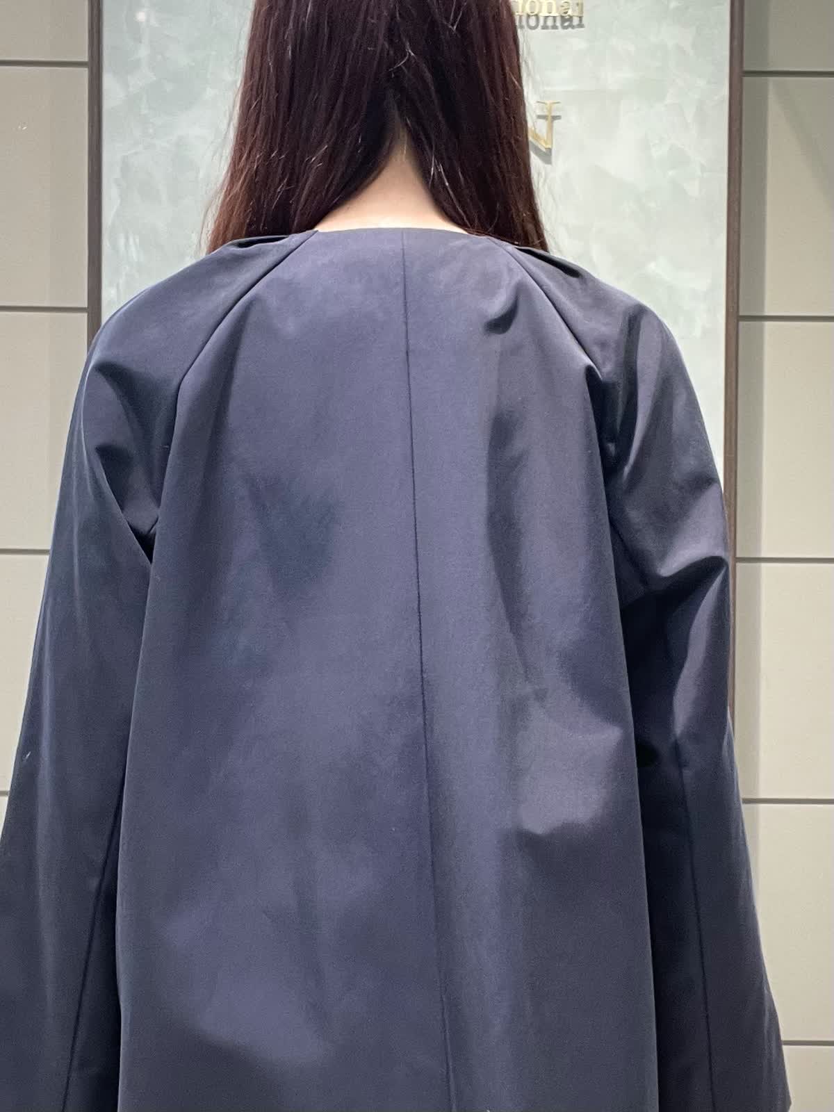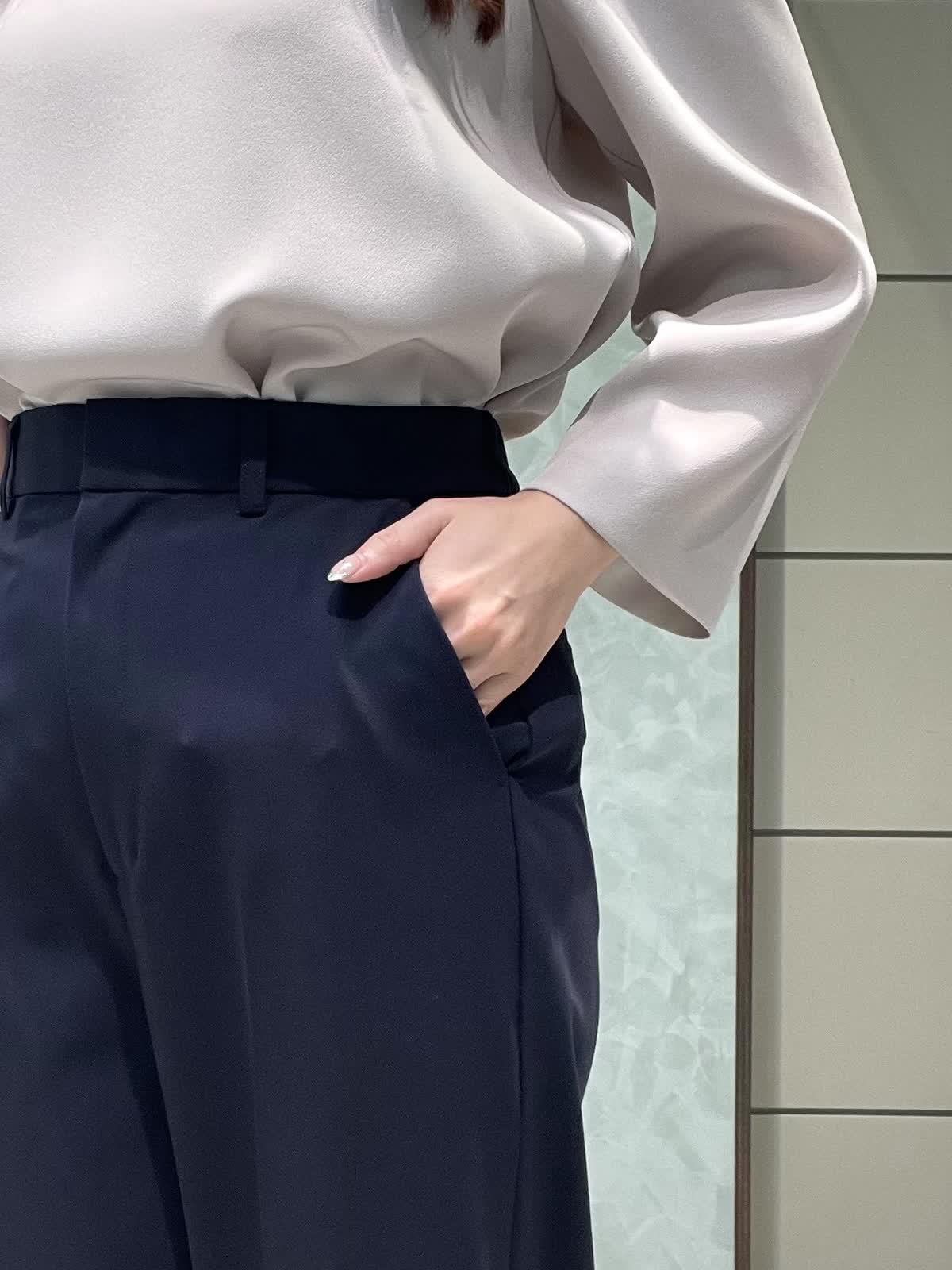 【着用サイズ】コート:7号 ブラウス:9号 パンツ:7号 春の通勤、お仕事スタイリングです。コートは軽くて羽織りやすく、ラグランスリーブでジャケットの上からでもゴワつかずに着用できます。着丈は157センチで膝下です。インナーのブラウスは袖の付け根がふわっと立体感のあるデザインです。他はシンプルなのでジャケットの形を選ばず、ベーシックに着回ししやすいです。後ろファスナー仕様です。パンツは太すぎないセミワイドです。シーズンレスで履けてオン、オフも問わない万能パンツです。着丈は足の甲につくくらいです。ベルトループ付き、後ろゴム、左右ポケットありです。