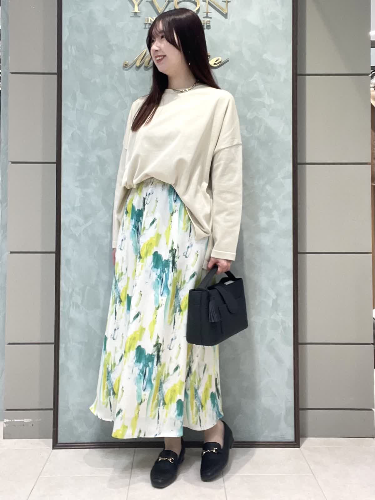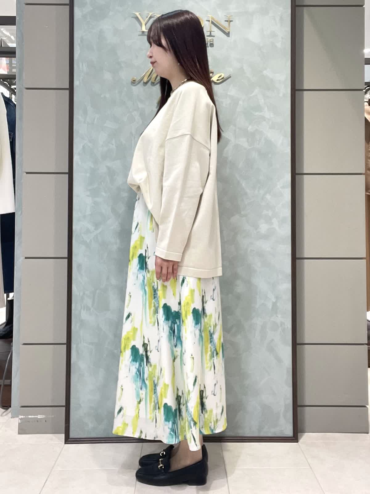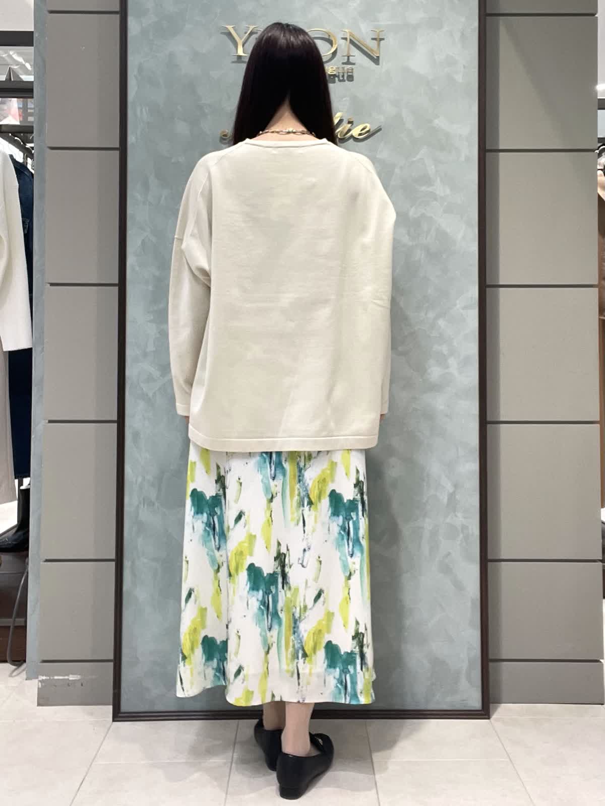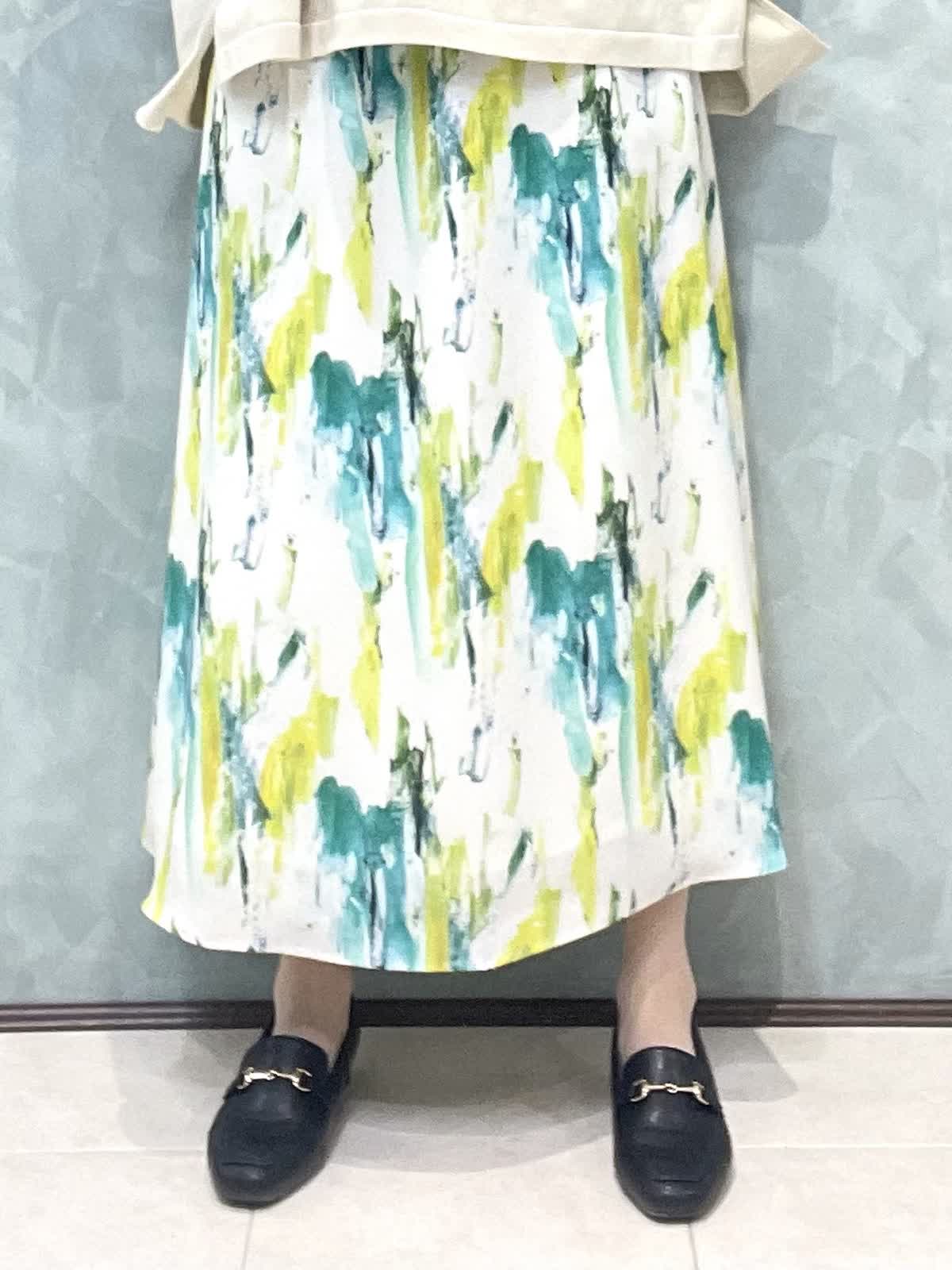 【着用サイズ】ニット:9号 スカート:7号 春のお出かけスタイリングです。 ニットはオーバーサイズでゆったりラフに着用できます。程よく薄手なので、今はシャツやシアーのインナーとレイヤードして、暖かくなったら1枚で、色々な着こなしを楽しめます!着丈は後ろがヒップにかかるくらいです。爽やかな柄が目をひくスカートは、オールゴムで履き心地抜群です。肌に張り付かずさらっと涼しく履けます。着丈は157センチで足首がでるくらいです。左右ポケット付きです。