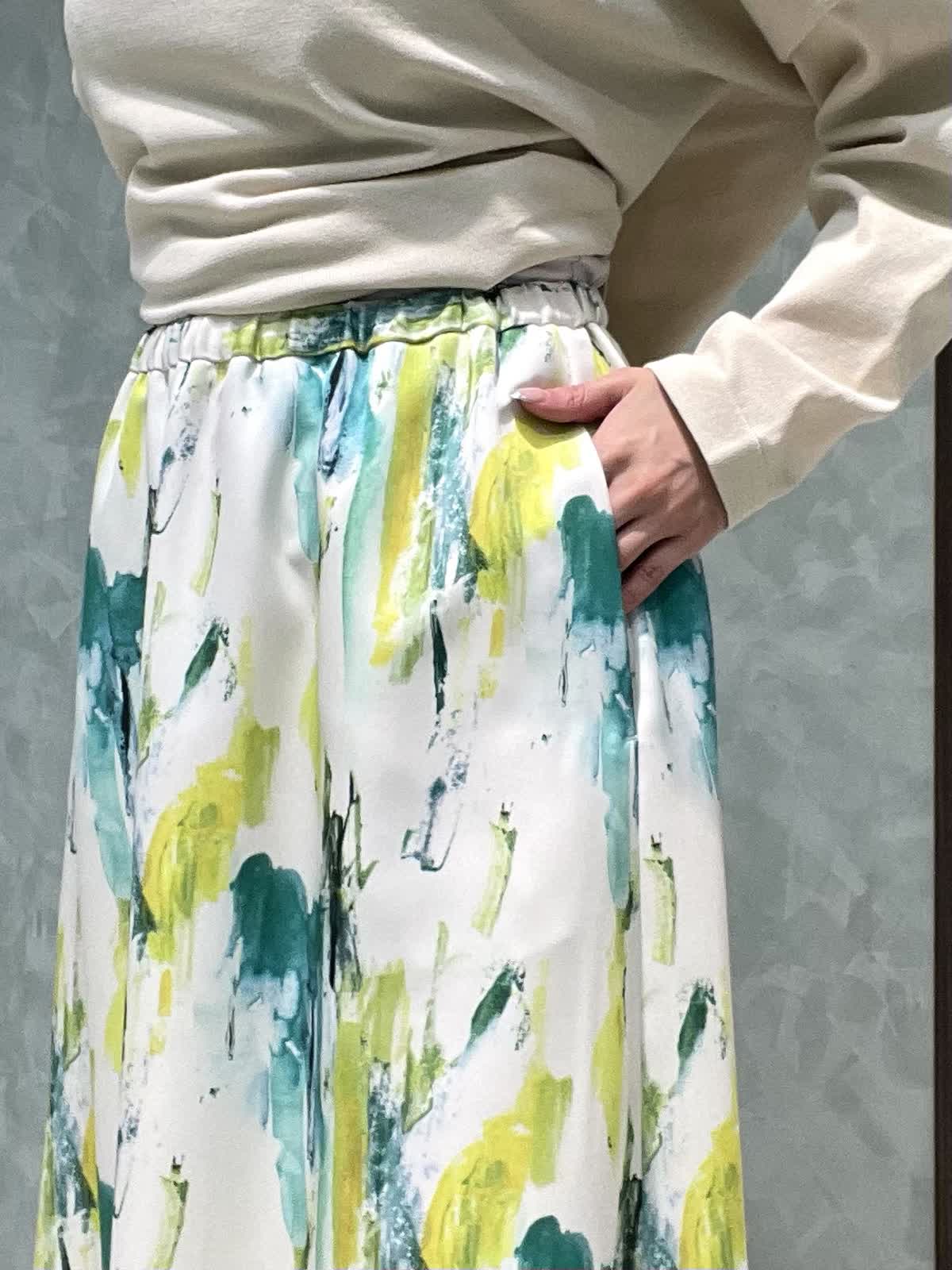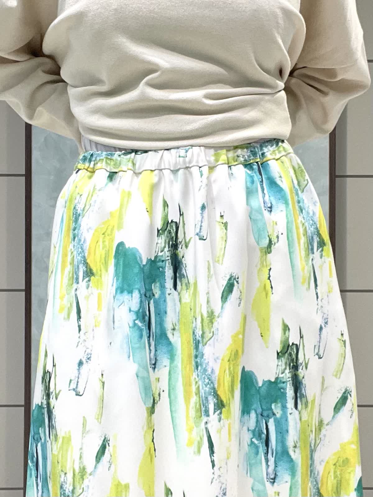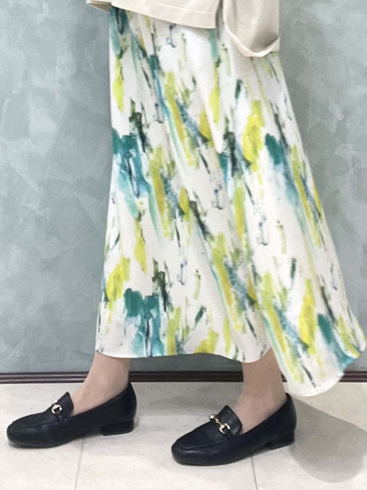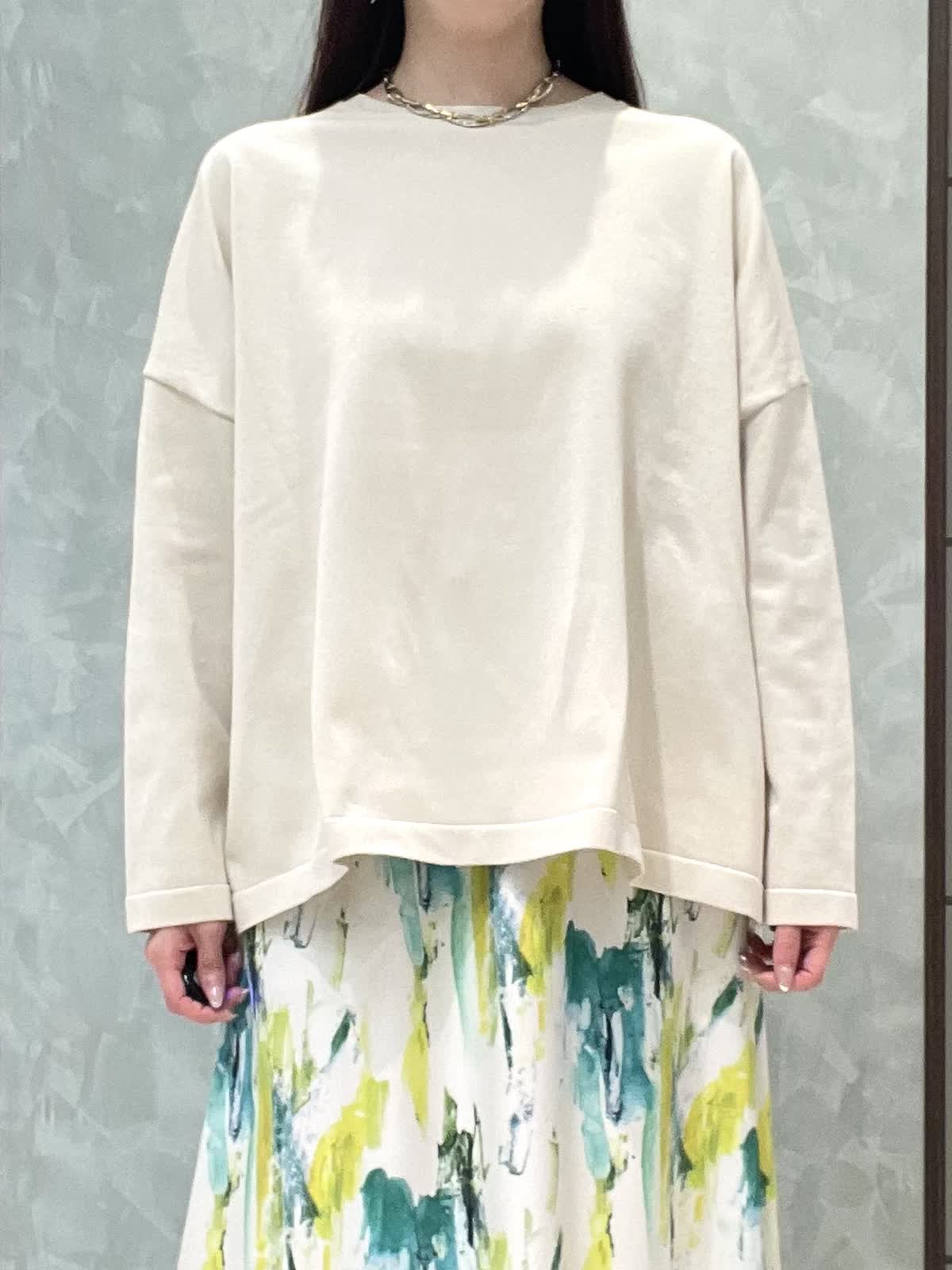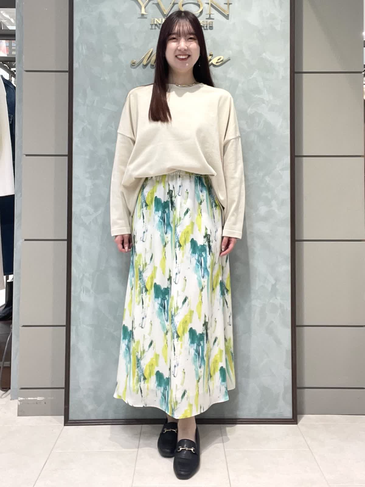 【着用サイズ】ニット:9号 スカート:7号 春のお出かけスタイリングです。 ニットはオーバーサイズでゆったりラフに着用できます。程よく薄手なので、今はシャツやシアーのインナーとレイヤードして、暖かくなったら1枚で、色々な着こなしを楽しめます!着丈は後ろがヒップにかかるくらいです。爽やかな柄が目をひくスカートは、オールゴムで履き心地抜群です。肌に張り付かずさらっと涼しく履けます。着丈は157センチで足首がでるくらいです。左右ポケット付きです。