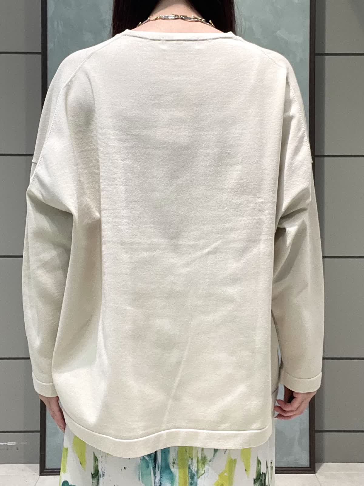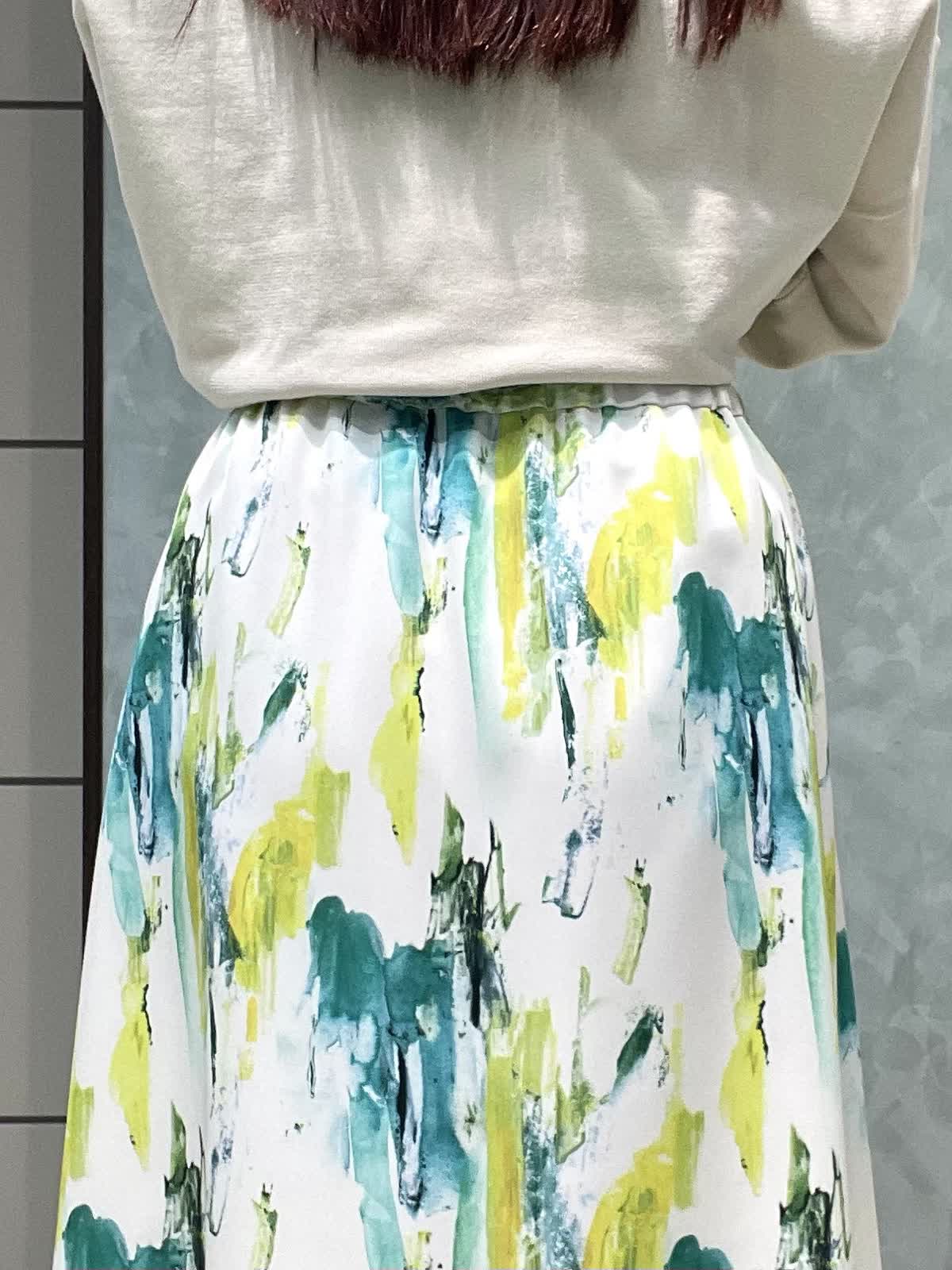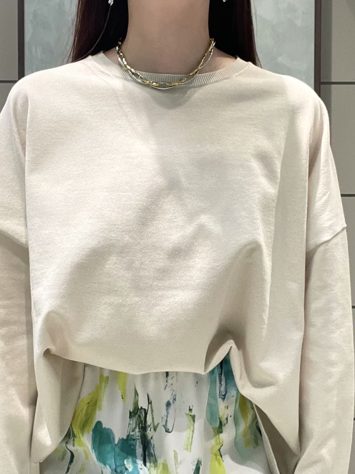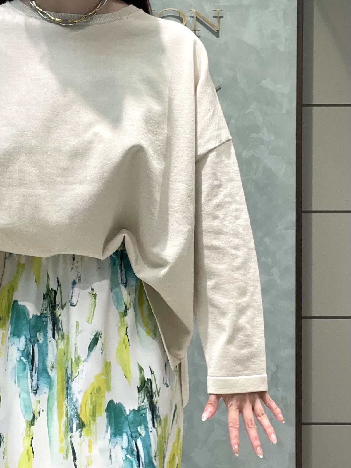 【着用サイズ】ニット:9号 スカート:7号 春のお出かけスタイリングです。 ニットはオーバーサイズでゆったりラフに着用できます。程よく薄手なので、今はシャツやシアーのインナーとレイヤードして、暖かくなったら1枚で、色々な着こなしを楽しめます!着丈は後ろがヒップにかかるくらいです。爽やかな柄が目をひくスカートは、オールゴムで履き心地抜群です。肌に張り付かずさらっと涼しく履けます。着丈は157センチで足首がでるくらいです。左右ポケット付きです。