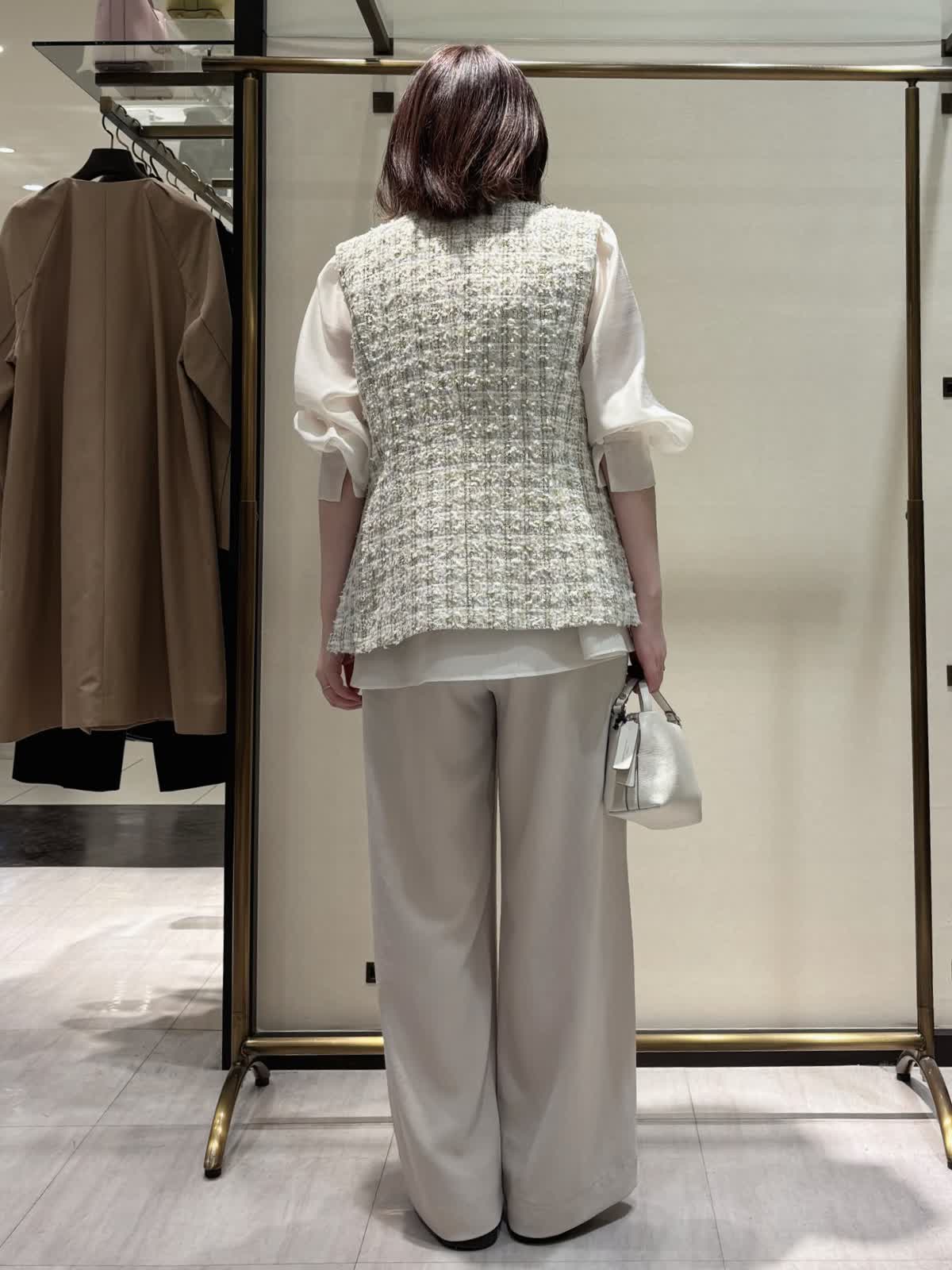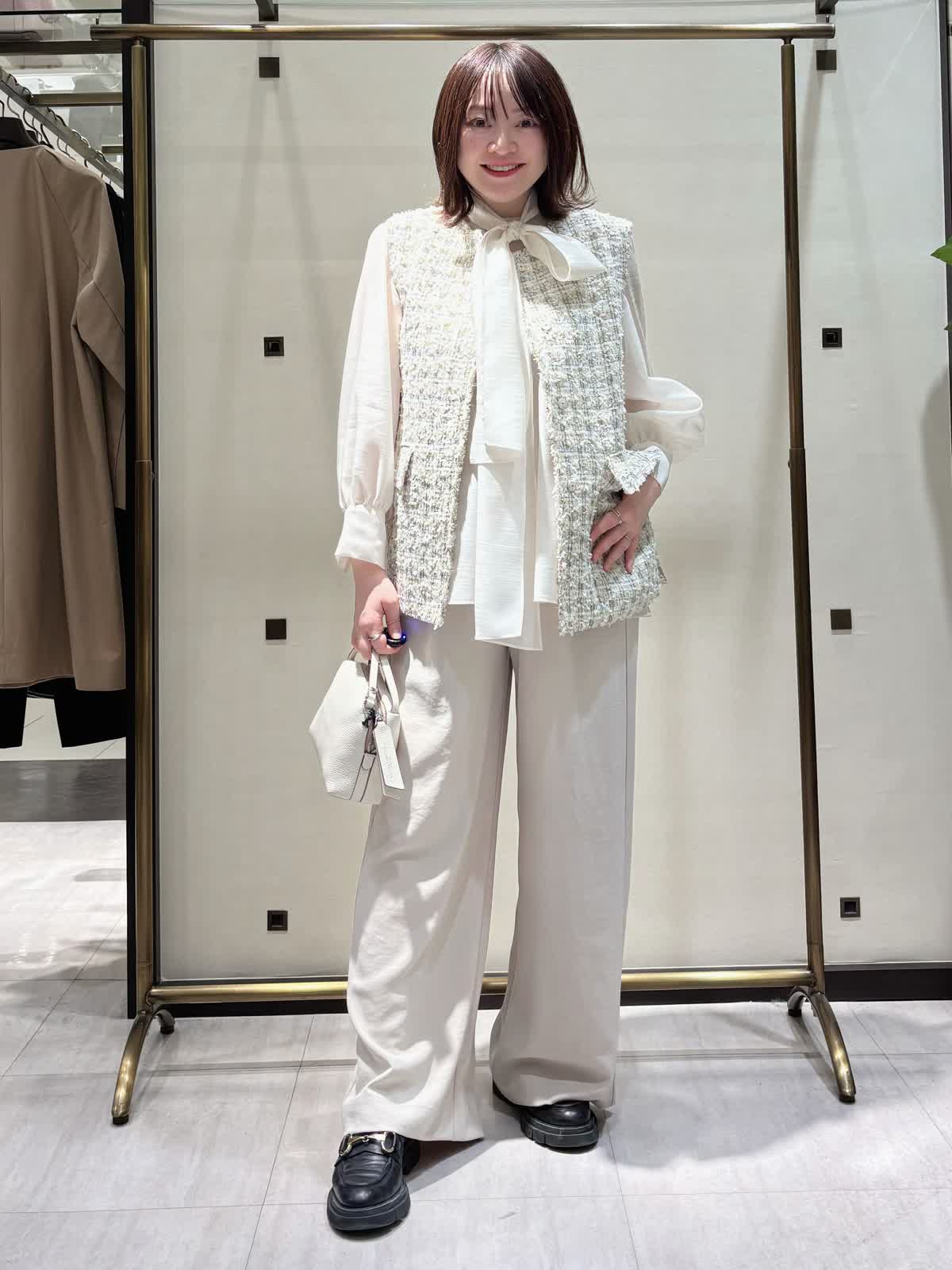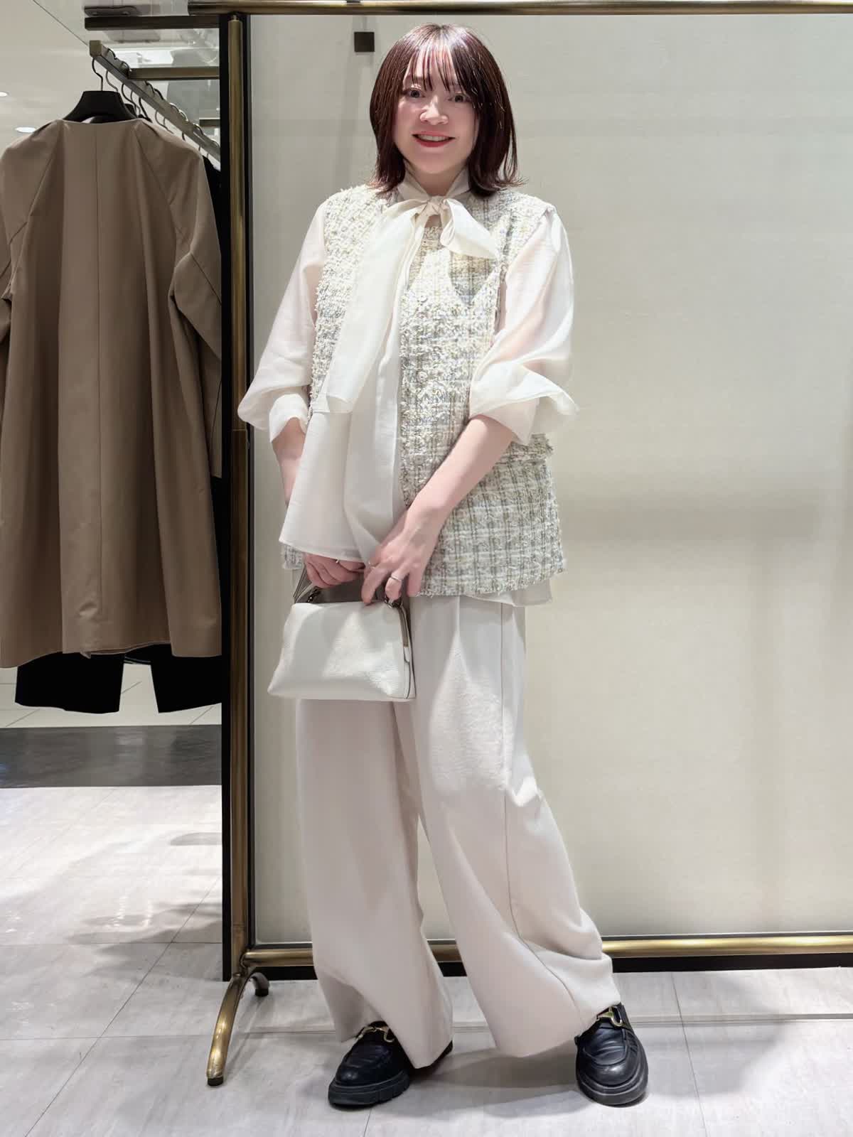 【着用カラー】 ジレ:ベージュ ブラウス:アイボリー パンツ:ベージュ 【着用サイズ】 ジレ、ブラウス:9号 パンツ:11号 華やかなツイードジレを主役にした、品格あるセレモニースタイル。 ボウタイブラウスが顔まわりを明るく演出し、柔らかなワントーン配色が上品でやさしい印象に仕上げます。 落ち感のあるワイドパンツで程よい抜け感を持たせ、入卒式や学校行事など幅広いシーンに対応できる装いです。