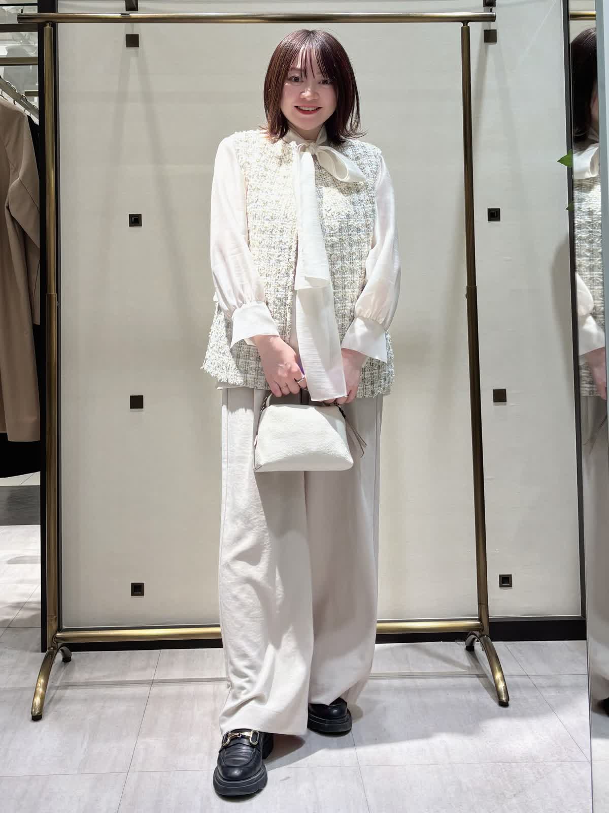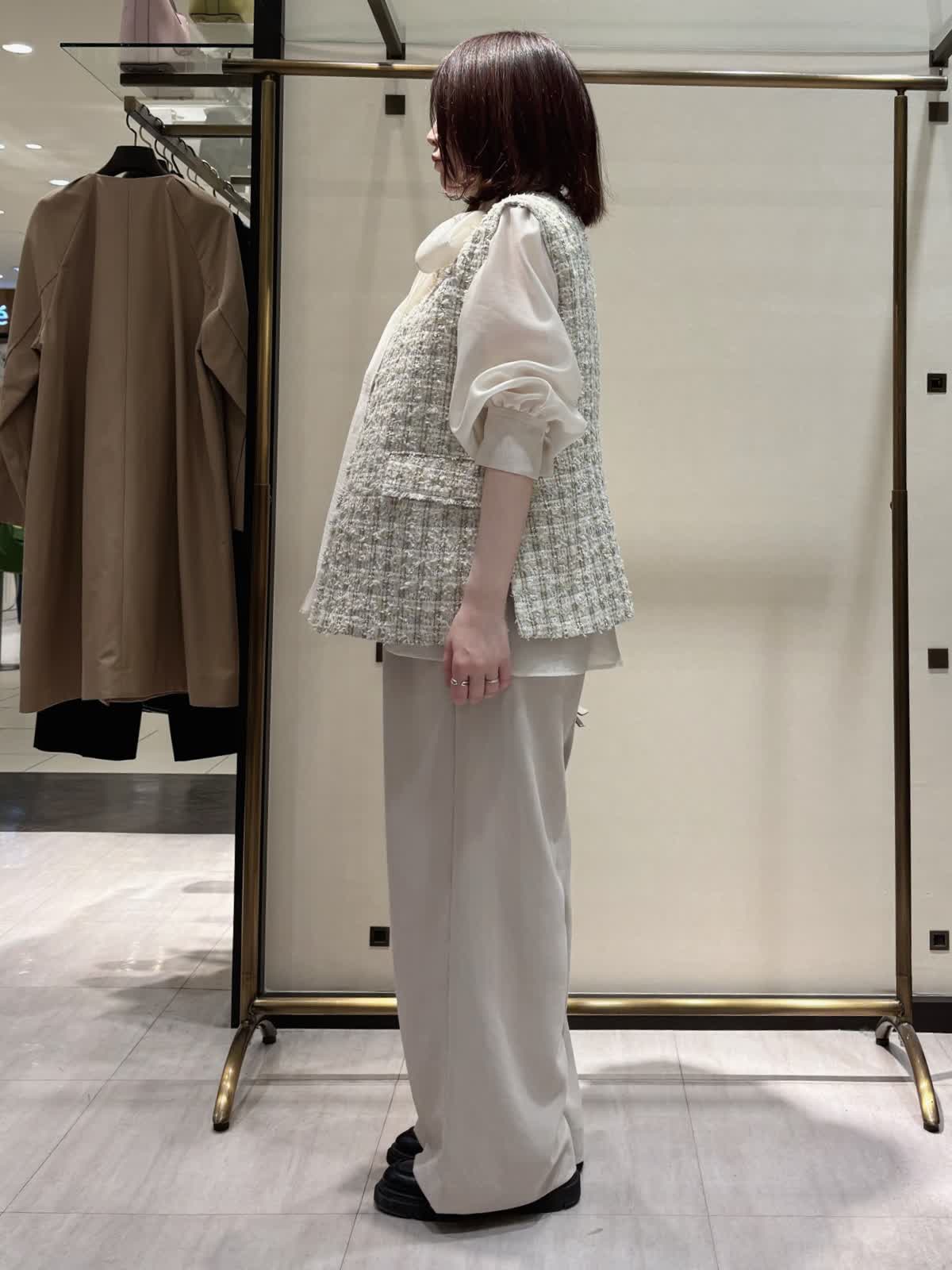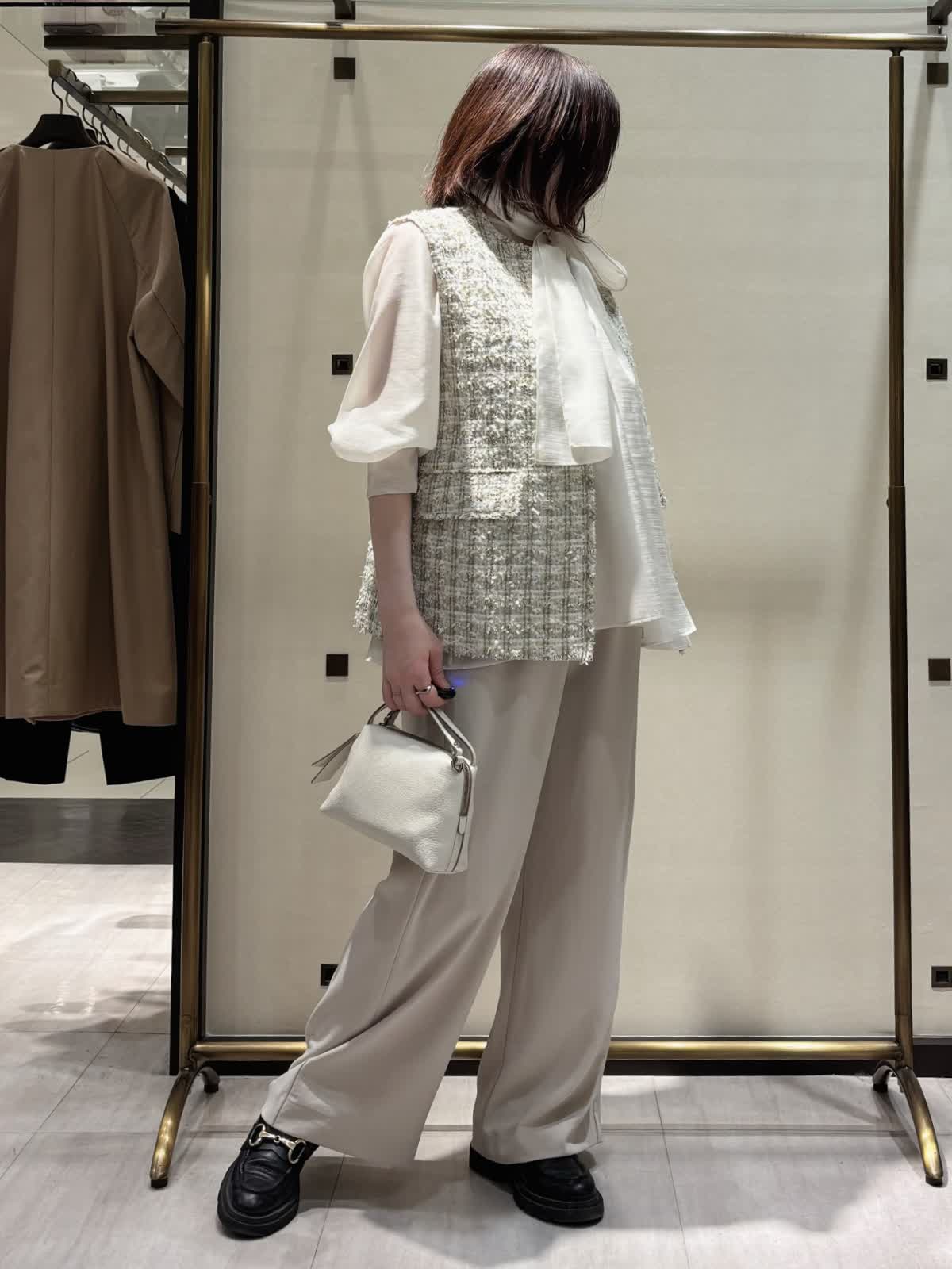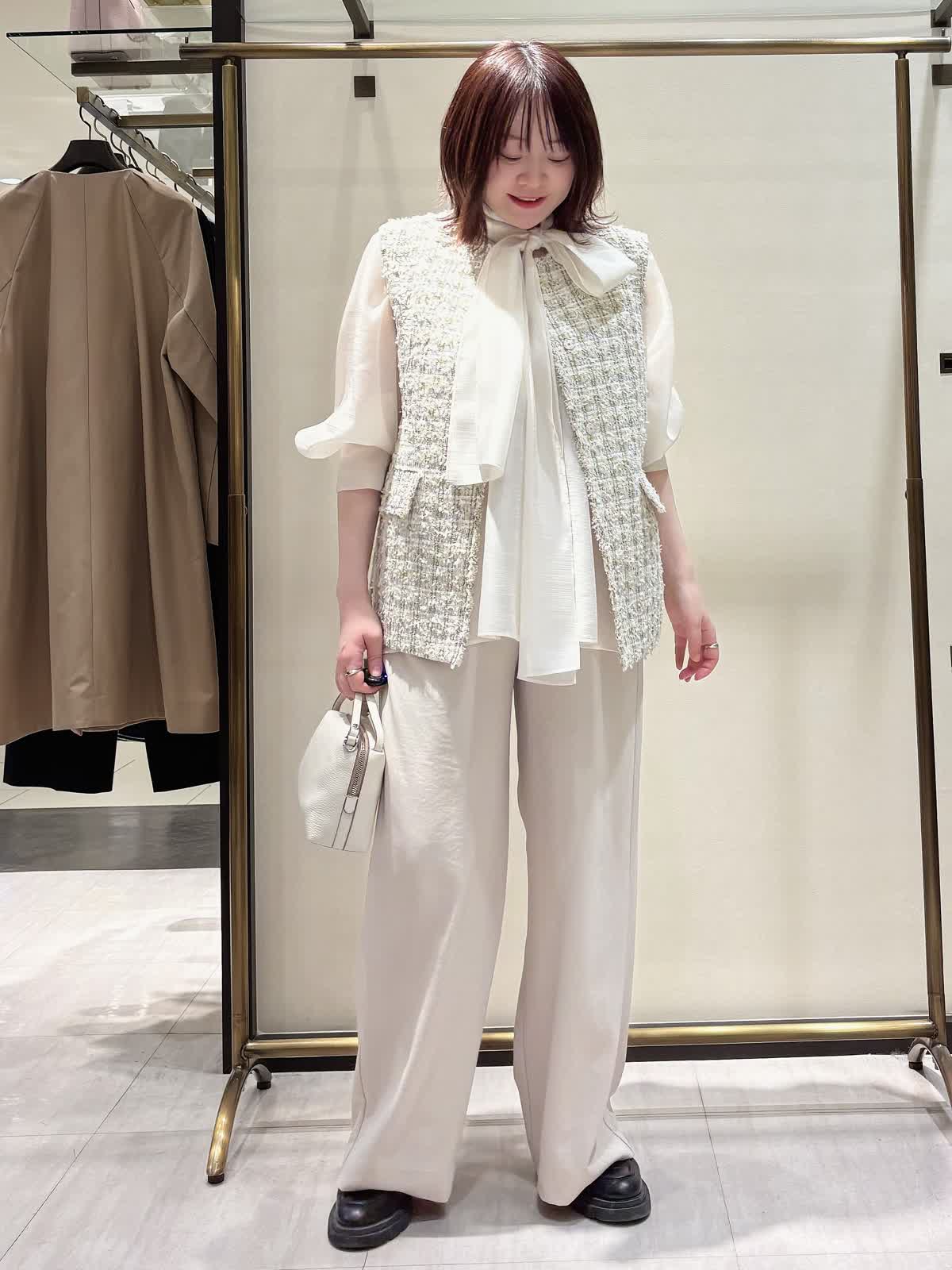 【着用カラー】 ジレ:ベージュ ブラウス:アイボリー パンツ:ベージュ 【着用サイズ】 ジレ、ブラウス:9号 パンツ:11号 華やかなツイードジレを主役にした、品格あるセレモニースタイル。 ボウタイブラウスが顔まわりを明るく演出し、柔らかなワントーン配色が上品でやさしい印象に仕上げます。 落ち感のあるワイドパンツで程よい抜け感を持たせ、入卒式や学校行事など幅広いシーンに対応できる装いです。