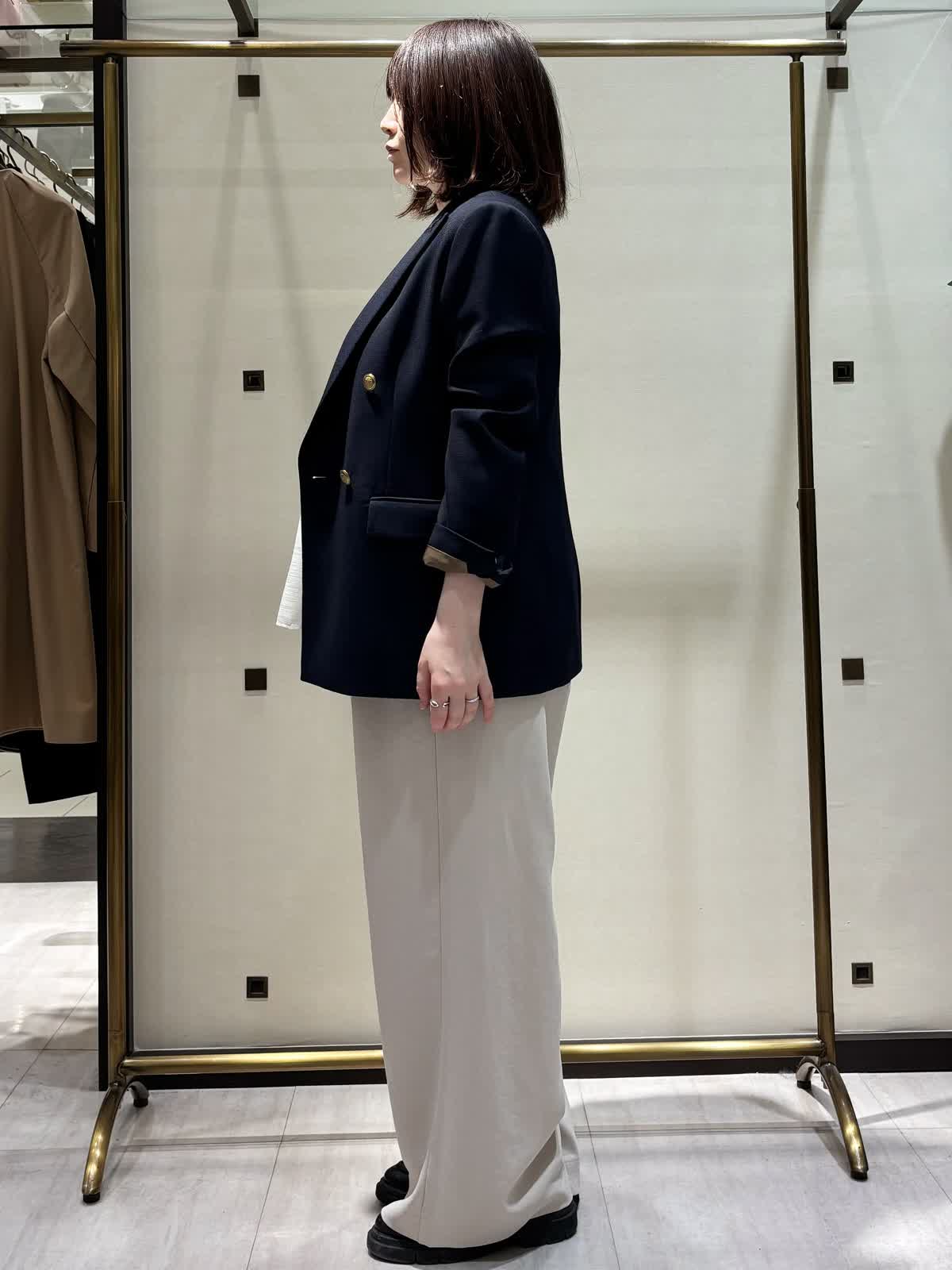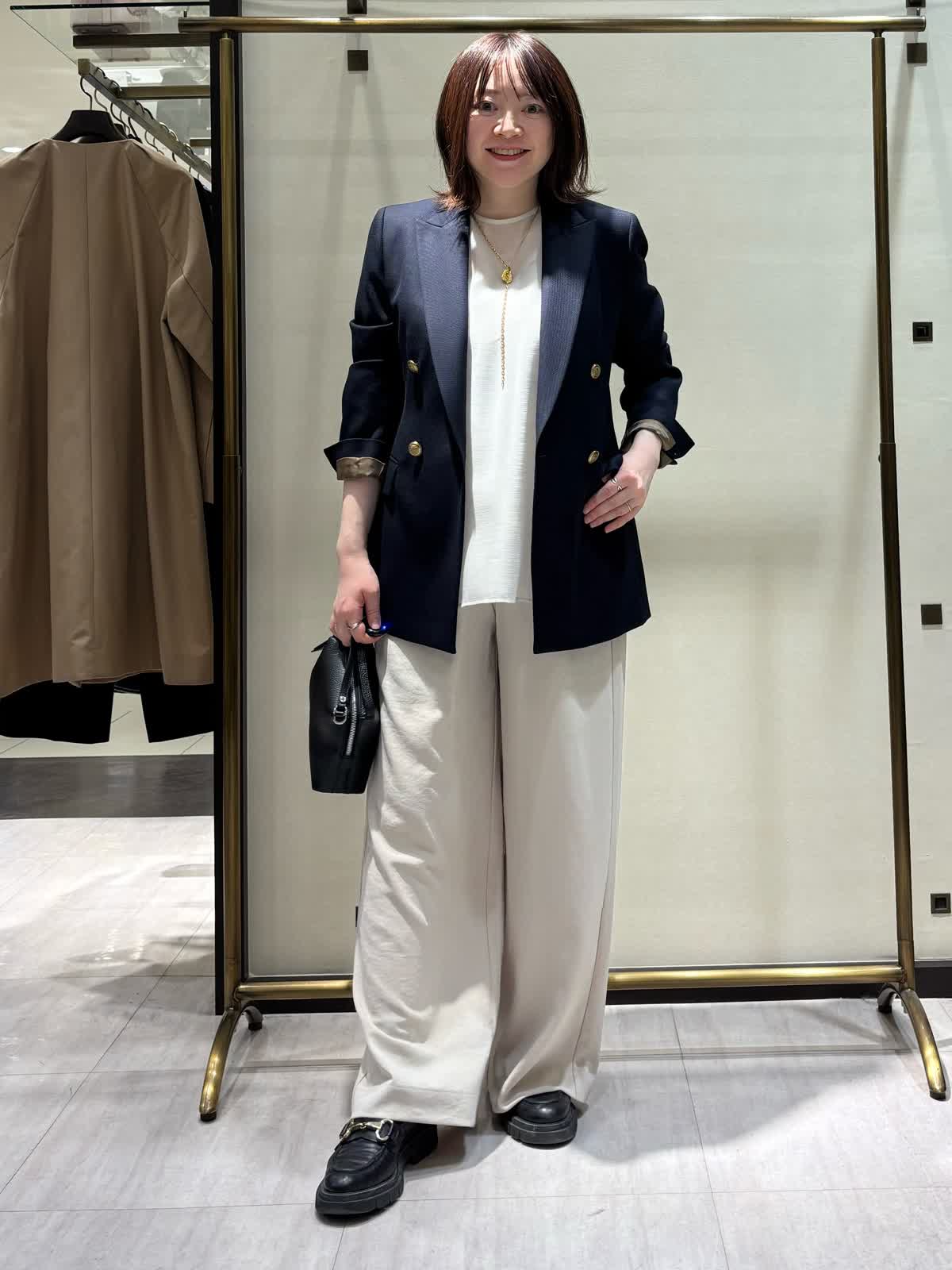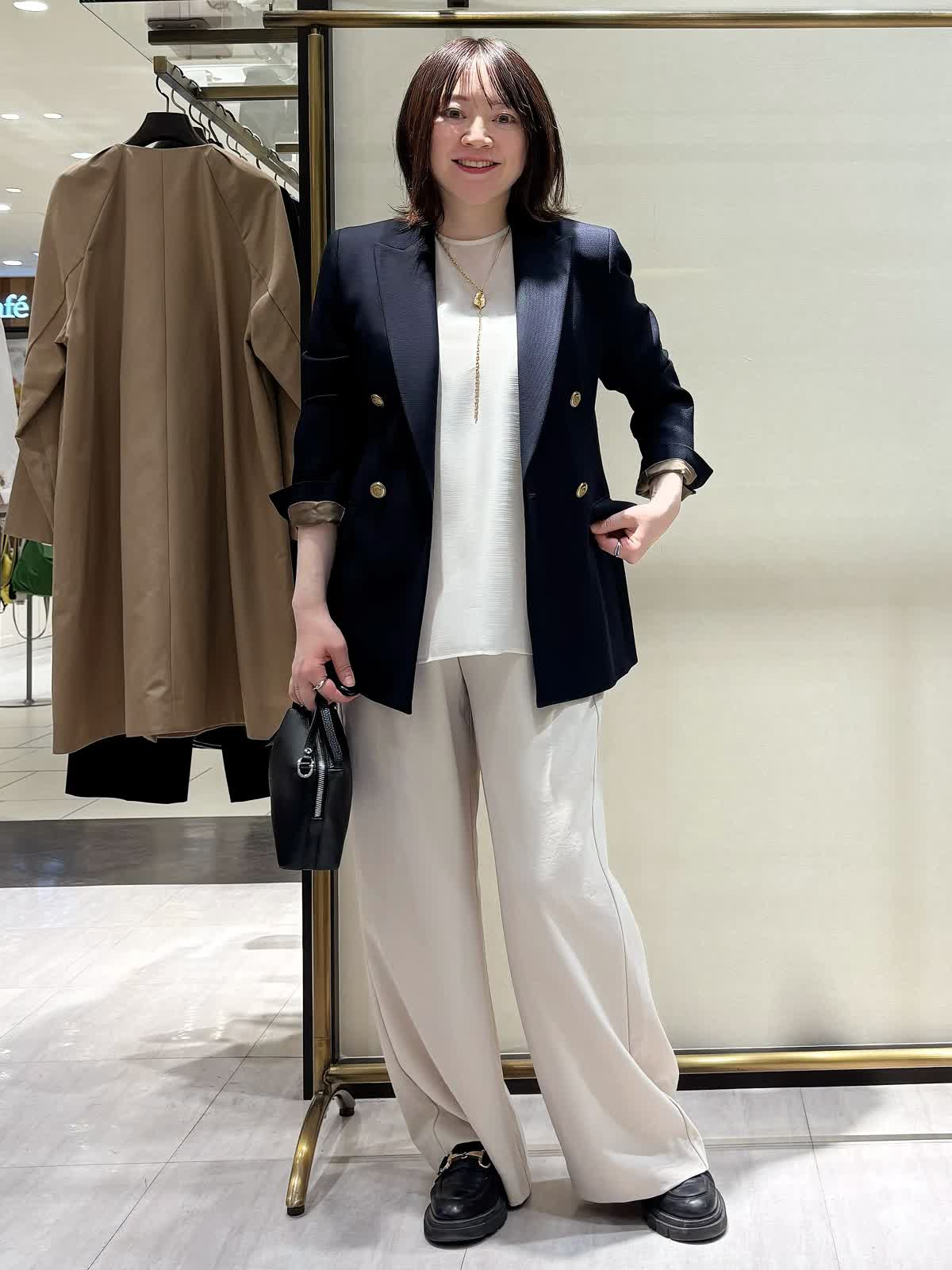 【着用カラー、サイズ】 ジャケット:ネイビー、9号 ブラウス:アイボリー、9号 パンツ:ベージュ、9号 ネイビーブレザーを主役にした、きちんと感のある大人カジュアルスタイル。 ゴールドボタンが程よいアクセントとなり、シンプルなインナーとワイドパンツを上品に引き締めます。 かっちりしすぎない抜け感のあるシルエットで、通勤からお出かけまで幅広く活躍する着こなしです。