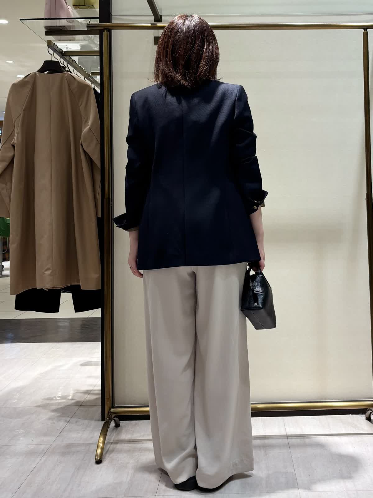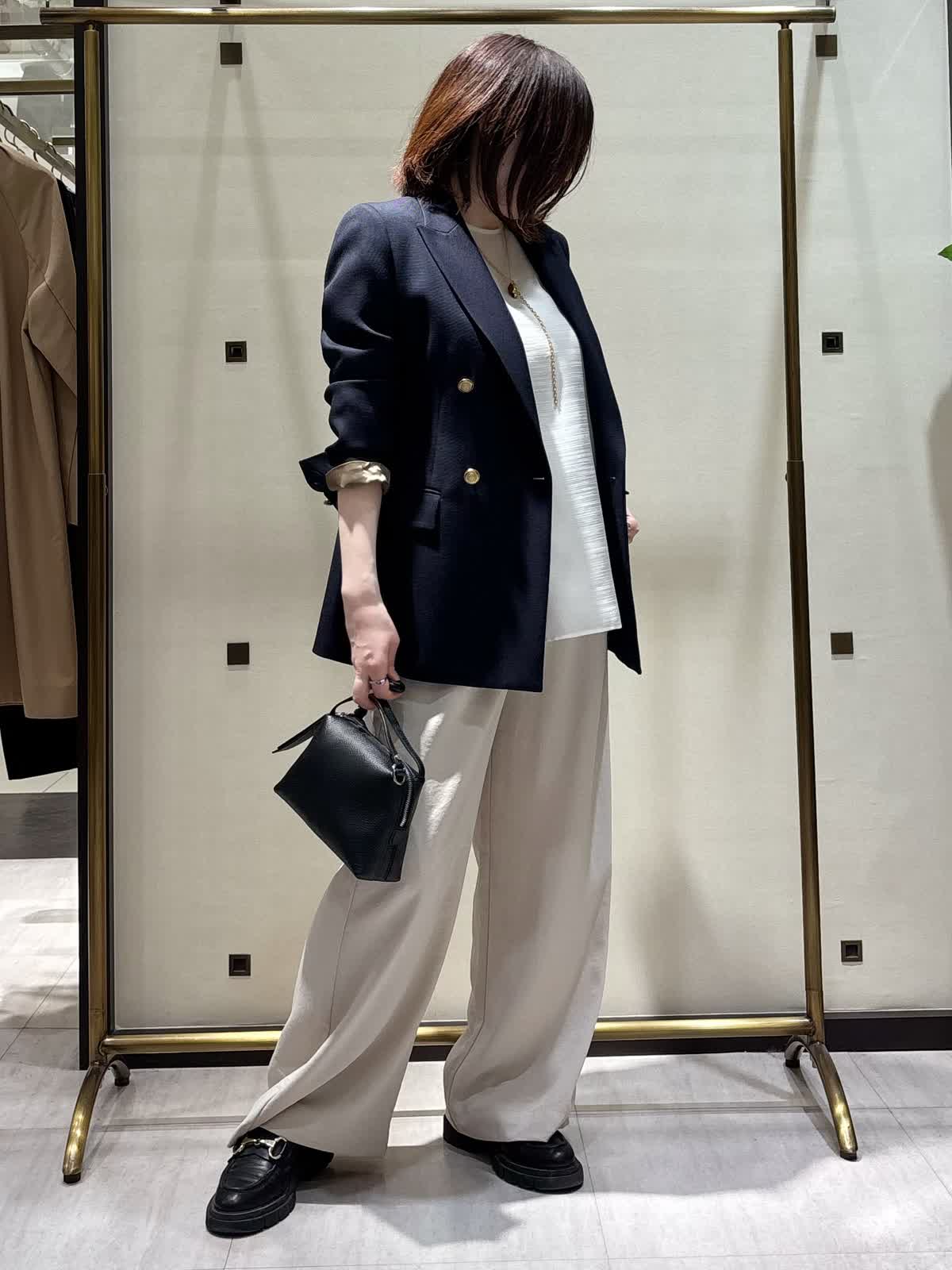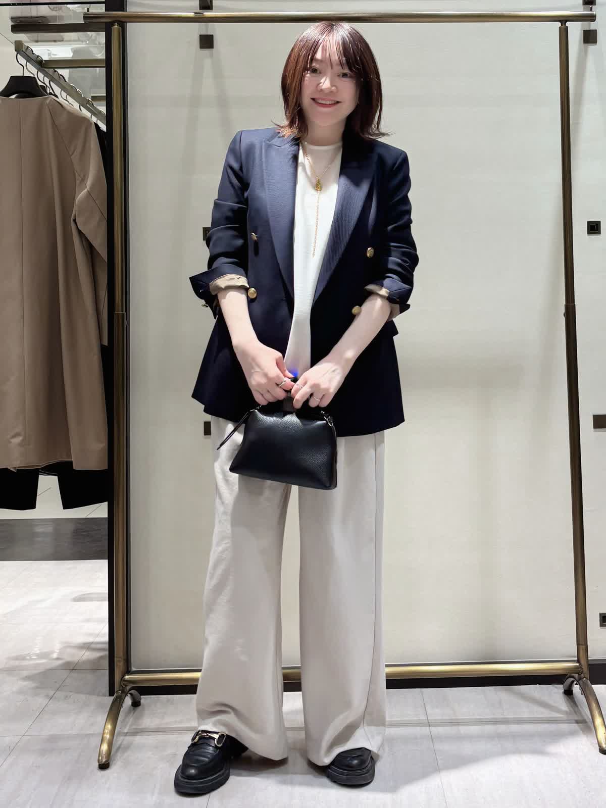 【着用カラー、サイズ】 ジャケット:ネイビー、9号 ブラウス:アイボリー、9号 パンツ:ベージュ、9号 ネイビーブレザーを主役にした、きちんと感のある大人カジュアルスタイル。 ゴールドボタンが程よいアクセントとなり、シンプルなインナーとワイドパンツを上品に引き締めます。 かっちりしすぎない抜け感のあるシルエットで、通勤からお出かけまで幅広く活躍する着こなしです。