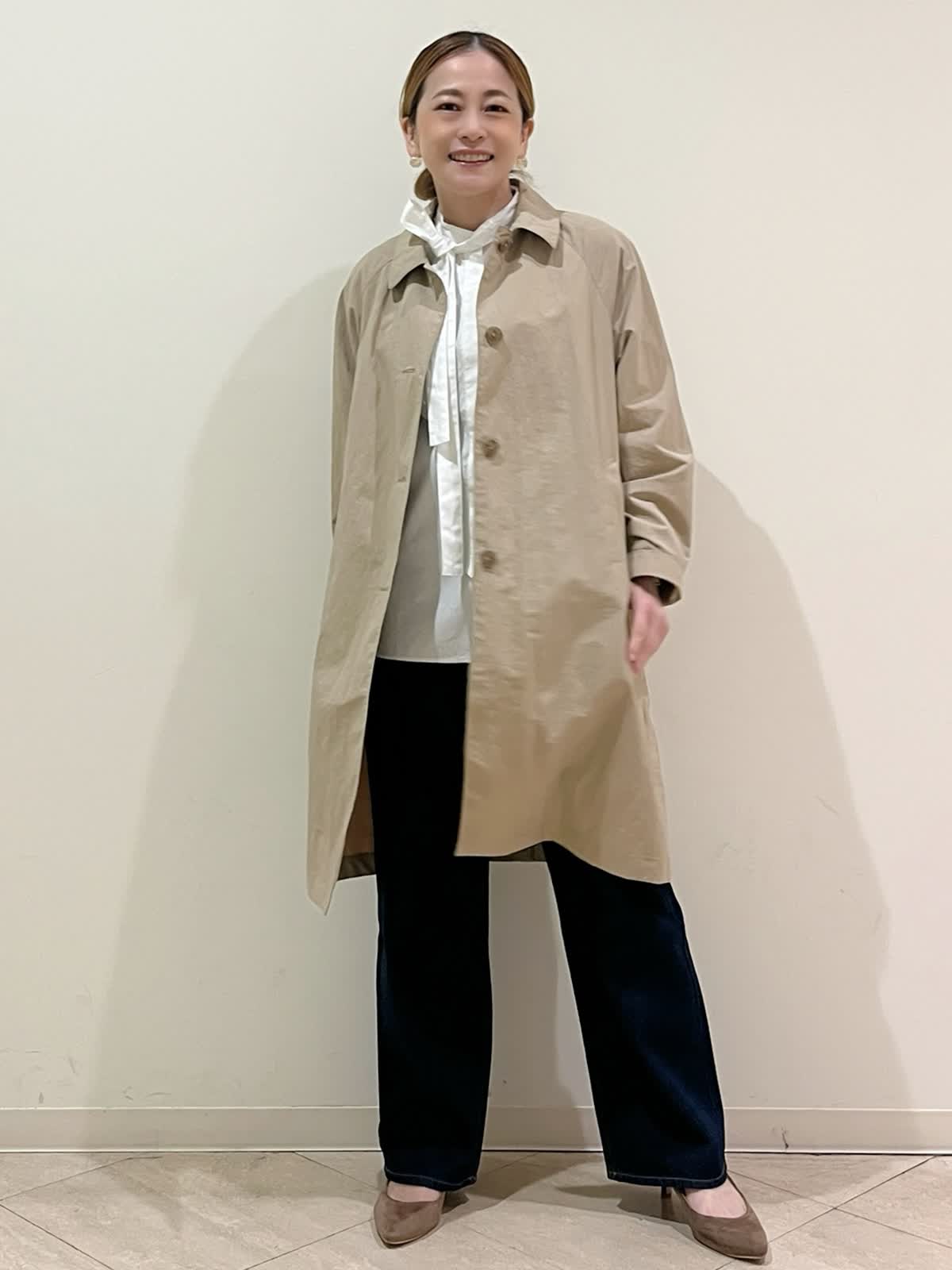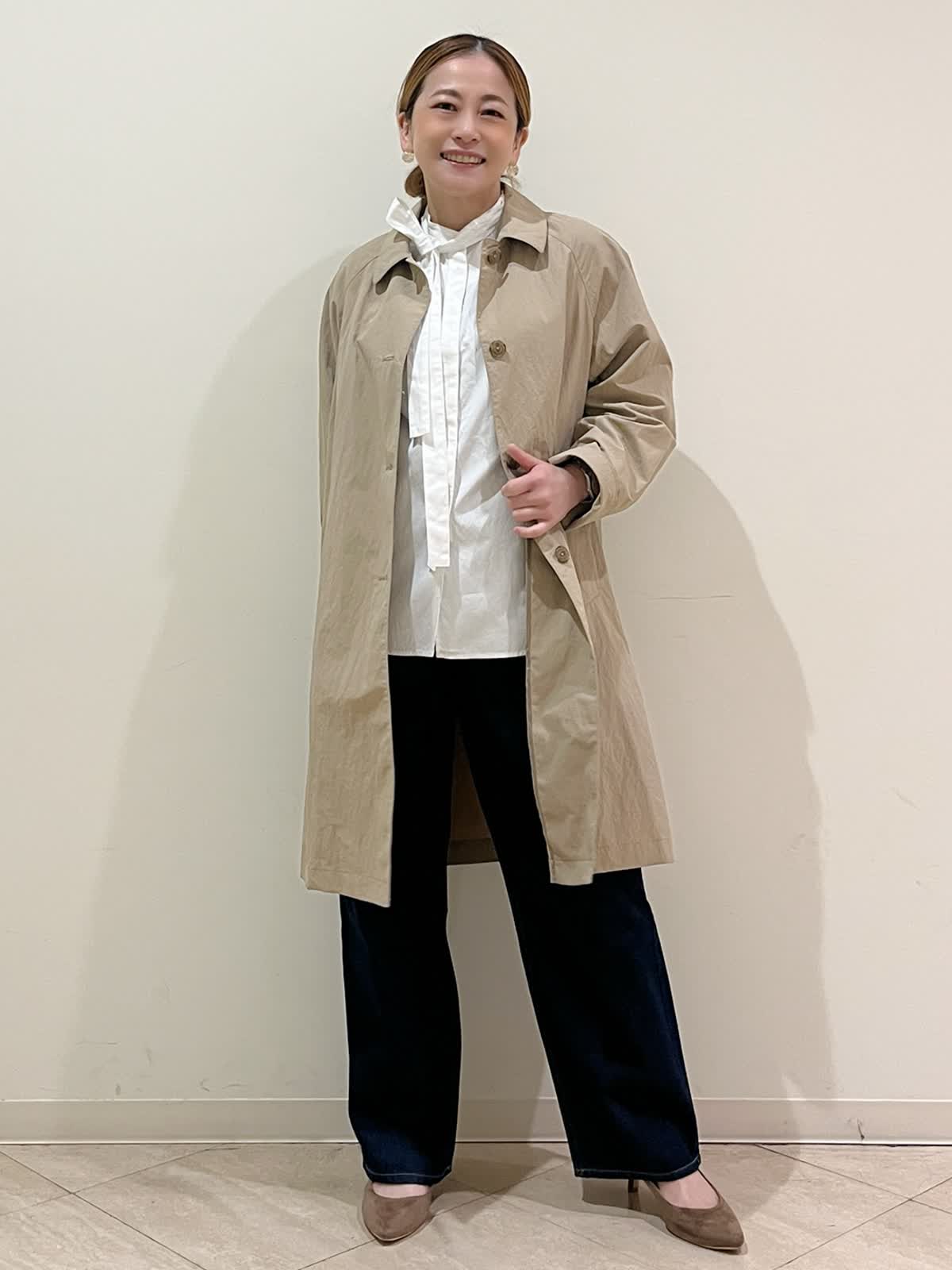 きれいめカジュアルでお出かけスタイリングです。軽くてさらっと羽織れるステンカラーのコートです。ゆったりサイズなのでインナーも悩みません。キャメルなので合わせやすくオンでもオフでも着れるのでたくさん活躍するコートです。ボウタイのシャツで女性らしさをプラスしてみました。どの角度から見てもシルエットがきれいなデニムです。脚長効果があるのも嬉しいポイントです。