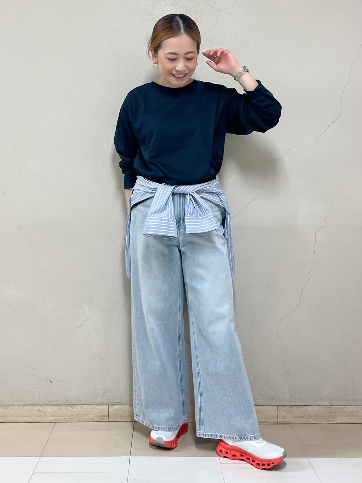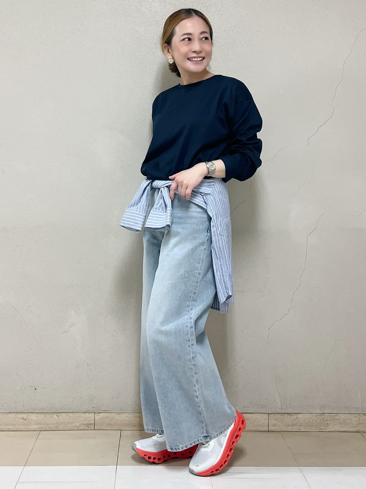 休日のお散歩コーディネートです。オーバーサイズで楽に着れてシンプルでも一枚で様になるカットソーです。シンプルなカットソー選びで困っている方にぜひおすすめしたいです。パンツはカラーがお気に入りです。ワイドでも重たく見えません。きれいめなスタイリングも得意なデニムです。腰にストライプのシャツをポイントで巻きウエストをすっきりと見せています。