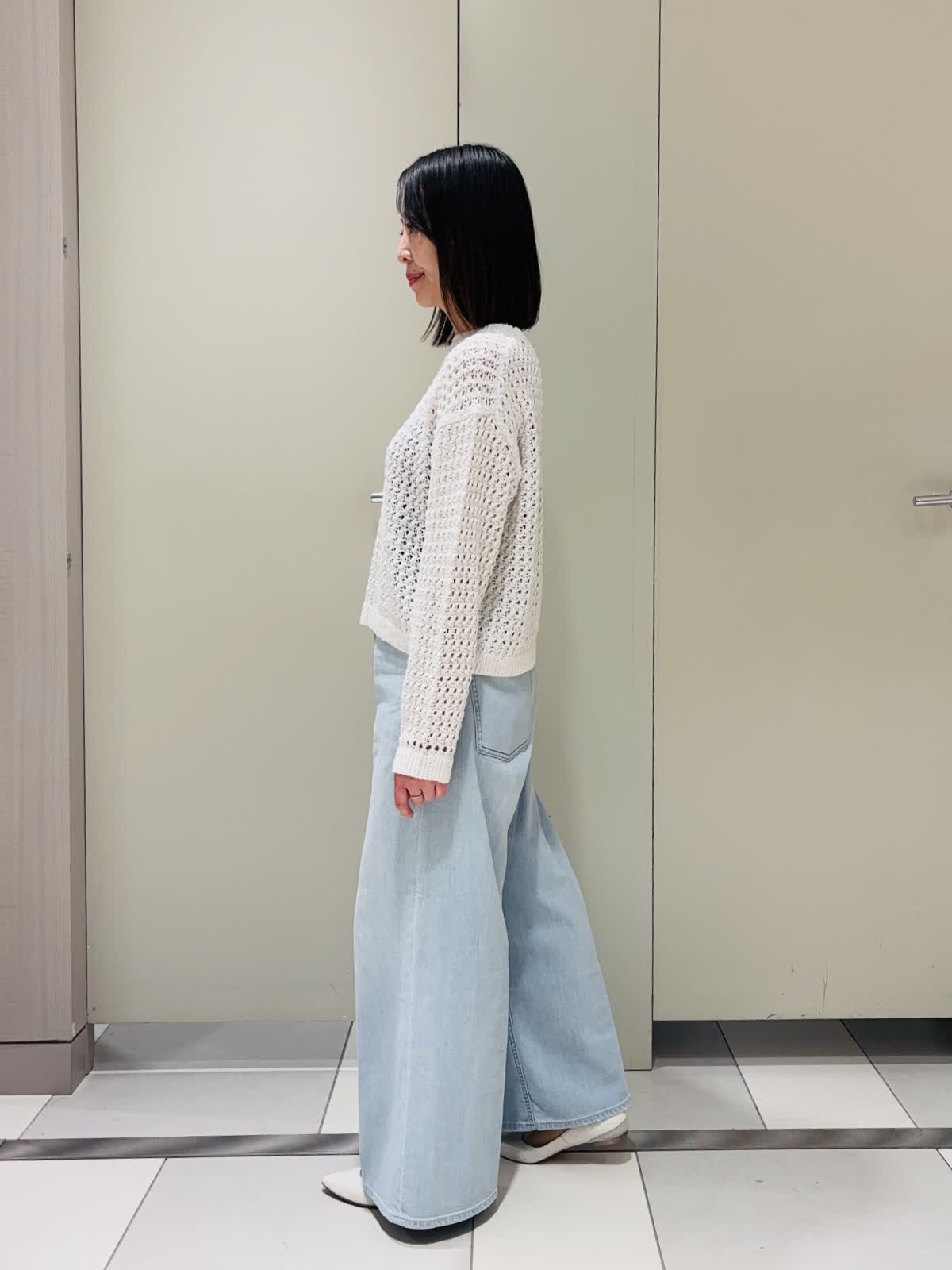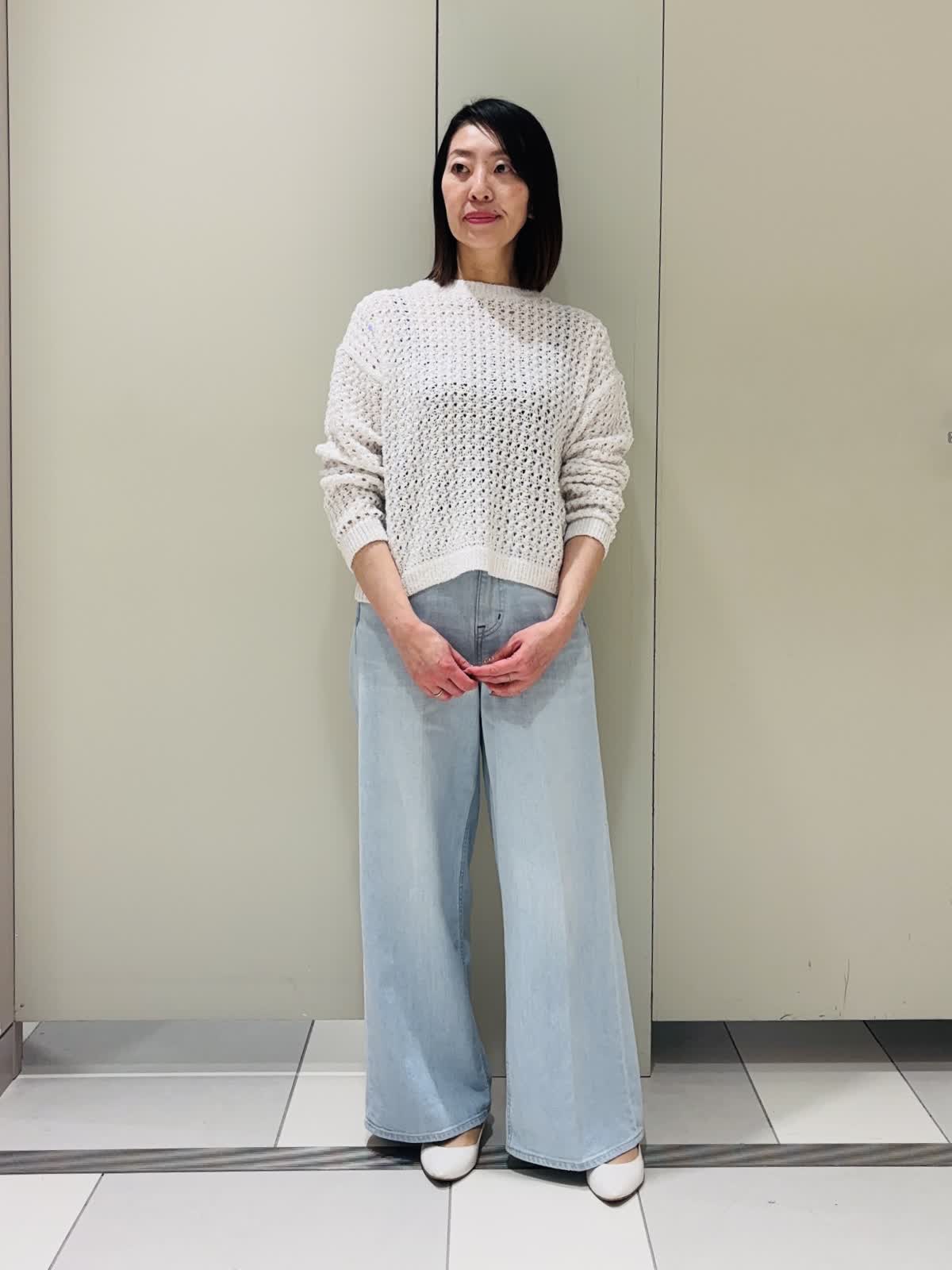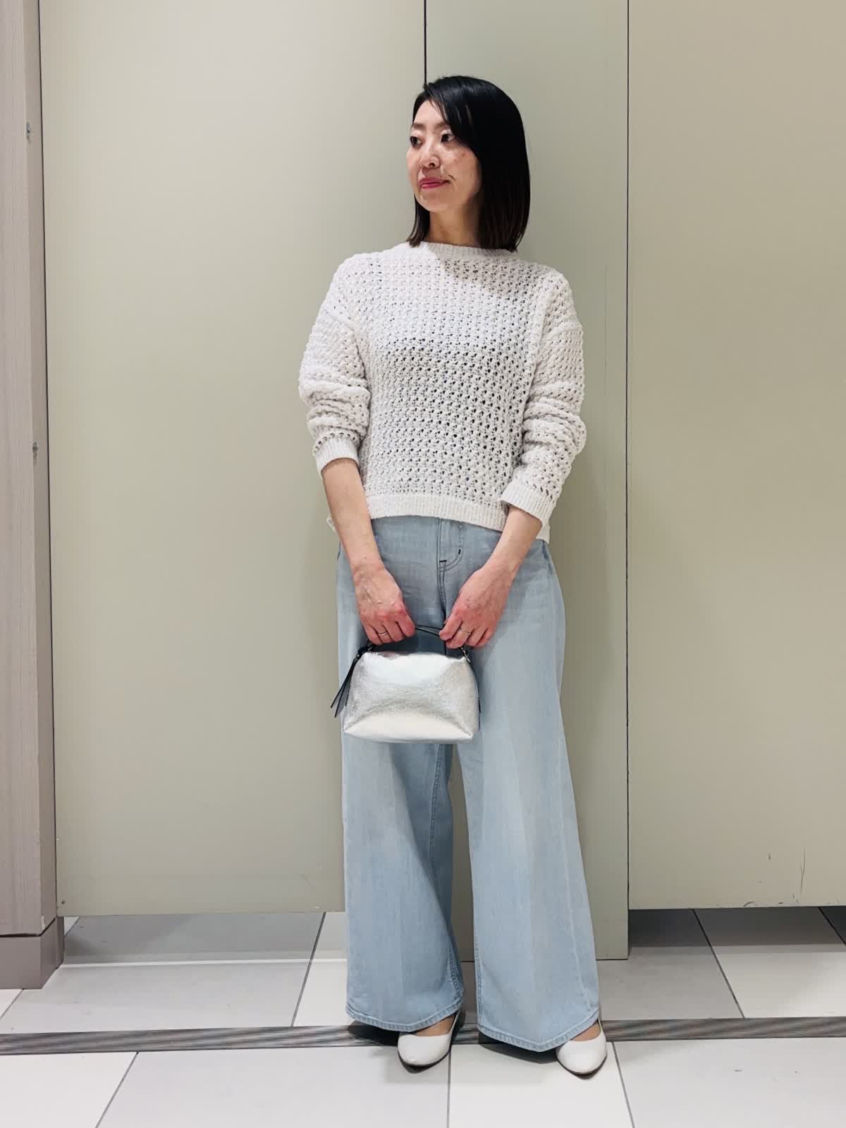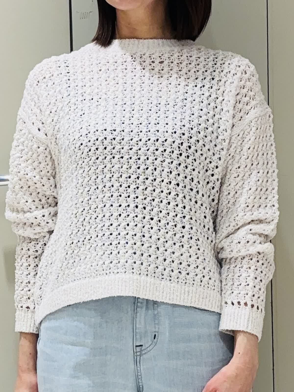 【着用サイズ】ニット:9号 パンツ:5号 【着用カラー】ニット:オフホワイト パンツ:サックス バッグ:シルバー 細かいスパンコールのラメ感が可愛い、ざっくり編みのニット。ゆったりとしたシルエットの短め丈でバランスよく着こなせます。デニムと合わせてもカジュアルになりすぎず、程よく華やかな印象に。少し厚みのある素材で今の季節にぴったりの1枚です。