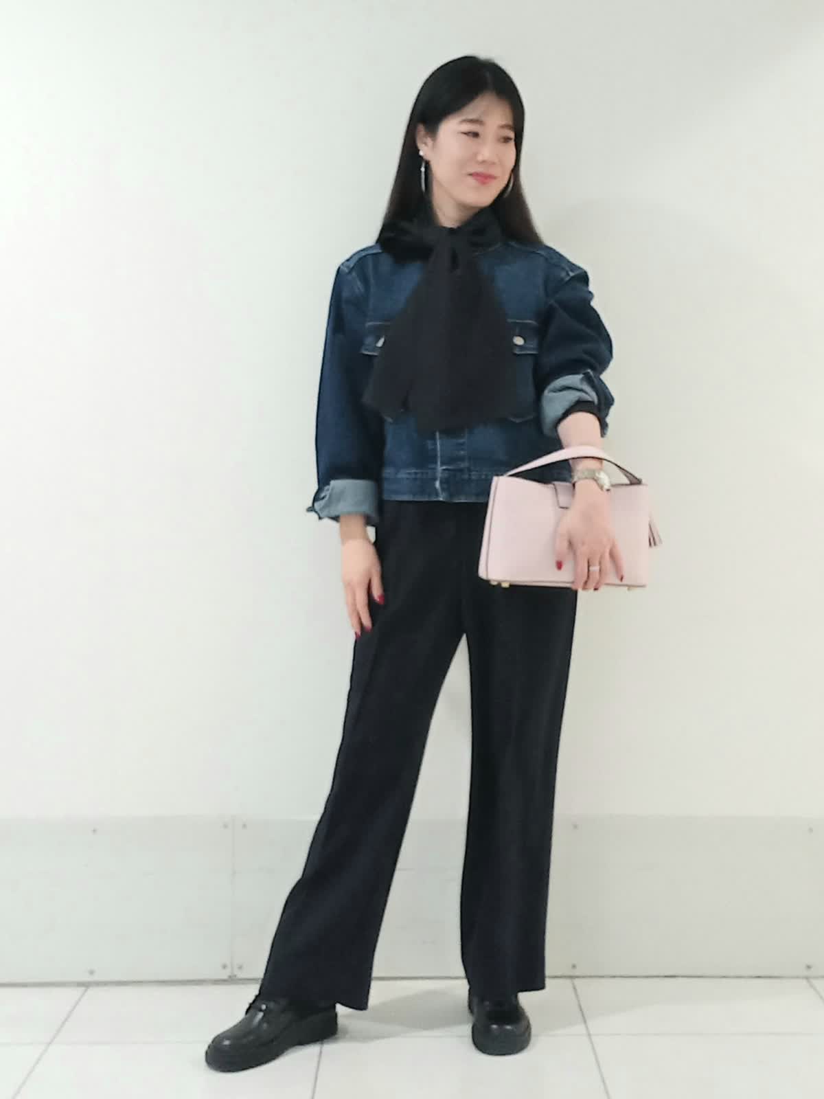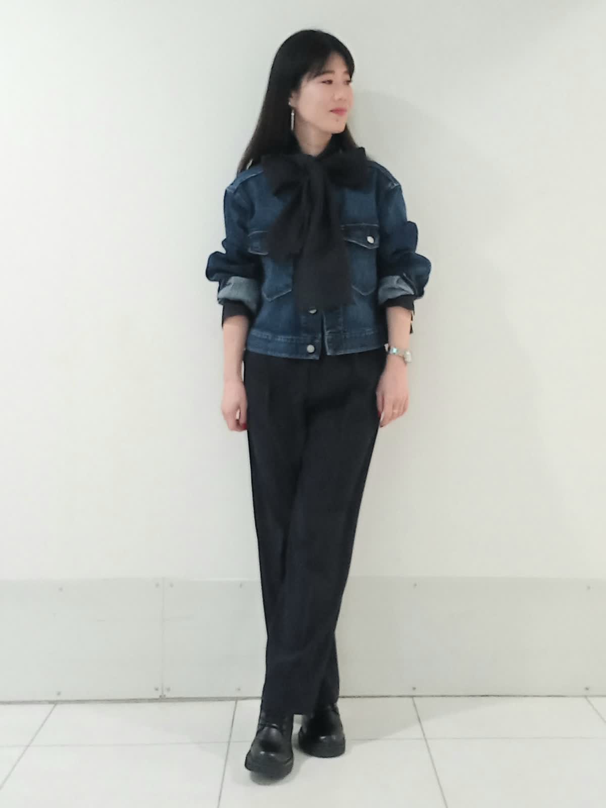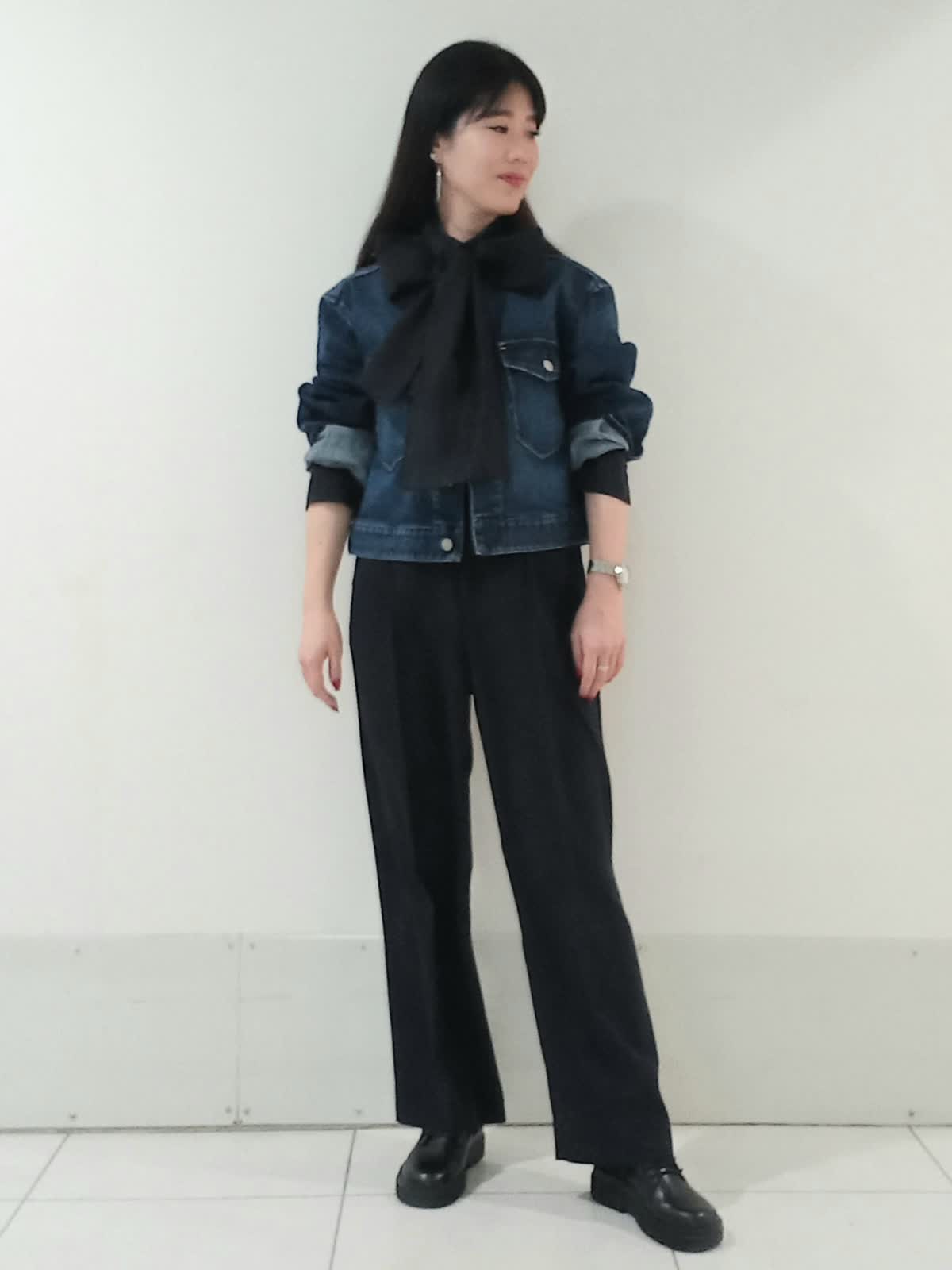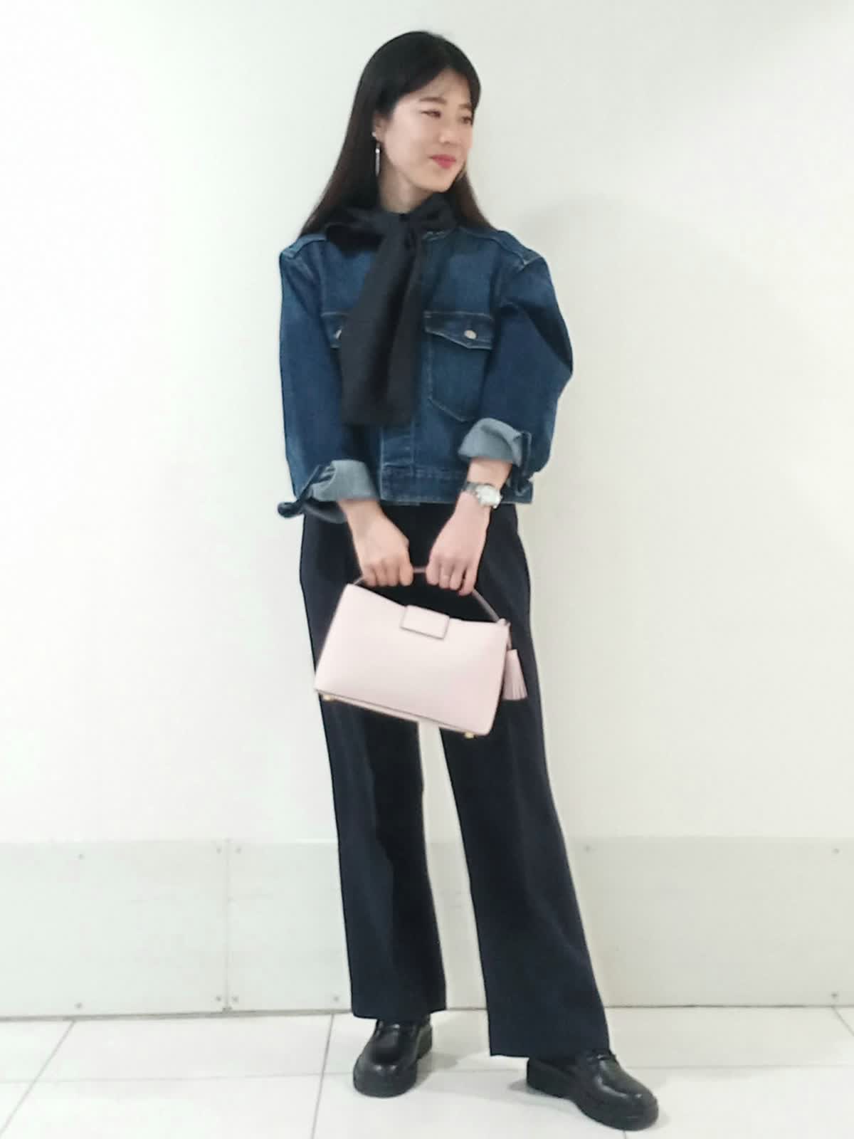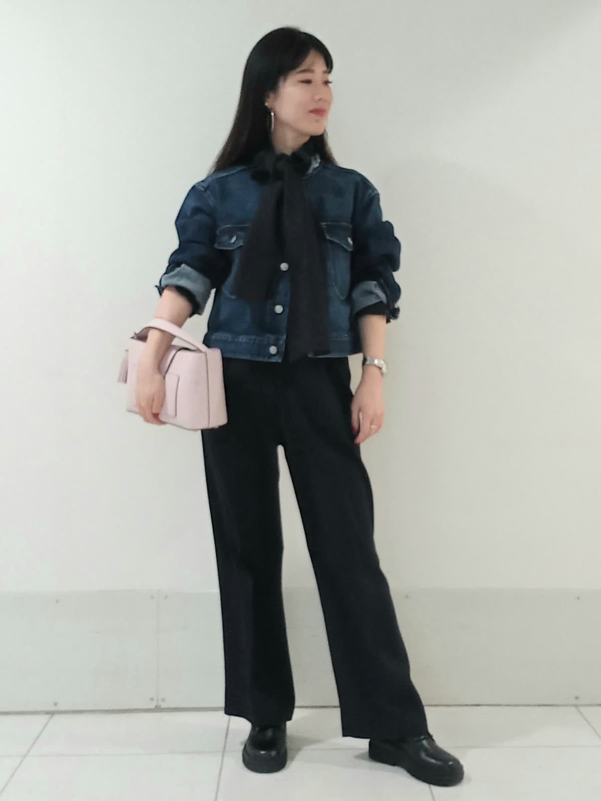 【着用サイズ、デニムブルゾン11号、ボウタイブラウス9号、ワンタックパンツ9号】 大きなリボンが特徴のボウタイブラウスは一枚で着ても様になり、イベントにも大活躍のフェミニンスタイルに仕上がります。 デイリー使いにはデニムジャケットを合わせたマニッシュな印象のスタイルもオススメです。 甘さを程よく抑えたこなれた雰囲気のコーディネートがワントーンにまとめた色使いでも地味にならず、奥行きのある洗練されたスタイルにまとまります。