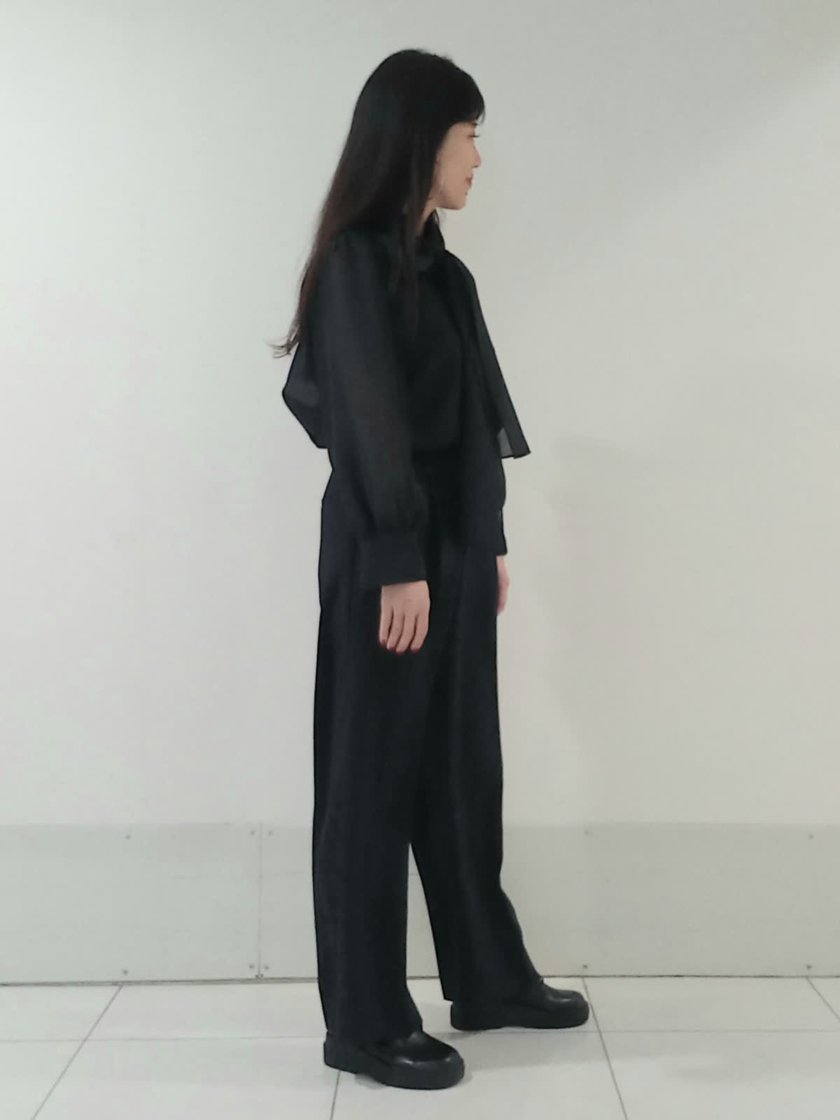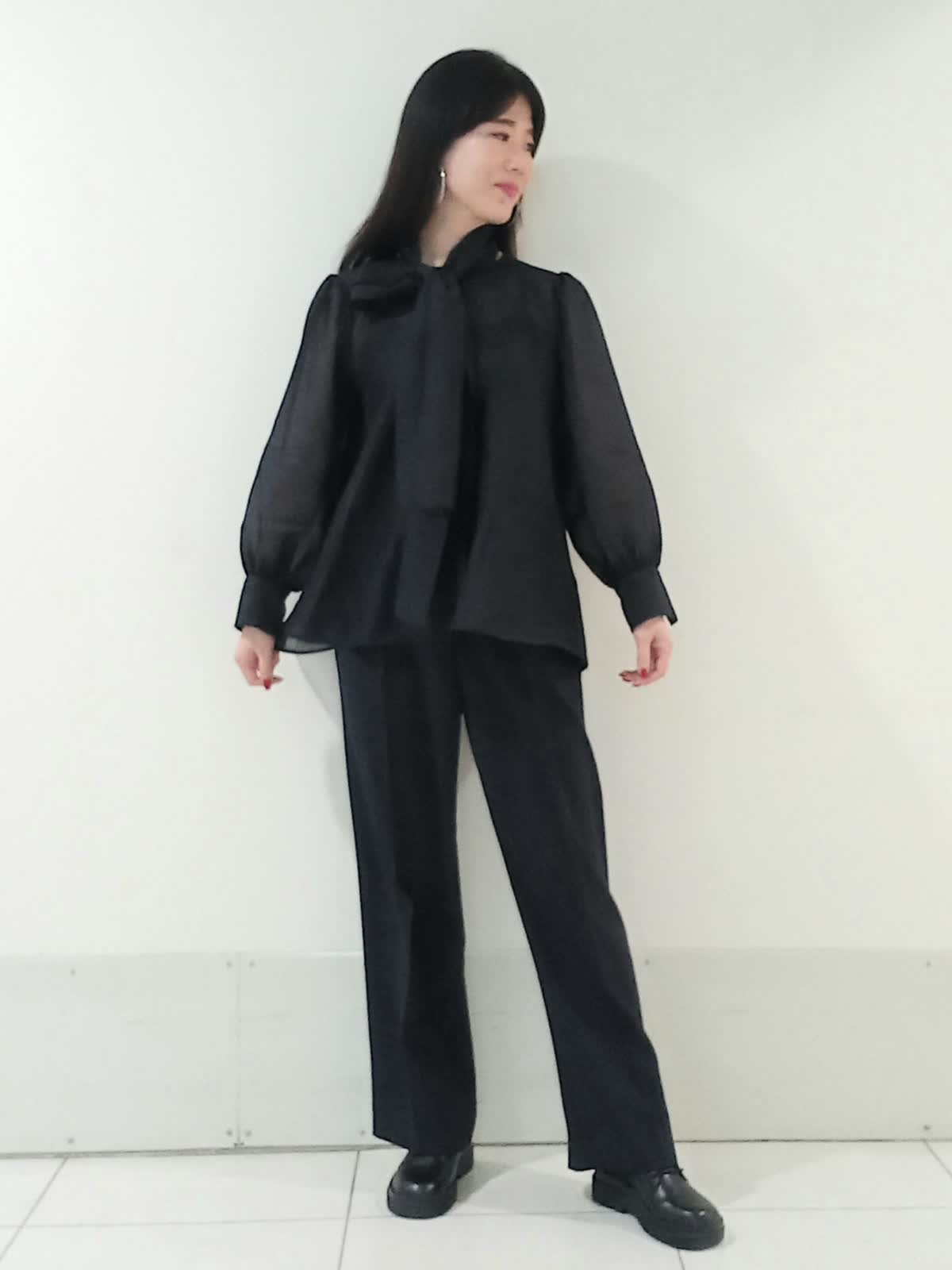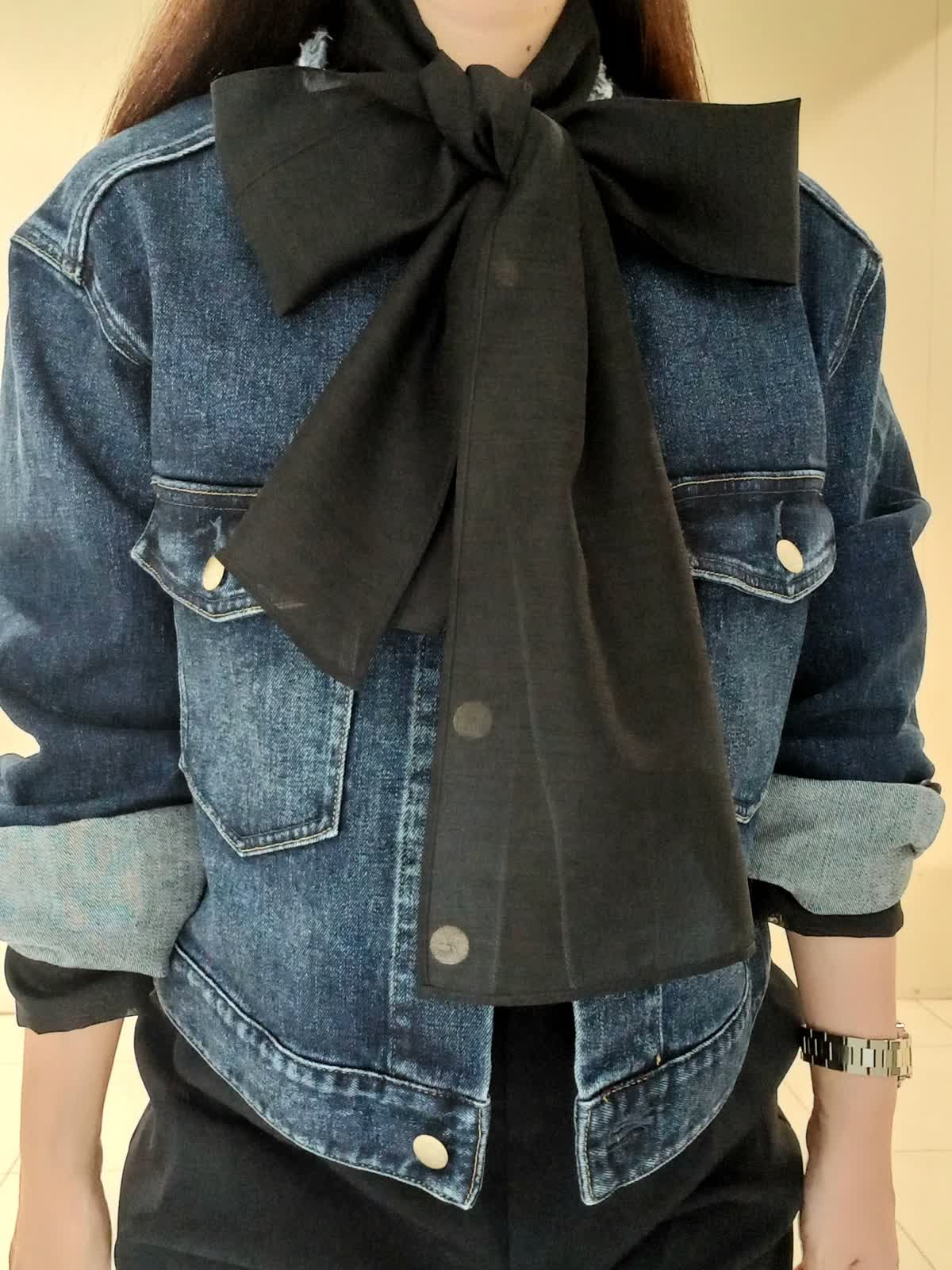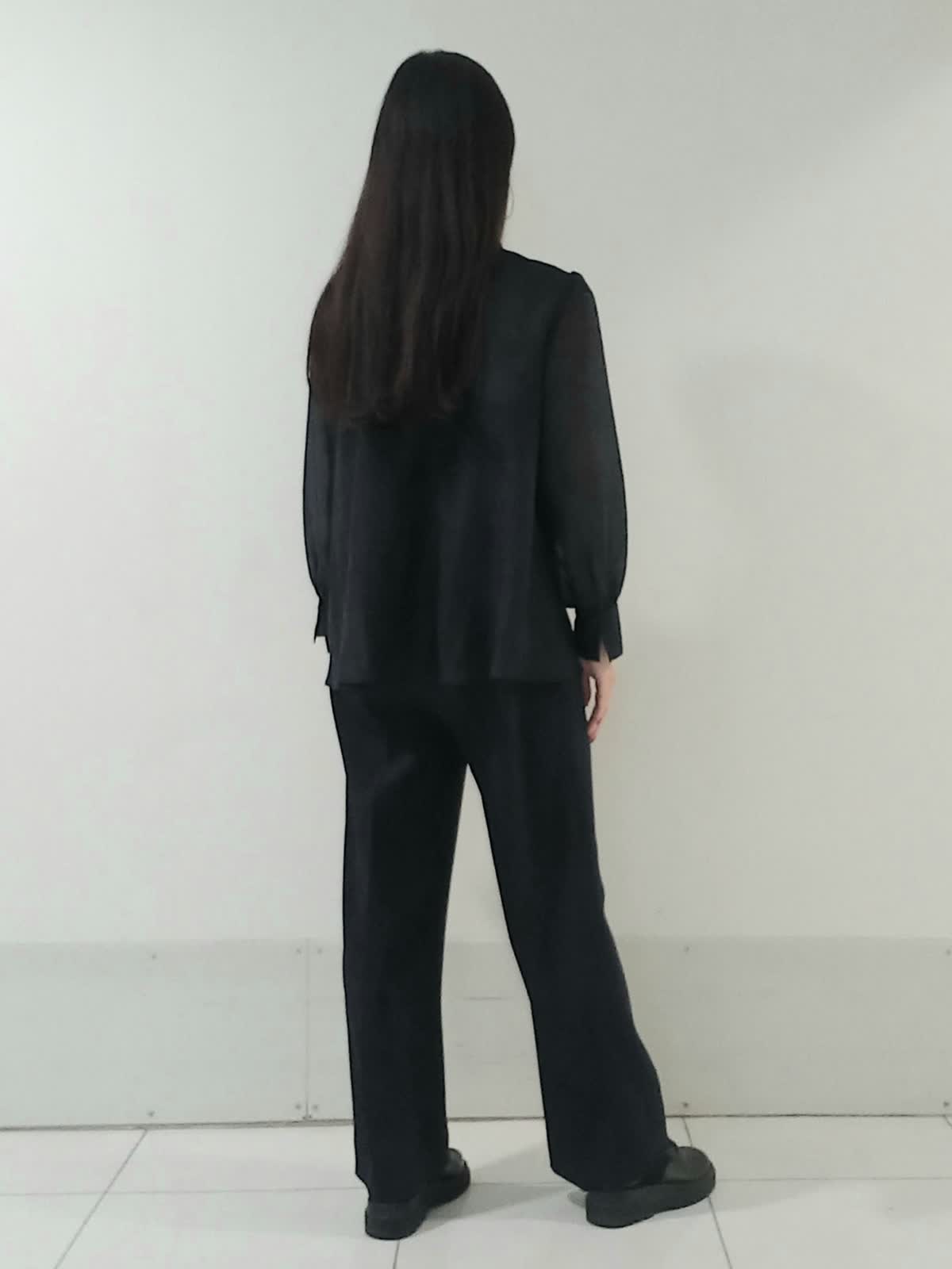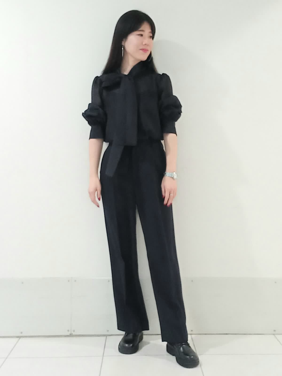 【着用サイズ、デニムブルゾン11号、ボウタイブラウス9号、ワンタックパンツ9号】 大きなリボンが特徴のボウタイブラウスは一枚で着ても様になり、イベントにも大活躍のフェミニンスタイルに仕上がります。 デイリー使いにはデニムジャケットを合わせたマニッシュな印象のスタイルもオススメです。 甘さを程よく抑えたこなれた雰囲気のコーディネートがワントーンにまとめた色使いでも地味にならず、奥行きのある洗練されたスタイルにまとまります。