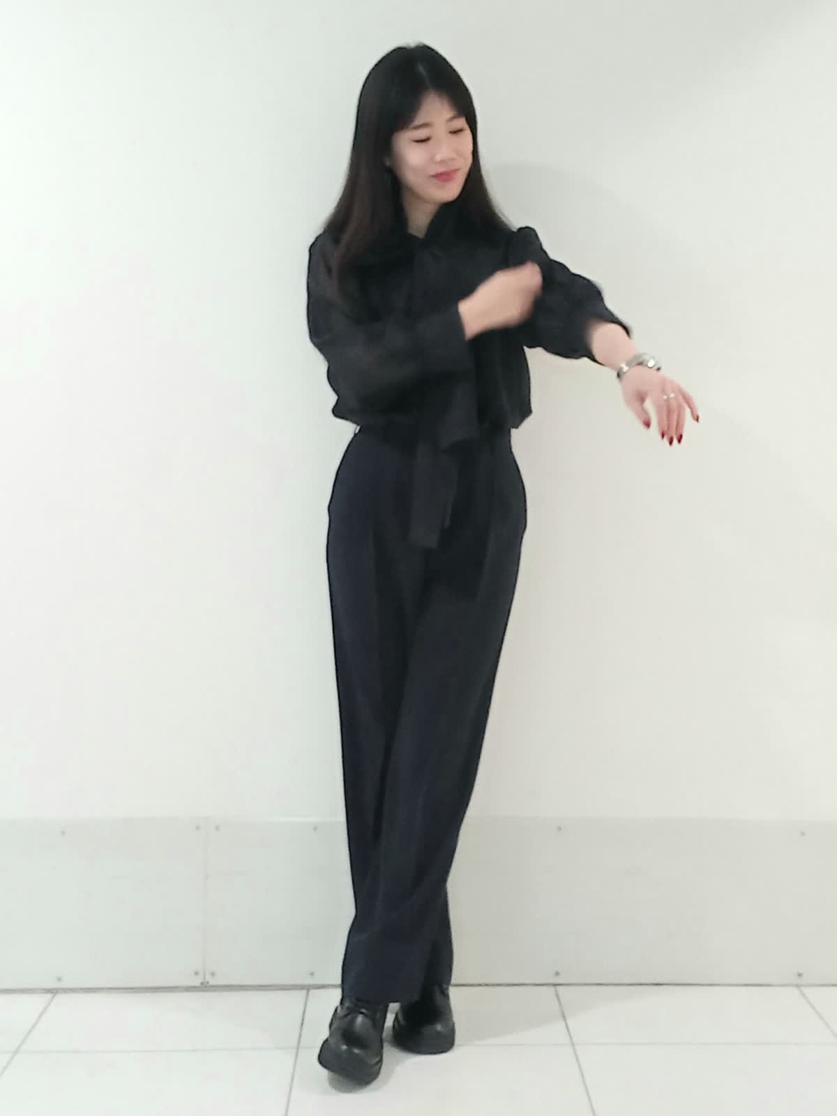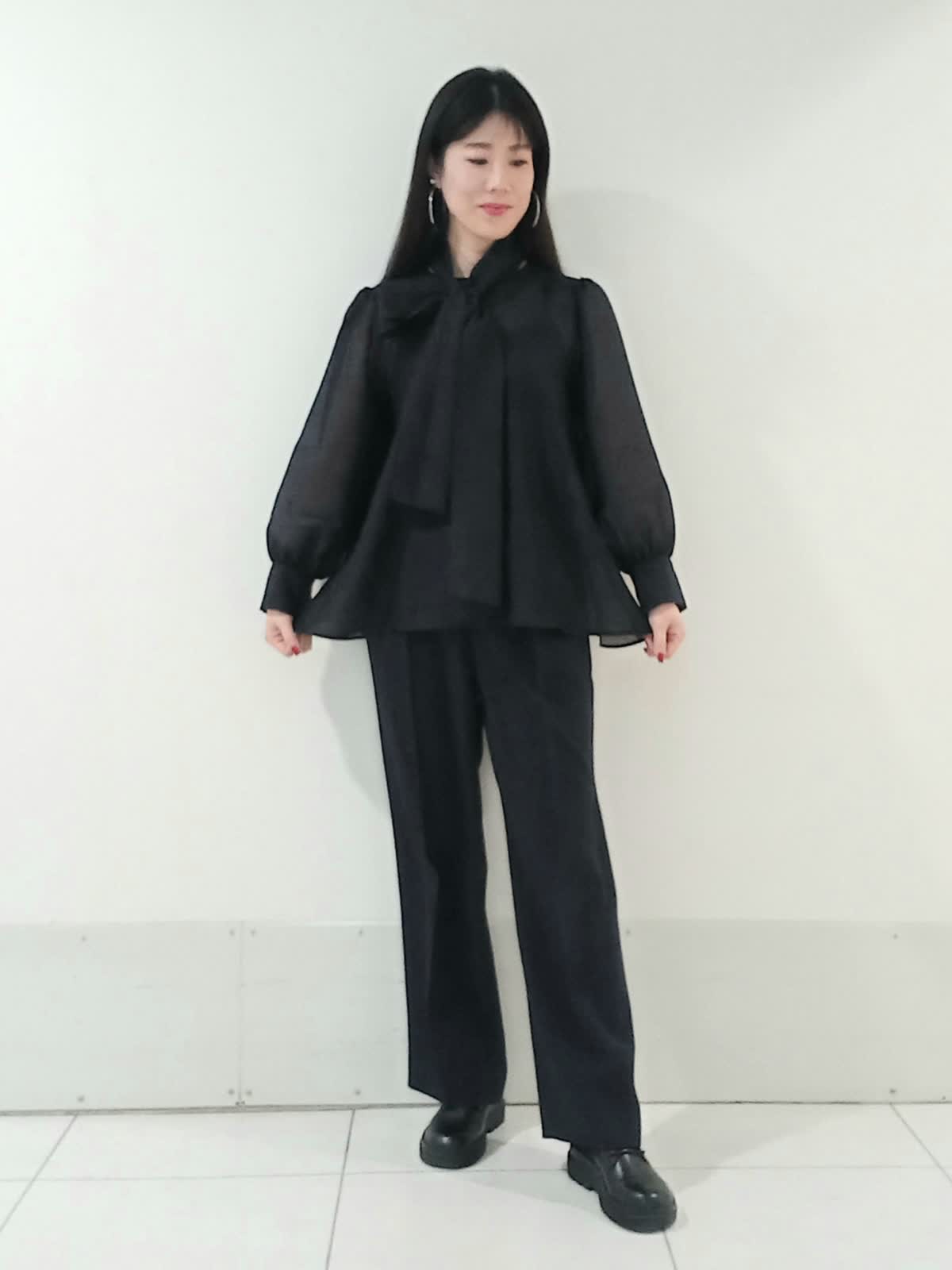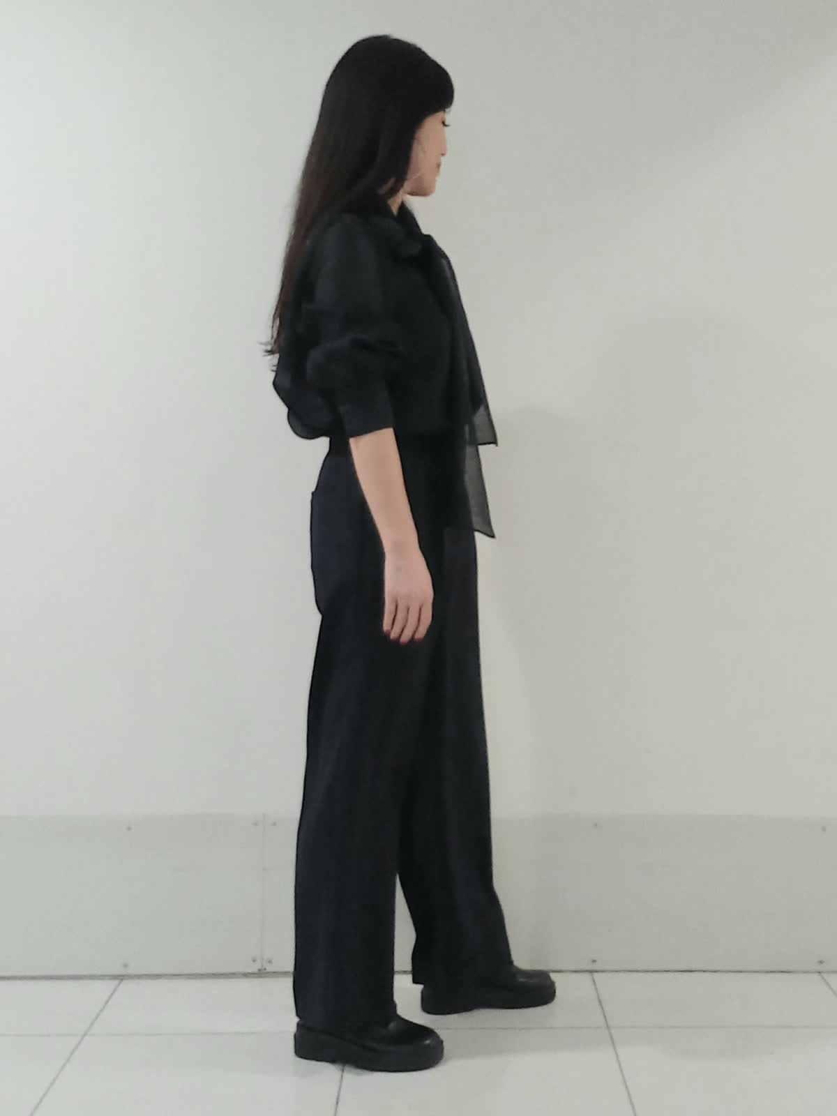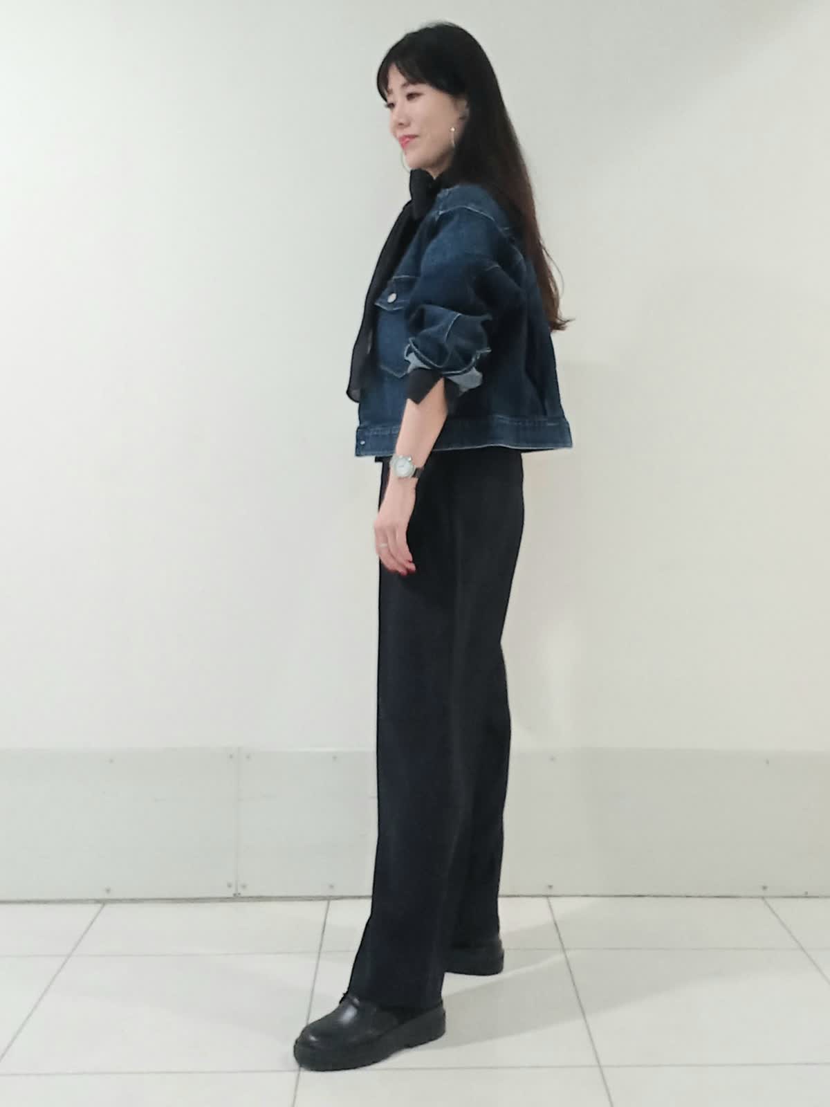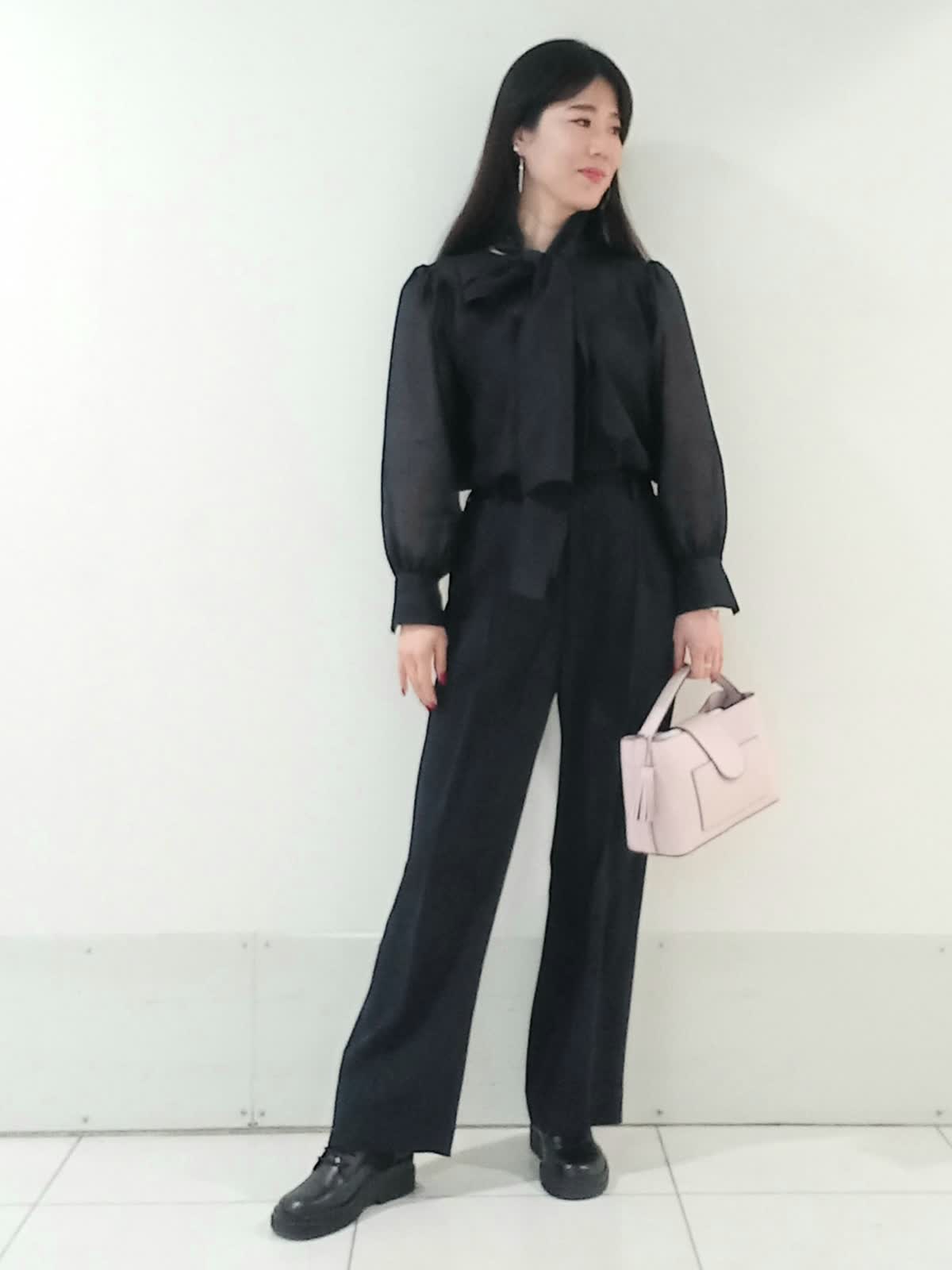 【着用サイズ、デニムブルゾン11号、ボウタイブラウス9号、ワンタックパンツ9号】 大きなリボンが特徴のボウタイブラウスは一枚で着ても様になり、イベントにも大活躍のフェミニンスタイルに仕上がります。 デイリー使いにはデニムジャケットを合わせたマニッシュな印象のスタイルもオススメです。 甘さを程よく抑えたこなれた雰囲気のコーディネートがワントーンにまとめた色使いでも地味にならず、奥行きのある洗練されたスタイルにまとまります。