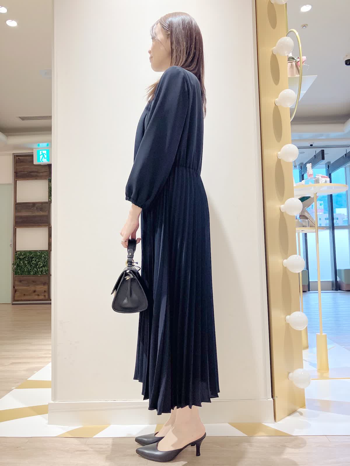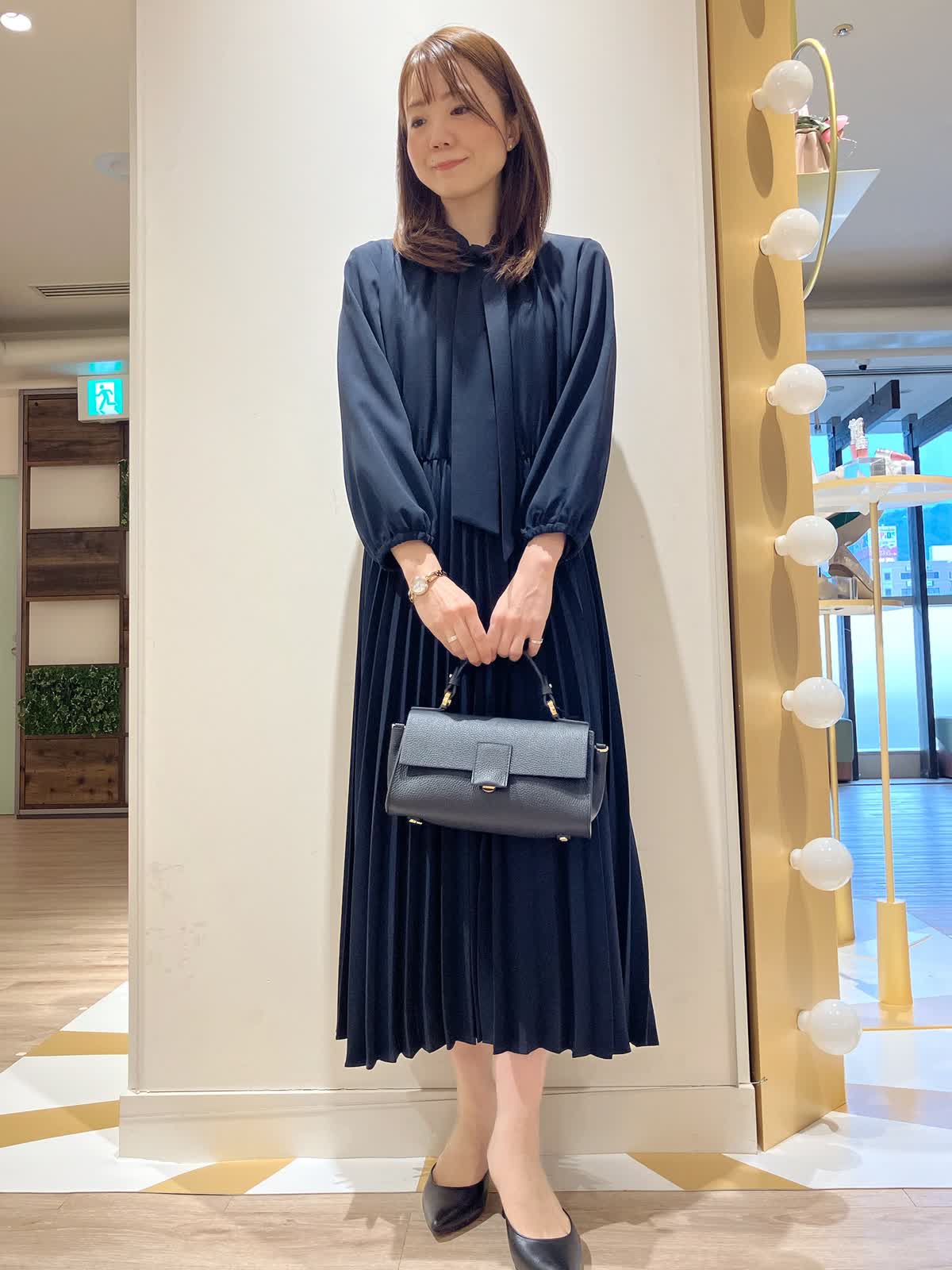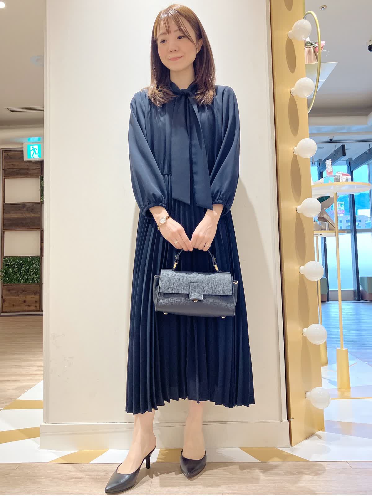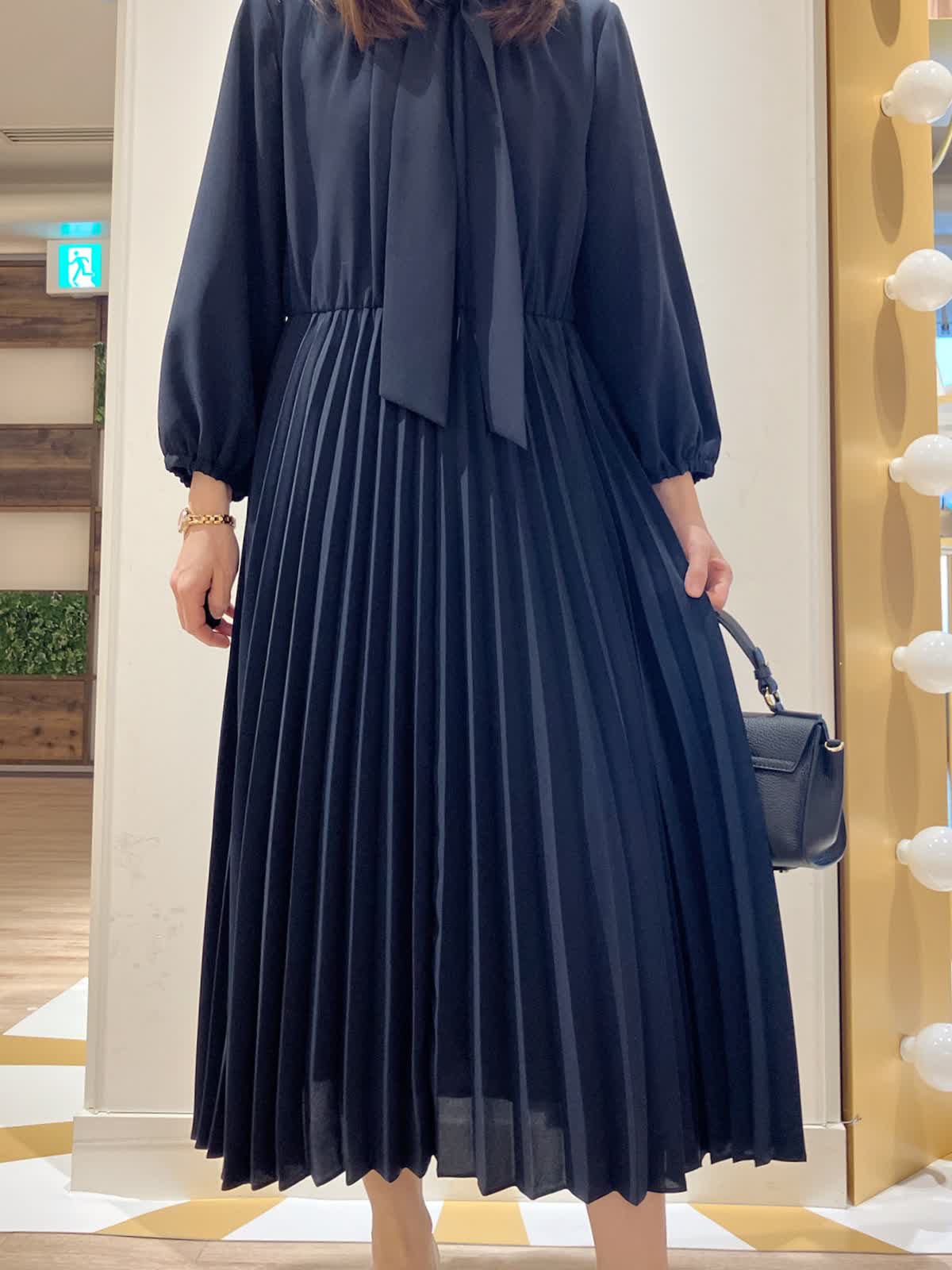 【着用サイズ】ワンピース:9号【着用カラー】ワンピース:ネイビー コーディネートのテーマは1枚で決まるセレモニースタイリングです。 スカート部分がプリーツになった、棒タイ付きワンピースは、1枚でも華やか。プリーツの揺れ感もエレガンスで女性らしいです。 セレモニーには、もちろん、ちょっとしたお出かけ、お仕事など、万能なおすすめワンピースです。