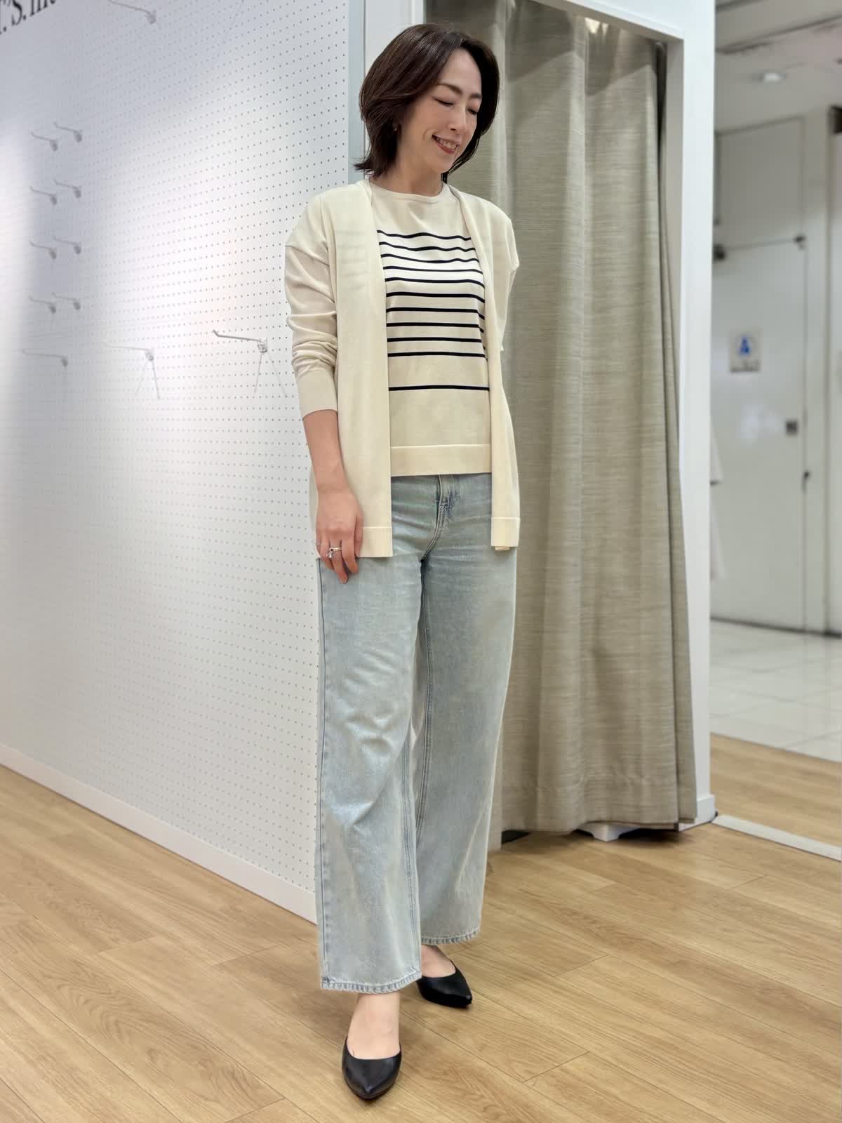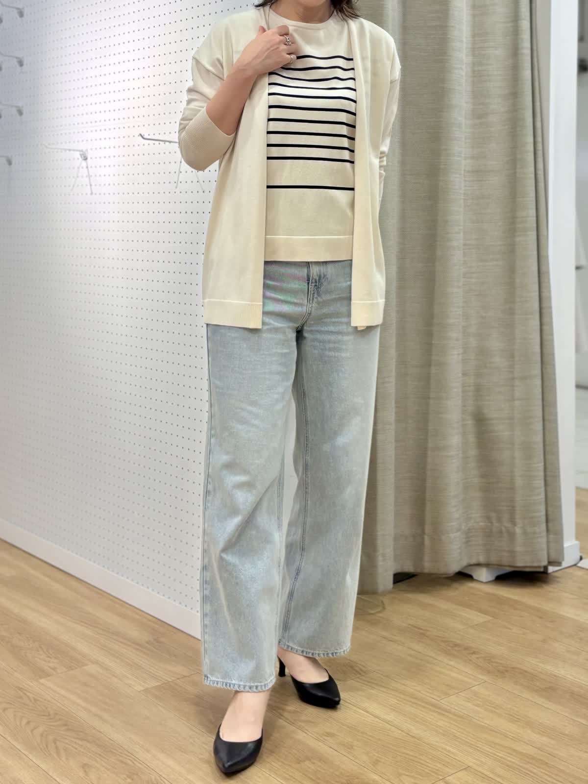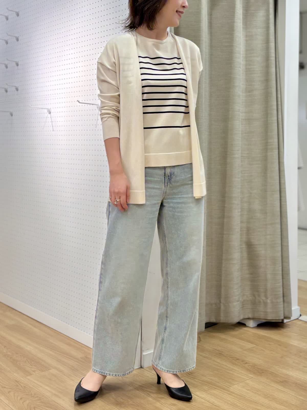 【着用カラー/サイズ】 アンサンブル:グレーベージュ/9号 パンツ:ブルー/11号 シンプルなのに決まる、時短コーデ。アンサンブルのニットはインナーがボーダーなので重ねるだけでスタイルが完成します。単品使いもしやすく、インナーはフレンチ袖で羽織りとの重ねた腕周りもスッキリ着られます。UV加工で春の日差しも安心。まるっと洗えて汗ばんでくる季節にもデイリー使いしやすいです。