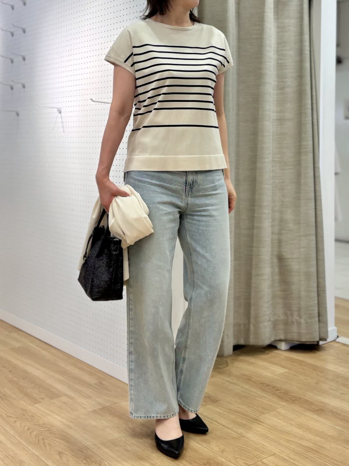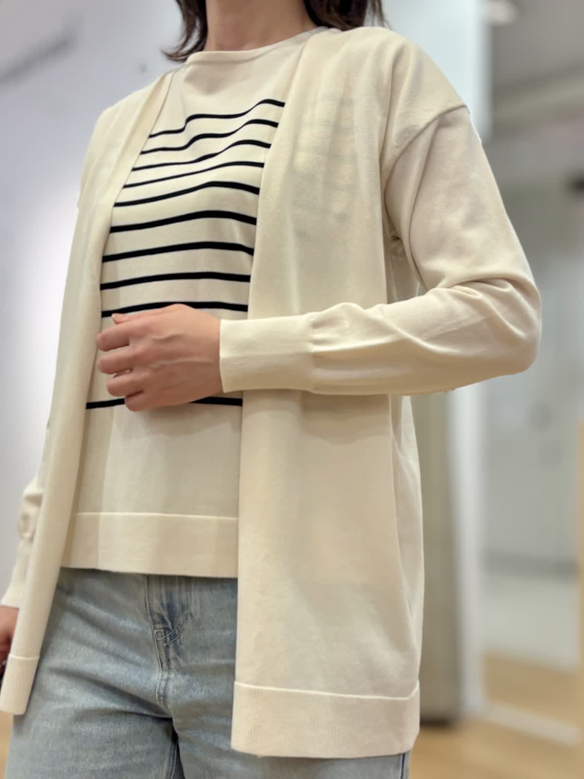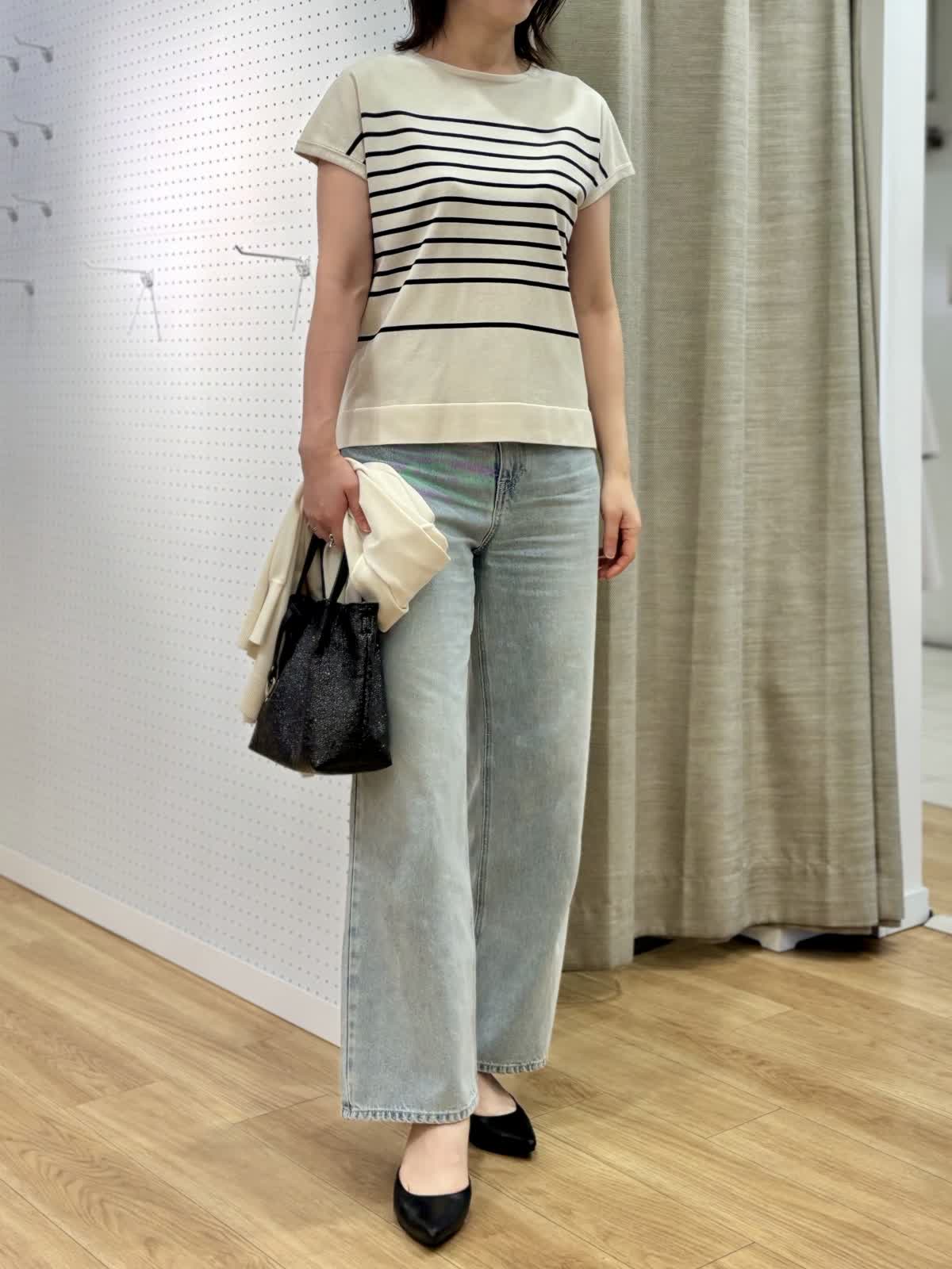 【着用カラー/サイズ】 アンサンブル:グレーベージュ/9号 パンツ:ブルー/11号 シンプルなのに決まる、時短コーデ。アンサンブルのニットはインナーがボーダーなので重ねるだけでスタイルが完成します。単品使いもしやすく、インナーはフレンチ袖で羽織りとの重ねた腕周りもスッキリ着られます。UV加工で春の日差しも安心。まるっと洗えて汗ばんでくる季節にもデイリー使いしやすいです。