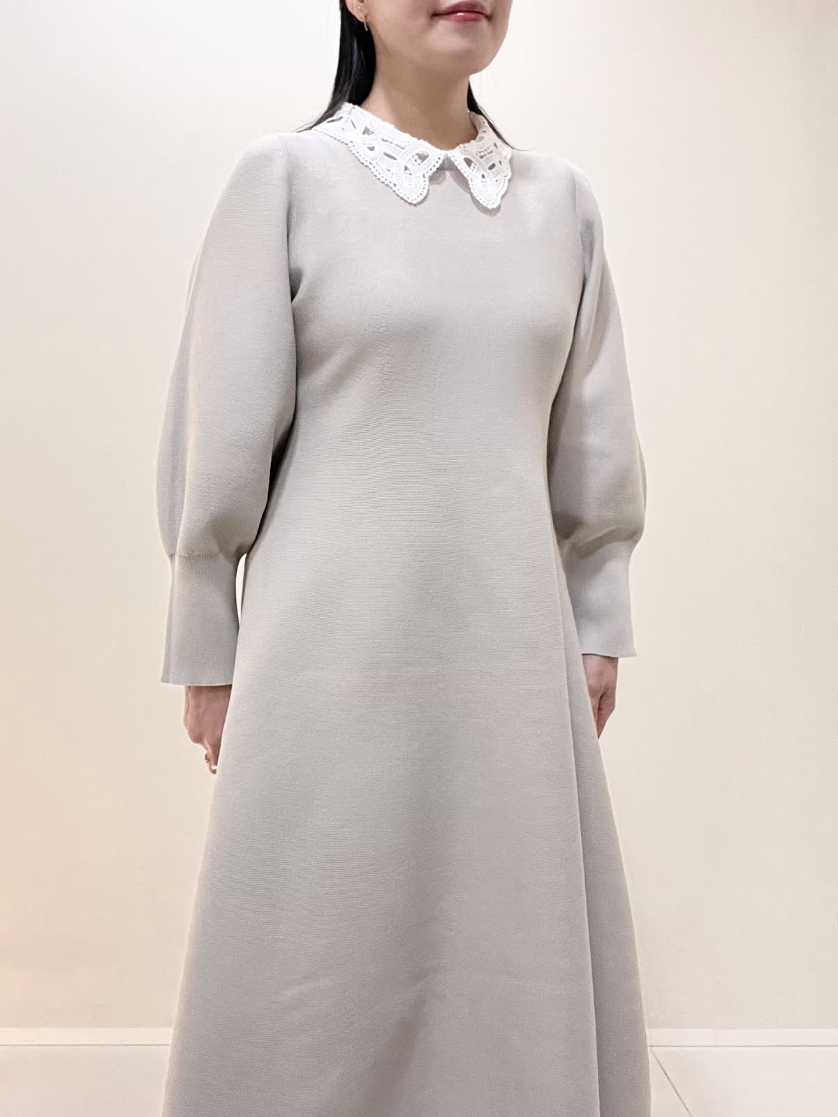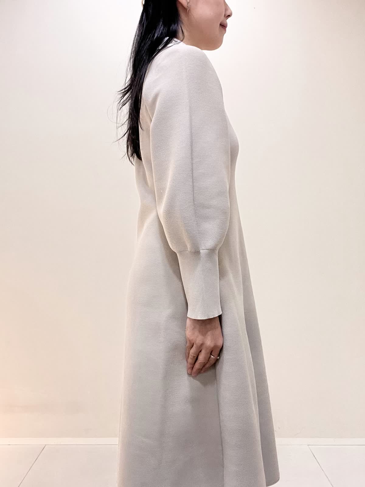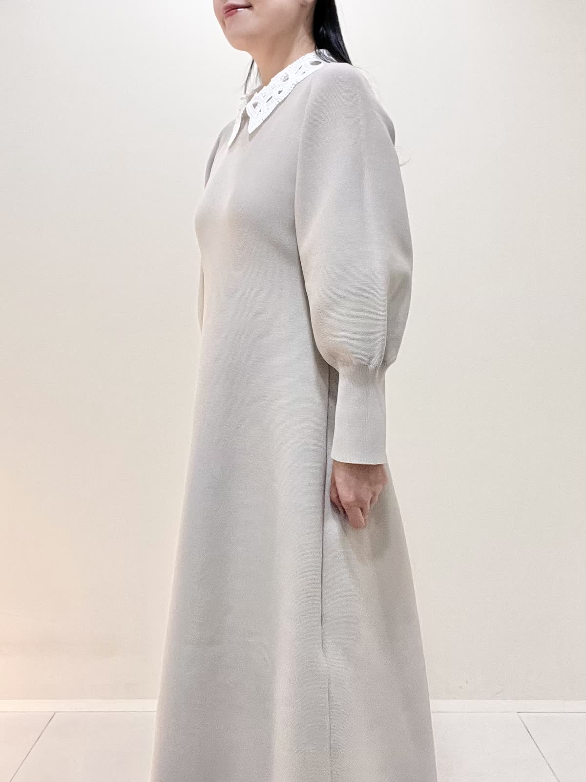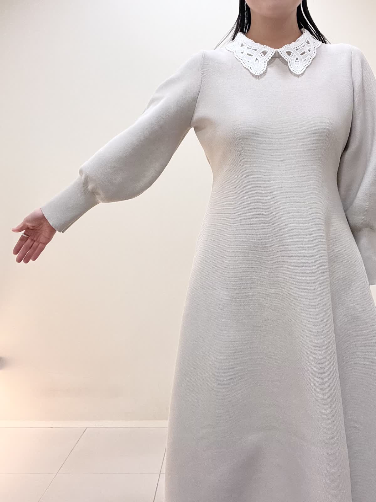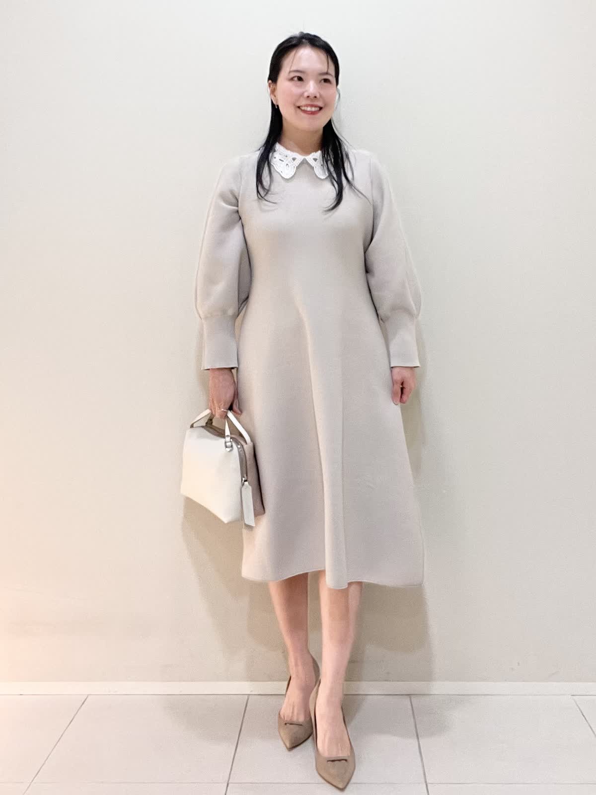 【着用サイズ/カラー】 ワンピース:9号 ベージュ バッグ:オフホワイト ニット素材で伸びが良く、着心地がとても良いです。膝が隠れる位の長さです。襟がついていてきちんと感も出るので、お食事会などにもオススメです。