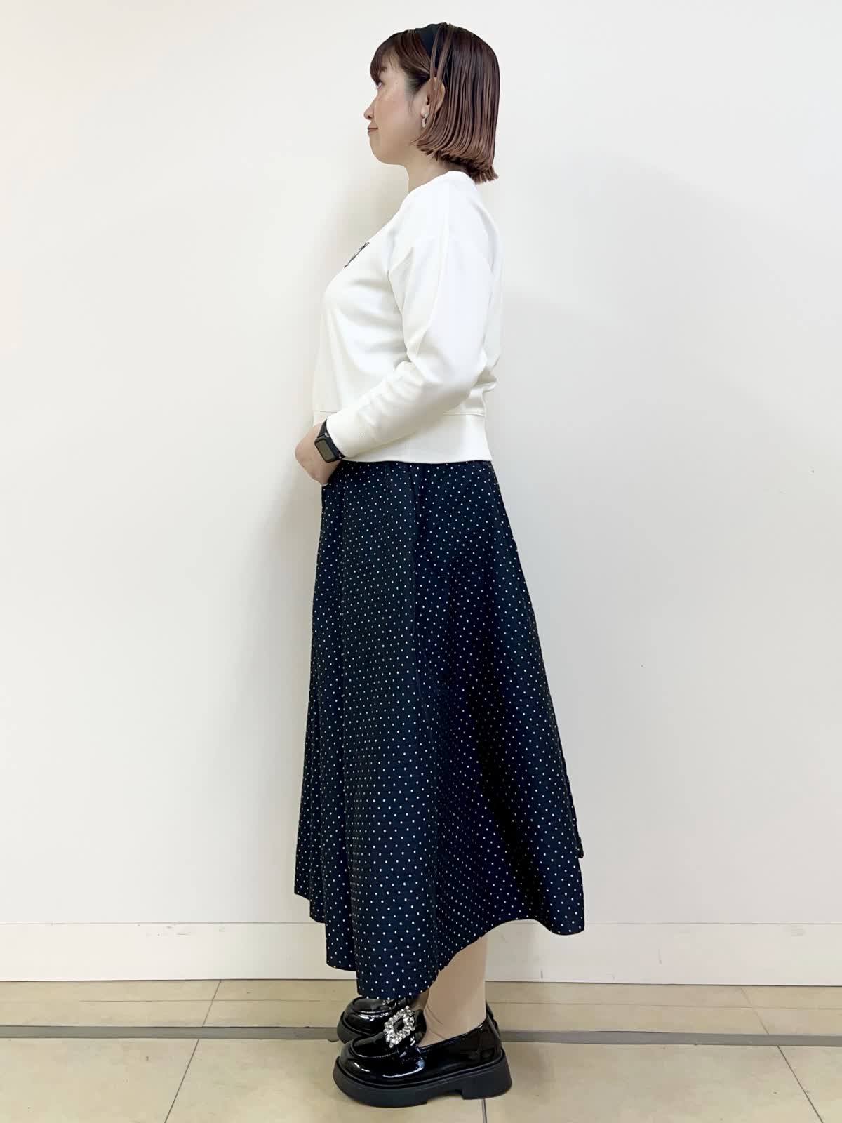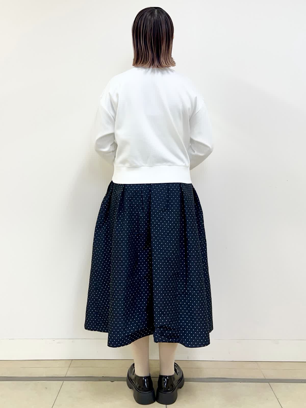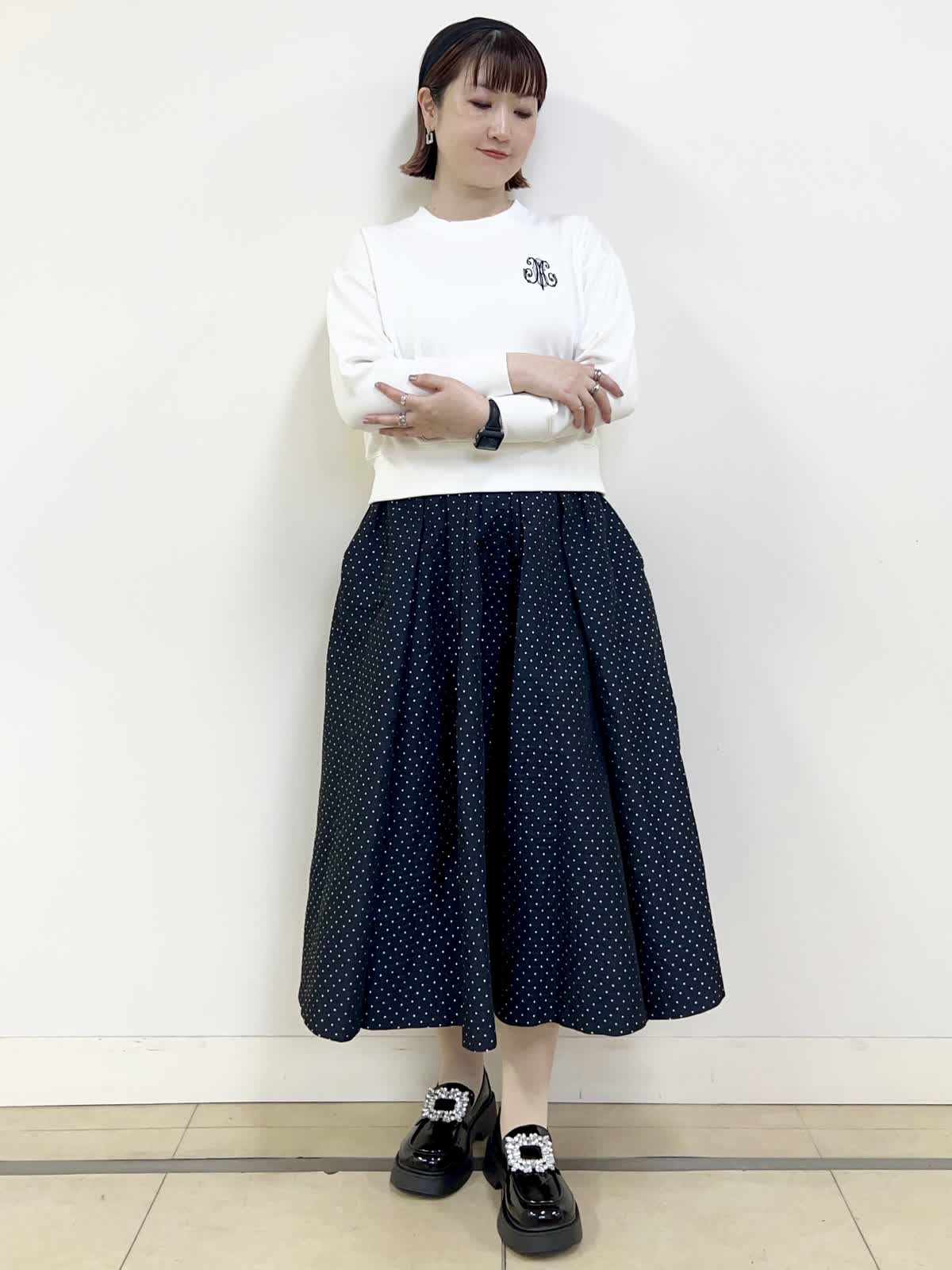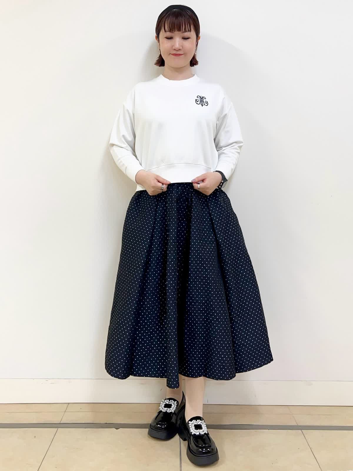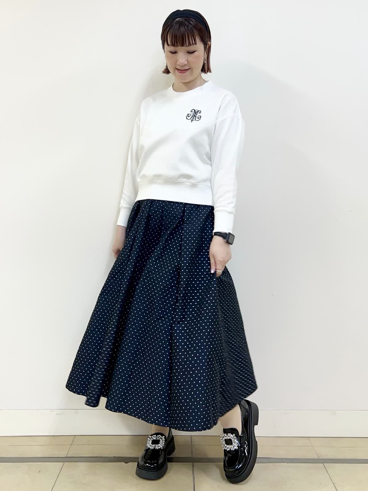 カットソー:9号/オフホワイト スカート:9号/ネイビー 『春のフェミニンカジュアルコーデ』 [カットソー]スポーティーになりすぎないマーリエらしい上品なロゴカットソーです。薄手すぎずオールシーズン着られます。サイズ感は細身すぎず無理なく着られました。 [スカート]上品なラメ糸を贅沢に織り込んだドットジャガード素材のスカートです。カジュアルからフォーマルまで幅広く活躍するアイテムです。サイズ感は、ウエストの3分の2がゴムになっているのでかなり余裕がありました。