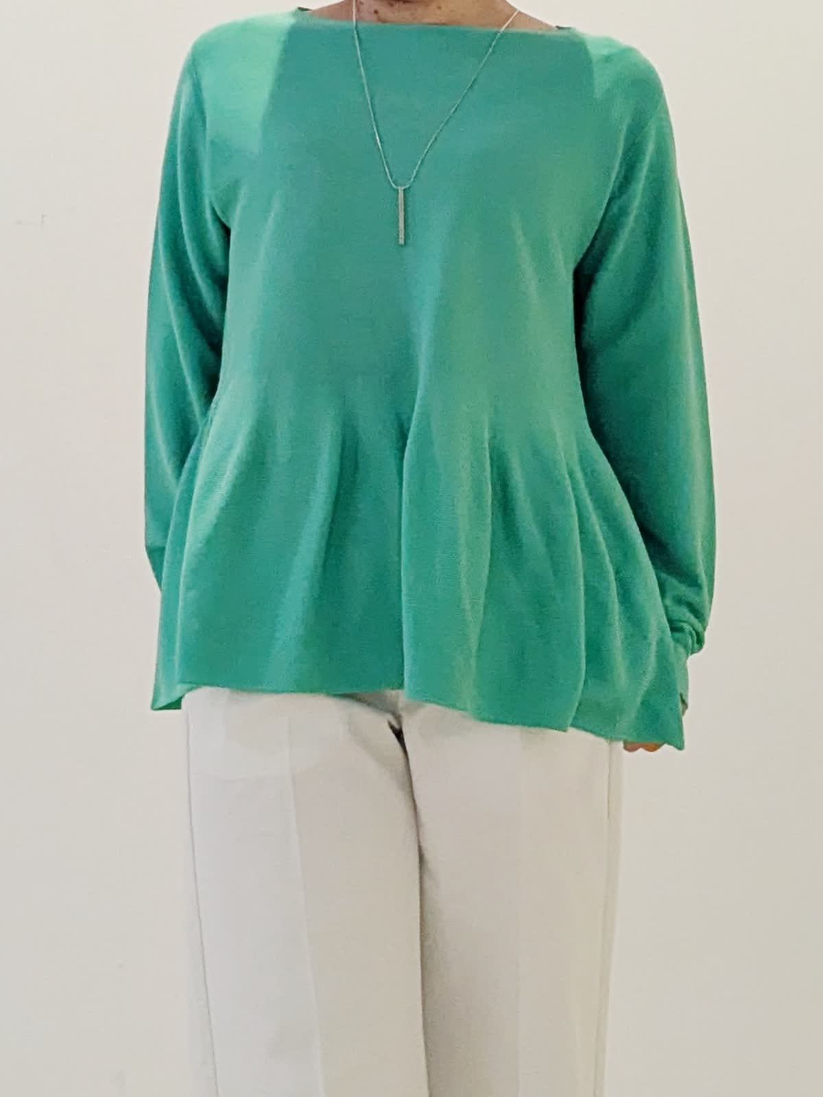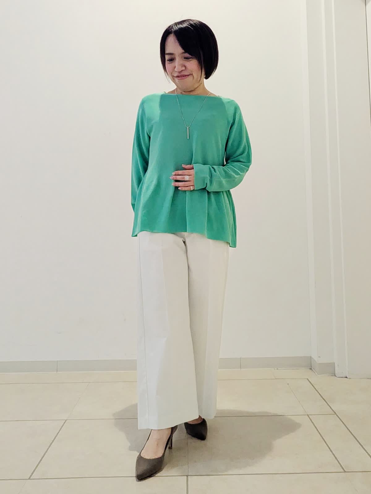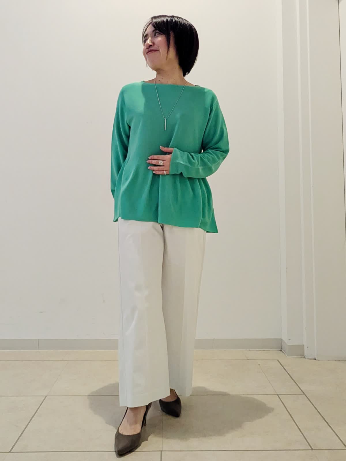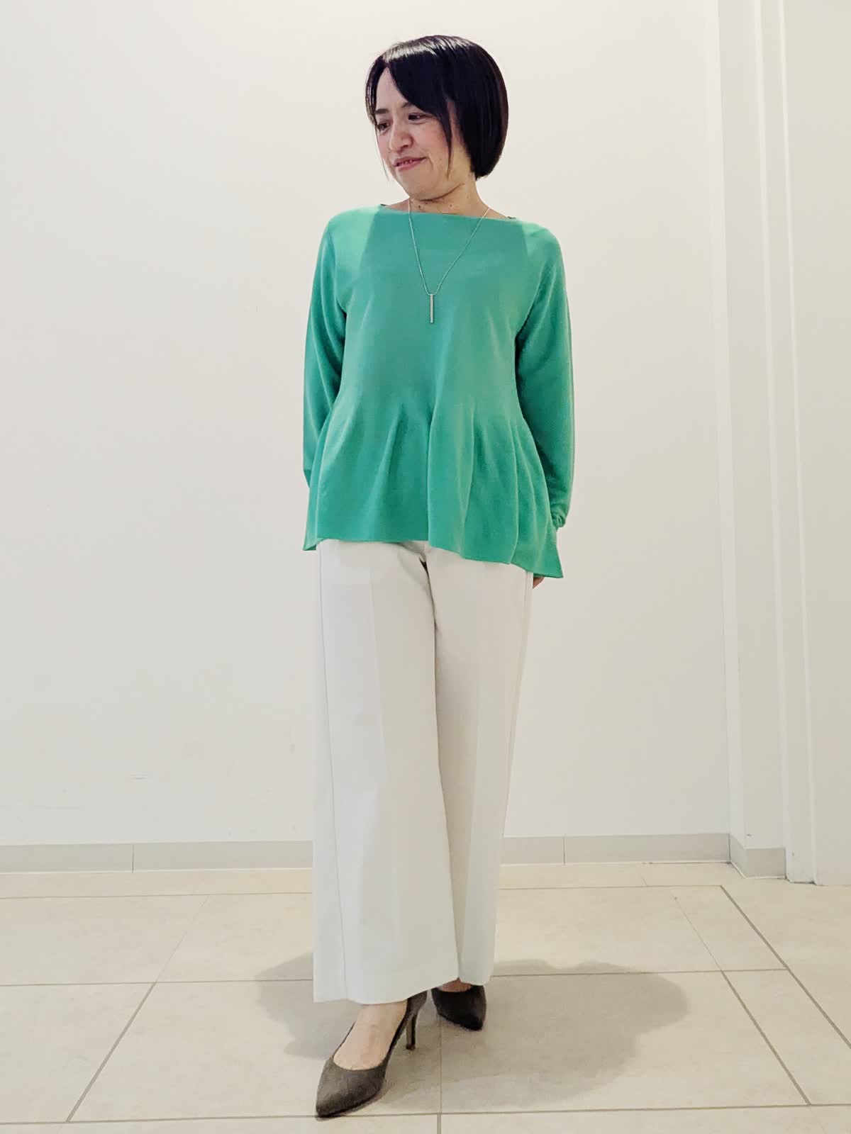 【着用サイズ】ニット:フリー パンツ:7号【着用カラー】ニット:グリーン パンツ:オフホワイト 春のお出かけコーデです。 ニットはフレアーライン。肌触りがやわらかく、 編み立てのテクニックで動きのあるデザインを作っているのがポイントです。白パンツを合わせると見た目から春らしいコーディネートの完成です。